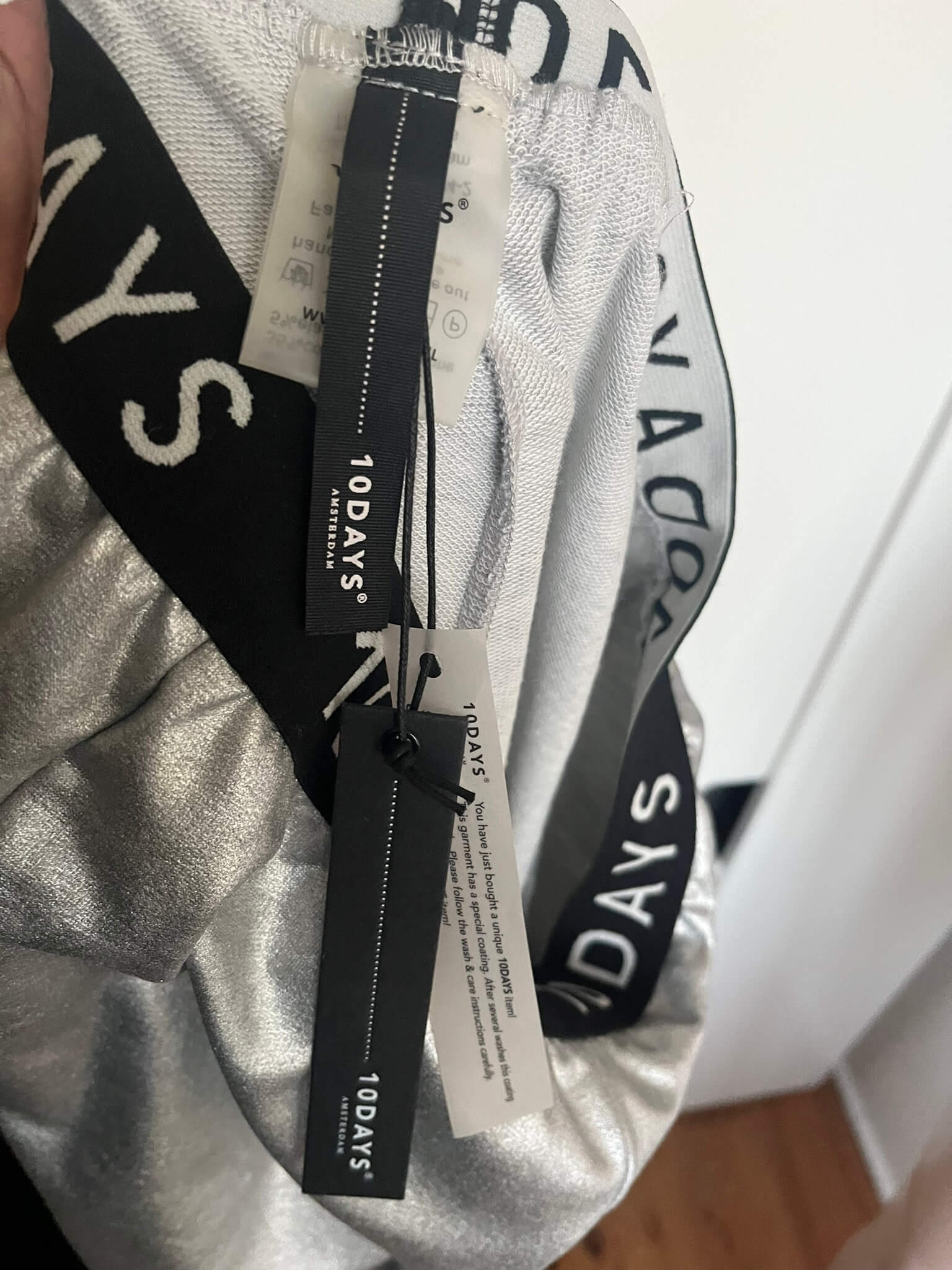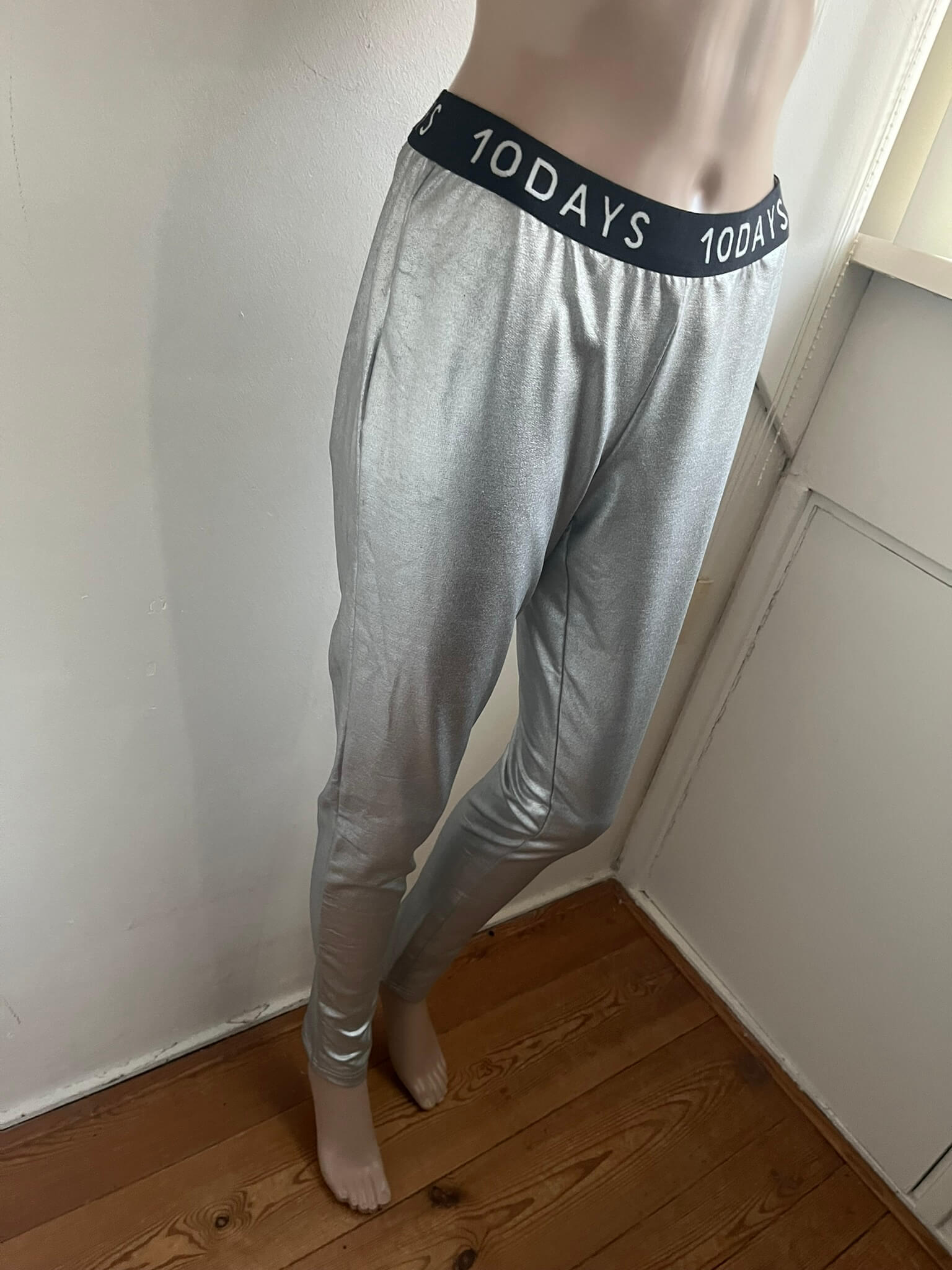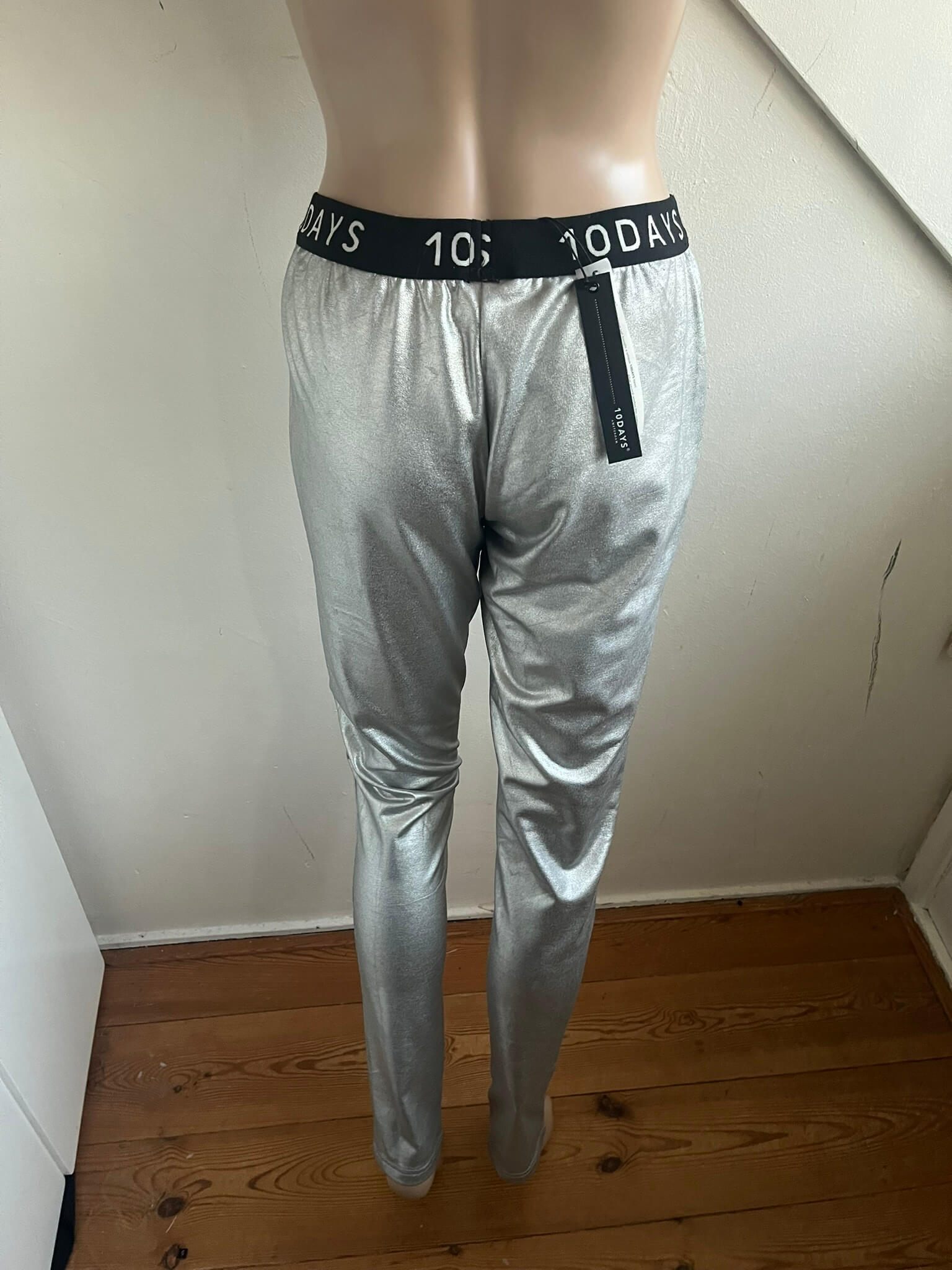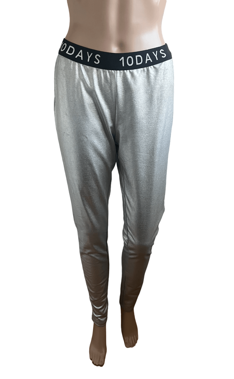 Zilverkleurige legging met een zwart witte elastische tailleband in de maat 1 = S. Nieuw met kaartjes €89,90. Gemaakt van polyester, katoen en elastaan.