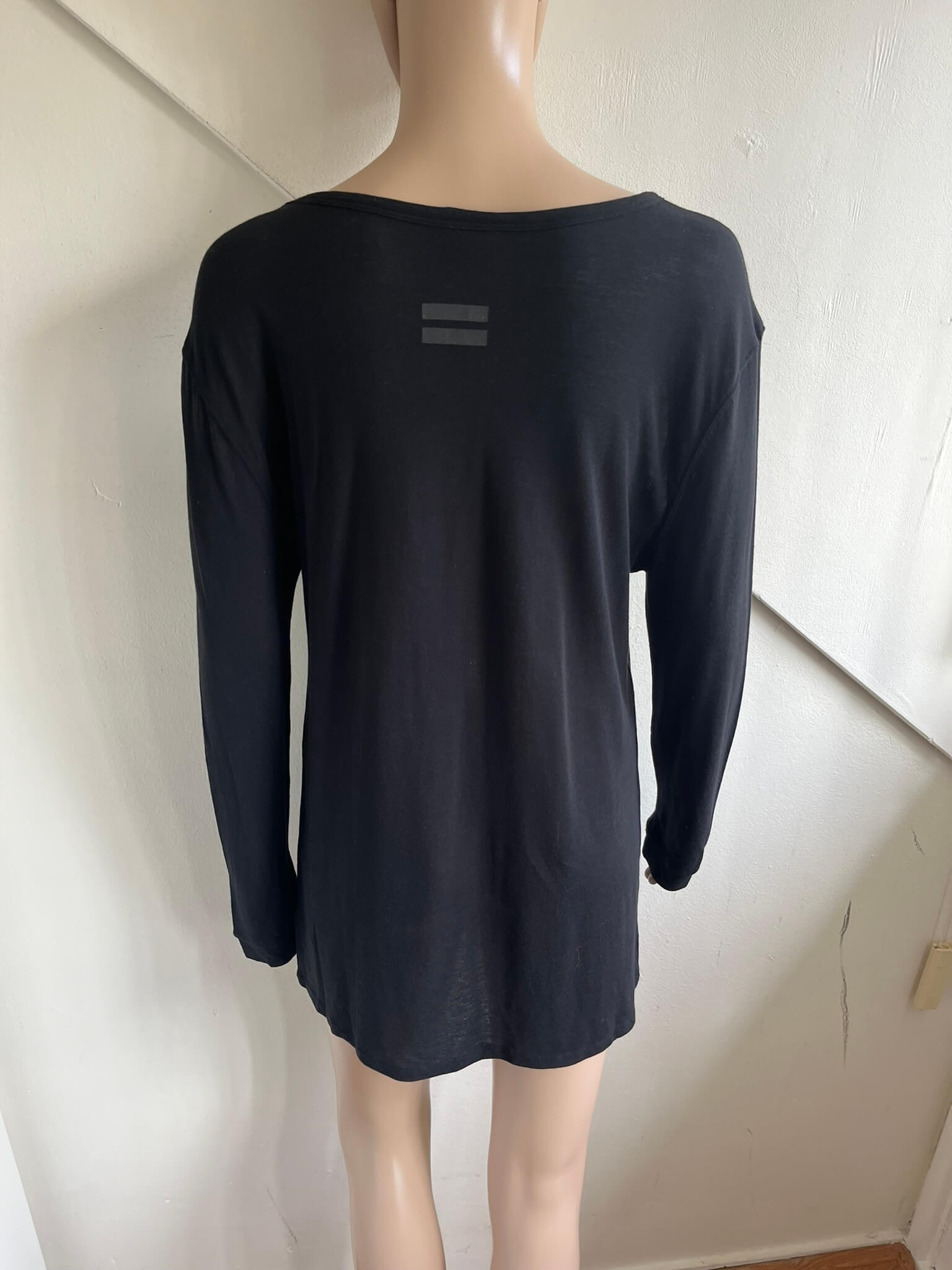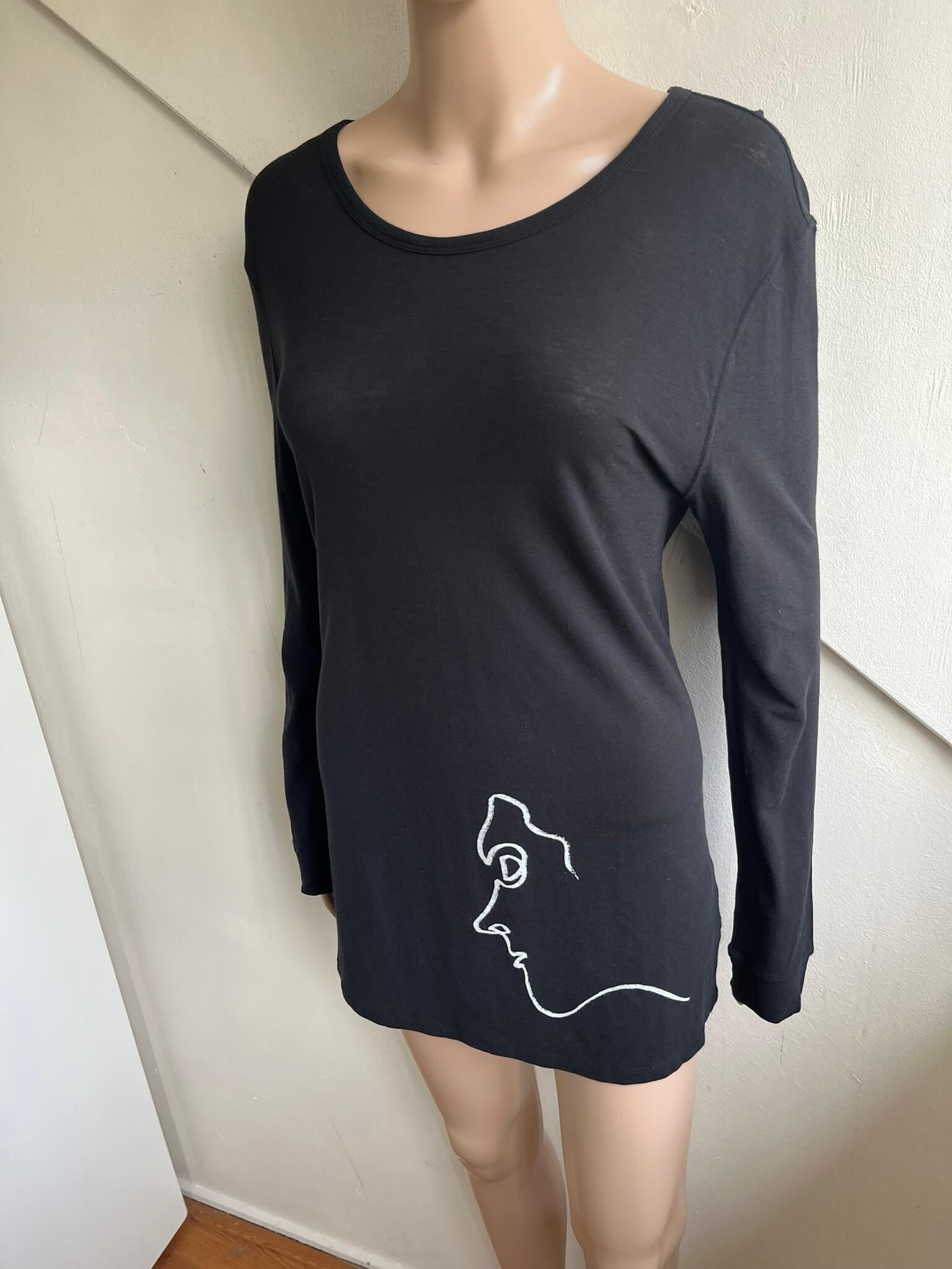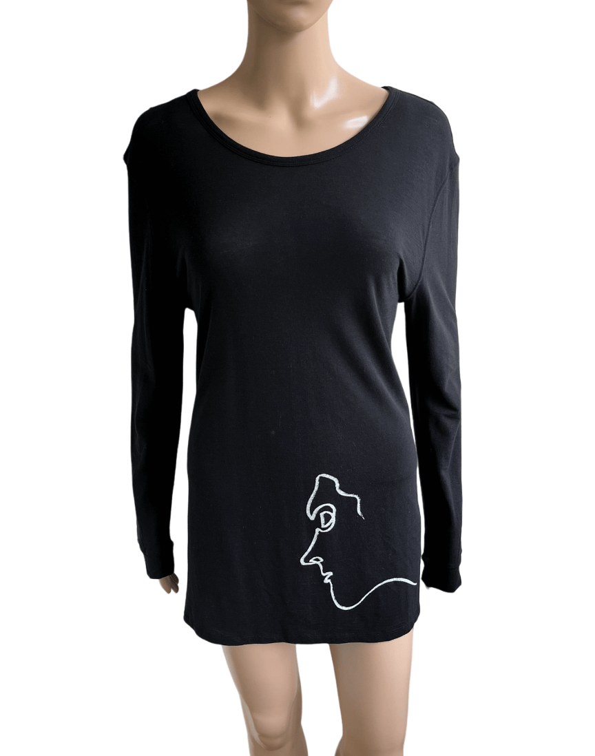 Zwarte longsleeve top met witte print van een gezicht in de maat 3 = 38. Gemaakt van katoen. Oksellengte 48 cm en lengte 71 cm.