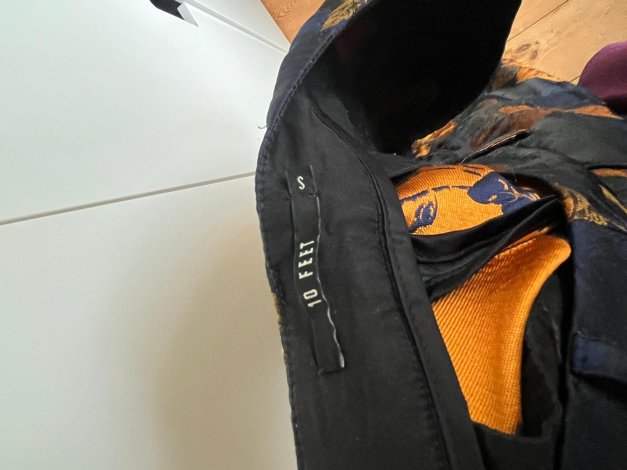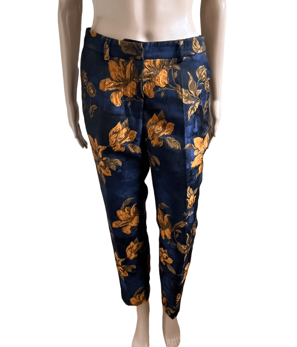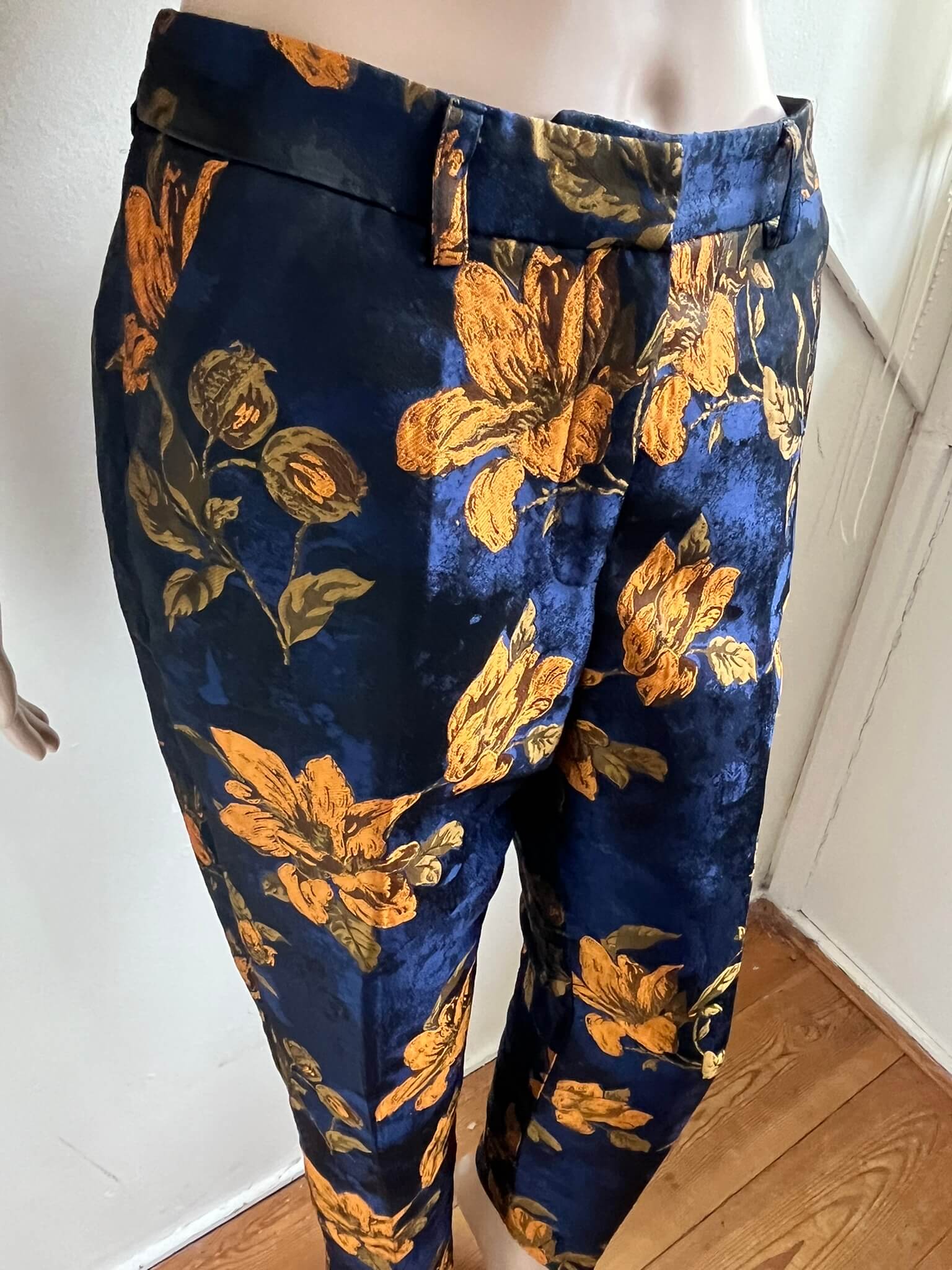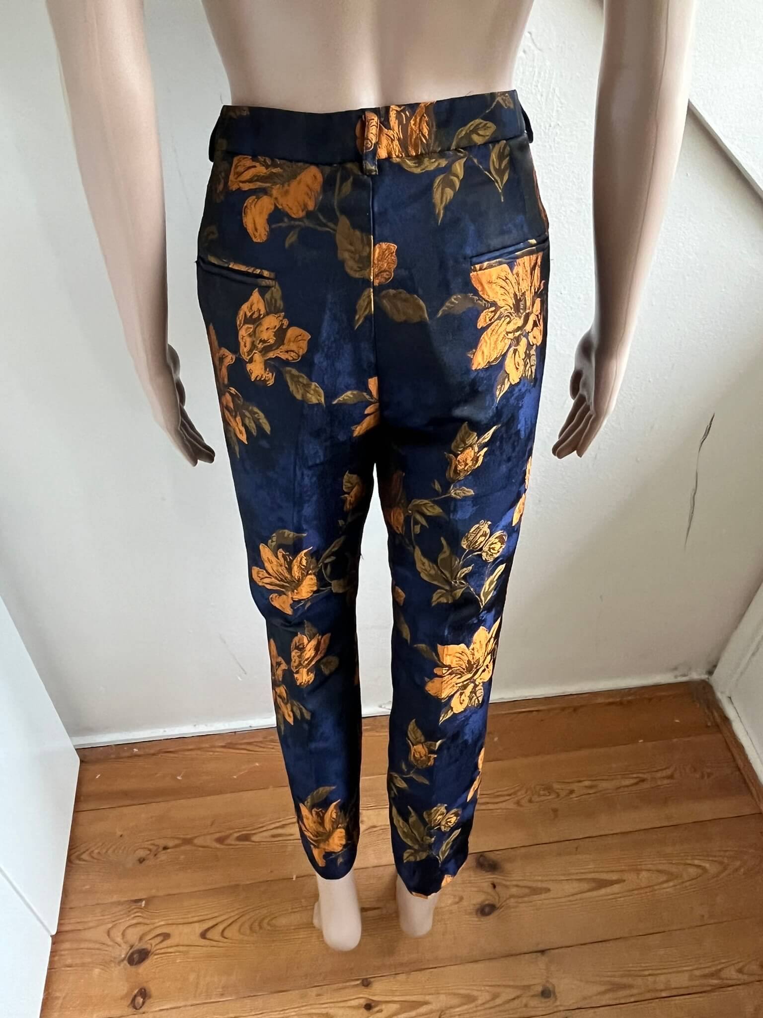 Donkerblauwe licht glanzende broek met een print van oranje / mosterdgele bloemen in de maat S. Taille is 42 cm en buitenbeenlengte 92 cm.