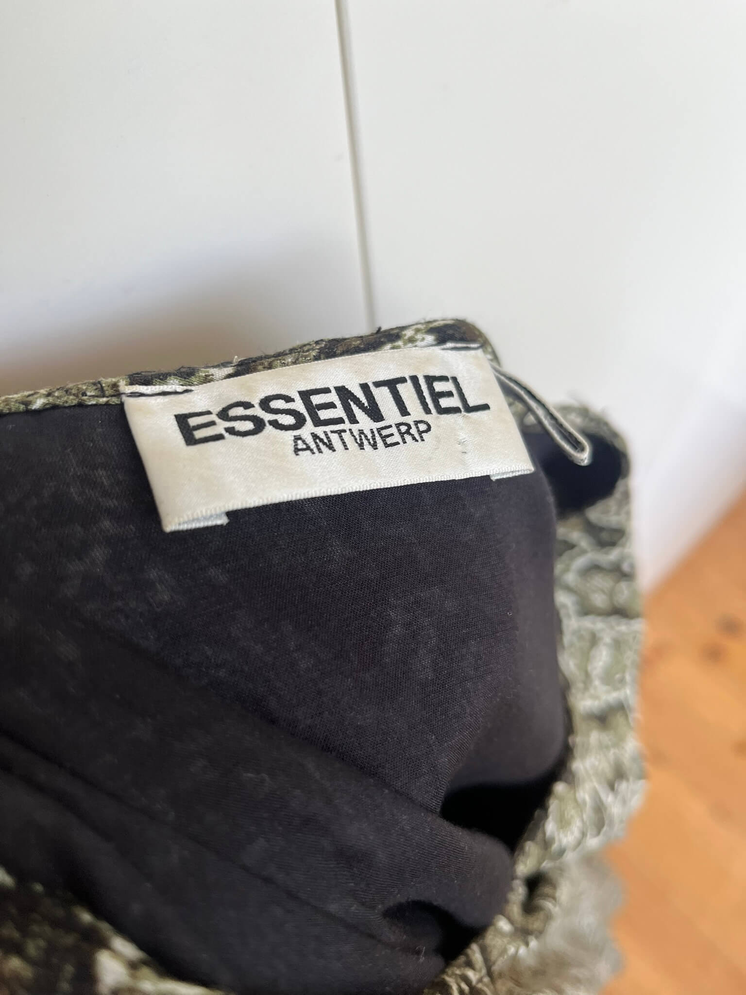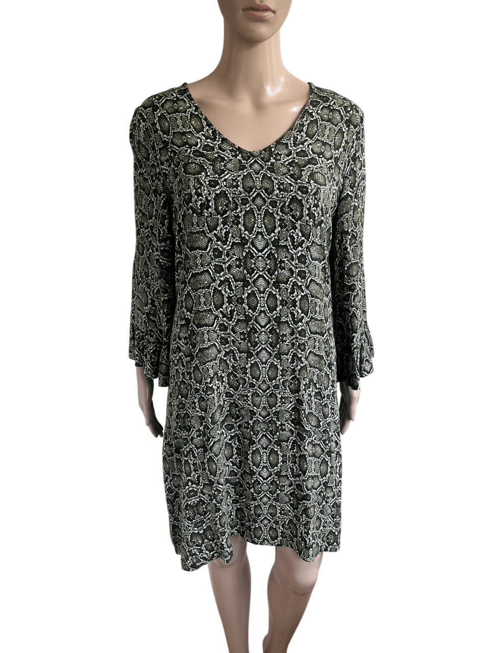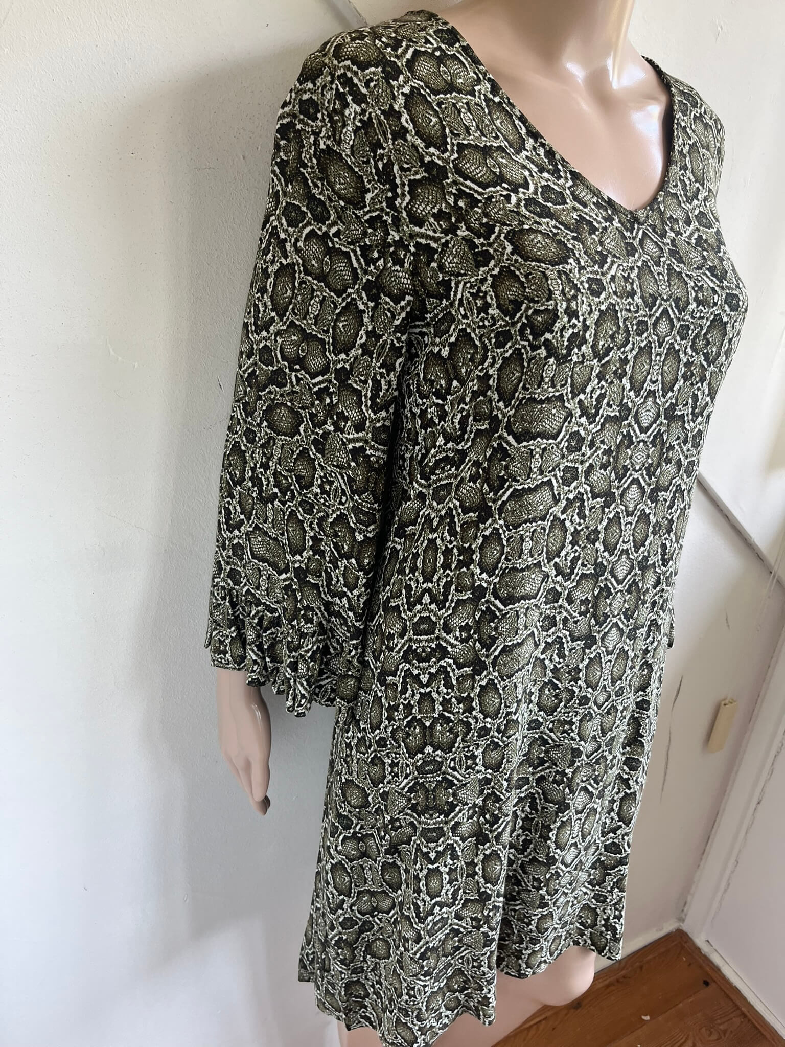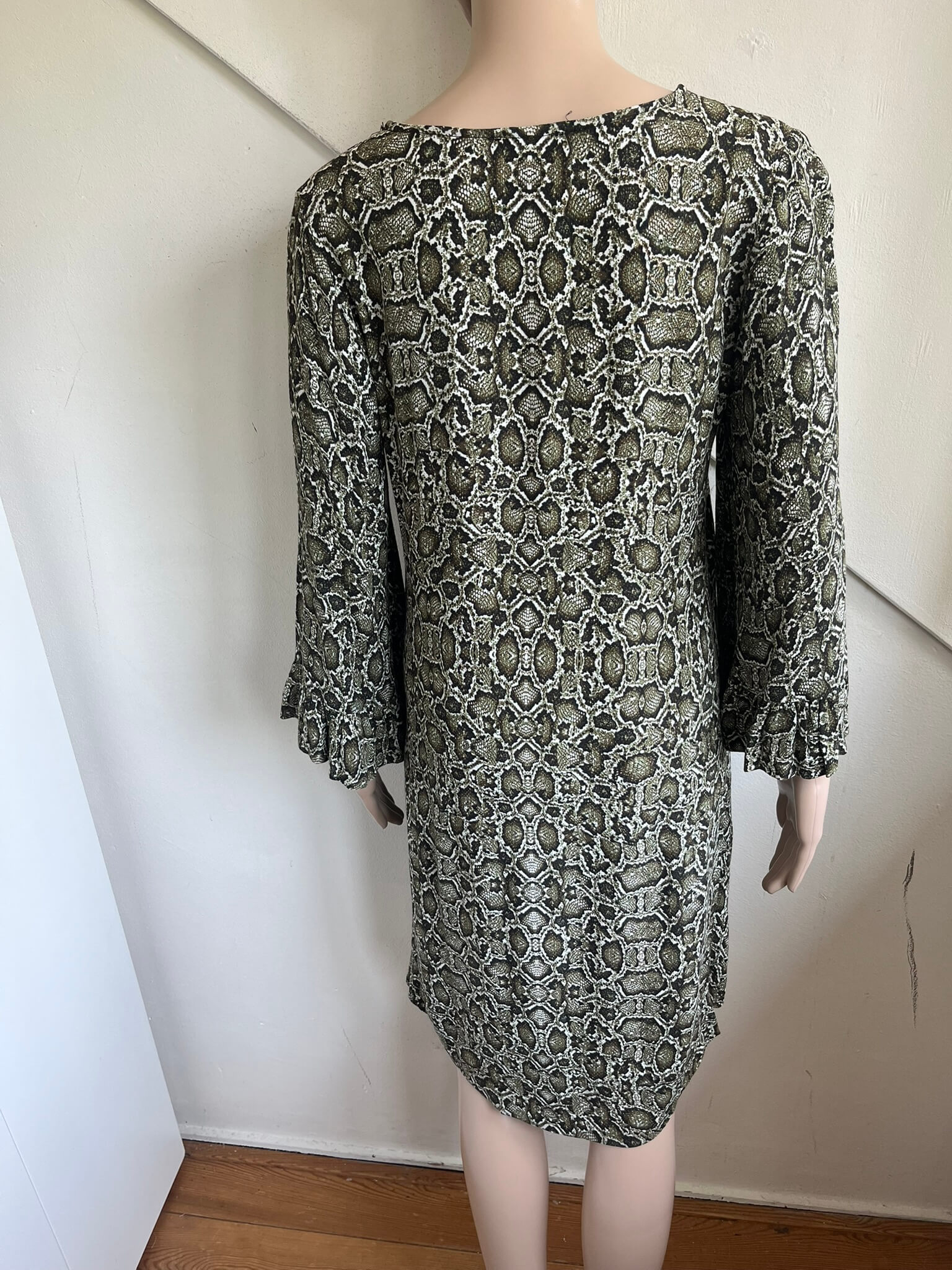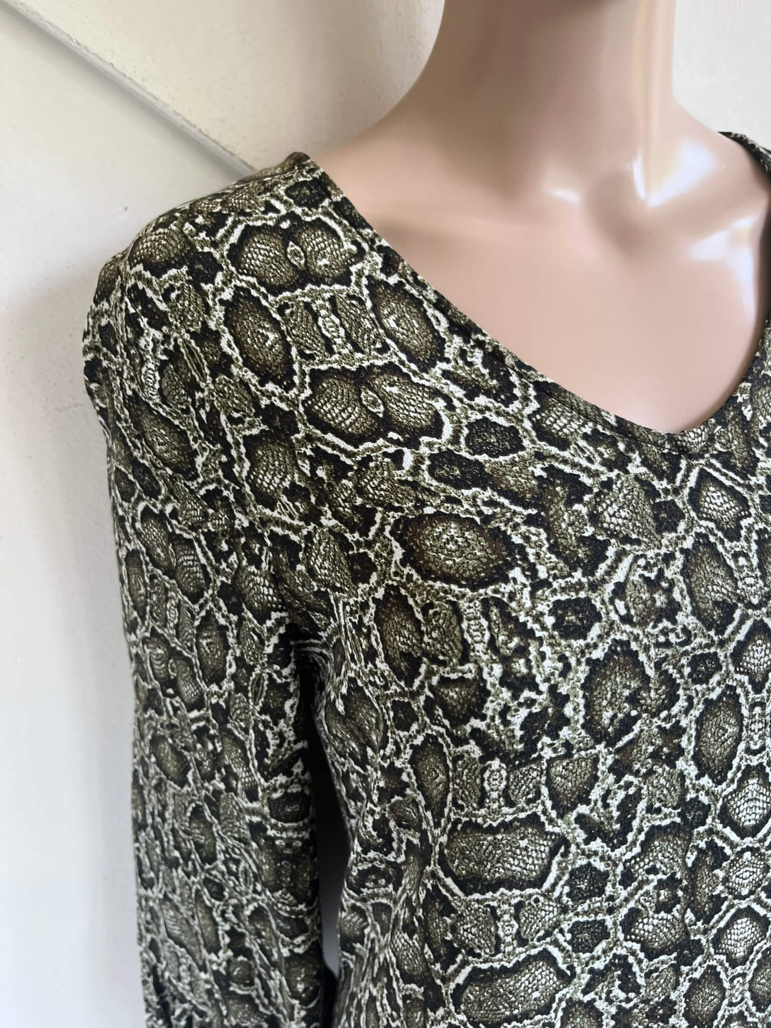 Donkergroene jurk met lichter groene print in de maat S. Gemaakt van viscose en de voering is ook van viscose gemaakt. Oksellengte 46 cm en lengte 88 cm.