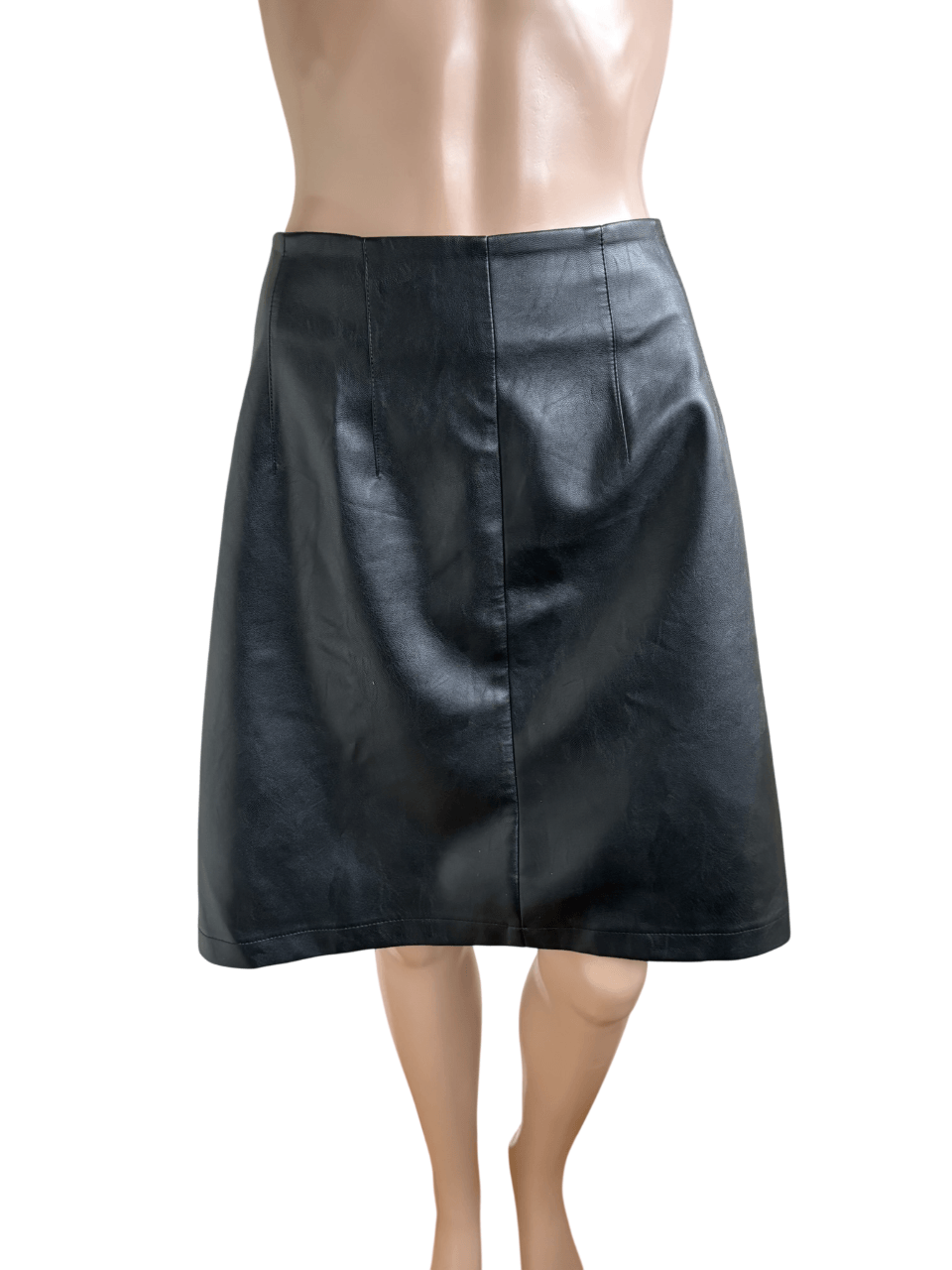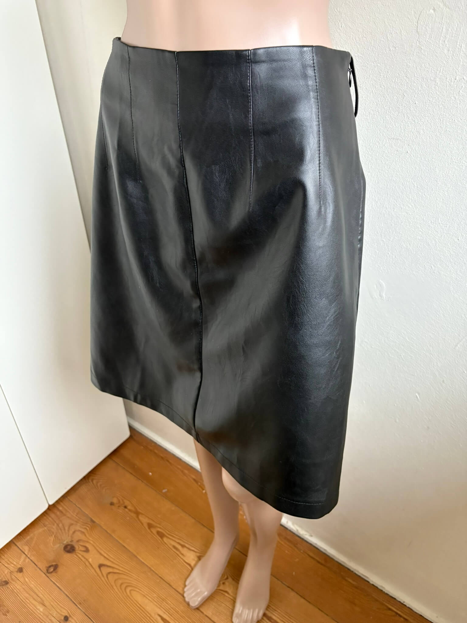 Zwarte pu-leren rok in de maat 42. Gemaakt van polyurethaan. Taillewijdte 41 cm en lengte 54 cm.