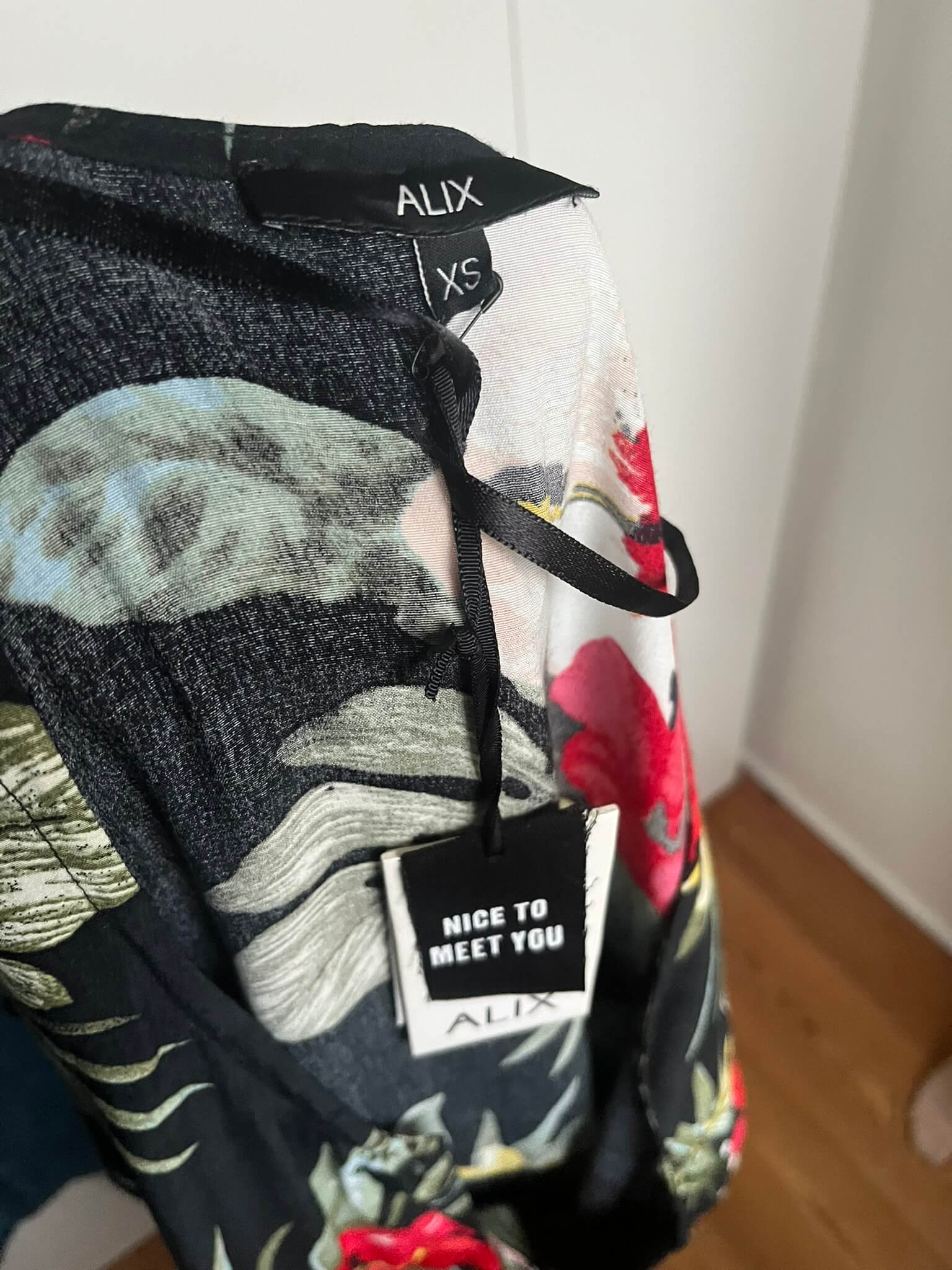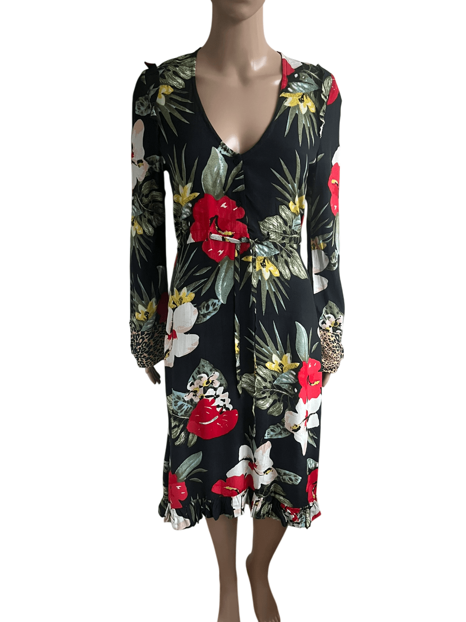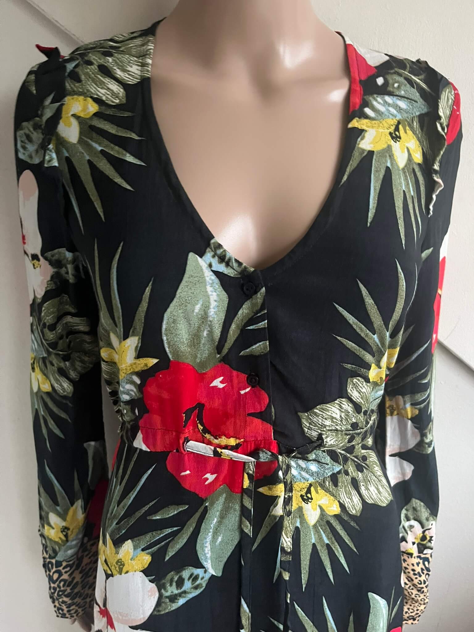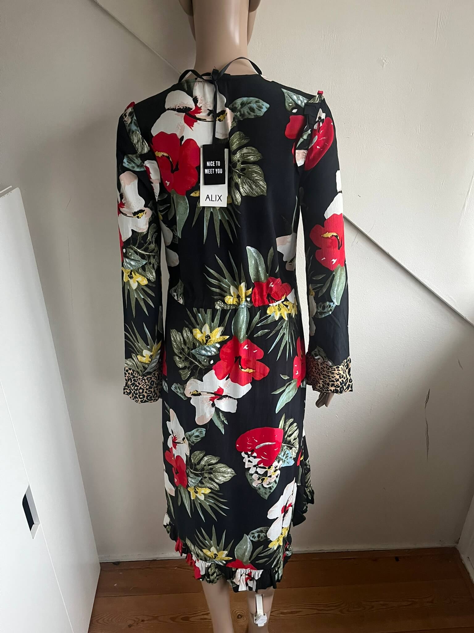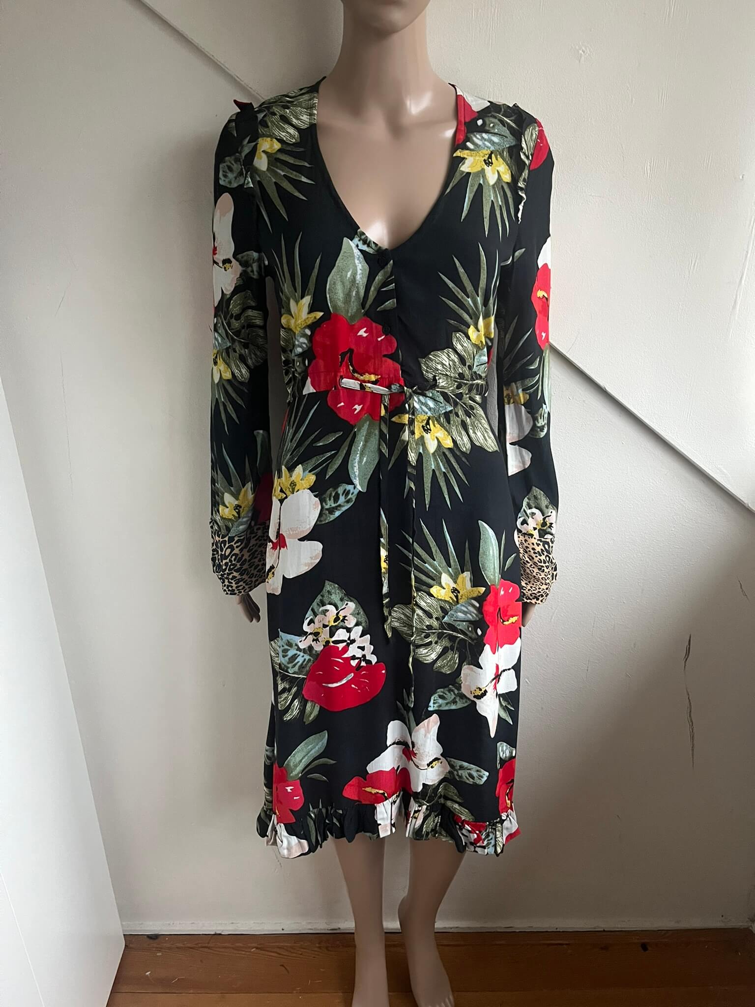 Niw=euwe zwarte jurk met rood en groene bloemenprint en roezels in de maat 34/36. In het label staat maat XS maar oksellengte is 46 cm dus een maat S zou net zo goed passen. Gemaakt van viscose en de lengte is 115 cm.