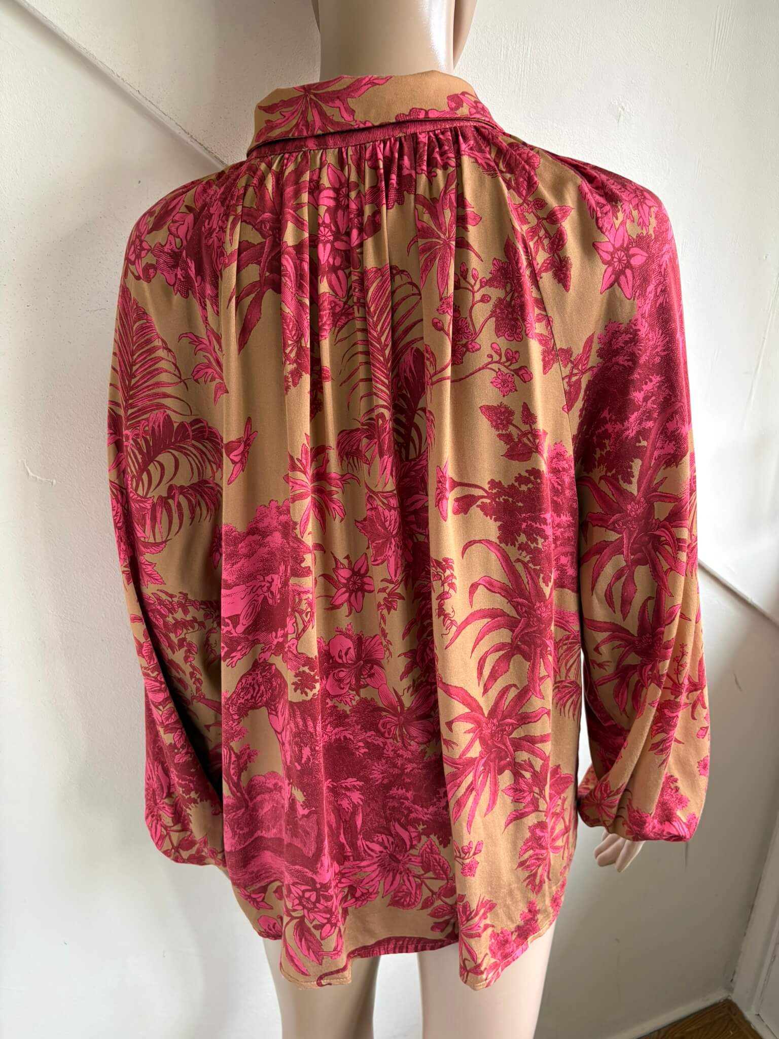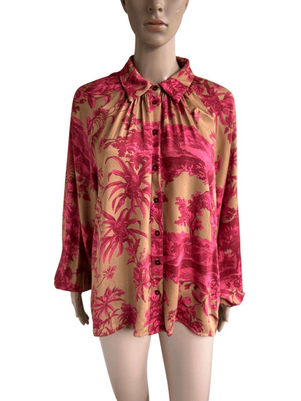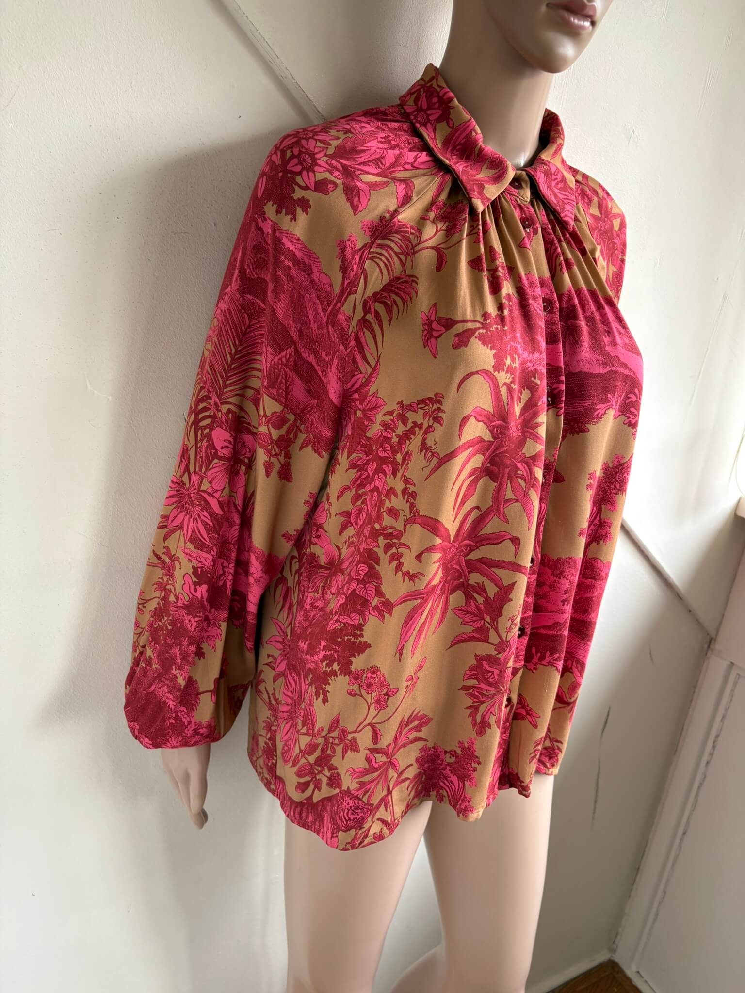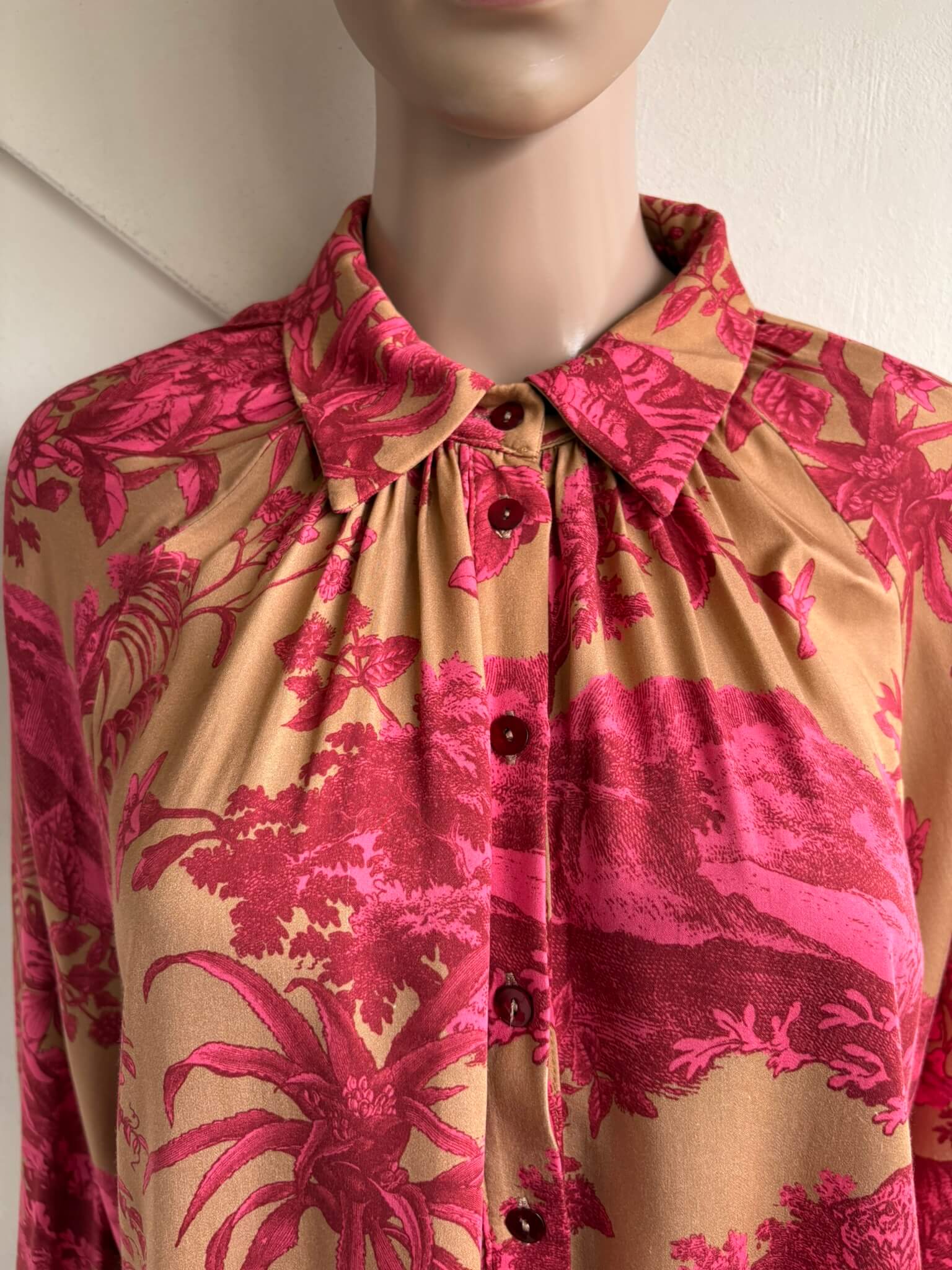 Lichtbruine of donker beige blouse met roze rode print van bloemen en planten in de maat S. Gemaakt van 100% viscose. Oksellengte 55 cm en lengte 68 cm.