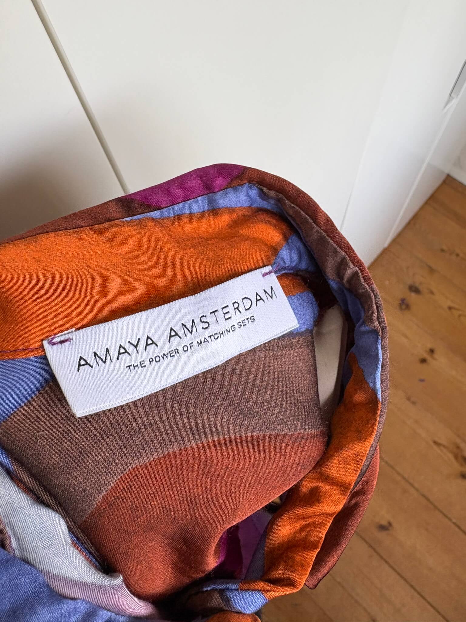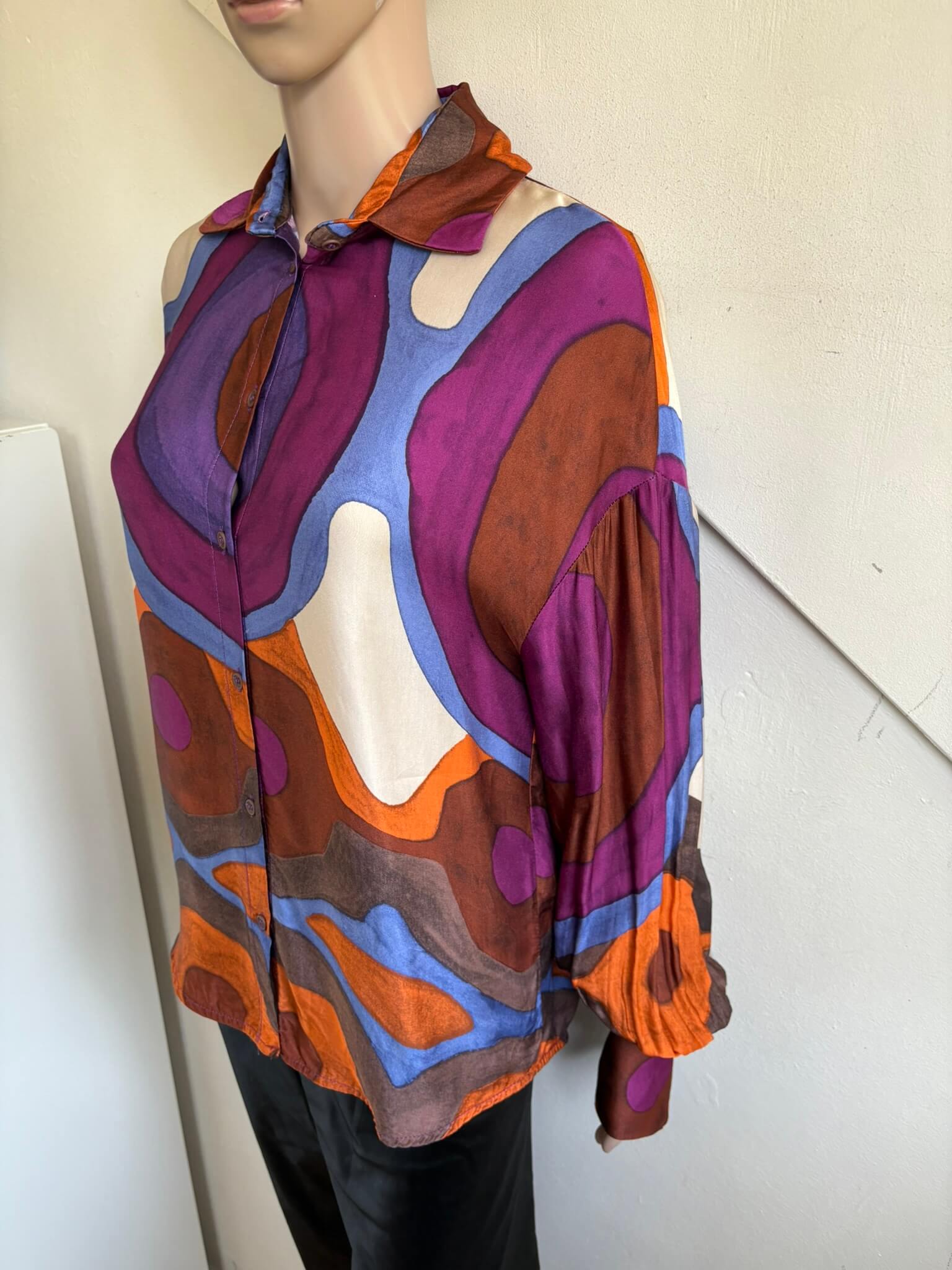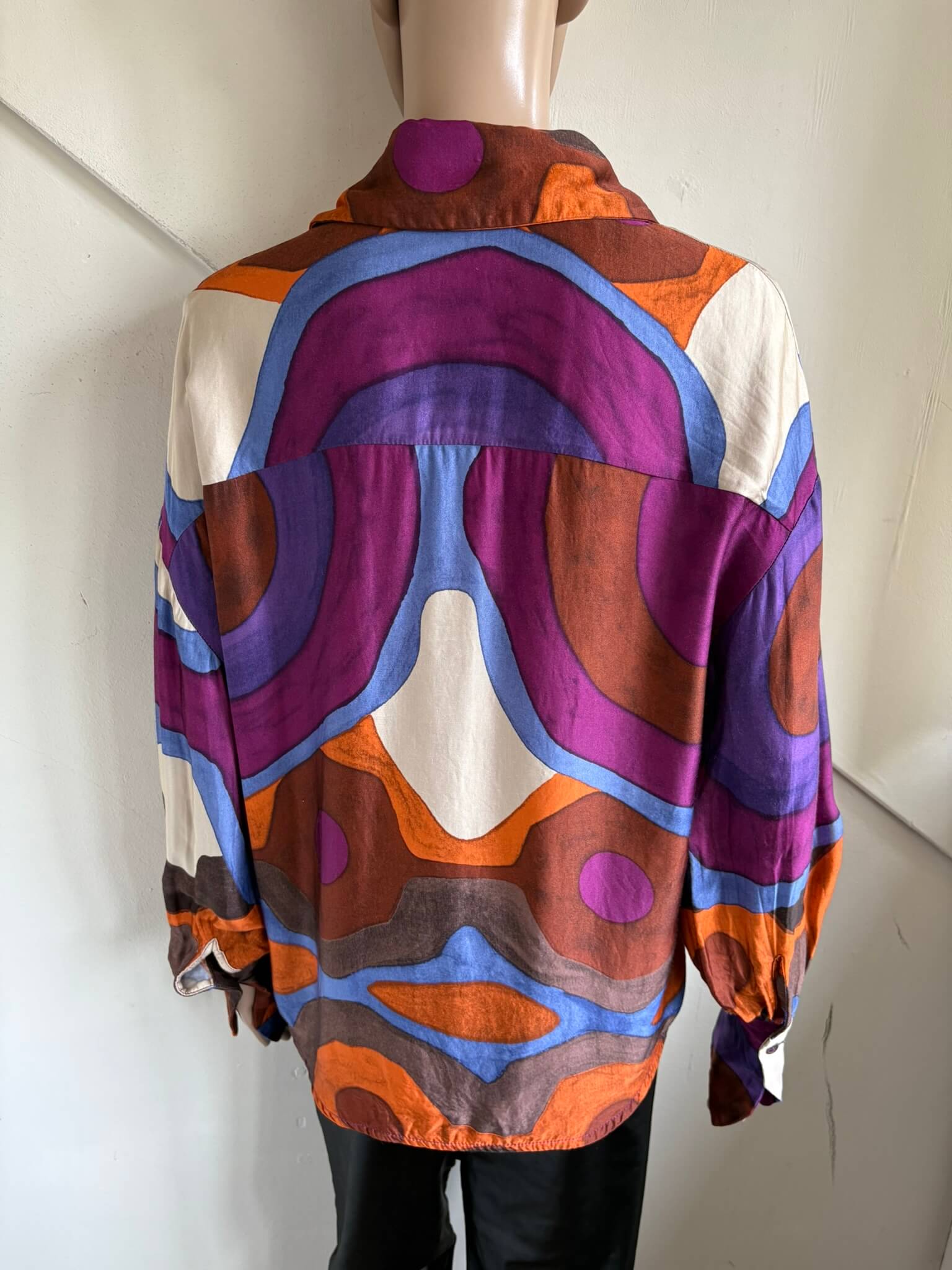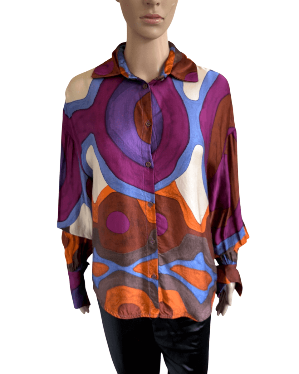 Leuke retro blouse met een paarse oranje blauw en bruine print; Georgia, in de maat S. Gemaakt van viscose. Oksellengte 52 cm en lengte 65 cm.