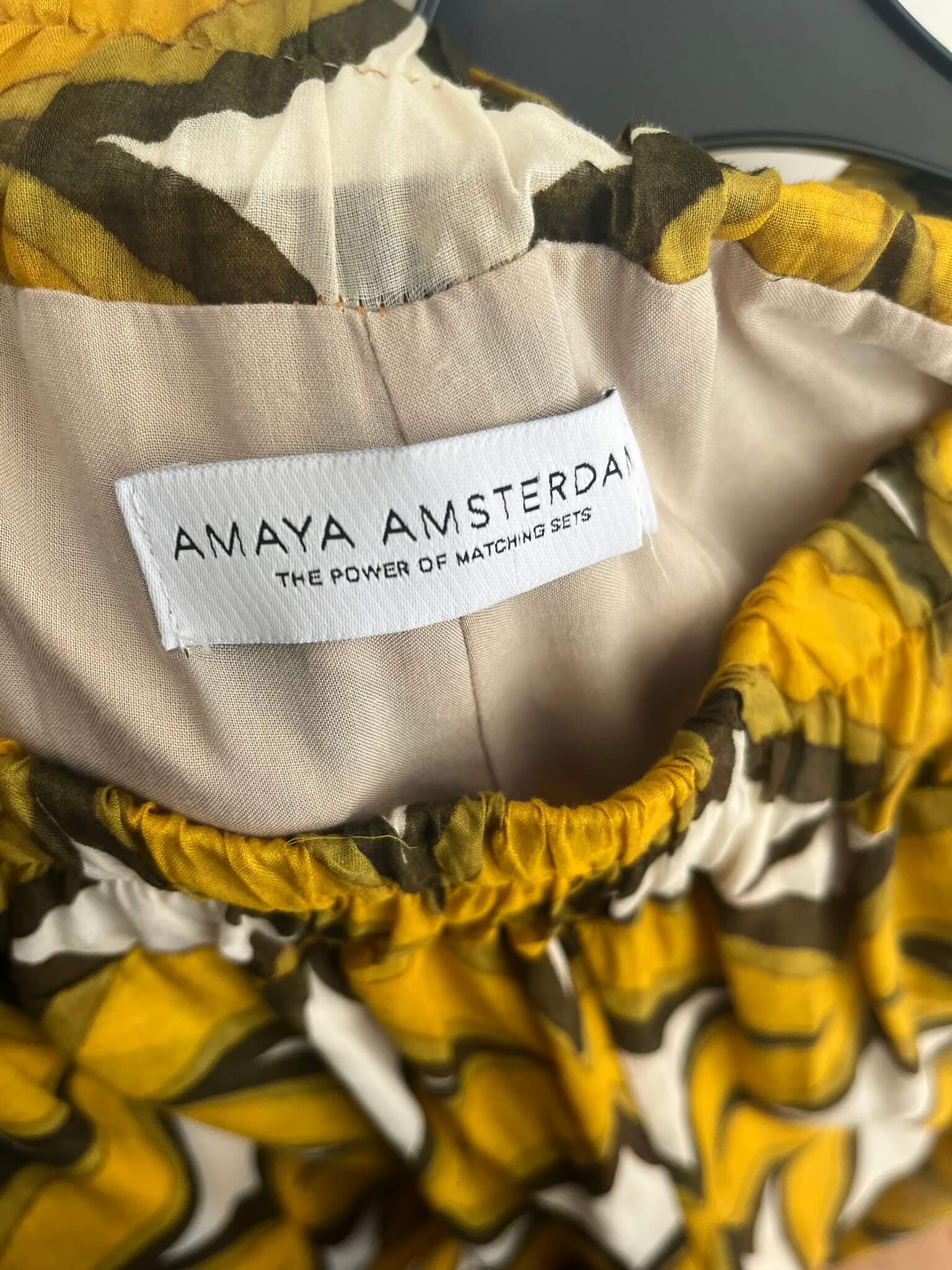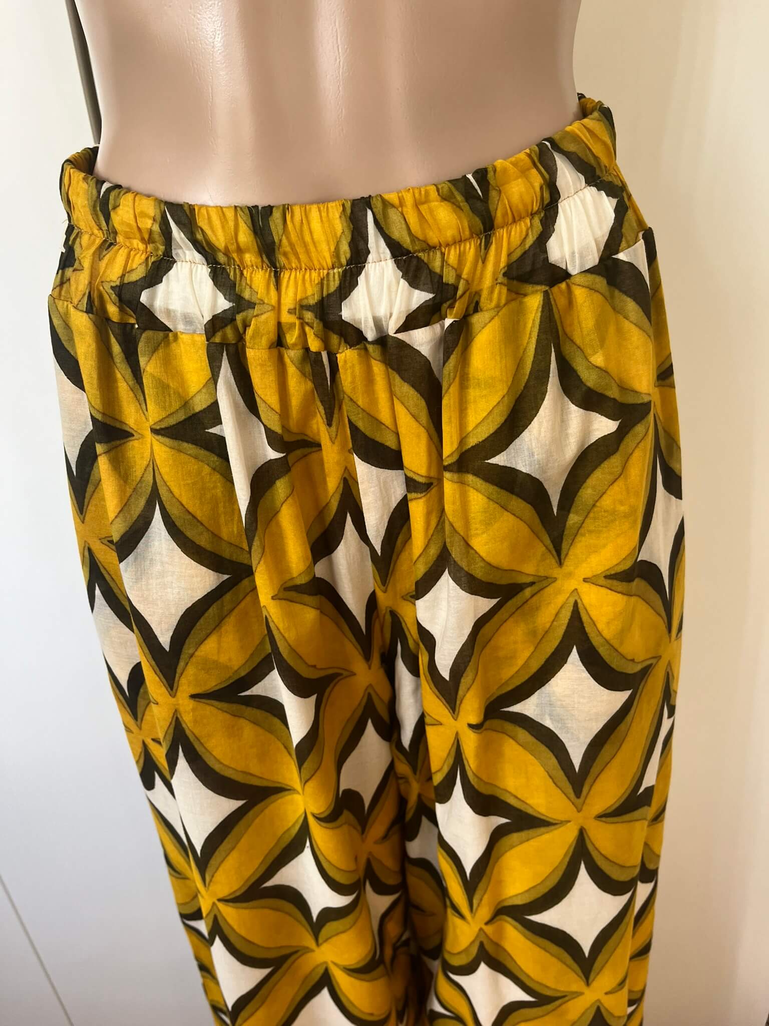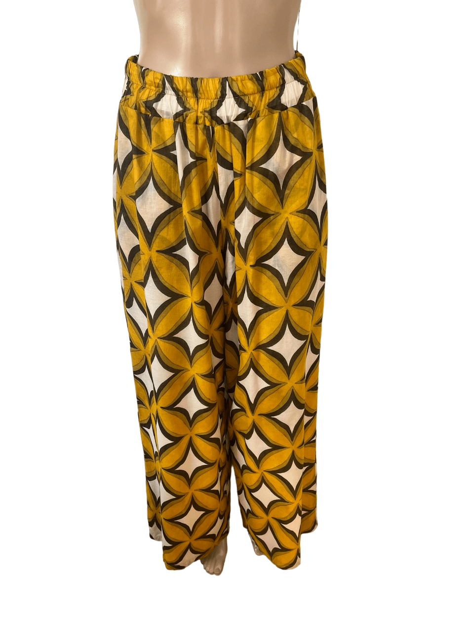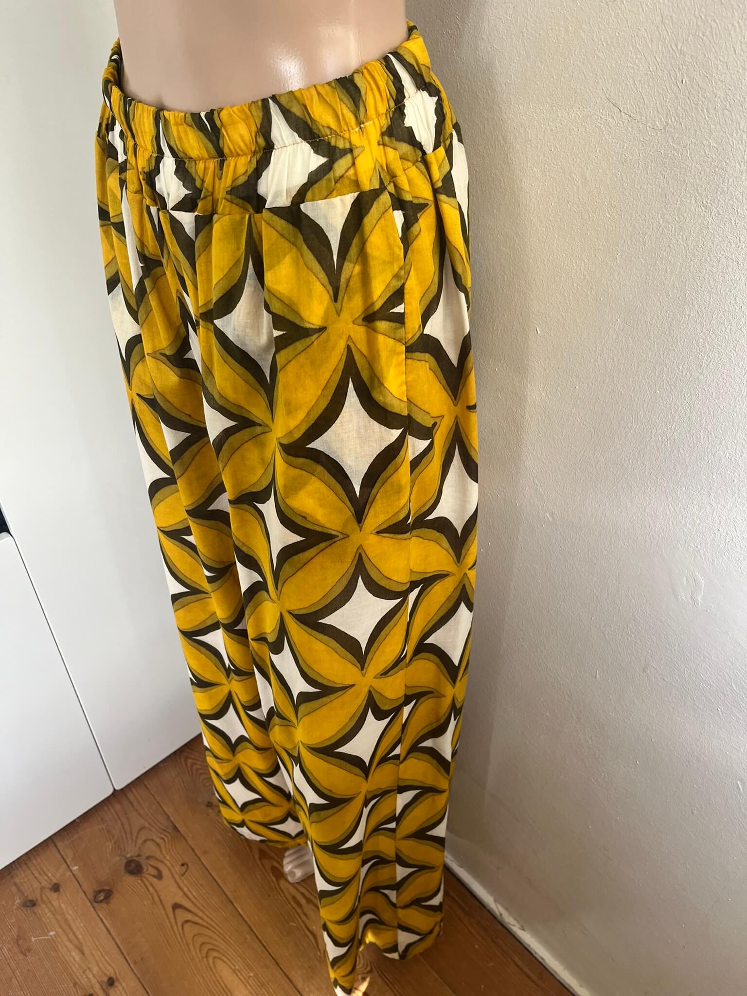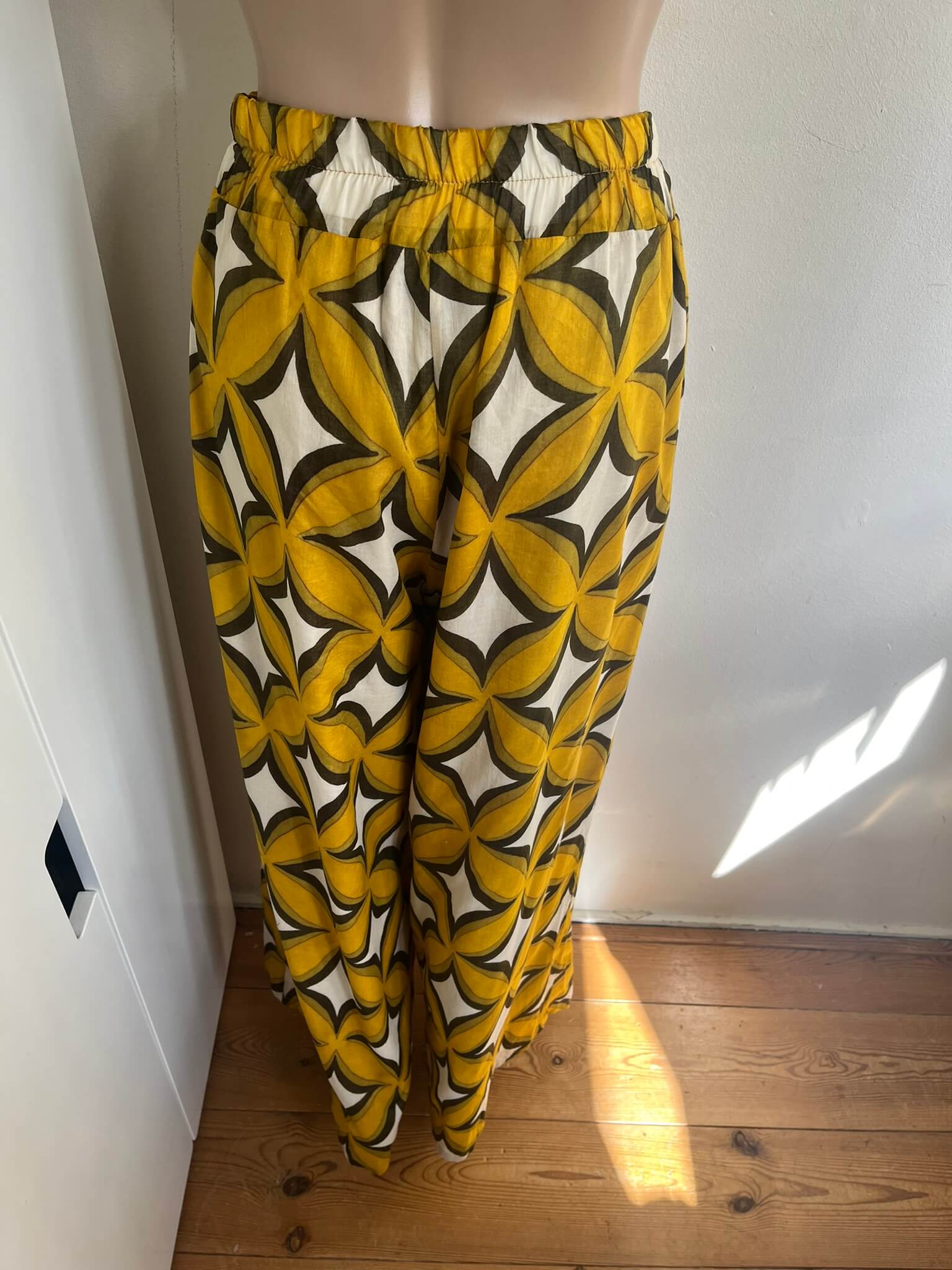 Geweldige broek met een bloemeprint in beige en geel; Milou pants flowerprint. De broek heeft wijde pijpen en een elastische taille. De maat is M . Elastische taille 35 cm en buitenbeenlengte 106 cm. Gemaakt van 100% katoen.