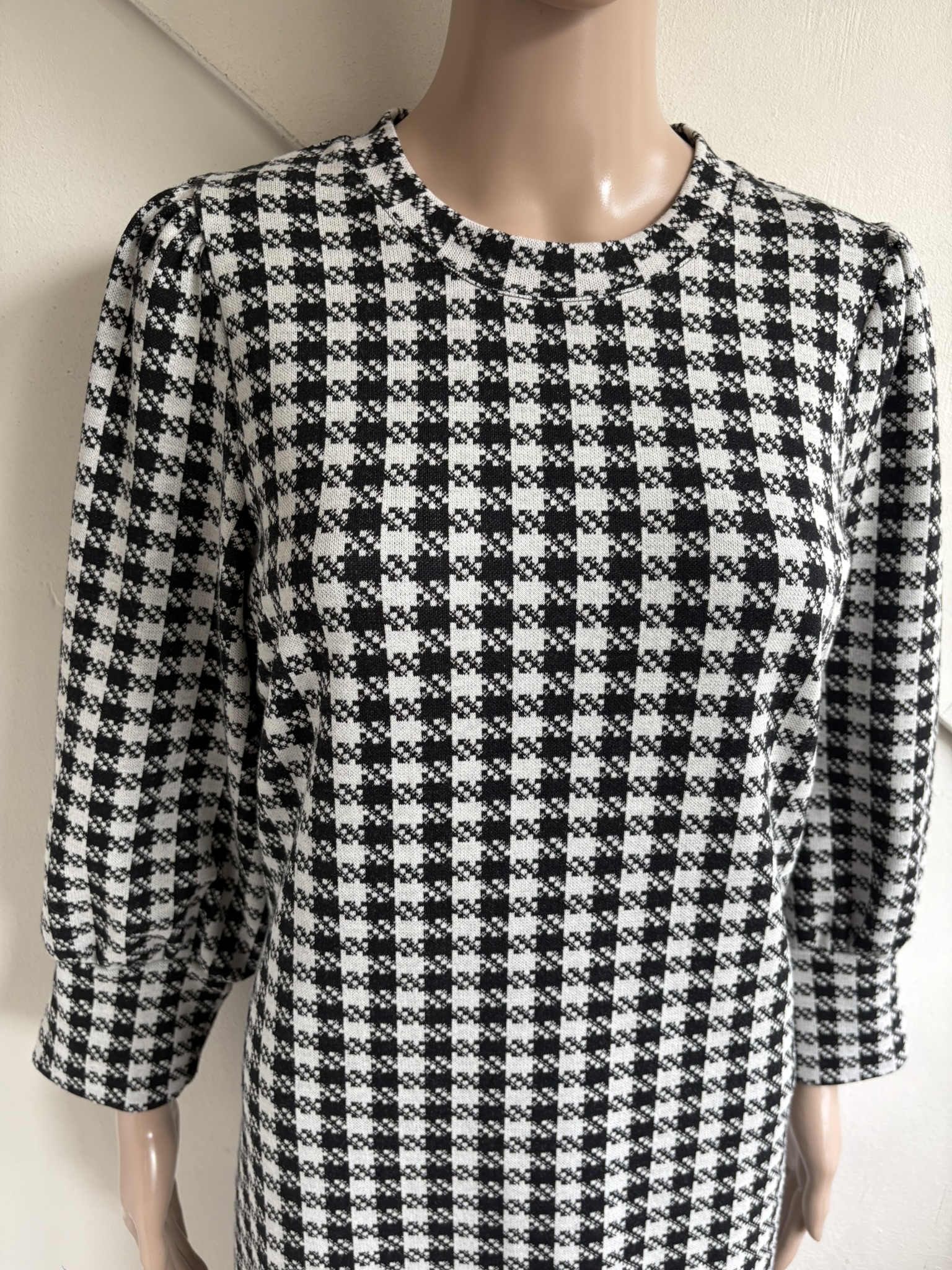 Leuke wat dikkere jurk met zwart wit motief in de maat L, wat in dit geval als maat 40 valt. Gemaakt van polyester, viscose en elastaan. Oksellengte 50 cm en lengte 97 cm.
