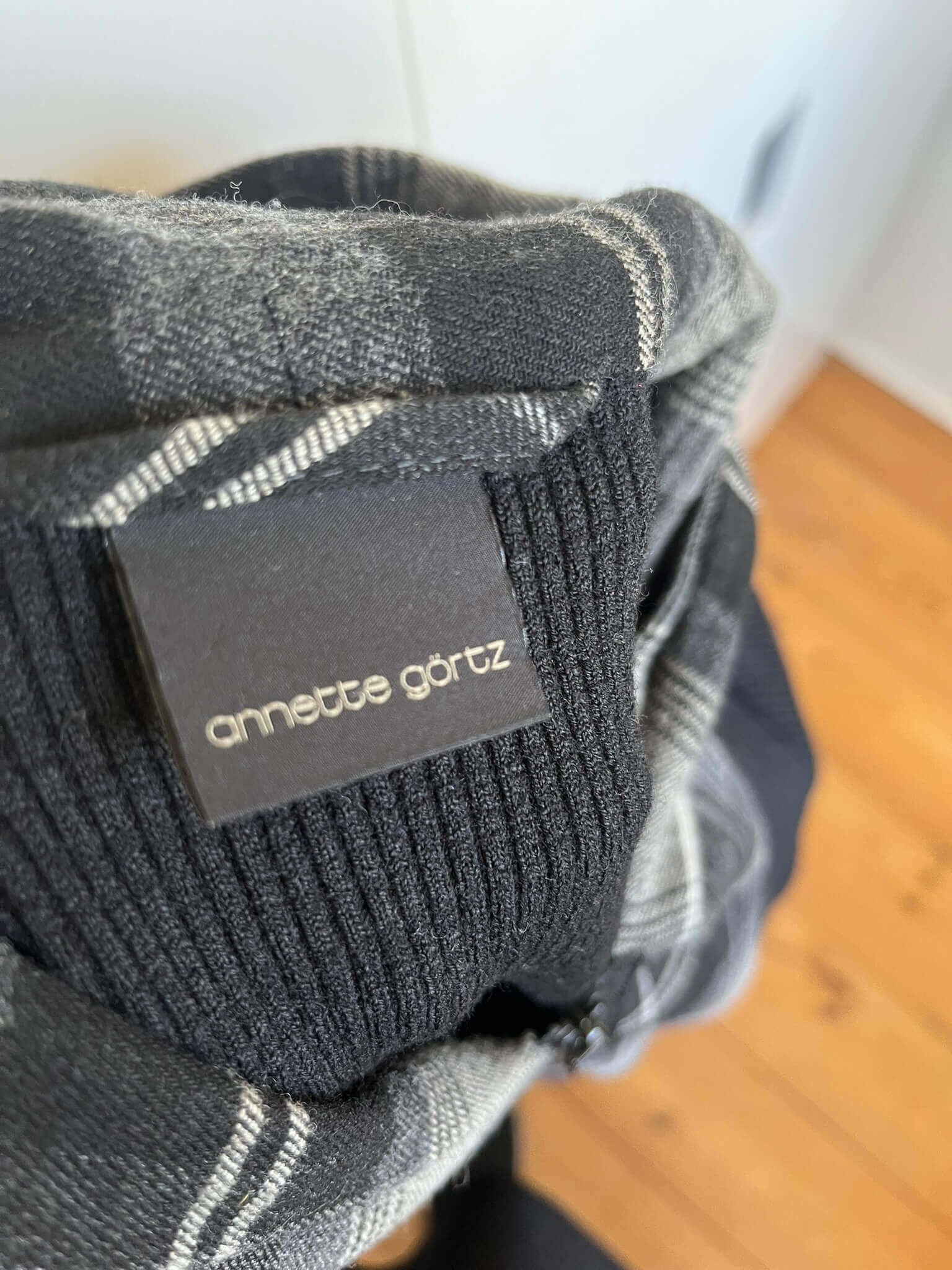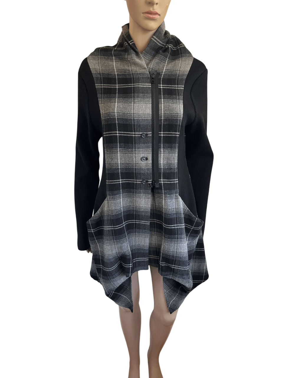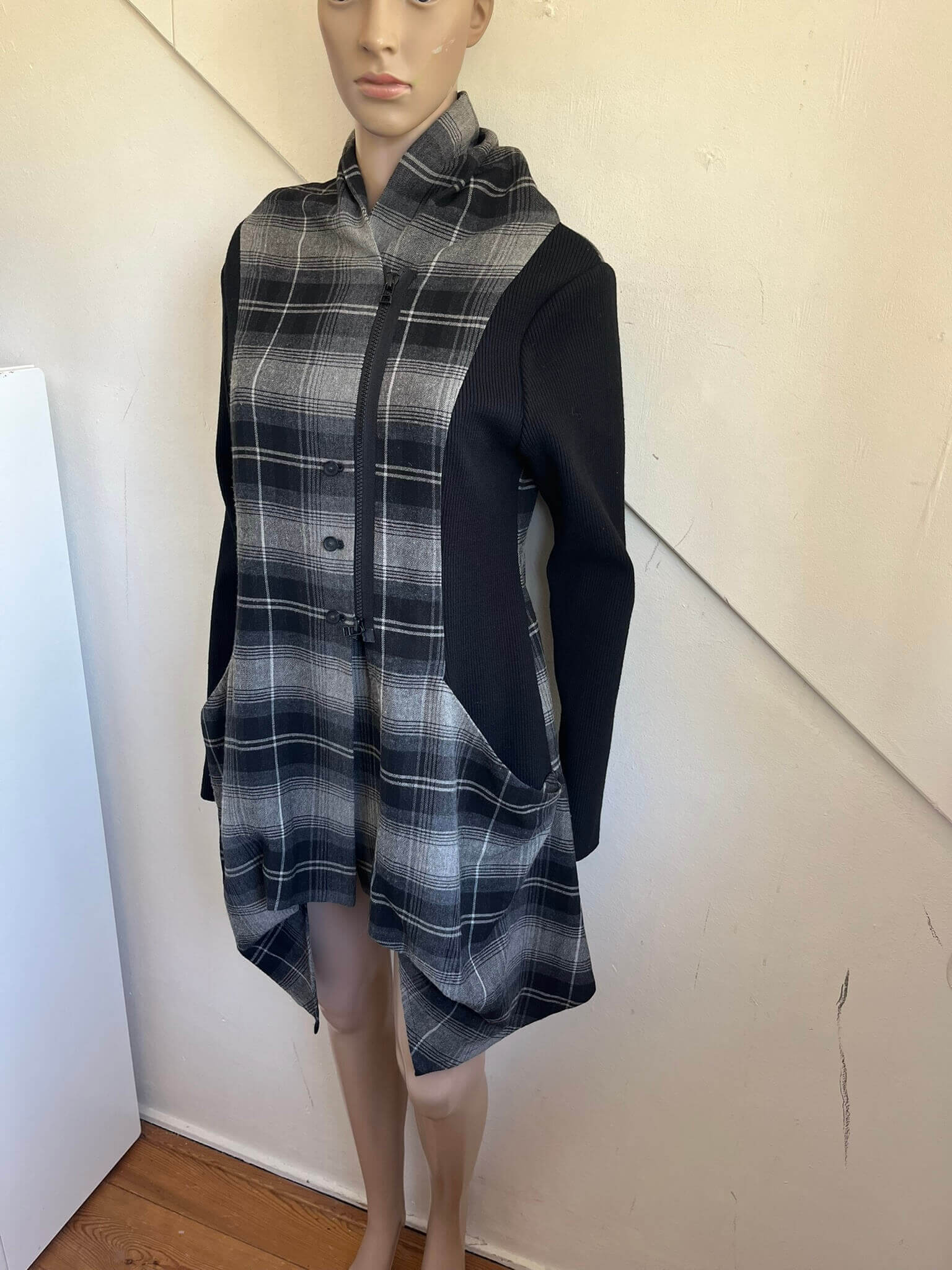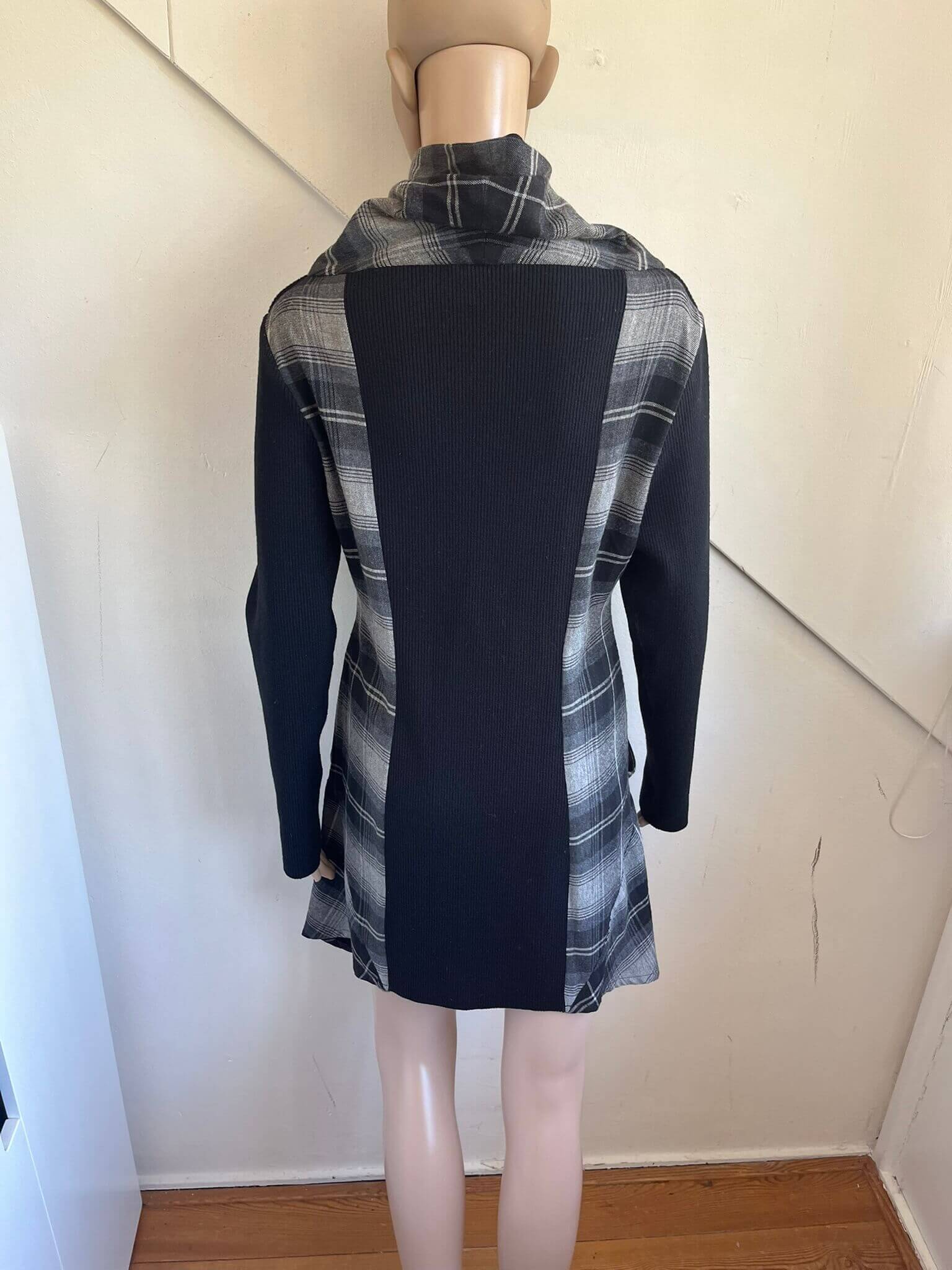 Zwart en grijs geblokt lang vest, een bijzonder model in de maat 38. Gemaakt van viscose, wol, polyamide, polyacryl en elastaan. Oksellengte is 50 cm en lengte 79 cm.