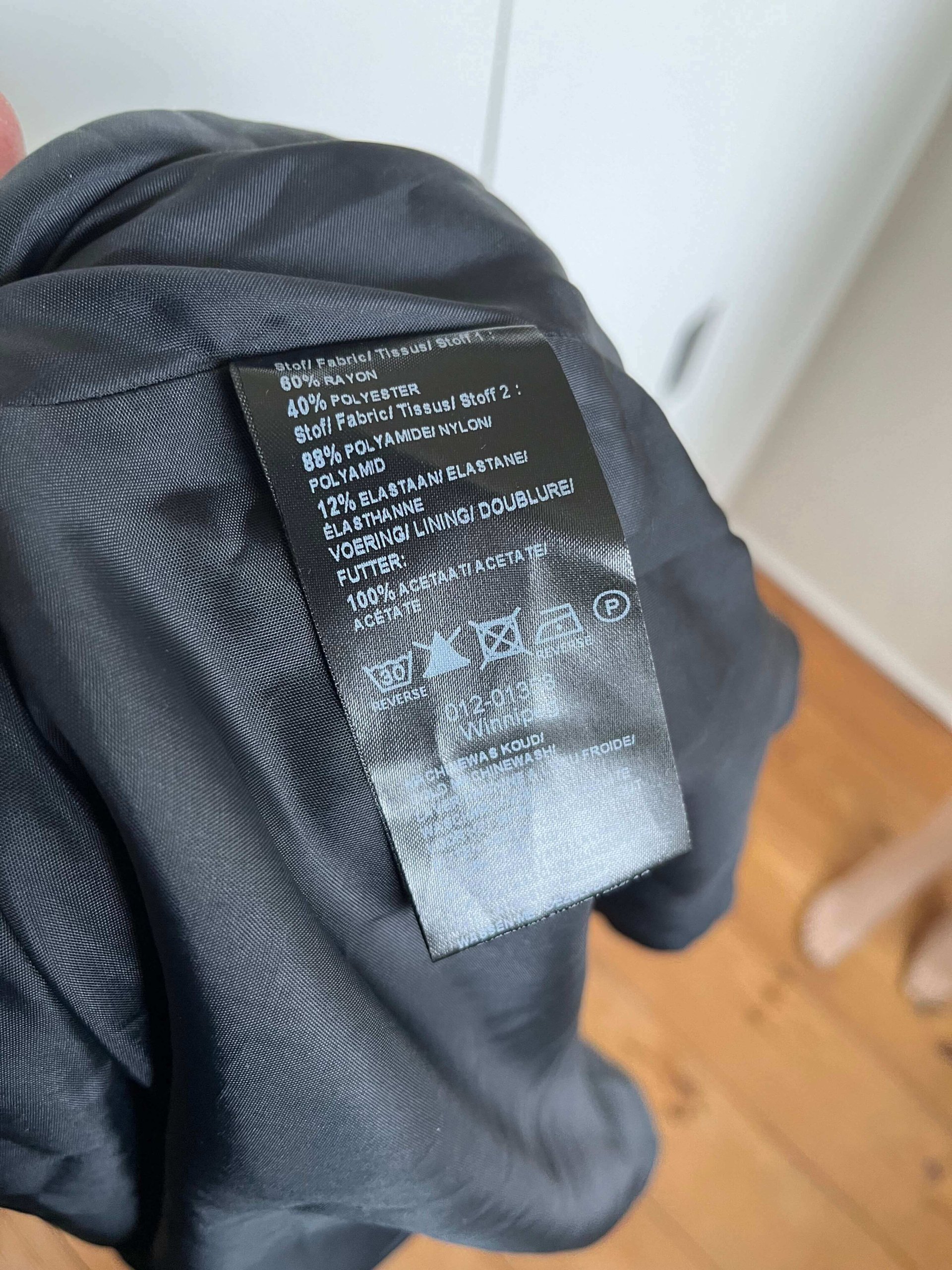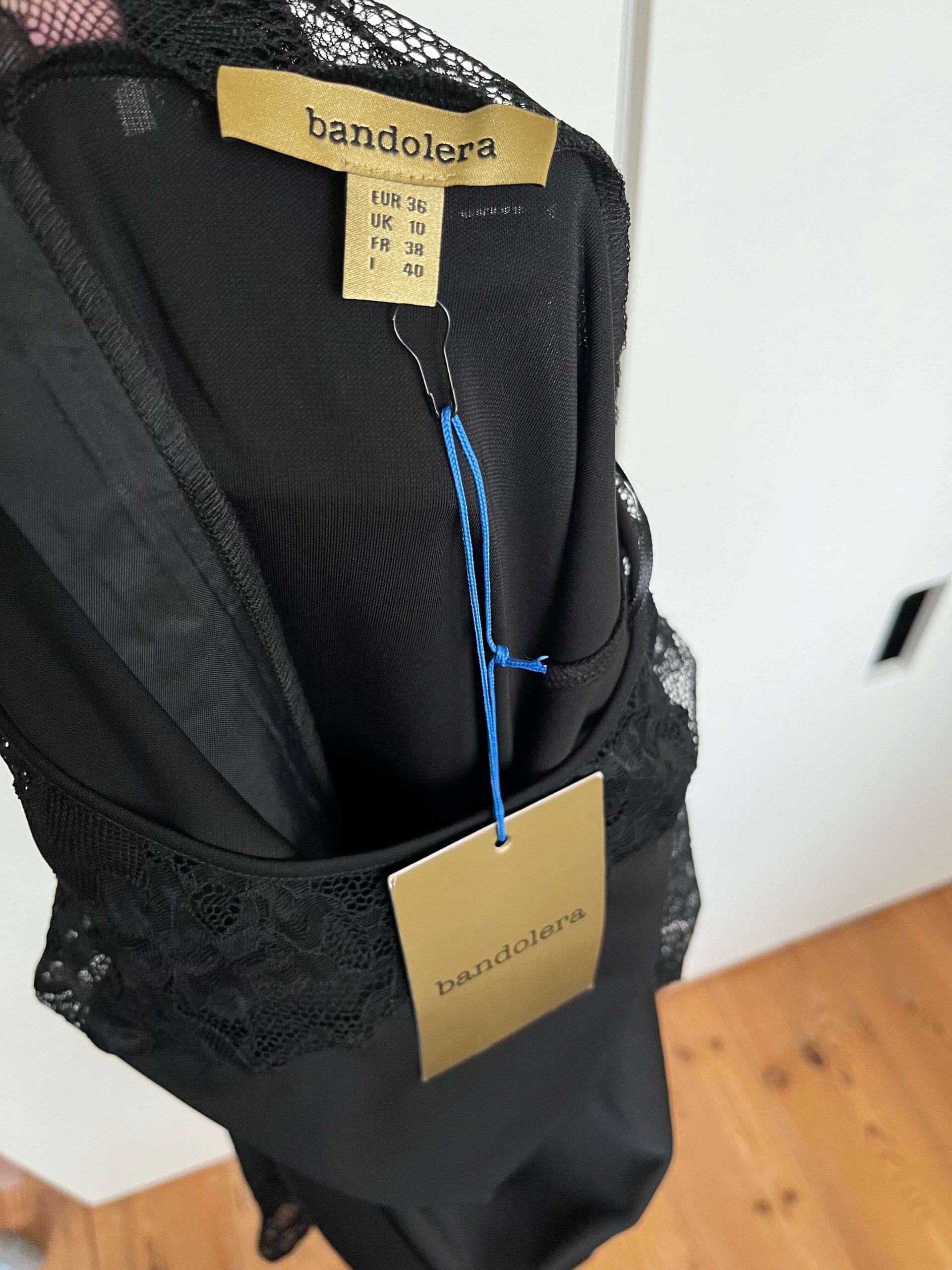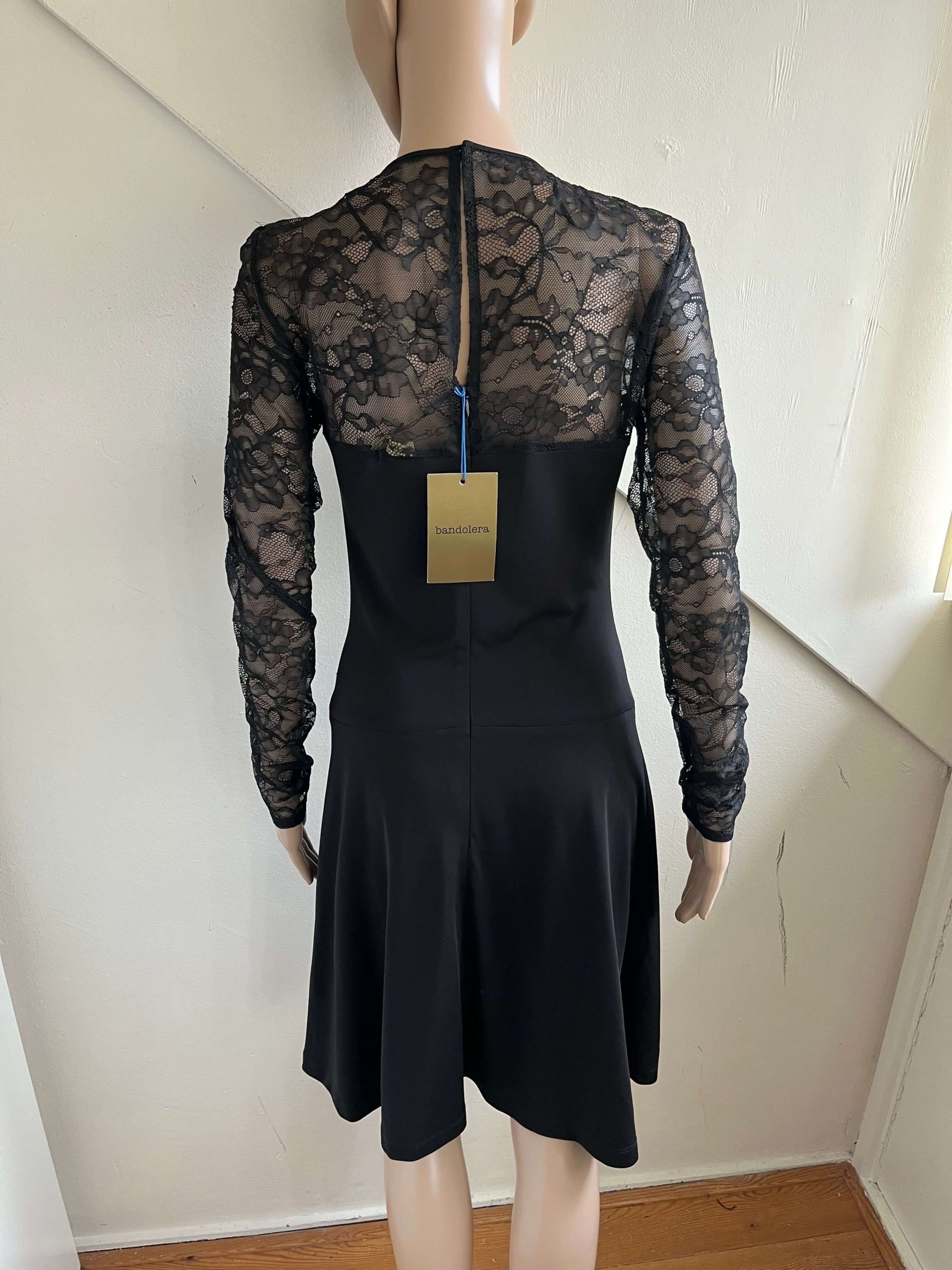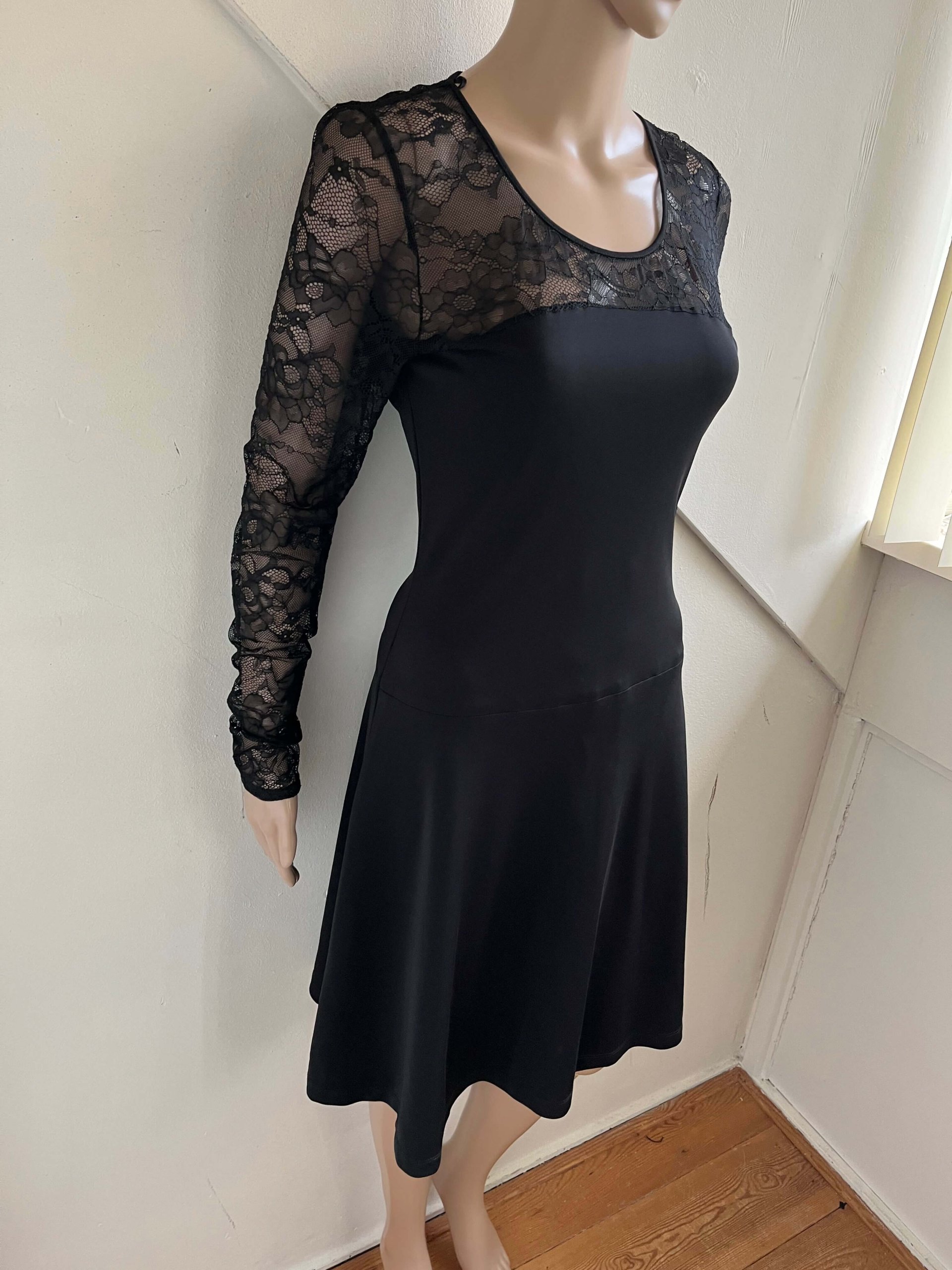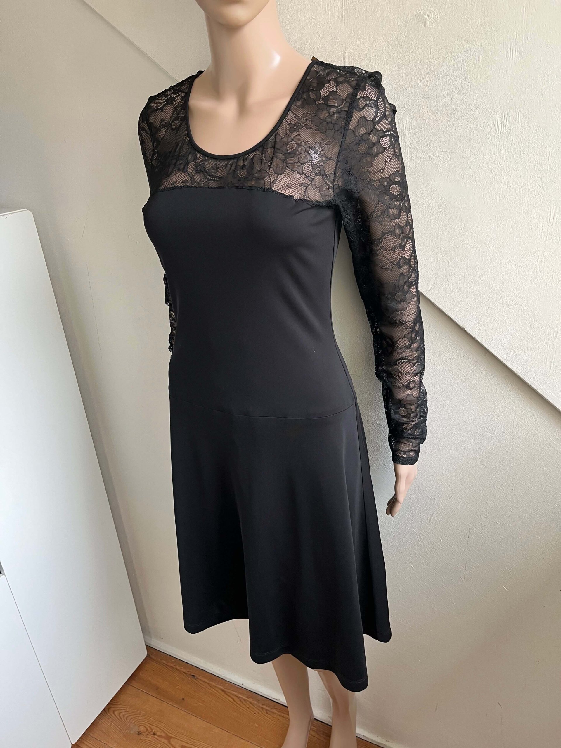 Zwarte nieuwe jurk met kant in de maat 36. Nieuw met kaartjes. Gemaakt van rayon en polyester, tweede stof polyamide en elastane en de voering van acetate. Oksellengte 44 cm en lengte 99 cm.