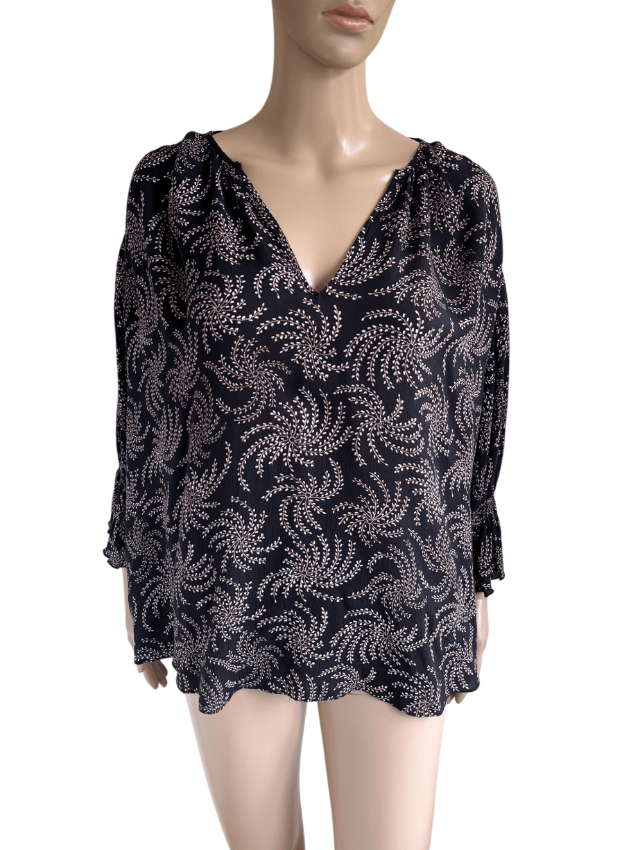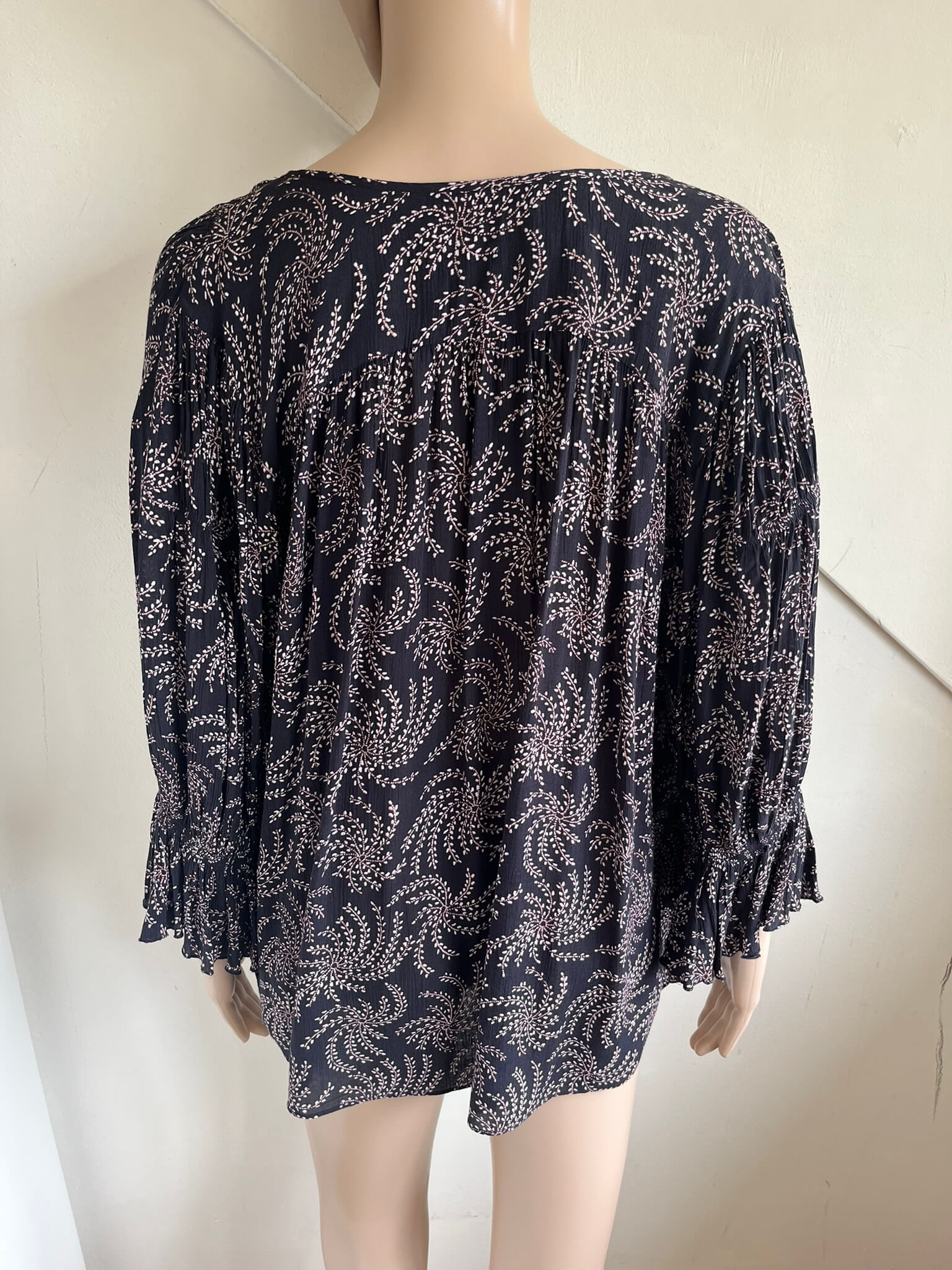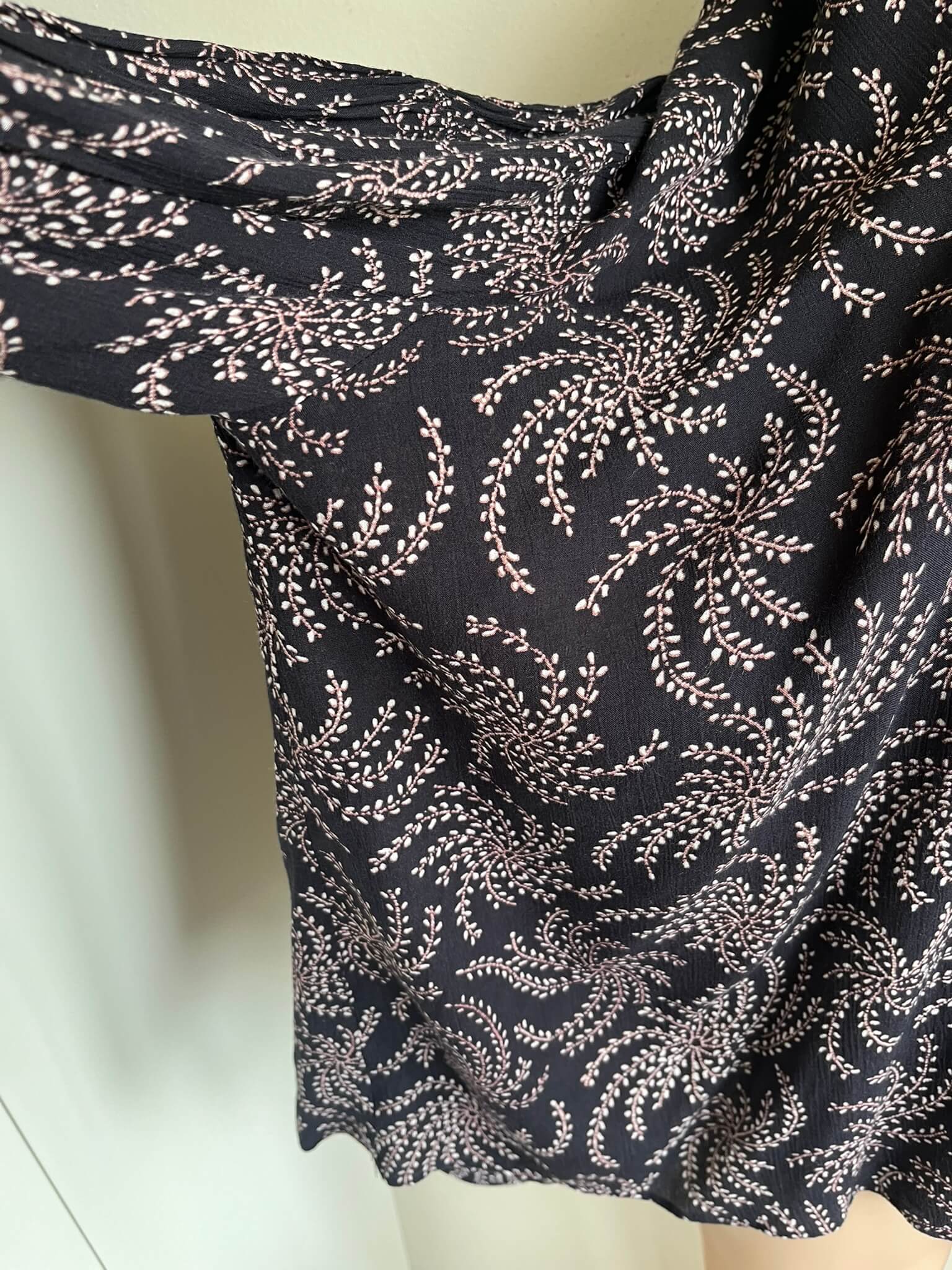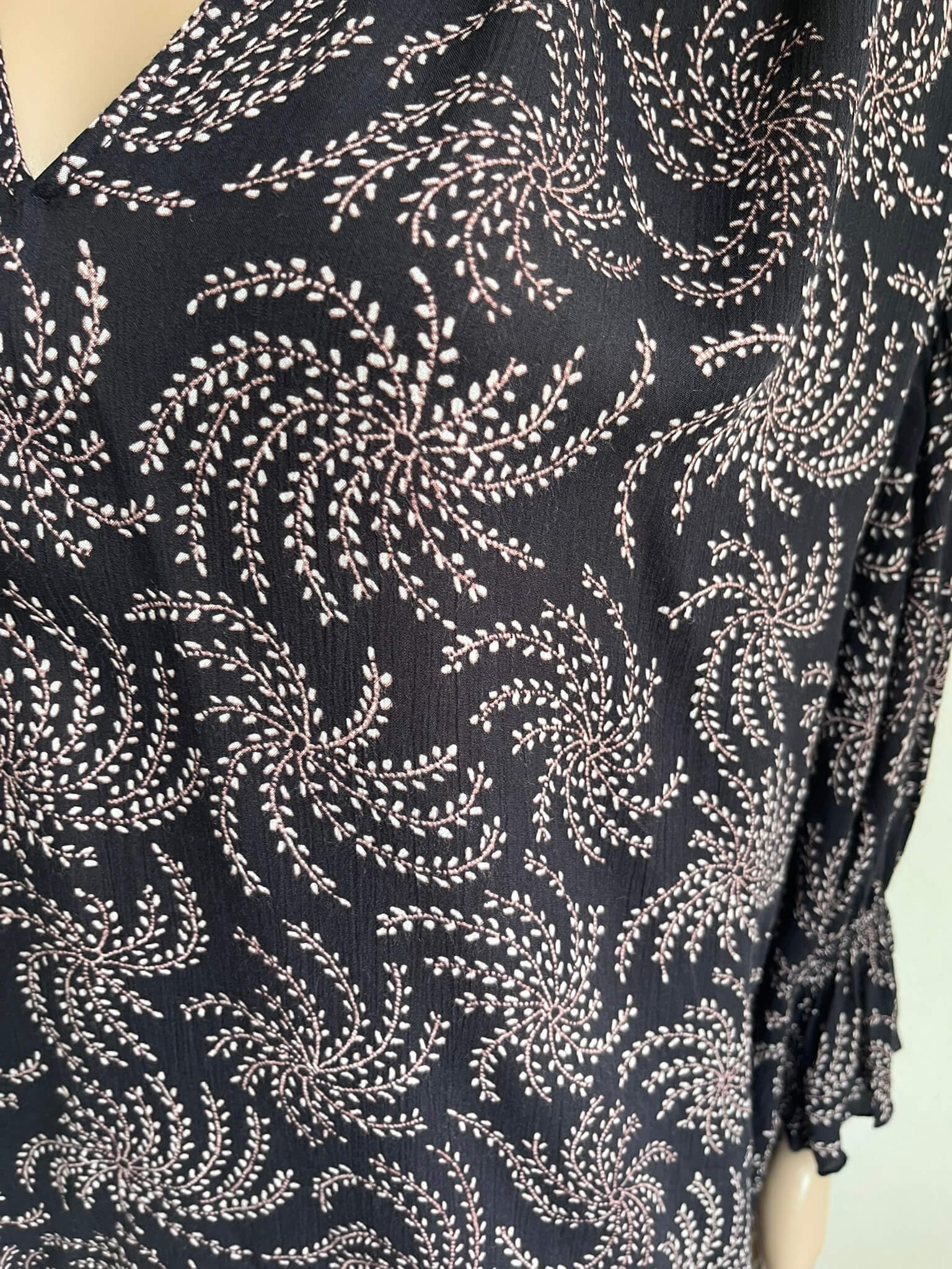 Mooie zwarte top of blouse met roze blaadjes print en wijde mouwinleg in de maat M. Daarom is de oksellengte ruim, nl 63 cm en lengte ook 63 cm. Gemaakt van viscose.