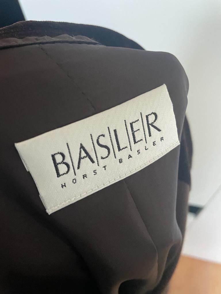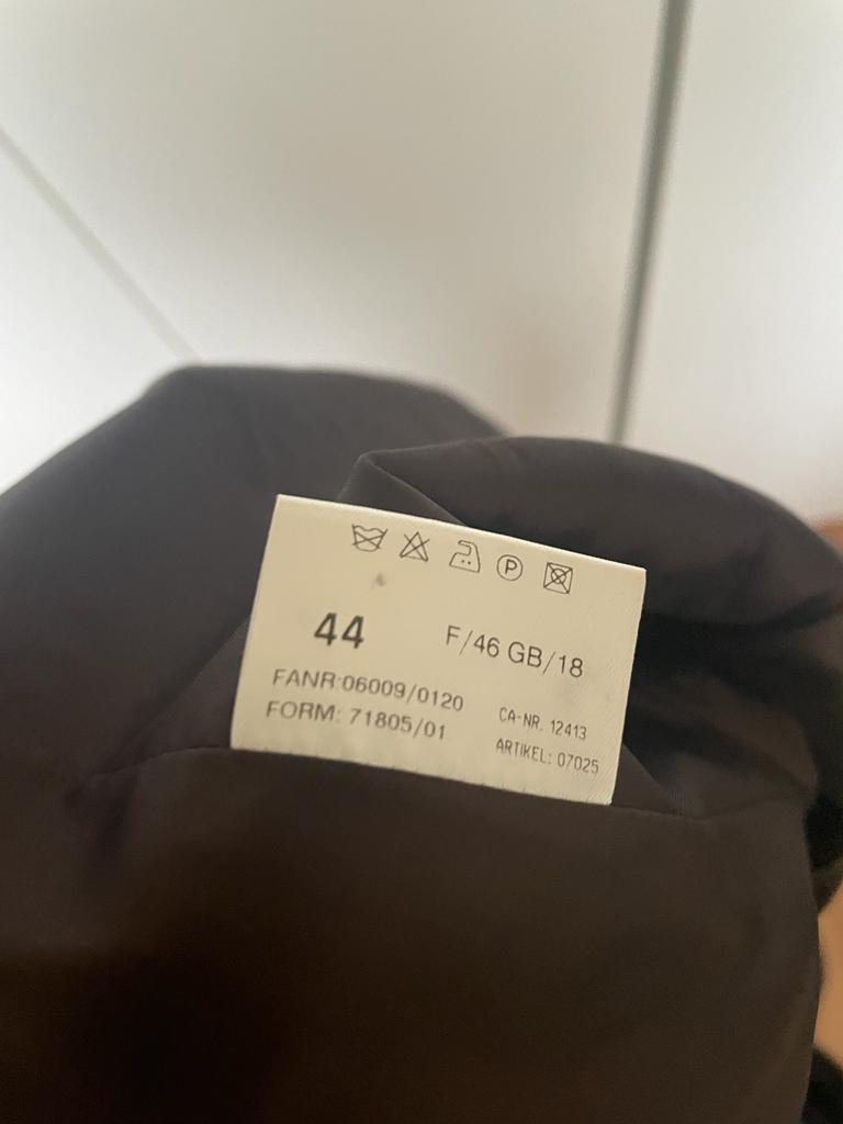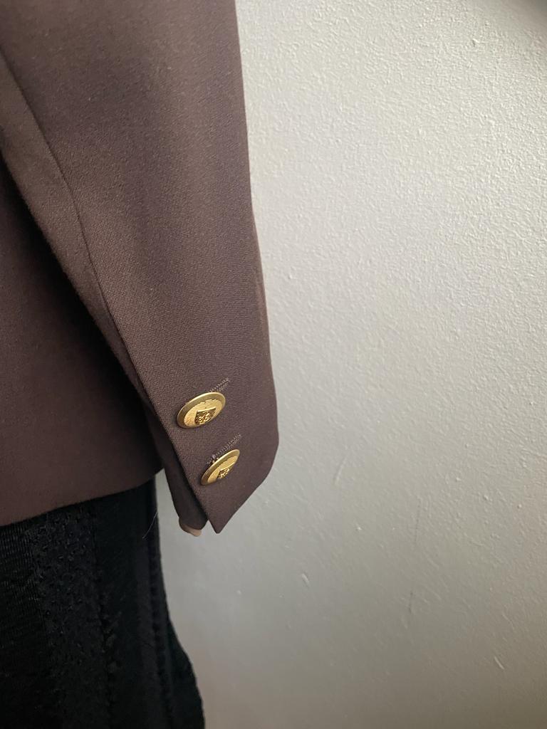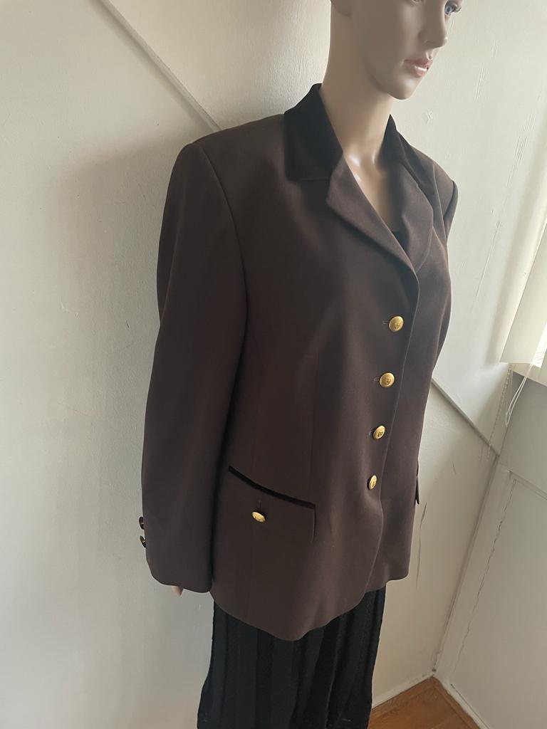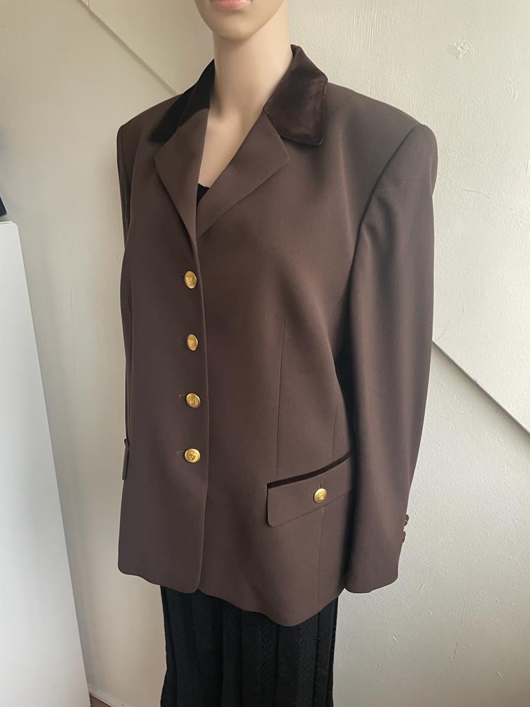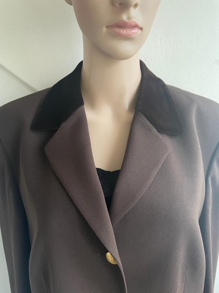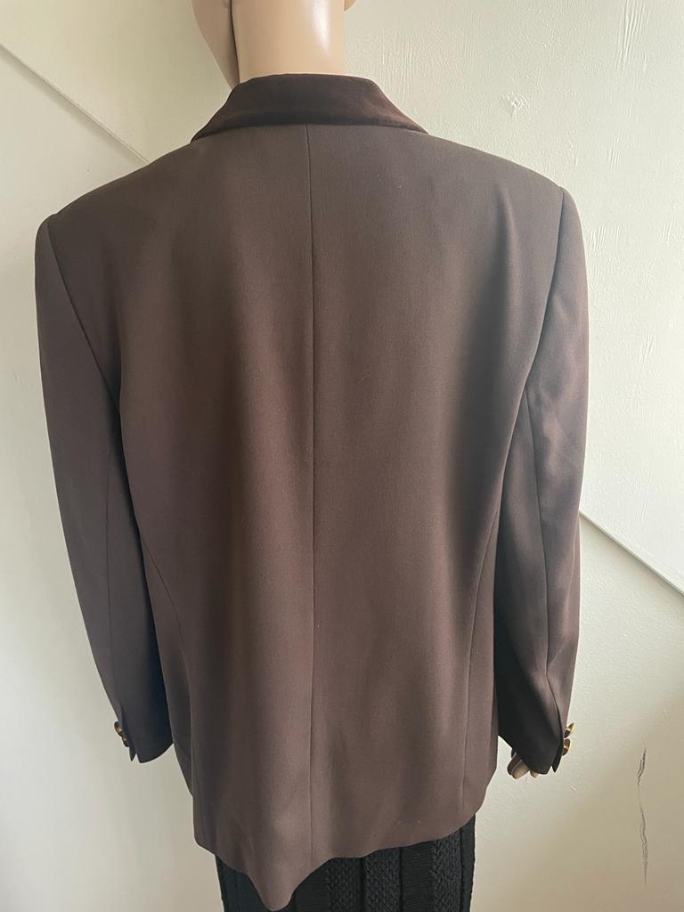 Mooie bruine blazer met goudkleurige knopen en een fluweelachtige kraag in de maat 44 . Gemaakt van polyester, wol en elastane en de kraag is van katoen en modal. De voering is gemaakt van viscose. Oksellengte is 56 cm en lengte is 67 cm .
