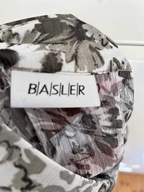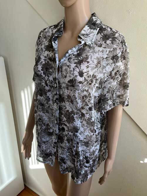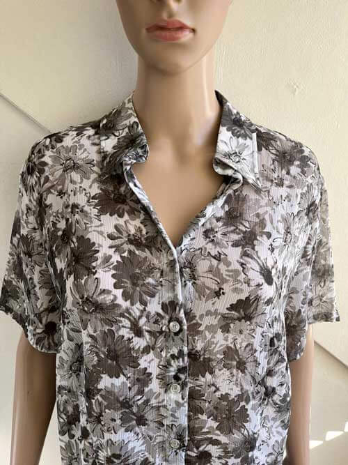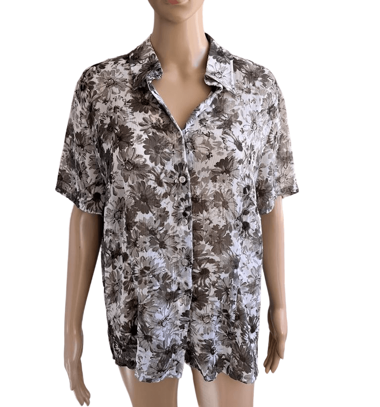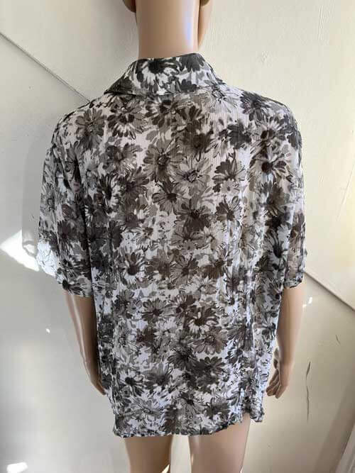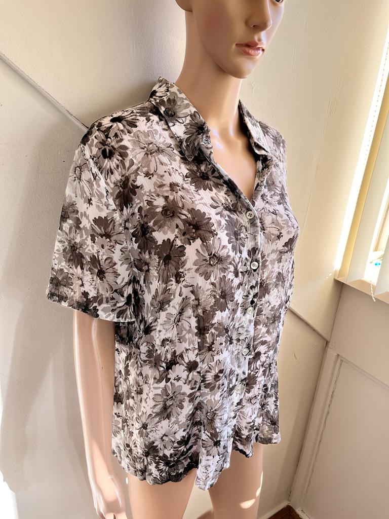 Offwhite licht doorschijnende blouse met korte mouwen en een grijzige print van bloemen in de maat 44. Gemaakt van polyester .