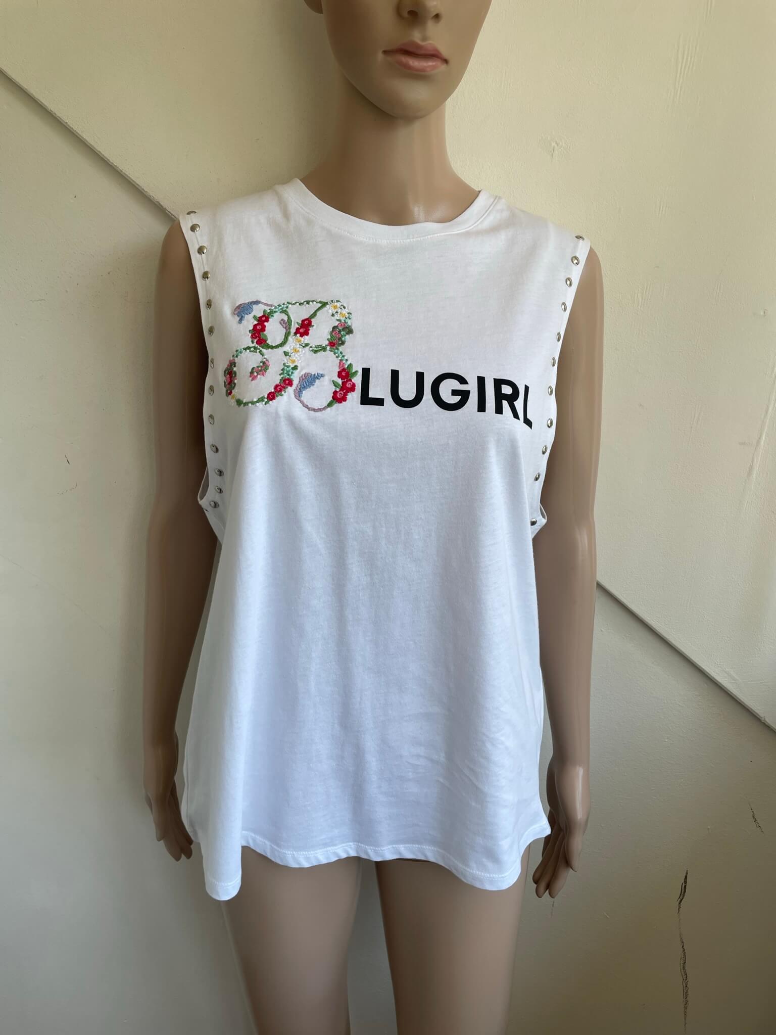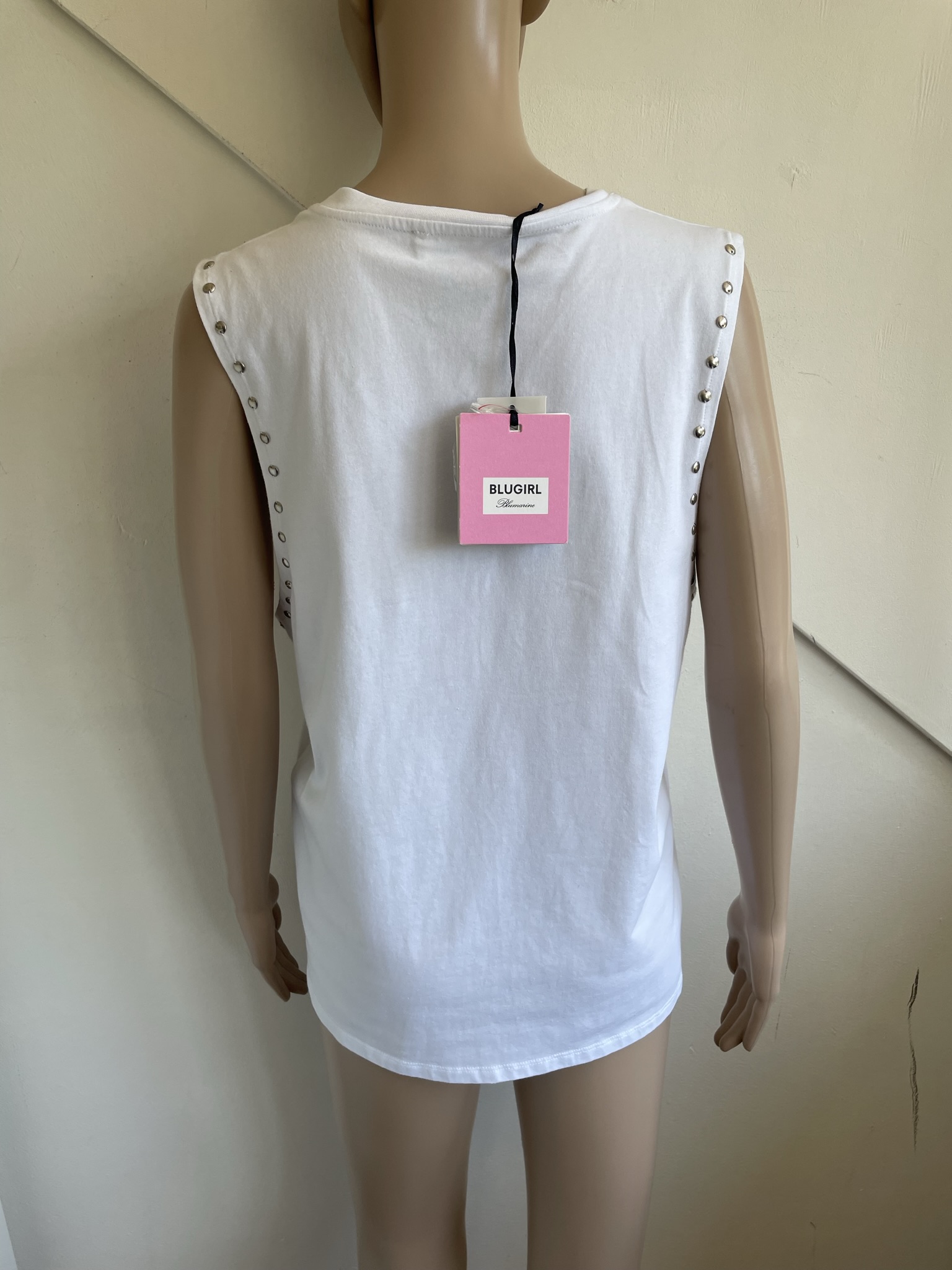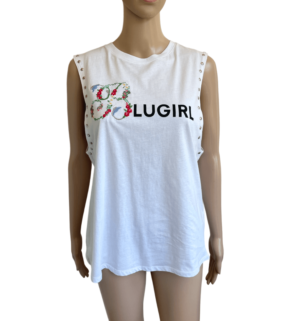 Nieuw wit shirt of witte top bewerkt met een borduursel en “studs” in de Italiaanse maat 44 . Dat komt overeen met maat 38 , een maat 40 zou ook nog kunnen. Oksellengte is 50 cm en lengte is 64 cm. Gemaakt van katoen en met de tekst / bedrukking “blugirl” . Nieuwprijs €125,-