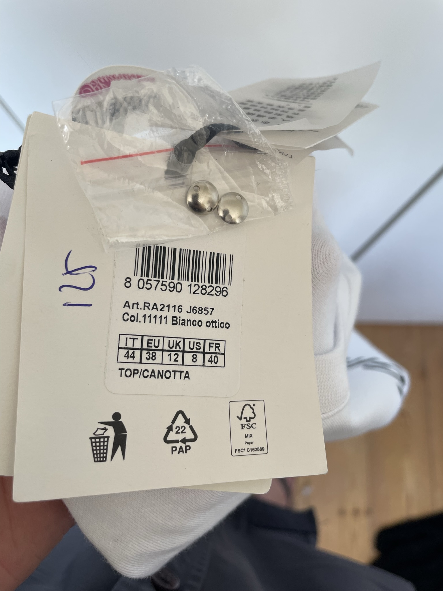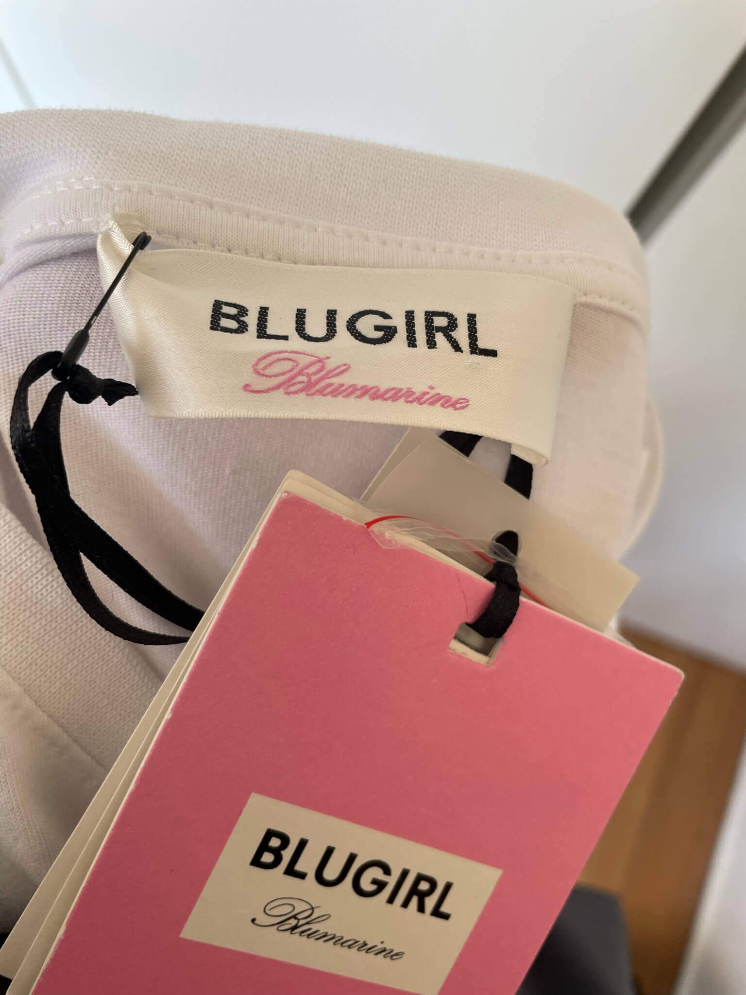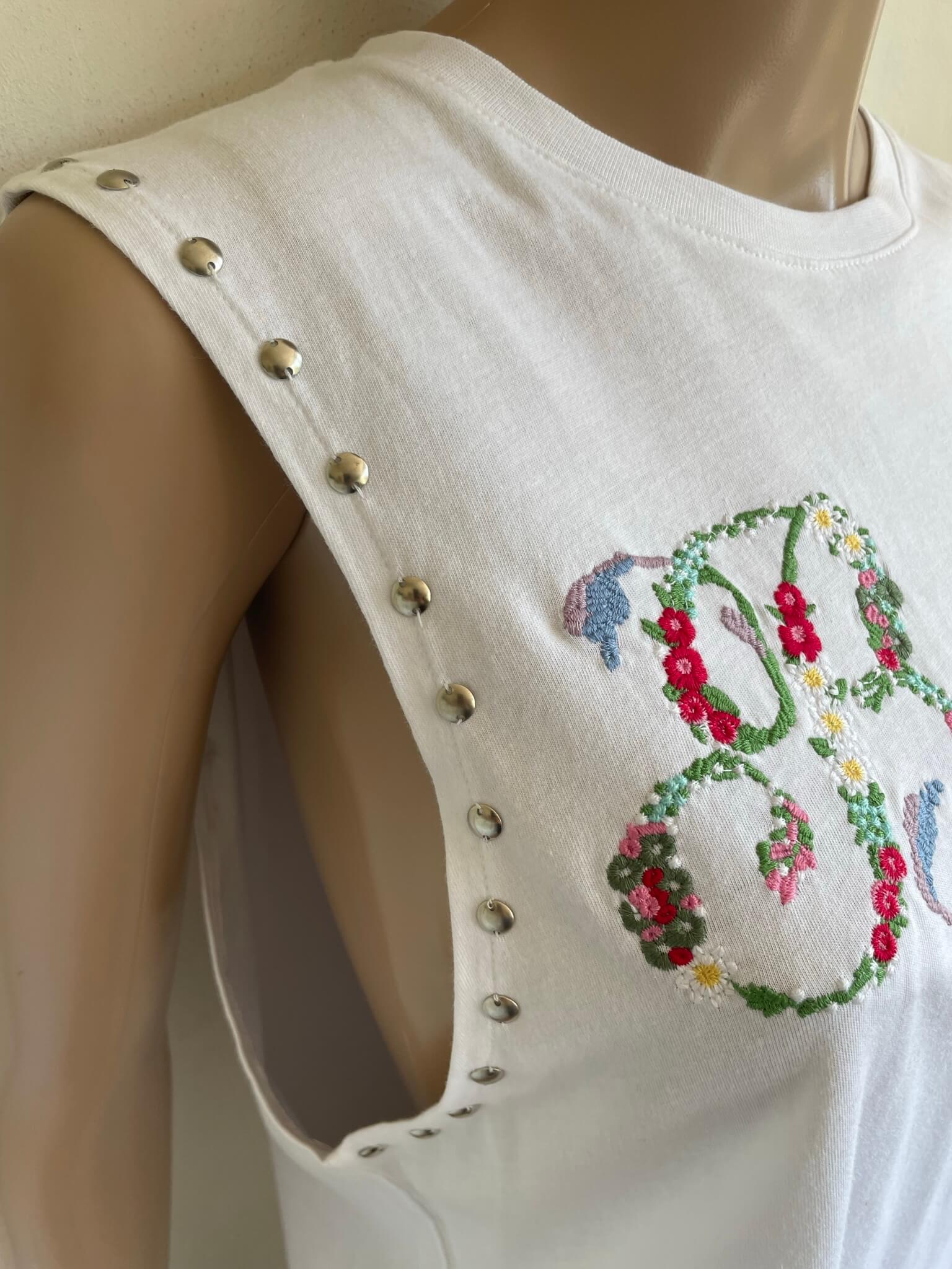 Nieuw wit shirt of witte top bewerkt met een borduursel en “studs” in de Italiaanse maat 44 . Dat komt overeen met maat 38 , een maat 40 zou ook nog kunnen. Oksellengte is 50 cm en lengte is 64 cm. Gemaakt van katoen en met de tekst / bedrukking “blugirl” . Nieuwprijs €125,-