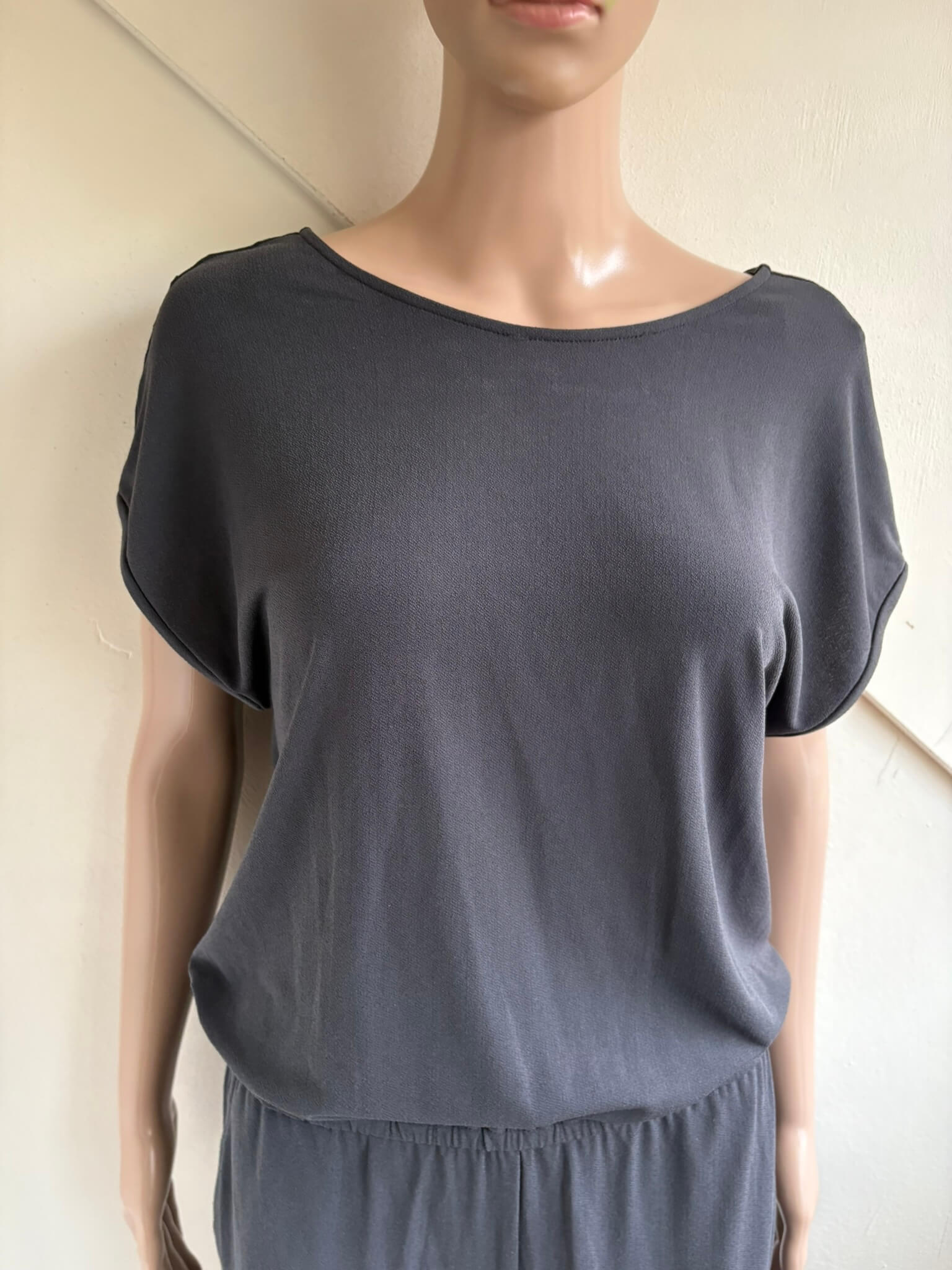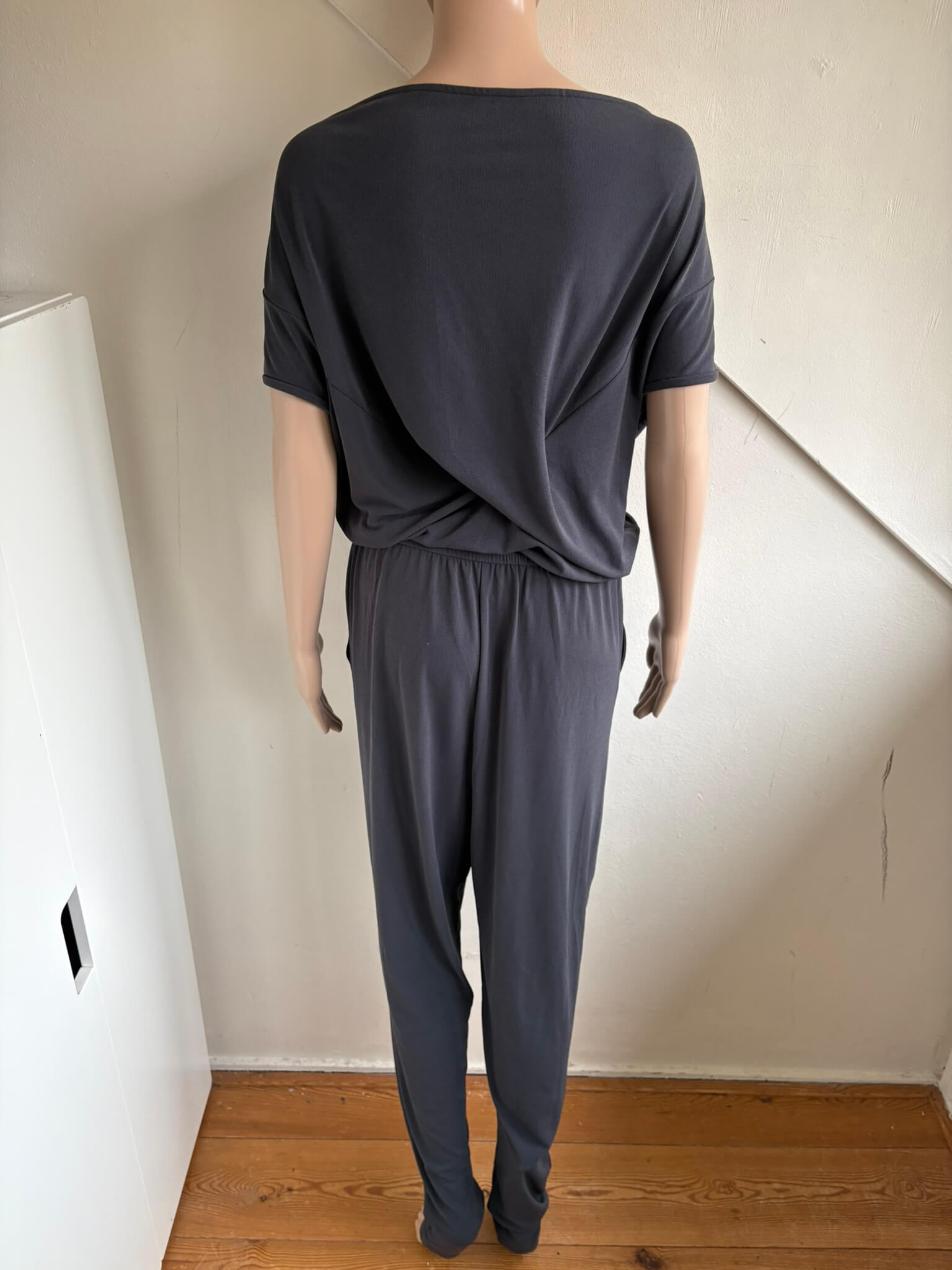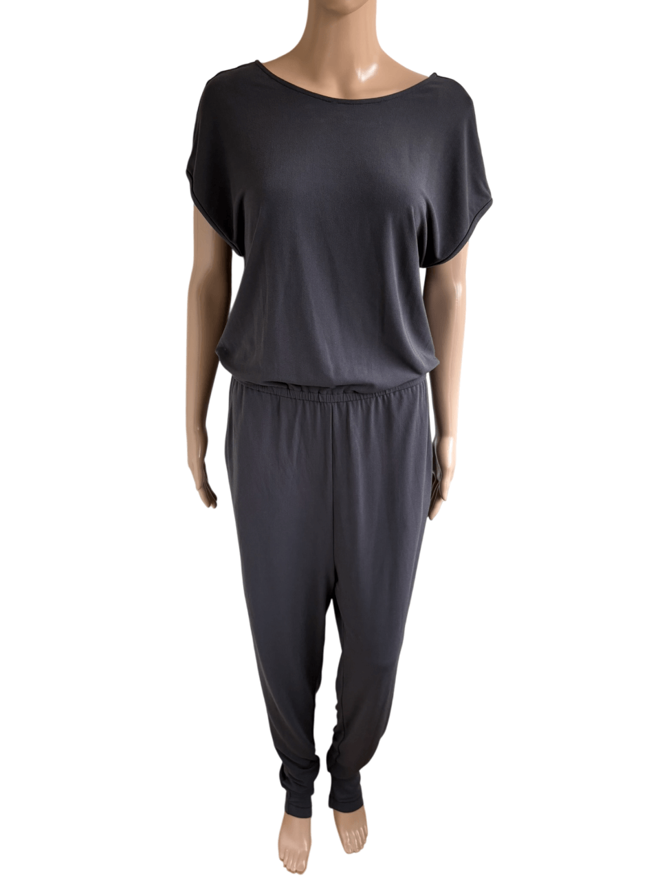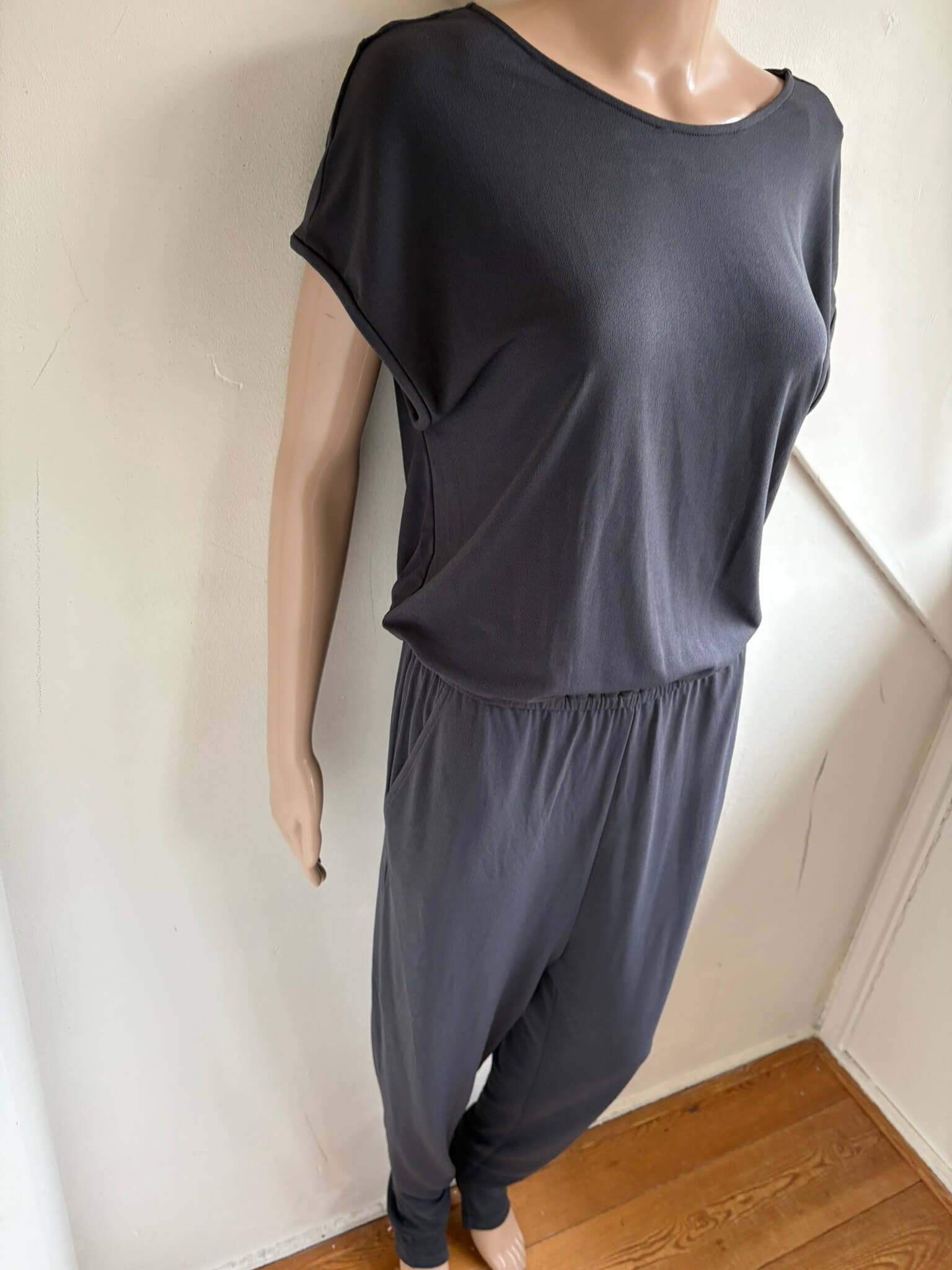 Grijze getailleerde jumpsuit met korte mouwen in de maat S. Gemaakt van polyester en spandex. Oksellengte 47 cm, taille 34 , lengte 154 cm.