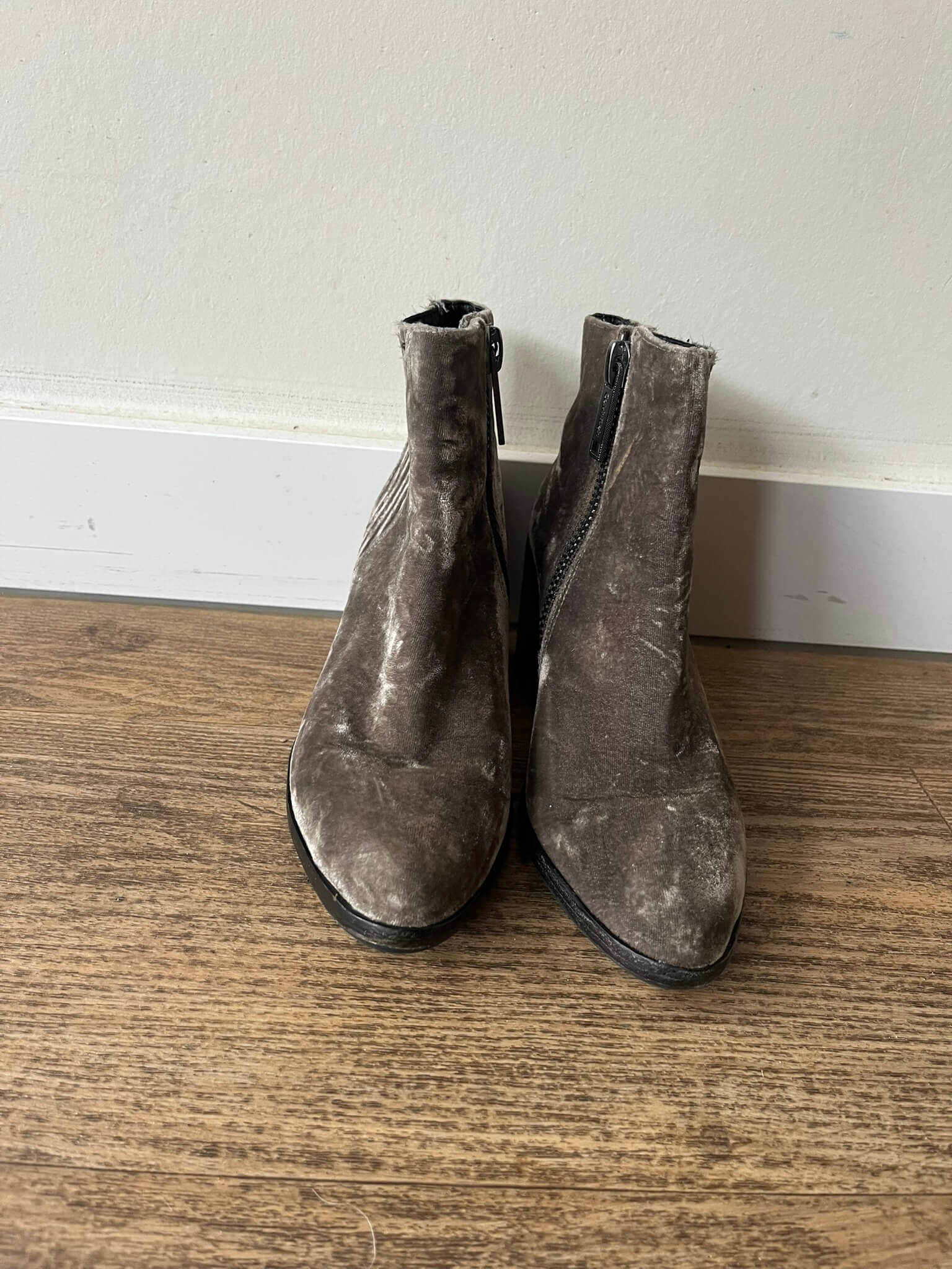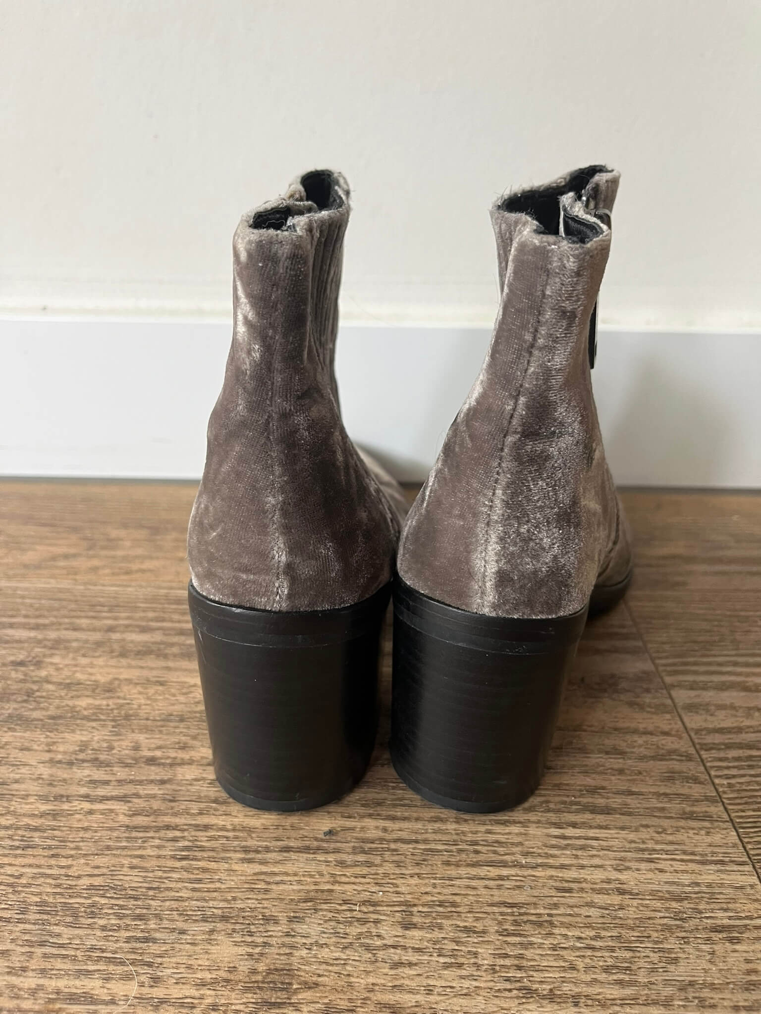 Enkellaarsjes van fluweelachtig materiaal in een grijze teint in de maat 36. Hakhoogte 7 cm.