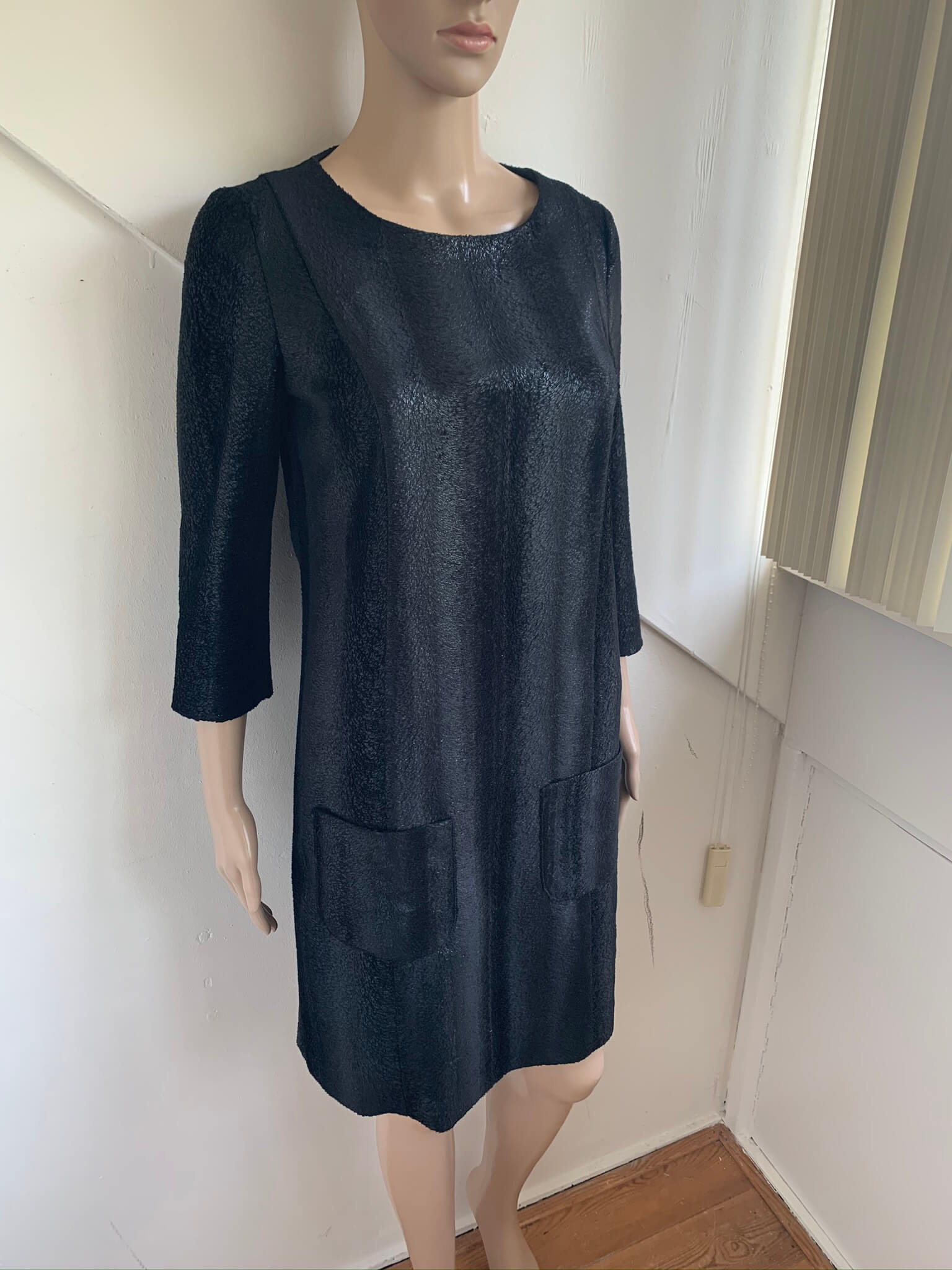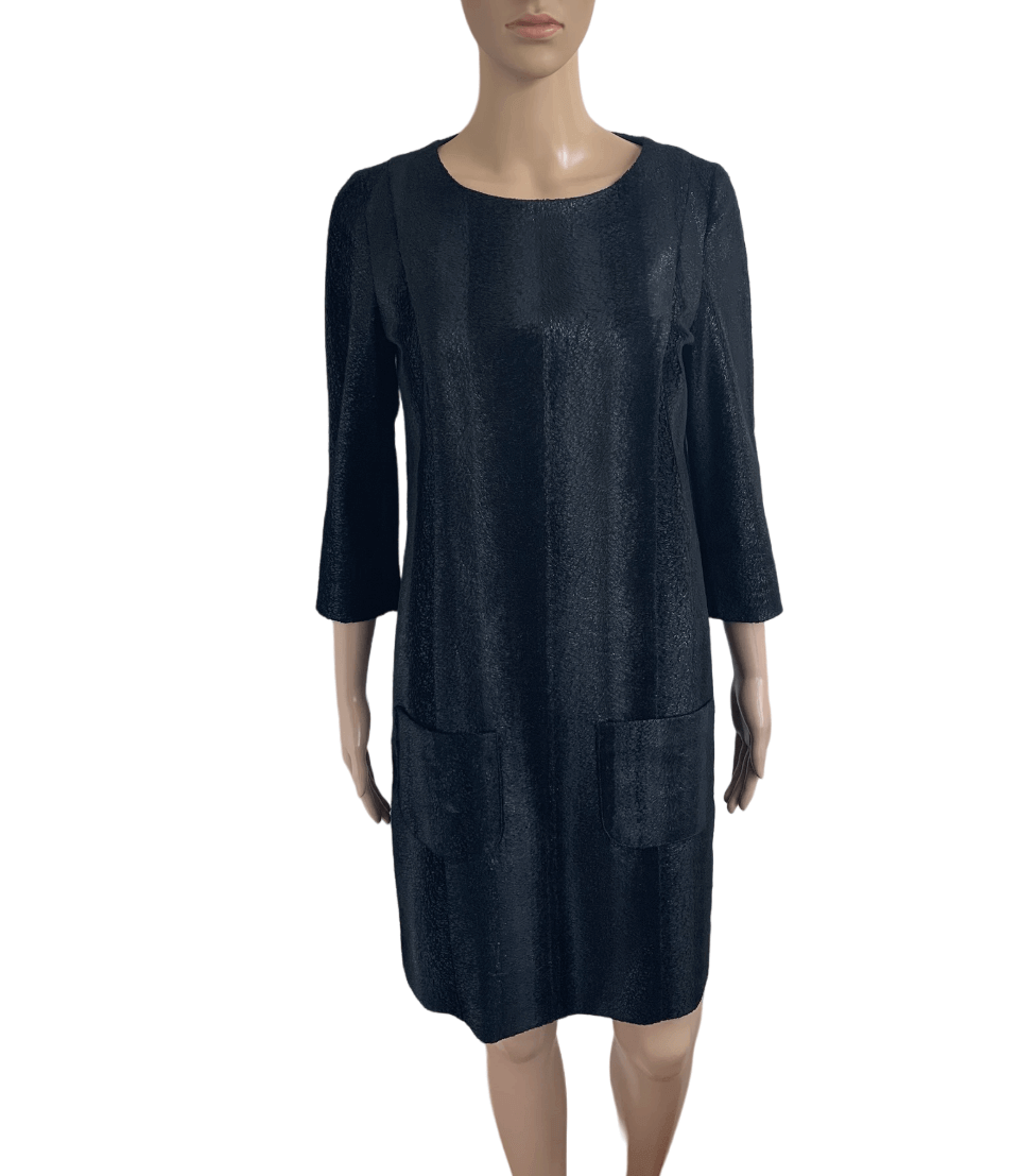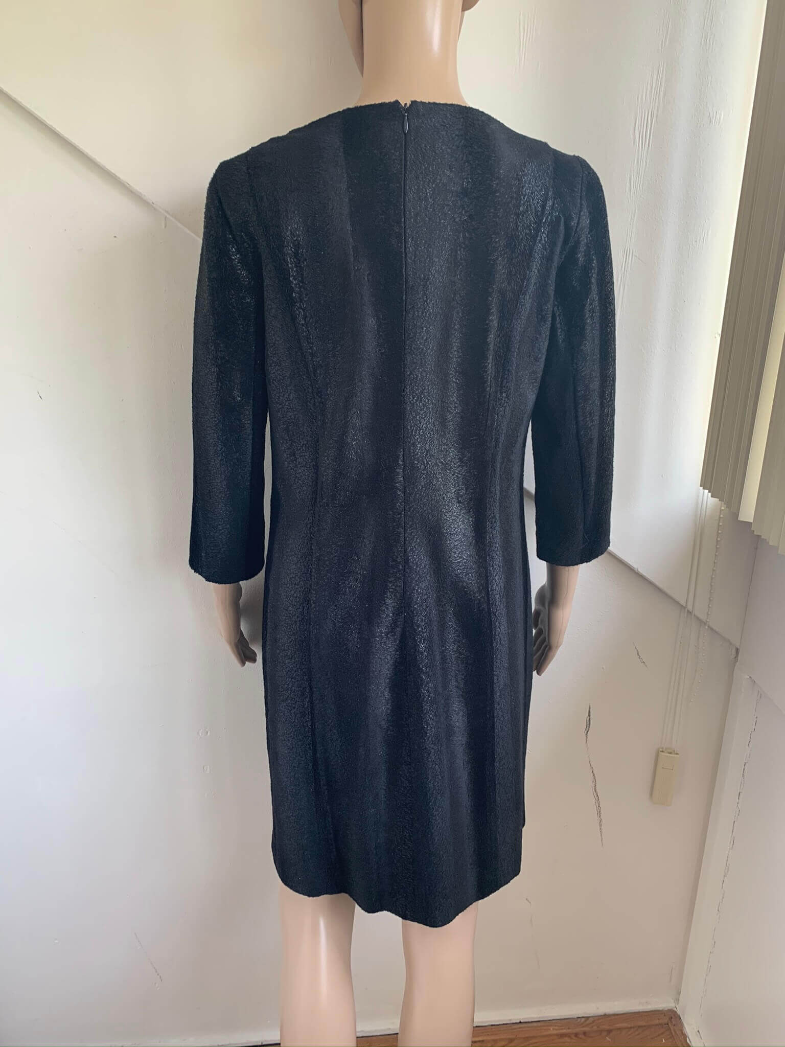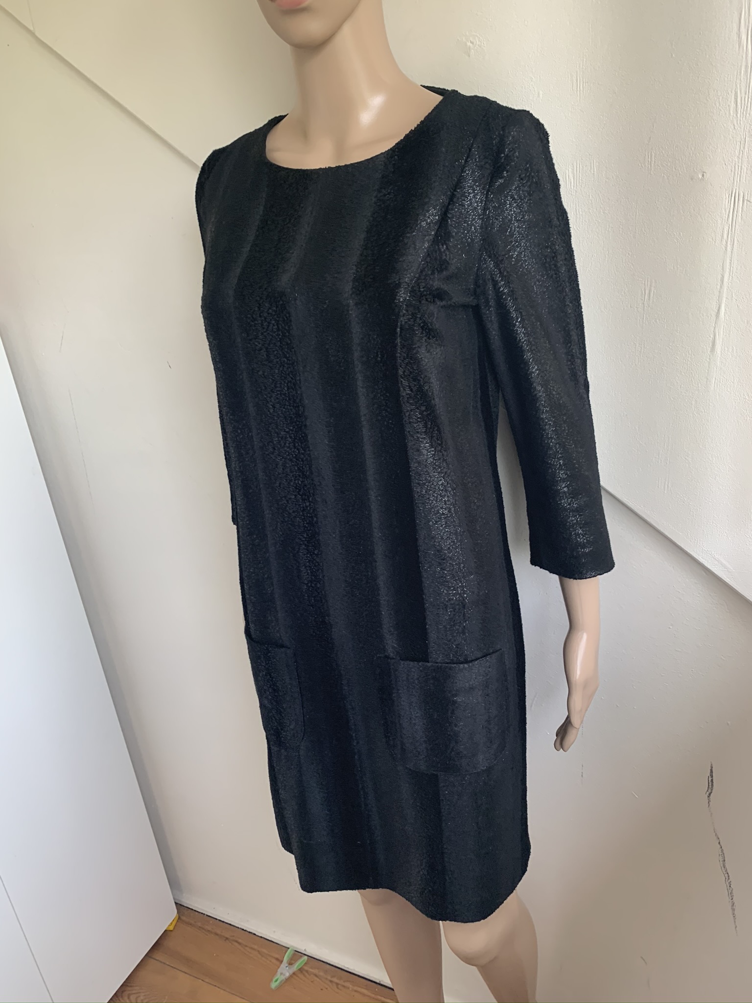 Zwarte “harige” jurk maat 36 en dit is conform pasvorm. Gemaakt van polyester polyurethaan. Lange rits achterzijde en driekwartsmouwen. En twee zakjes voorzijde .