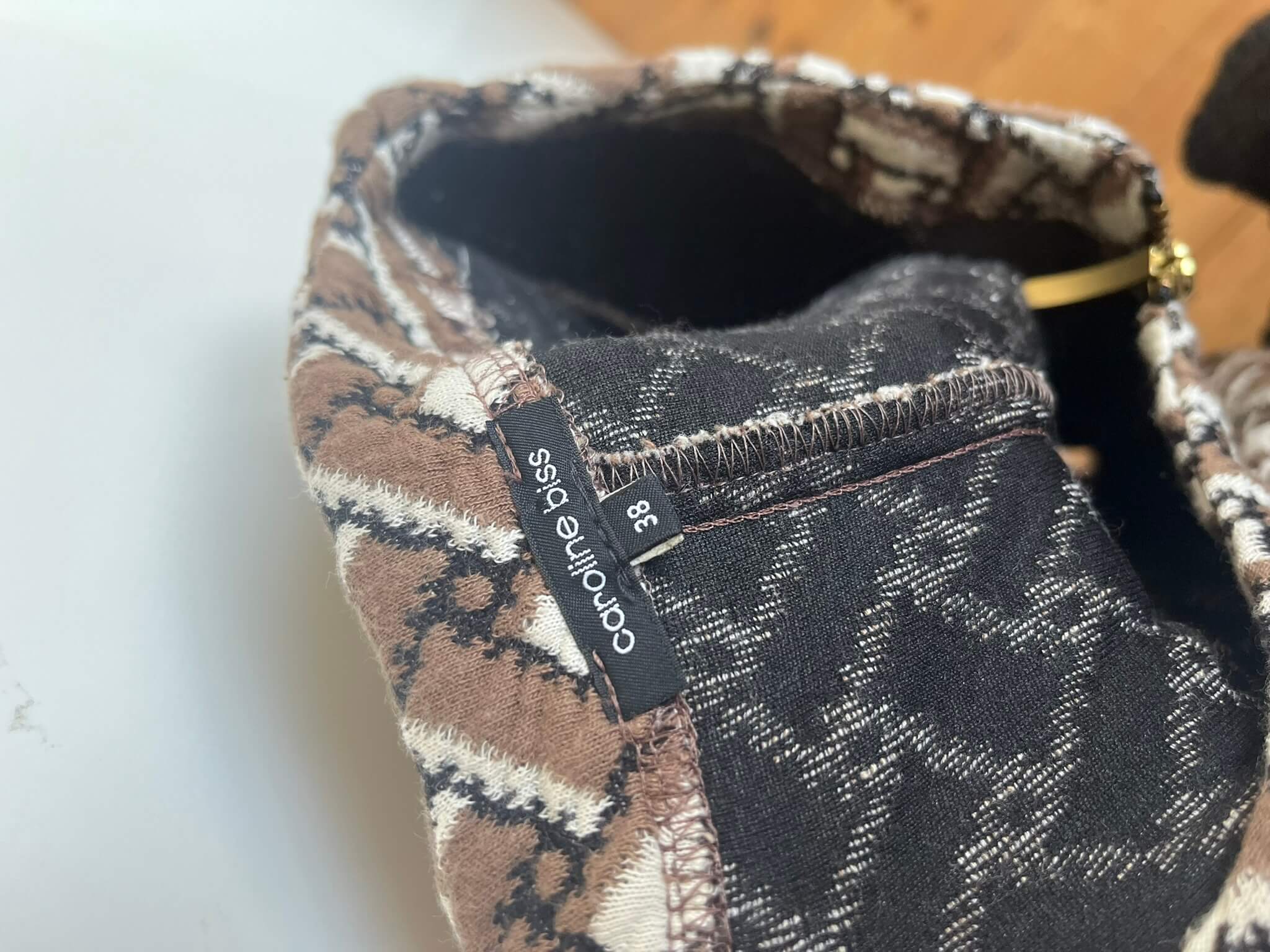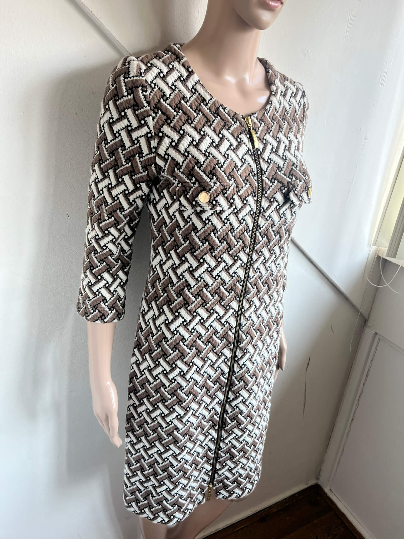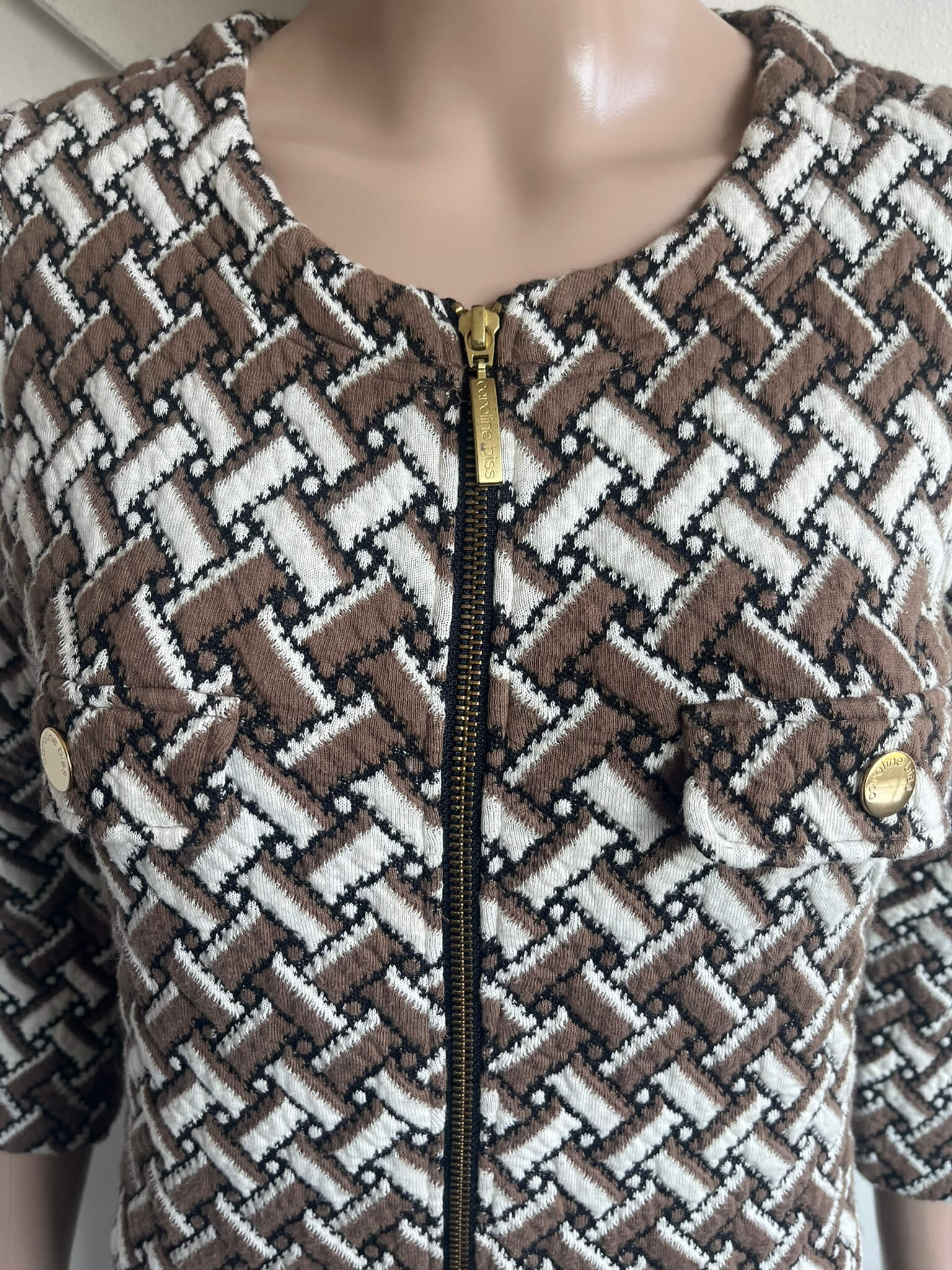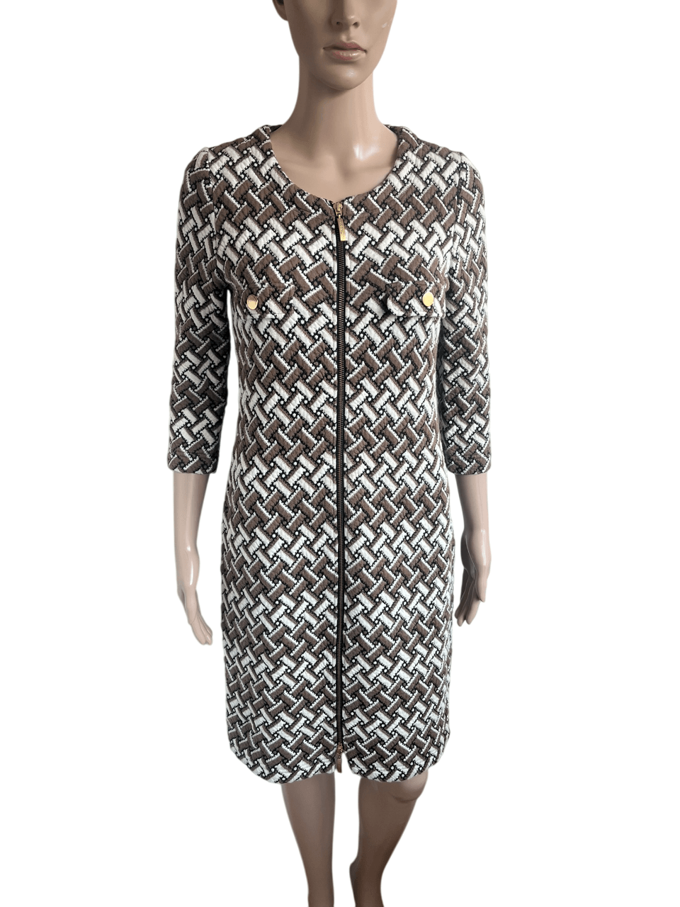 Wat dikkere jurk met een rits over de gehele voorzijde en een bruin wit zwarte print in de maat 38. Gemaakt van katoen, polyamide en polyester. Oksellengte 47 cm en lengte 92 cm.