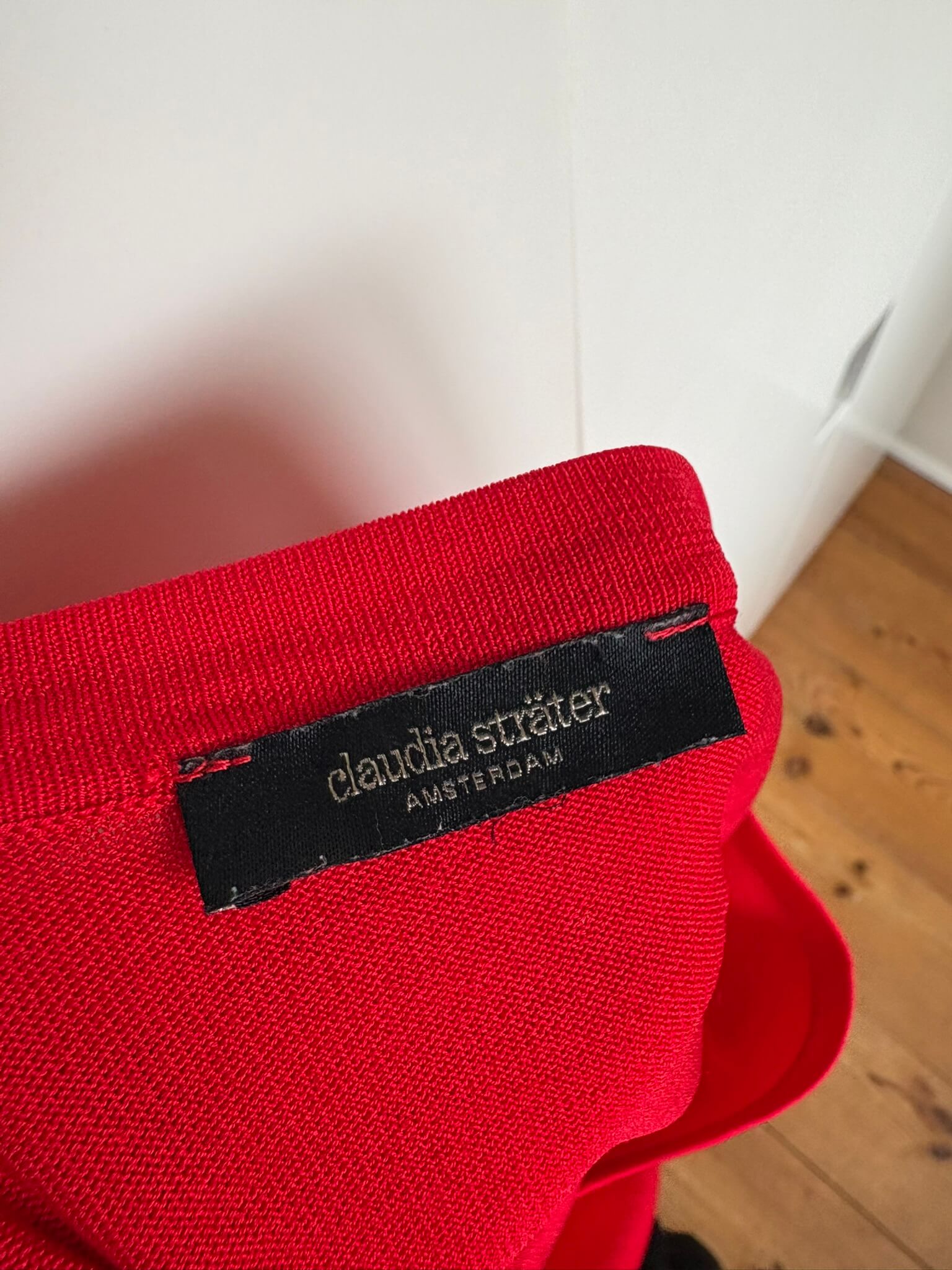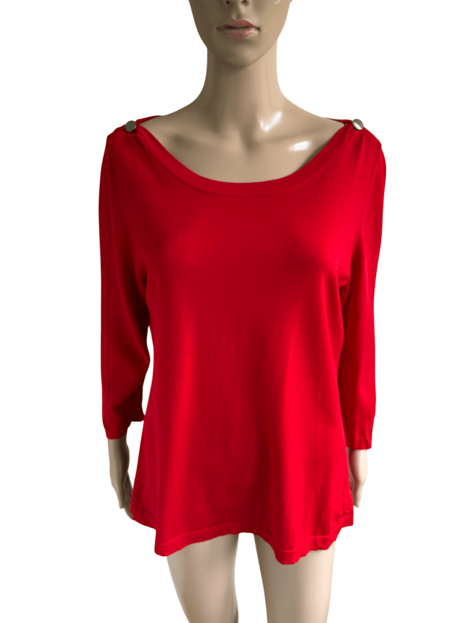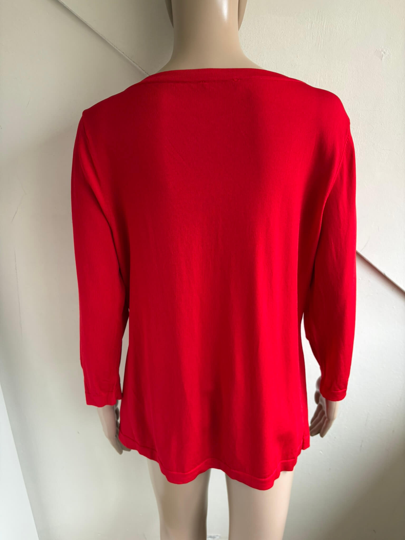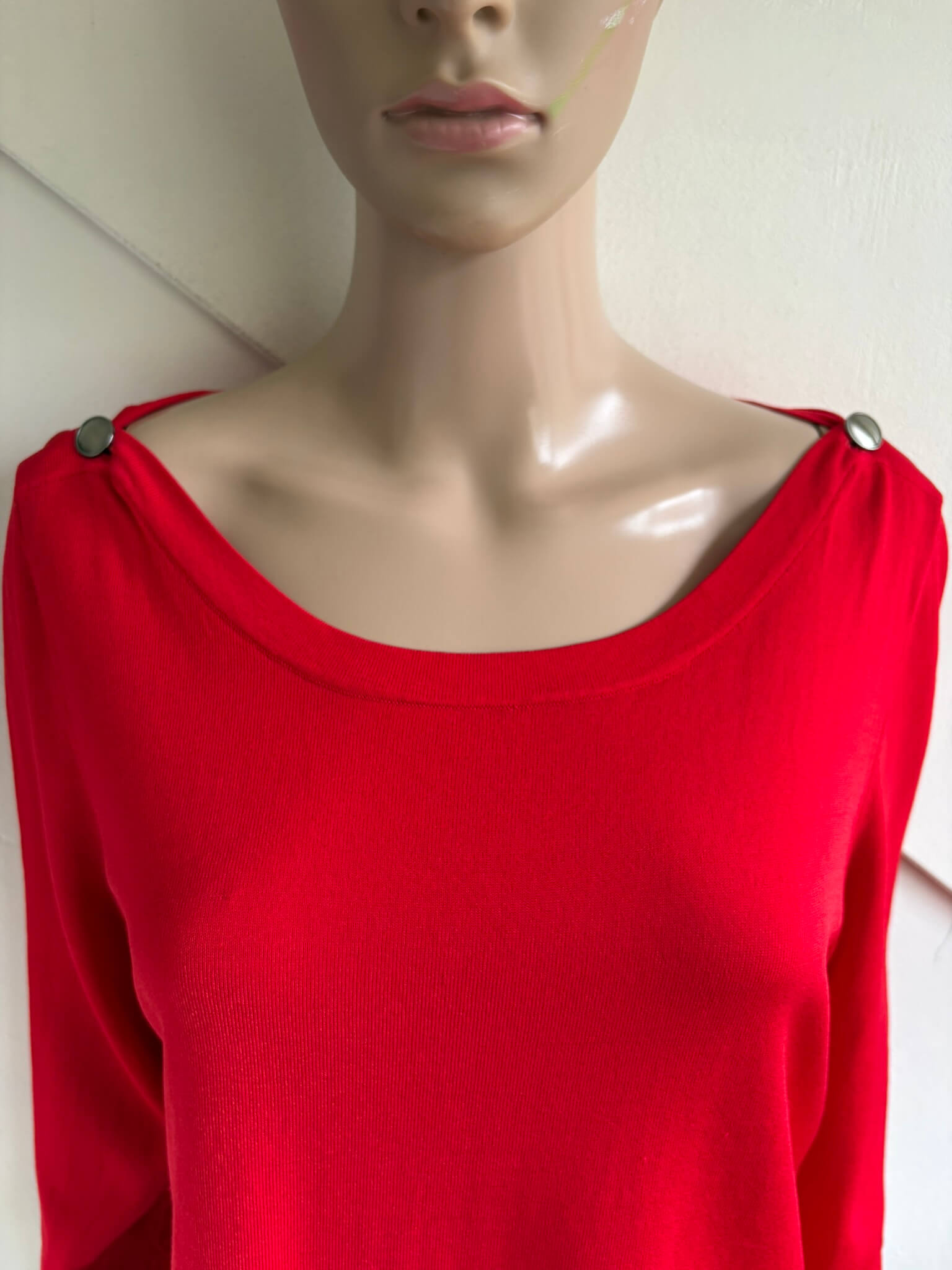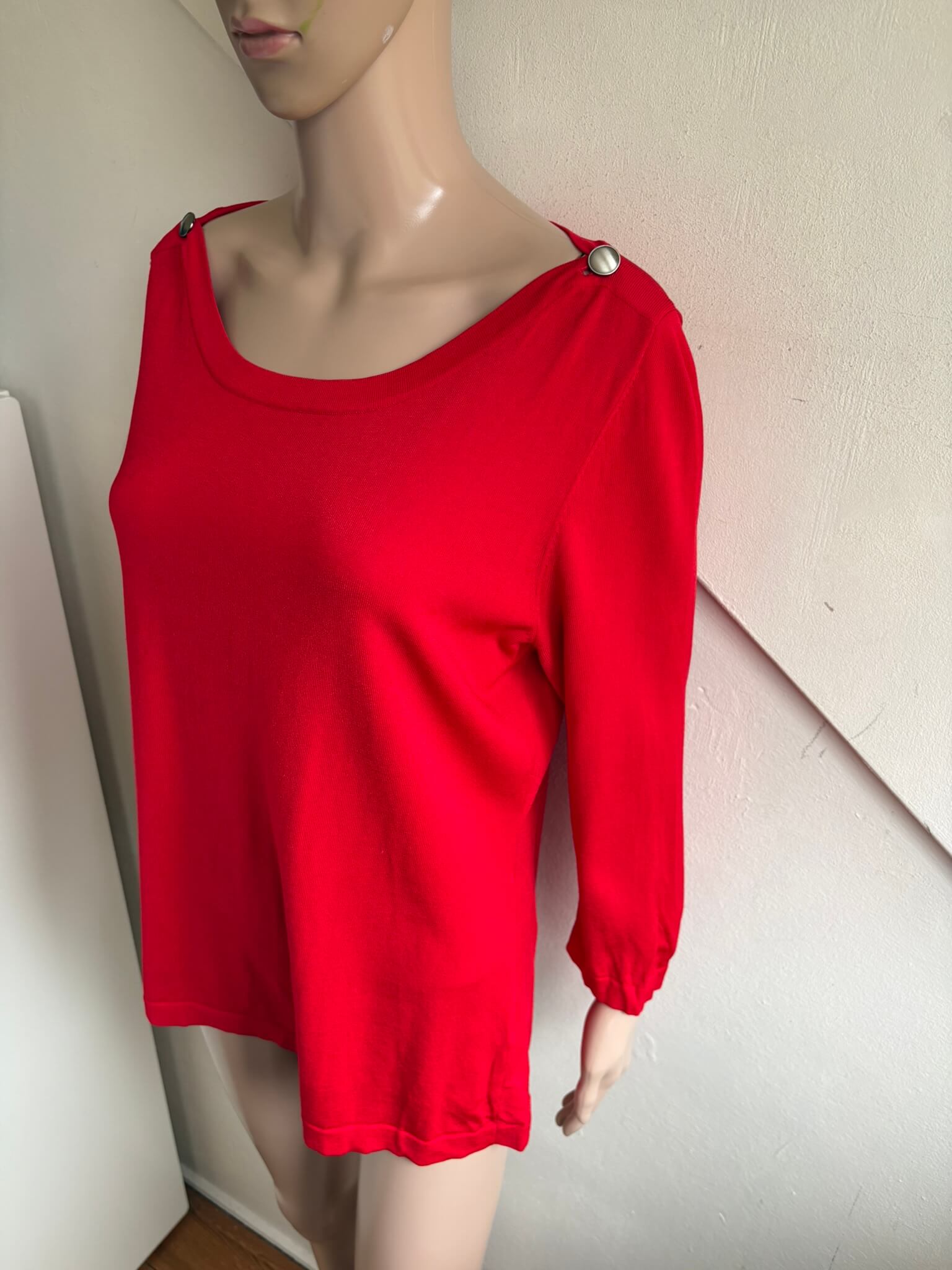 Rode dunne trui of wat dikkere longsleeve top met ronde hals en knoopjes op de schouders in de maat 40. Gemaakt van viscose en polyamide. Oksellengte 51 cm en lengte 65 cm.