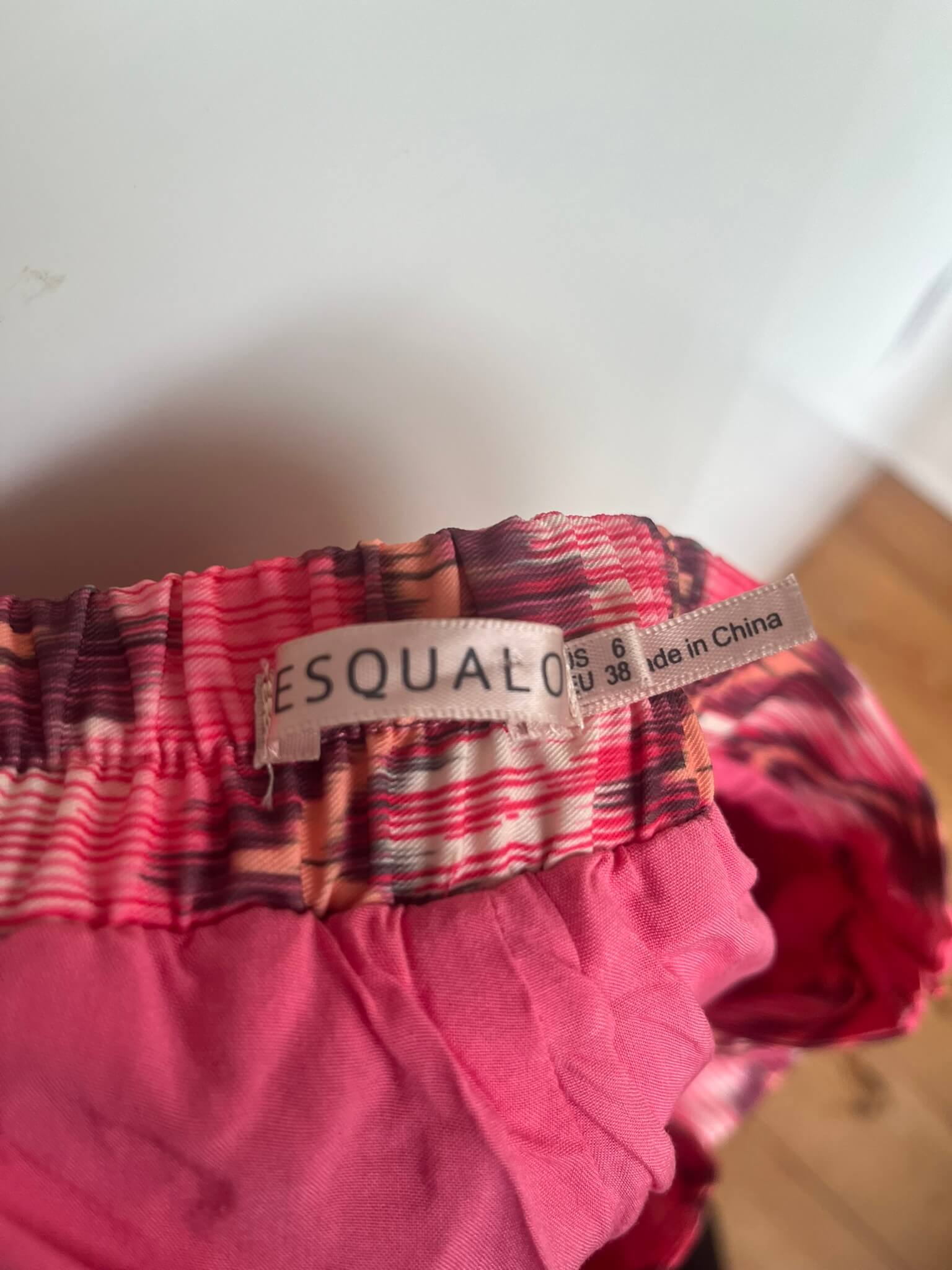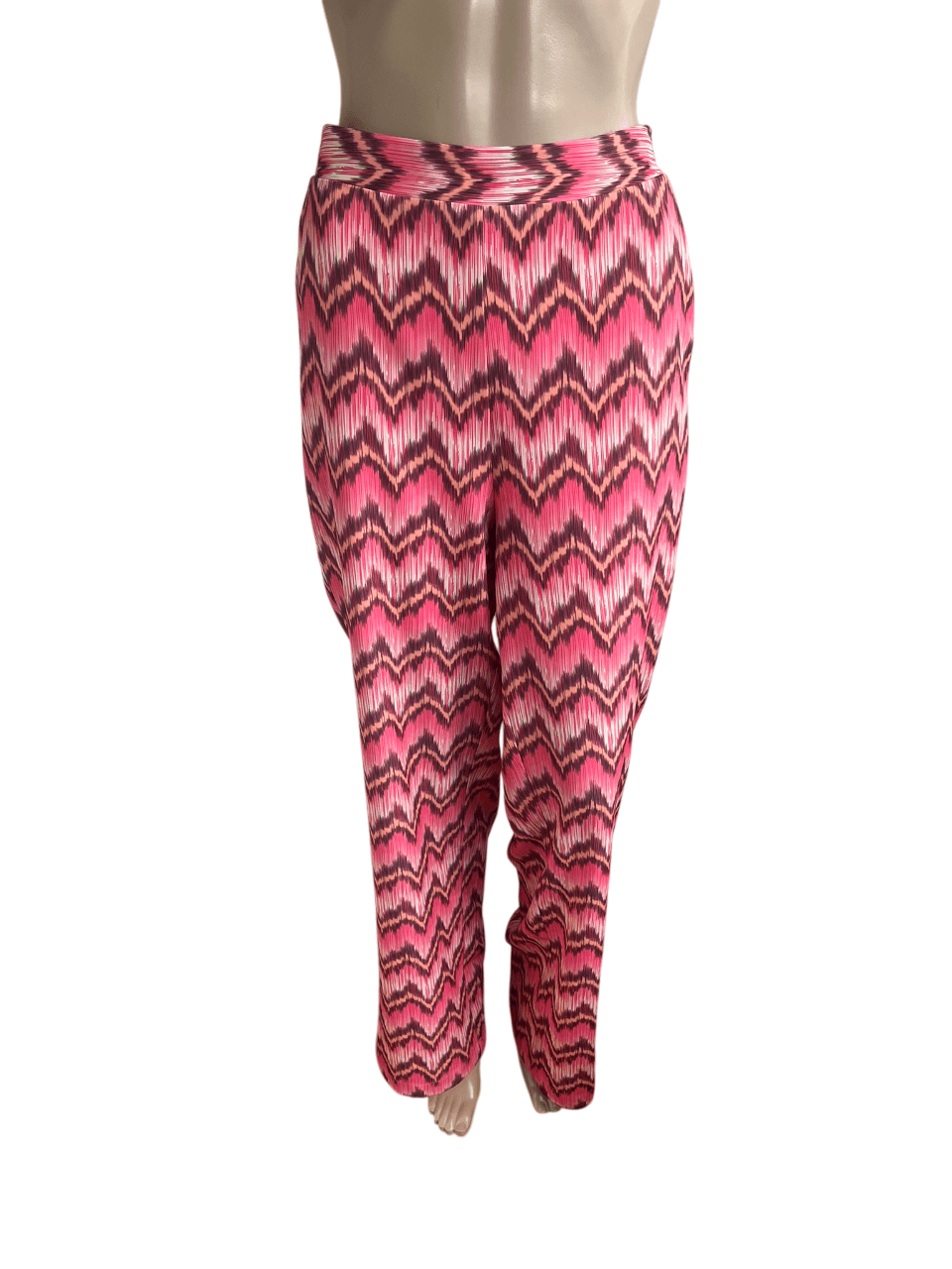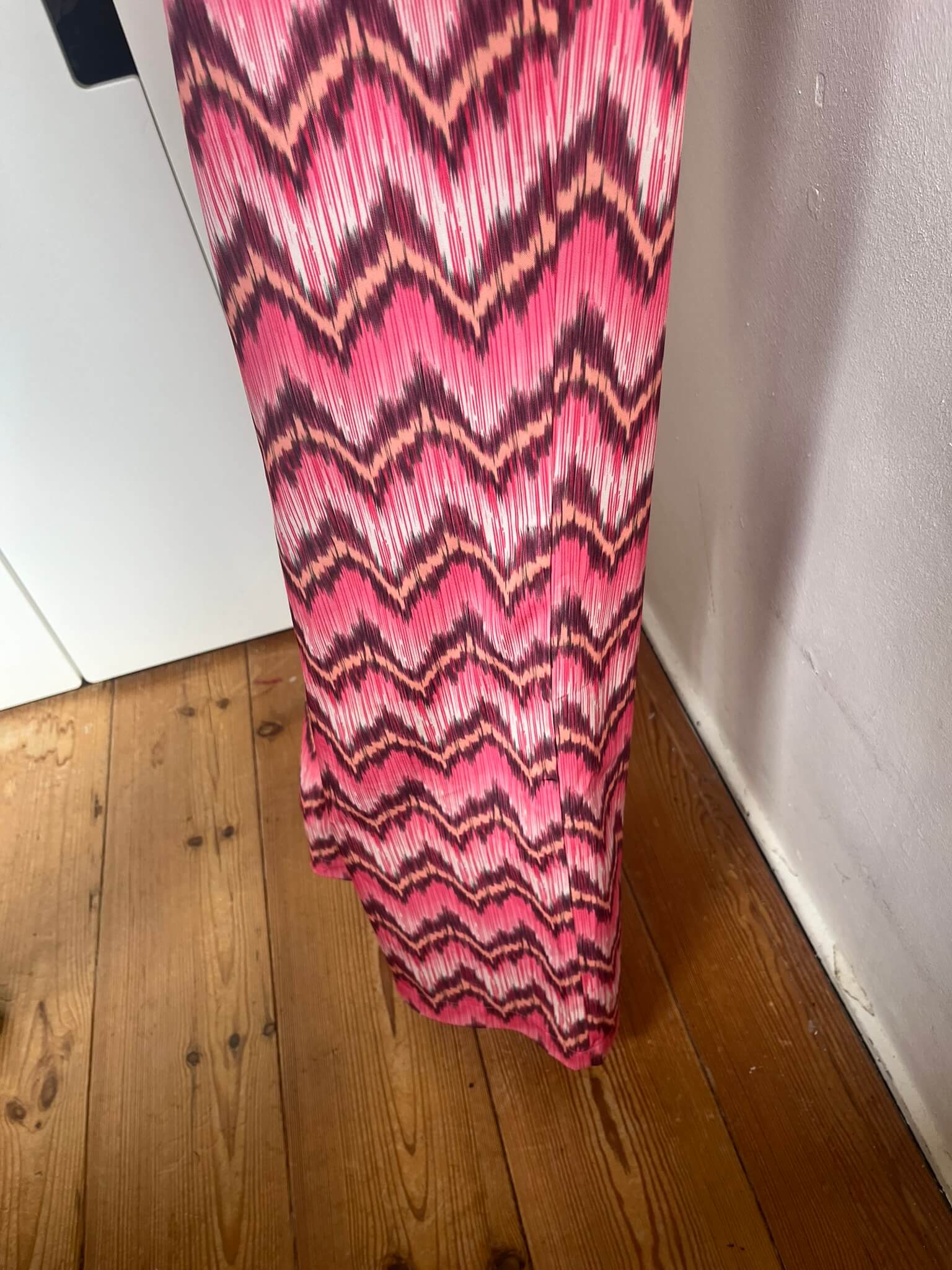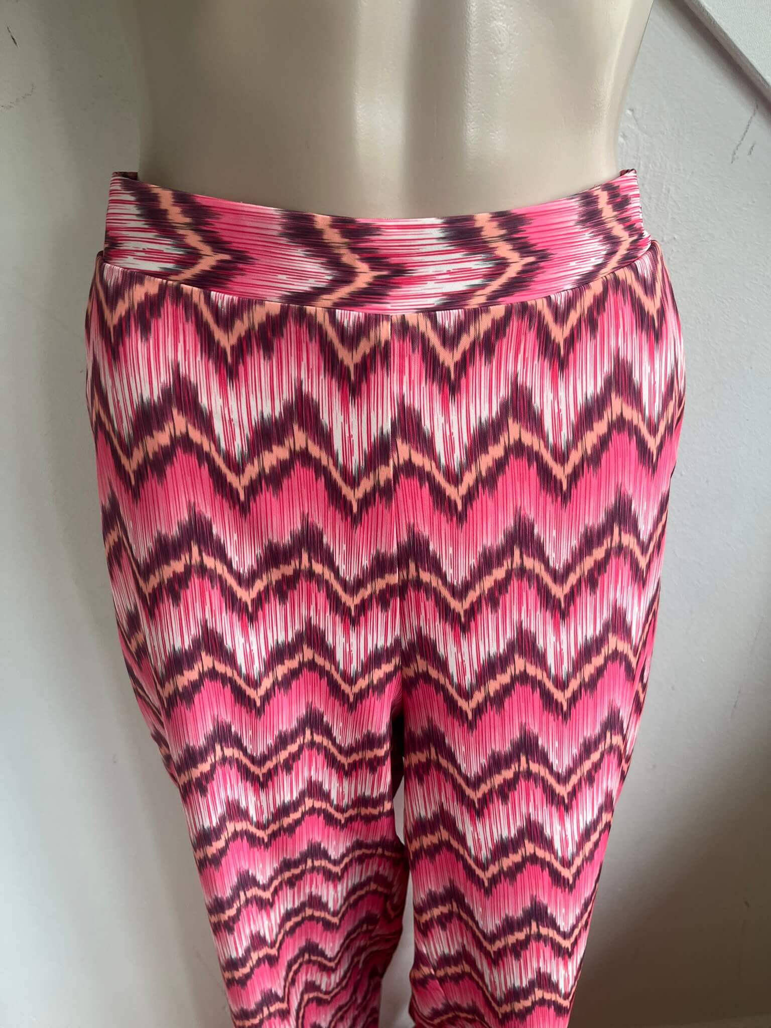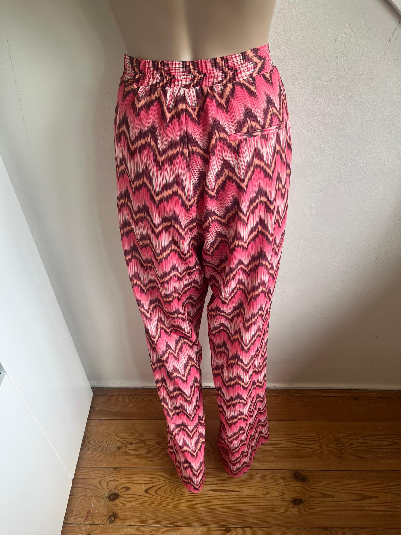 Losvallende broek met wijde pijpen en een roze en aubergine print in de maat 38. Gemaakt van polyester en spandex en de voering is gemaakt van viscose. Taillewijdte 40 cm en lengte 110 cm.