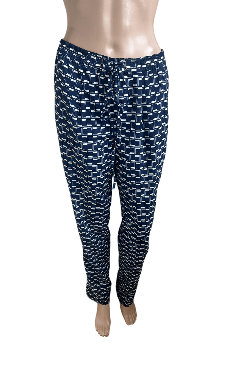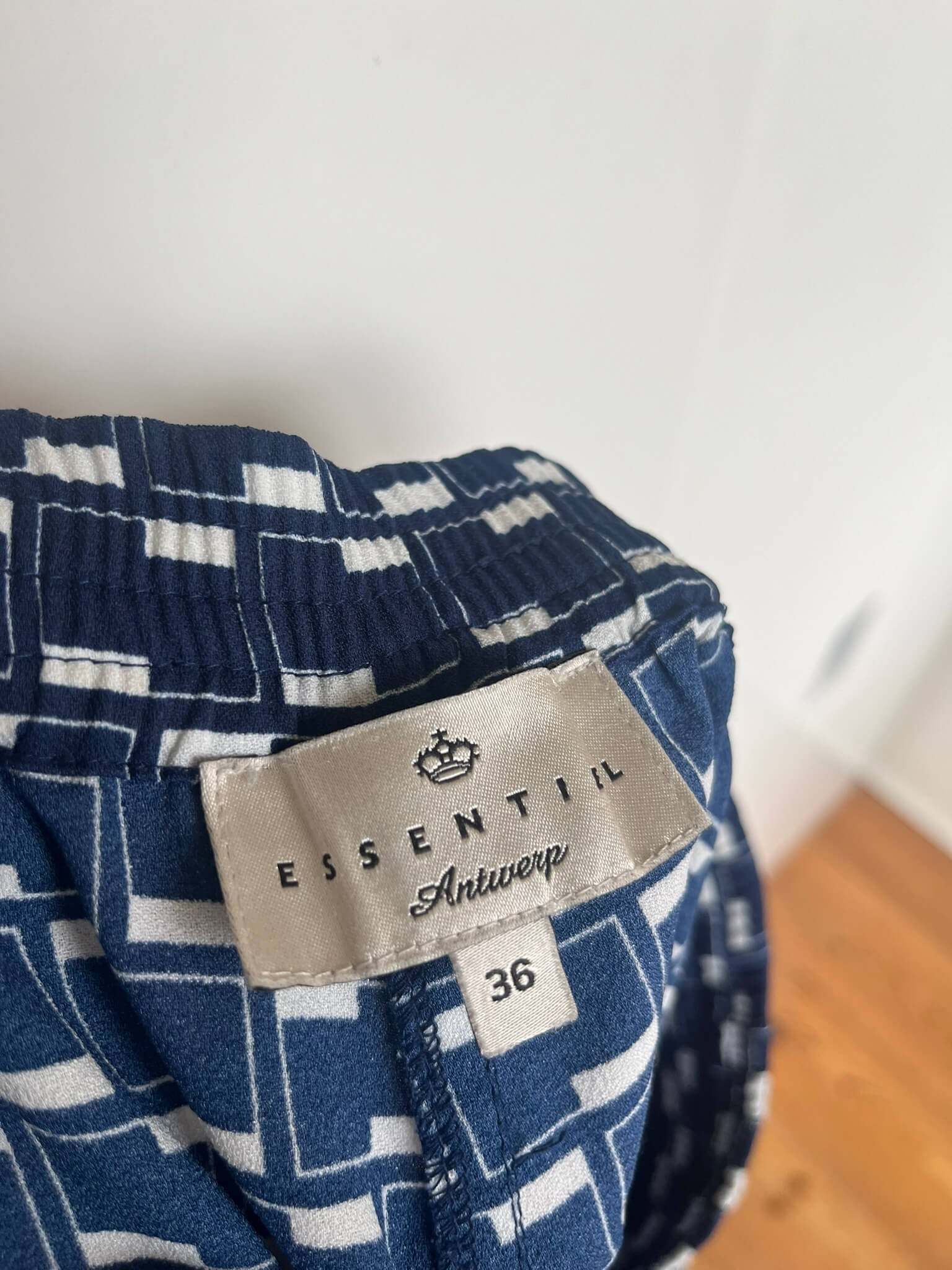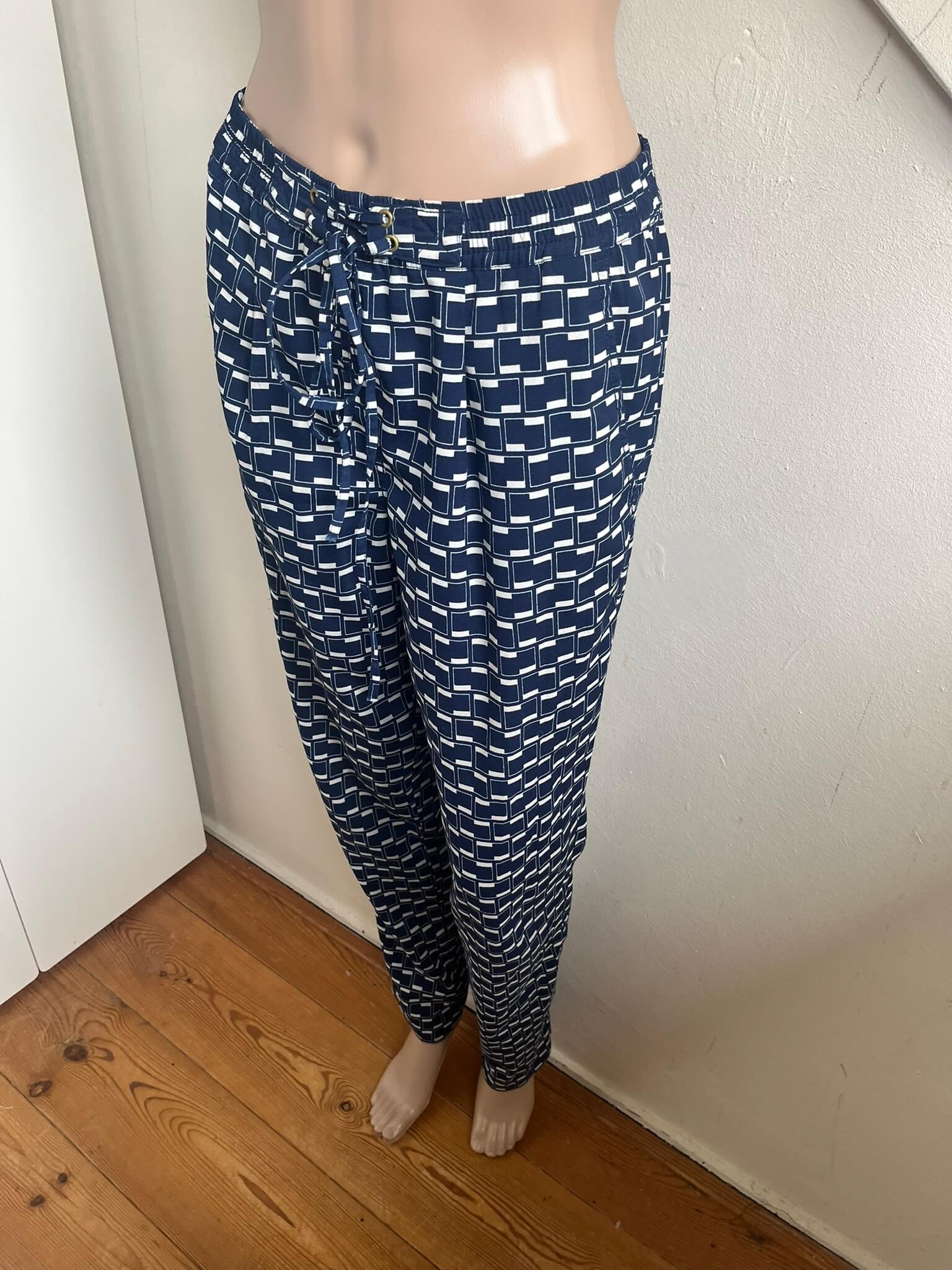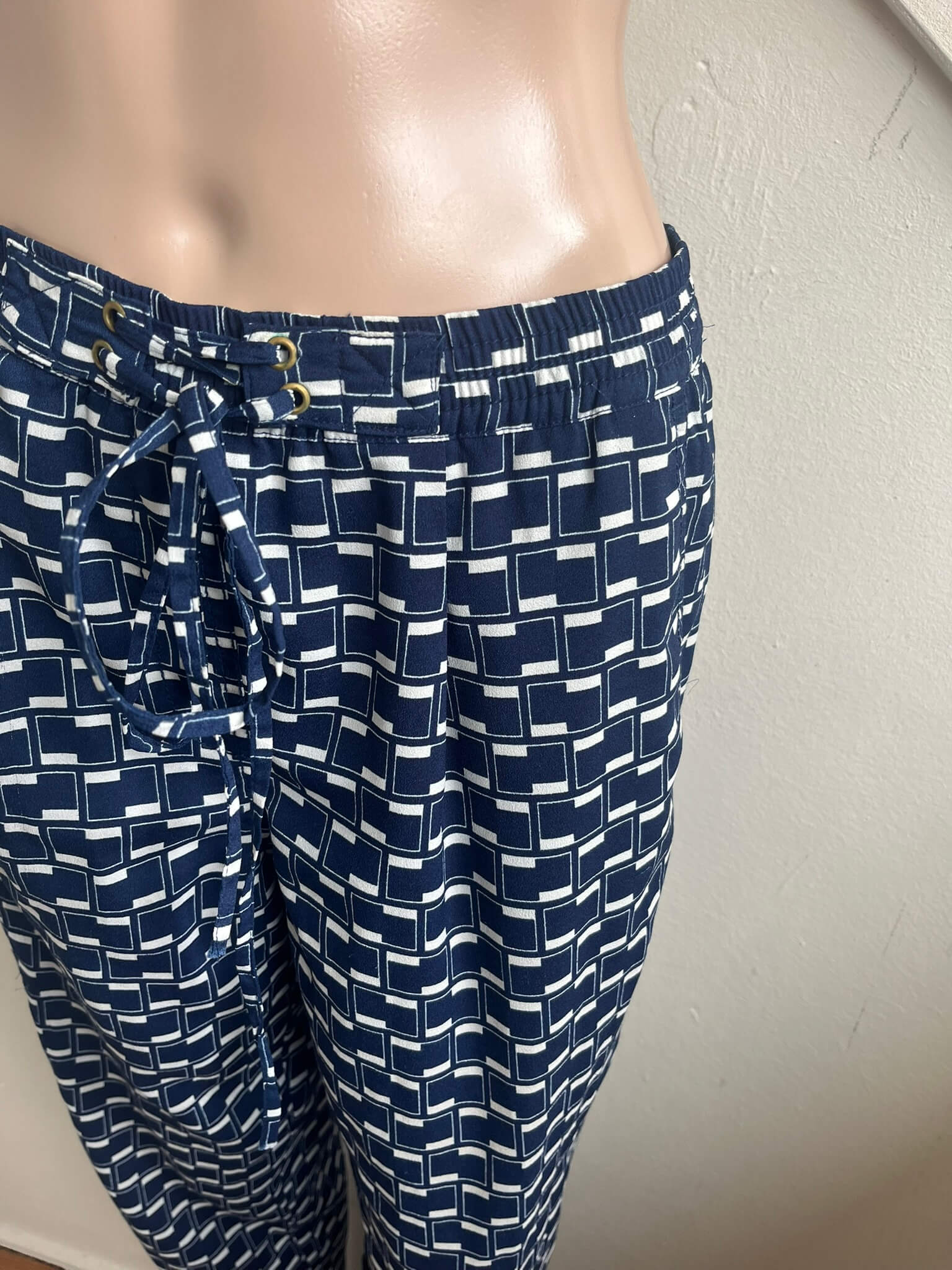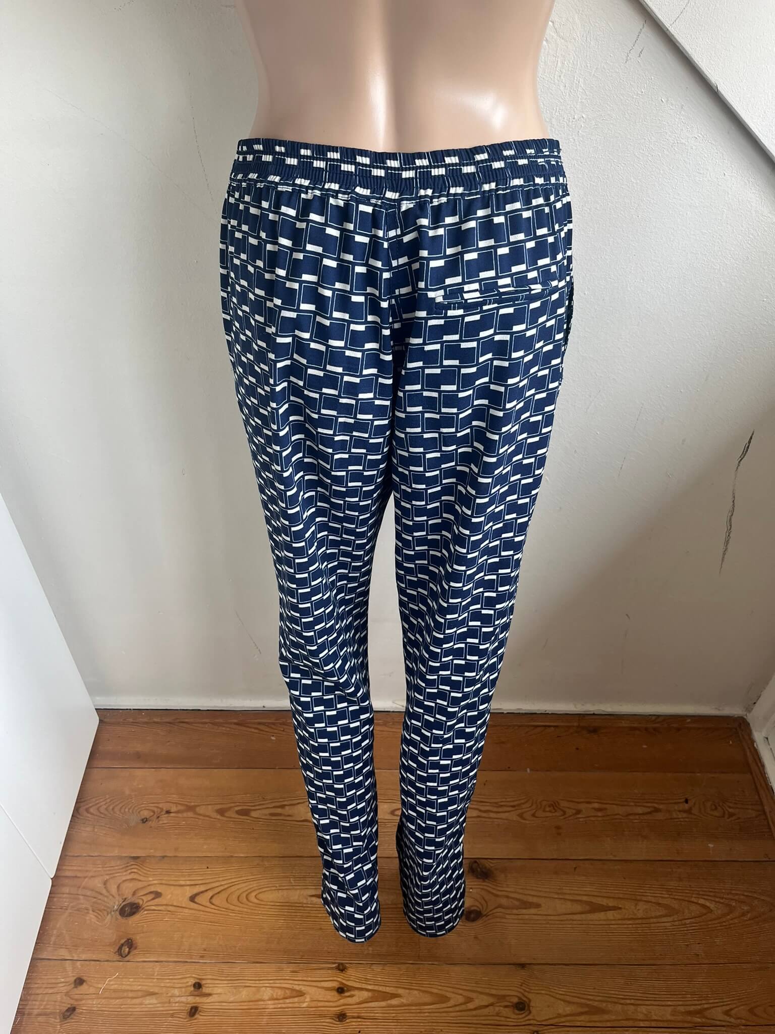 Donkerblauwe luchtige broek met witte print en aansnoerkoordje in de maat 36. Gemaakt van polyester. Taillewijdte 37 cm en lengte 104 cm.