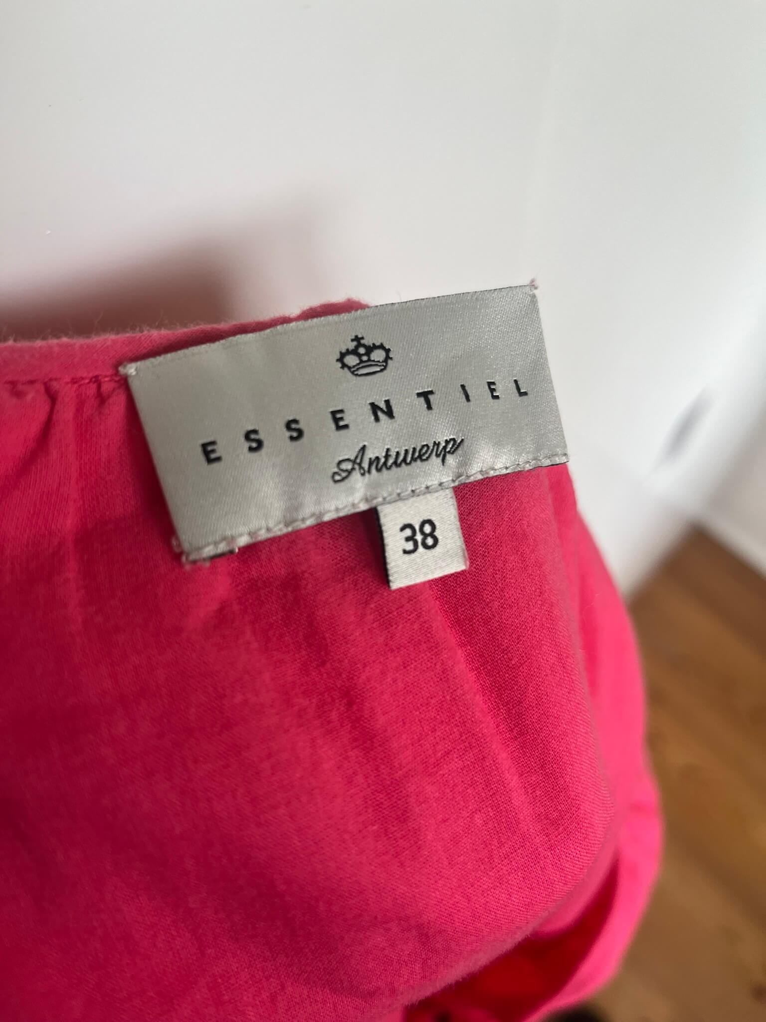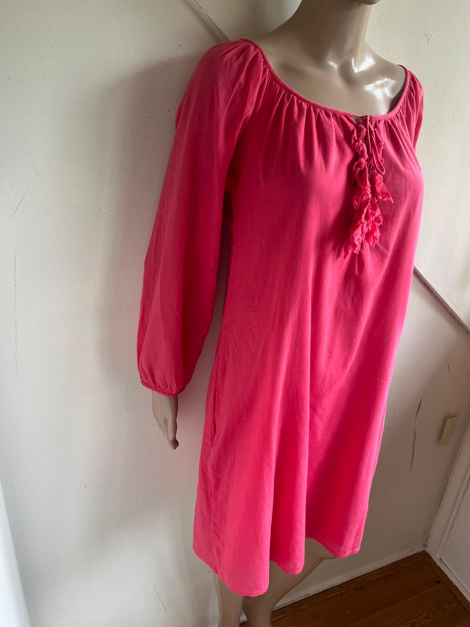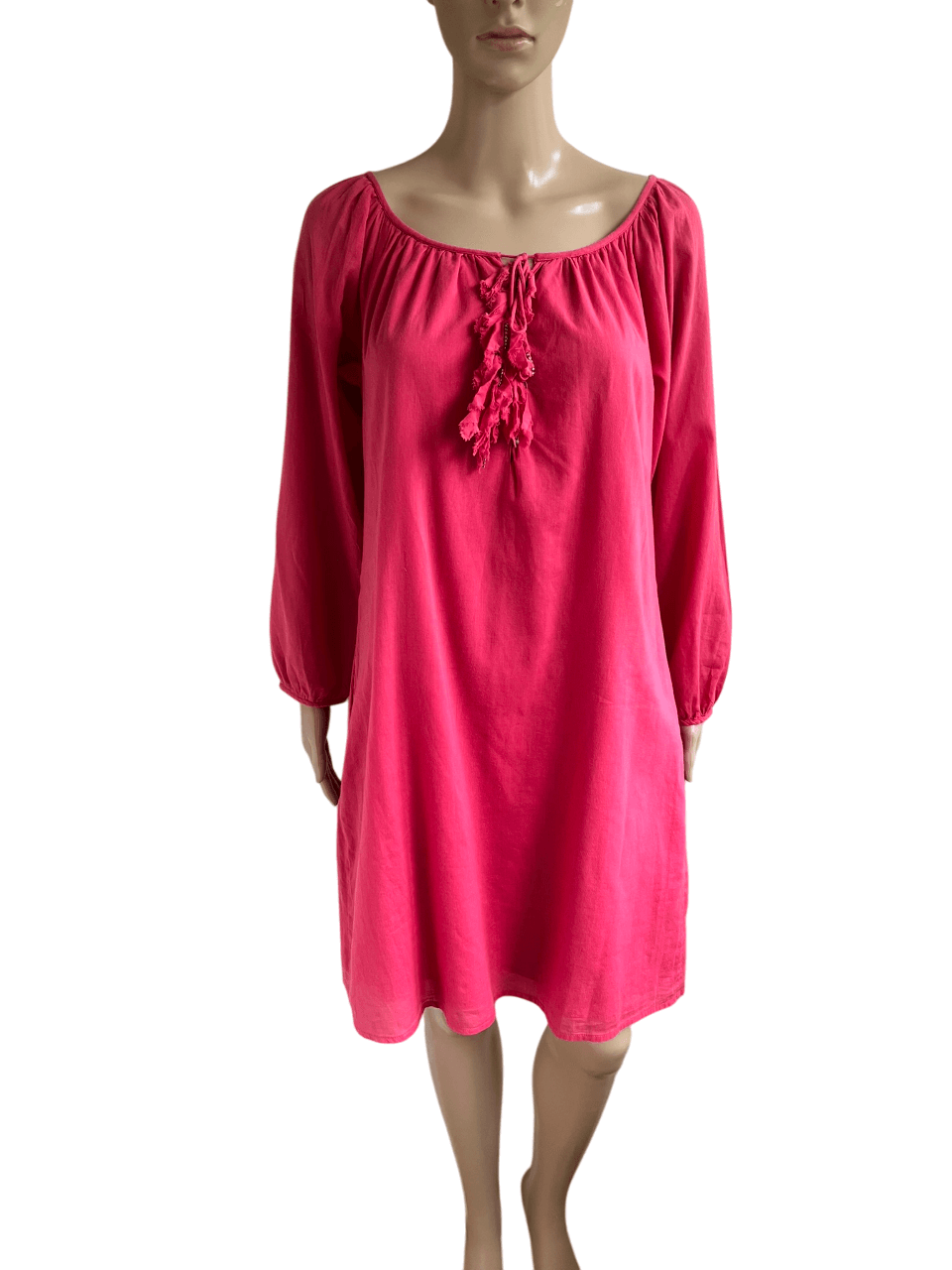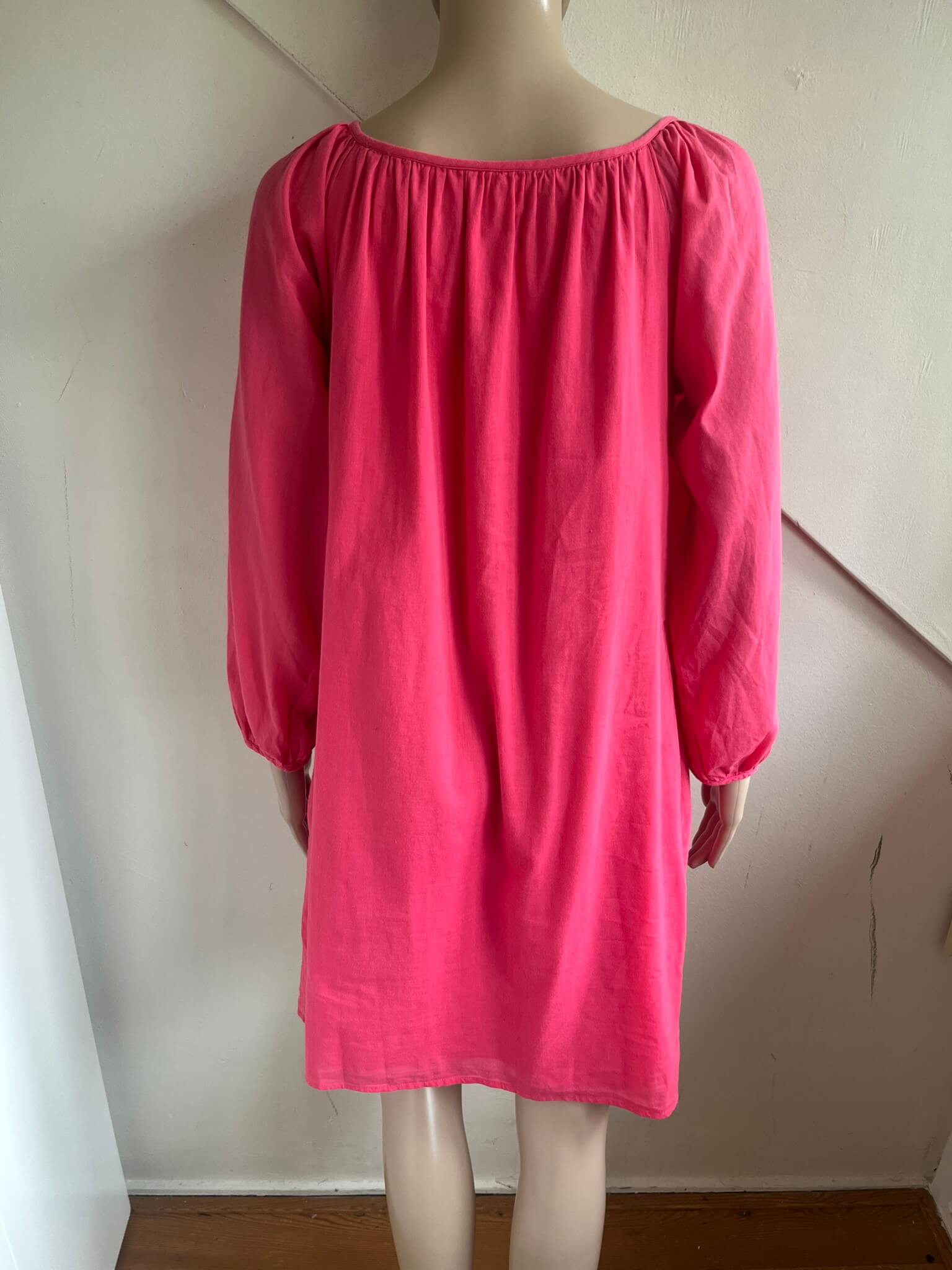 Roze luchtige jurk met versiering bij het decollete, roezeltjes en zilverkleurige bolletjes, in de maat 38. De jurk heeft zakken en is gemaakt van 100% katoen. Oksellengte 50 cm en lengte 90 cm.