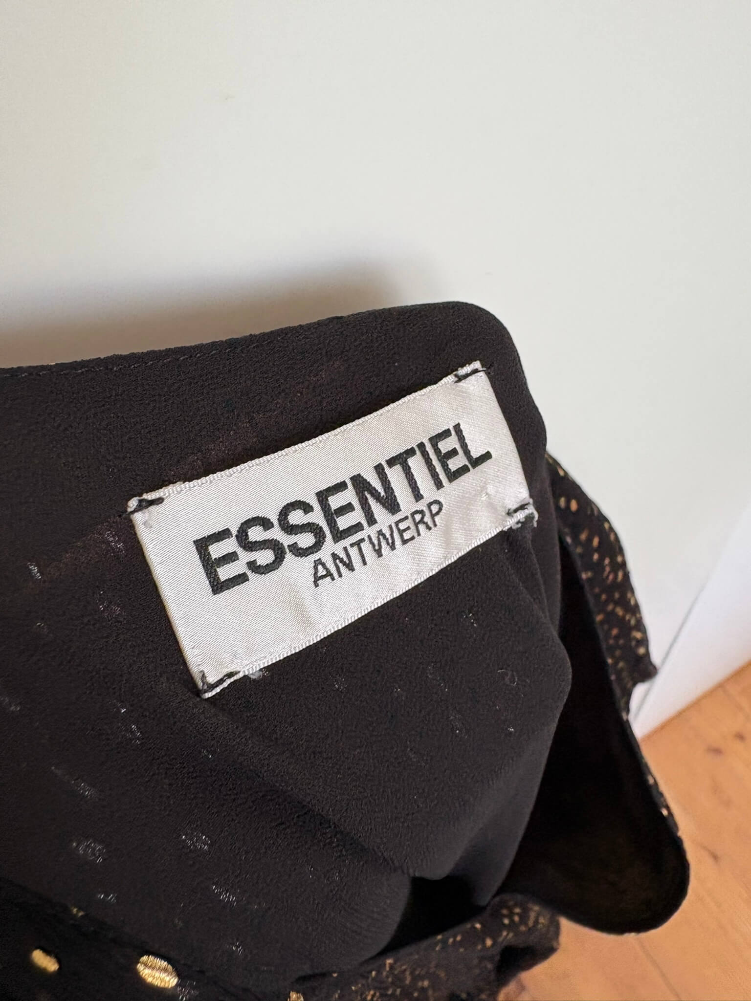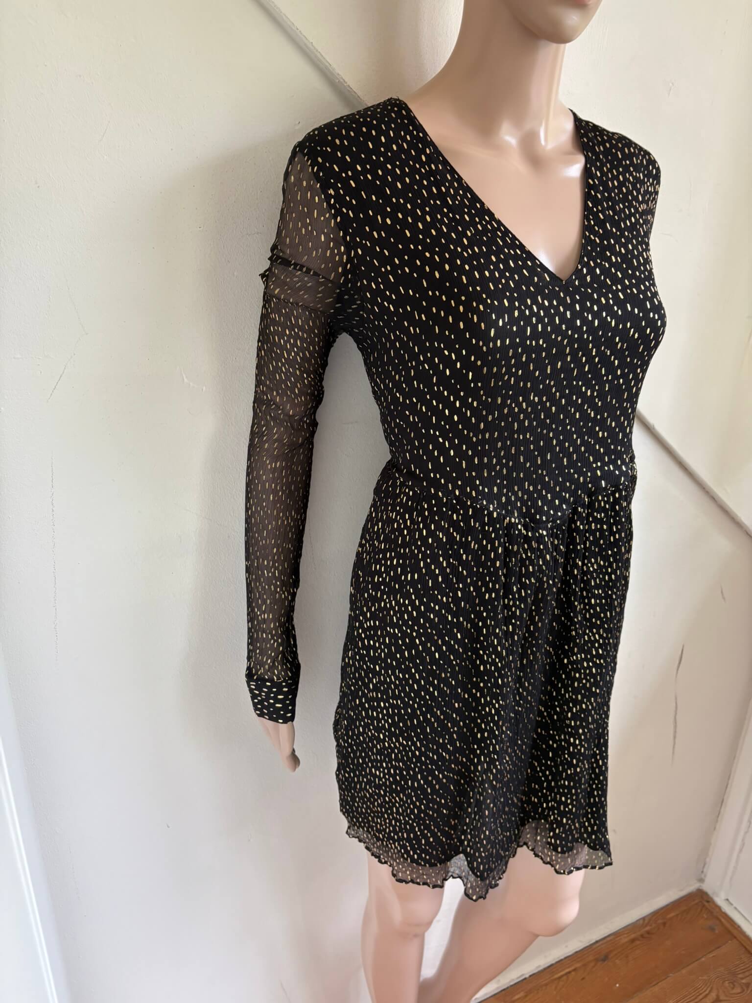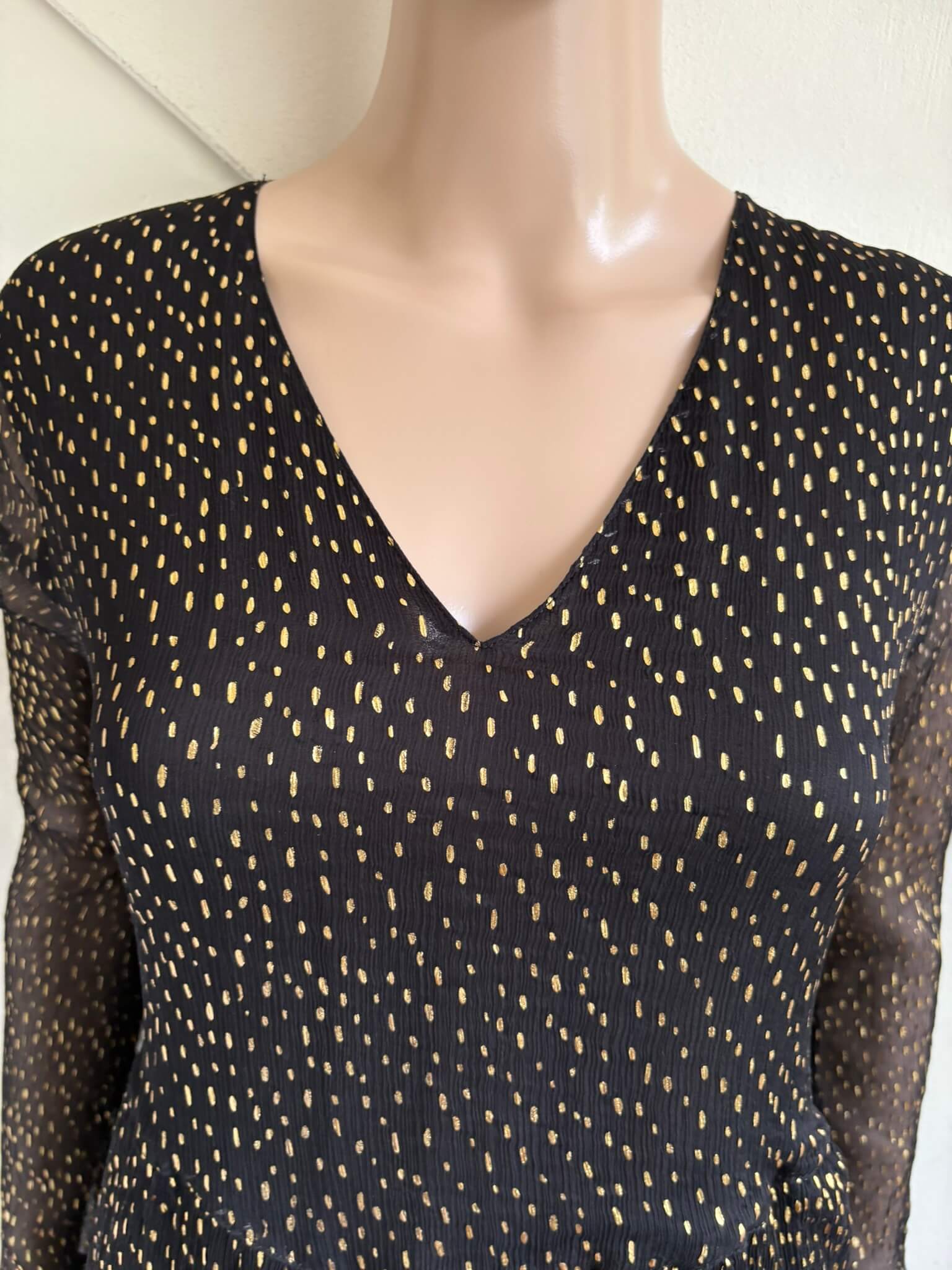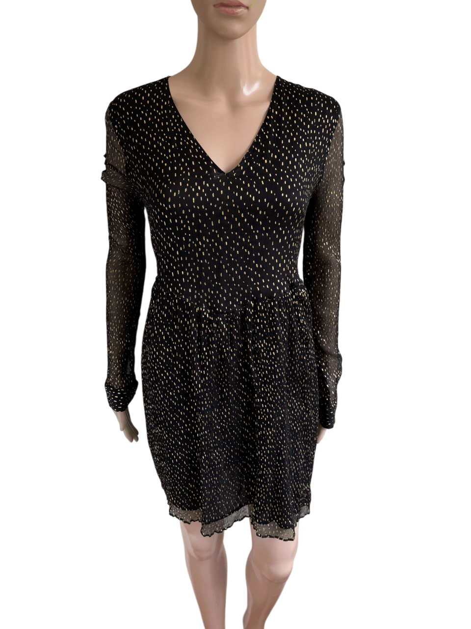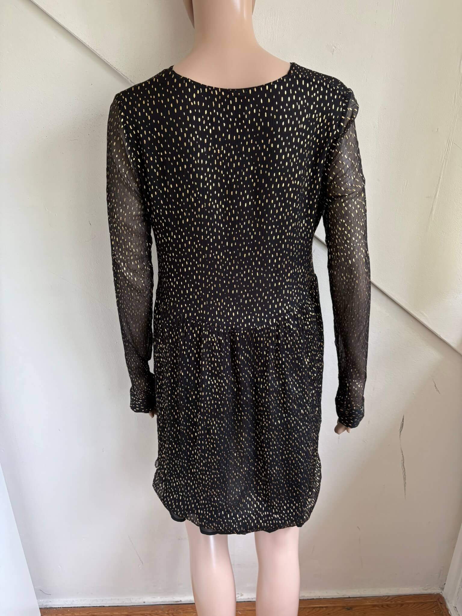 Zwarte zijden jurk met mesh mouwen en een gouden print in de maat 38. Gemaakt van 100% zijde en de voering is gemaakt van polyester. Oksellengte 47 cm en lengte 86 cm.