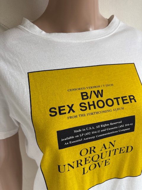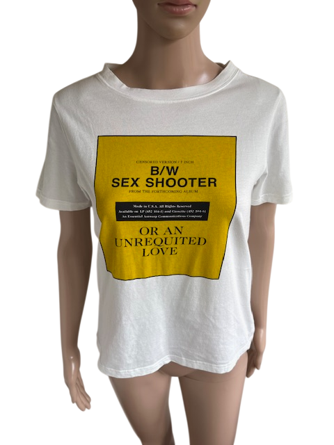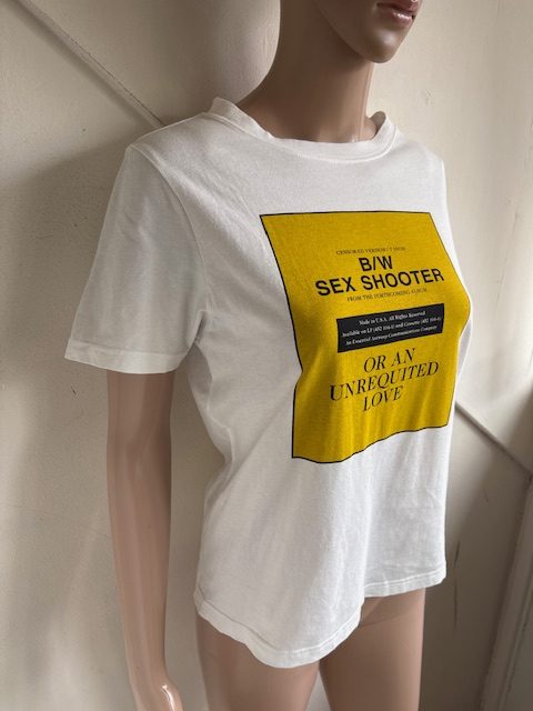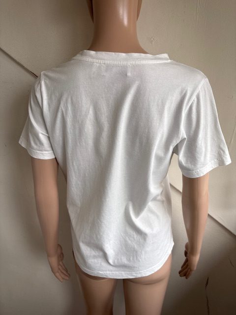 Wit t-shirt of top met mosterdgele print met tekst in de maat 0 = 34. Oksellengte 46 cm en lengte 56 cm.