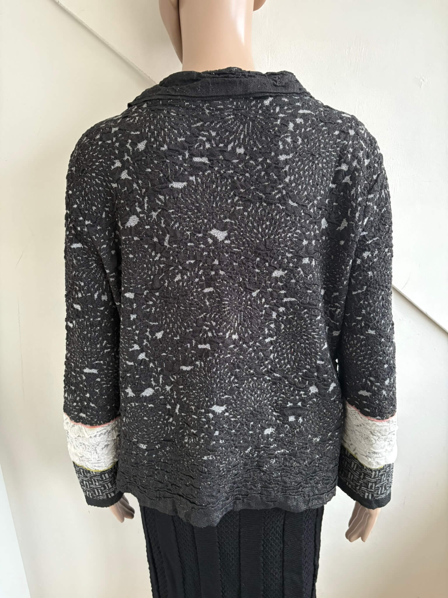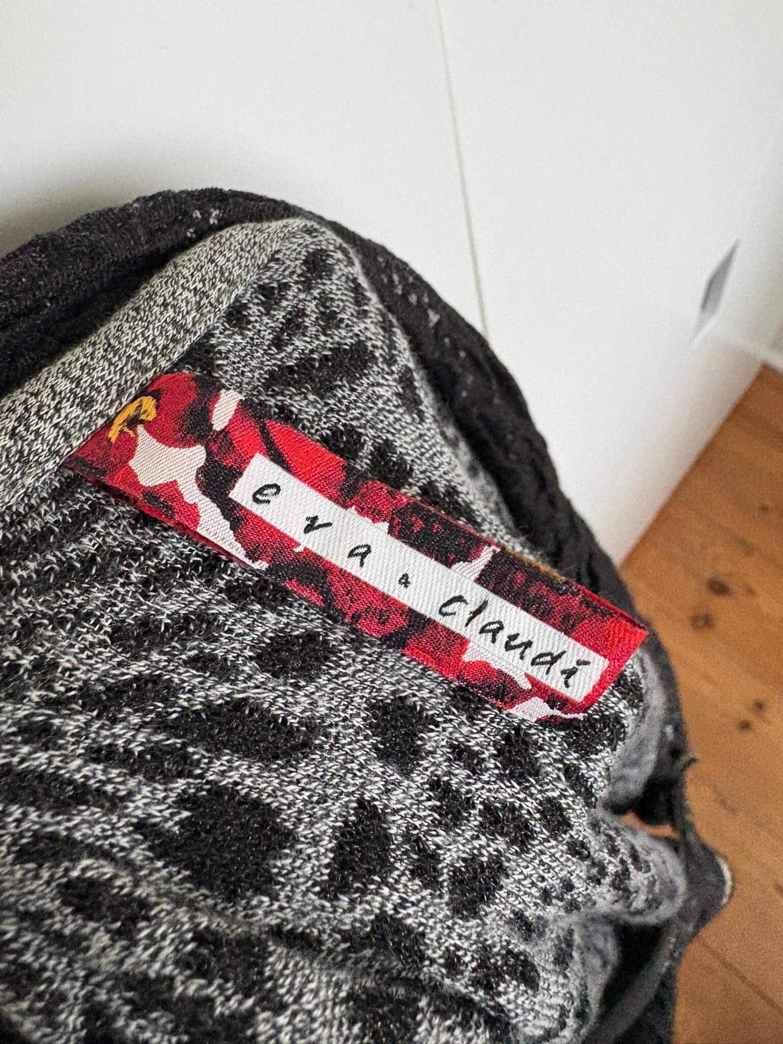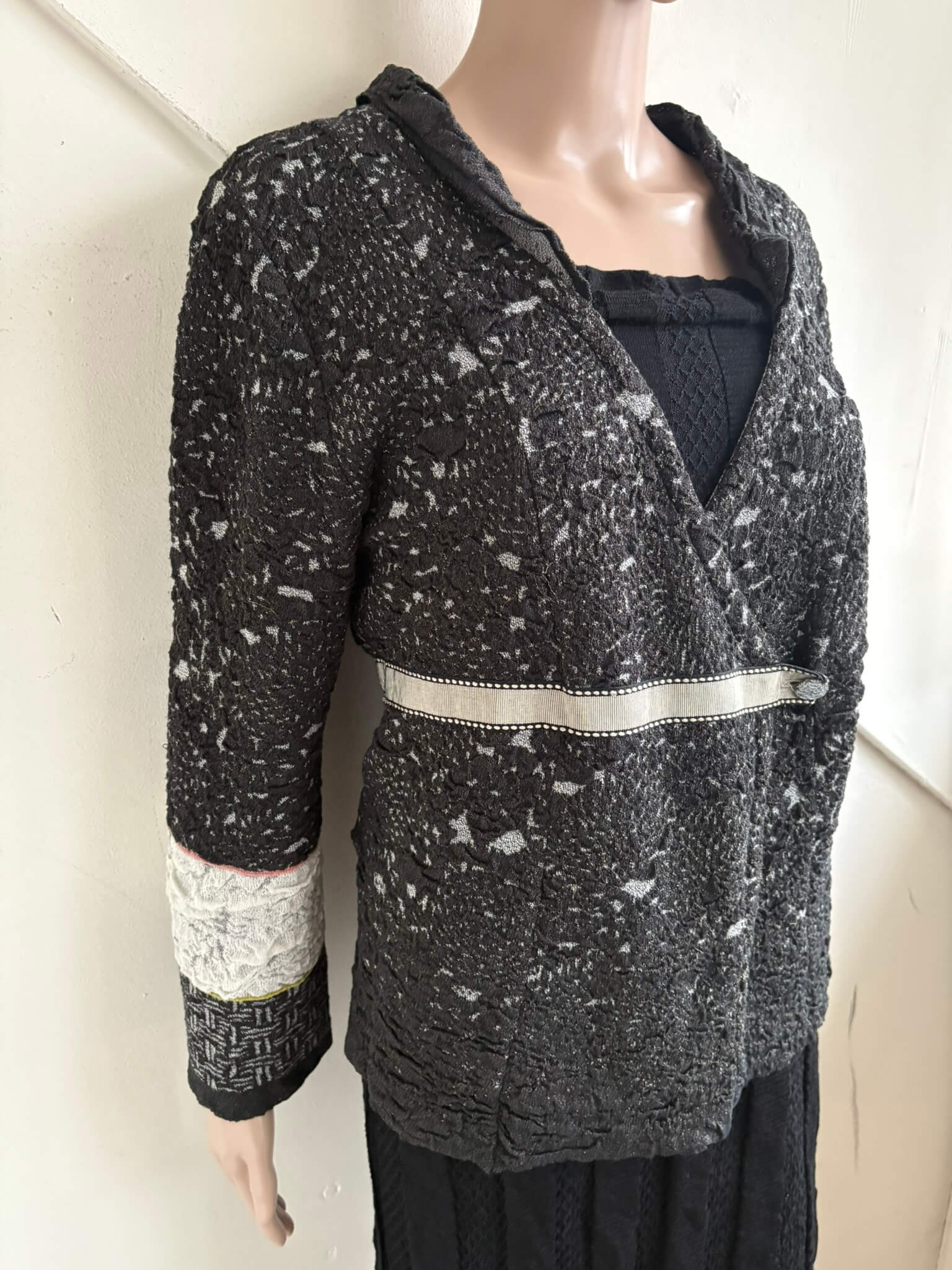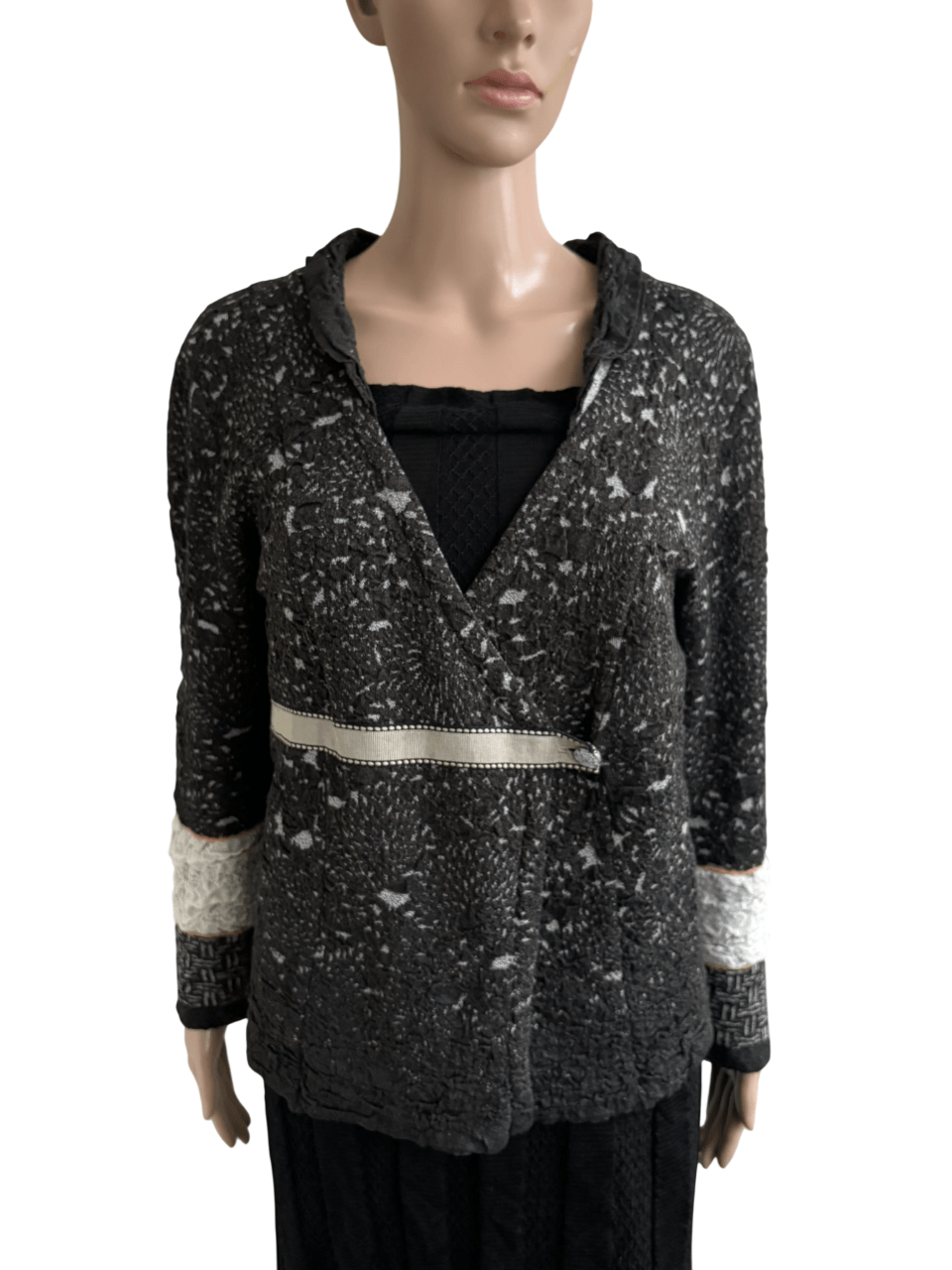 Grijs gemêleerd overslag vestje met beige details in de maat L. Oksellengte 53 cm en lengte 56 cm.