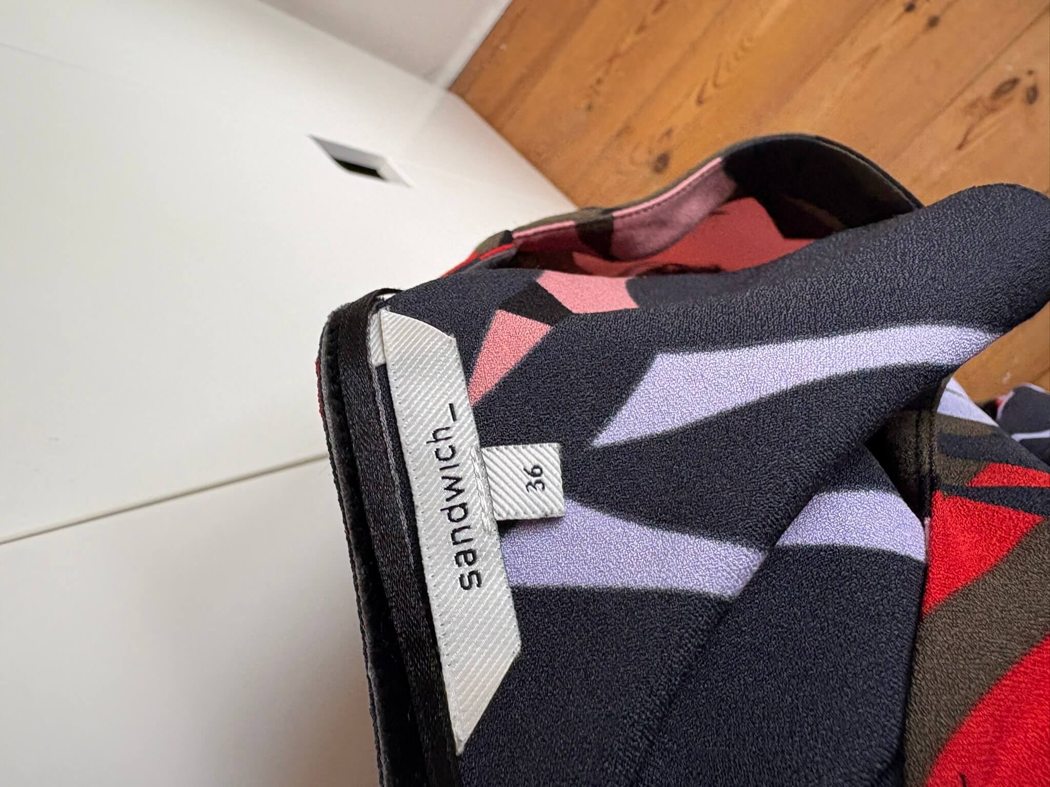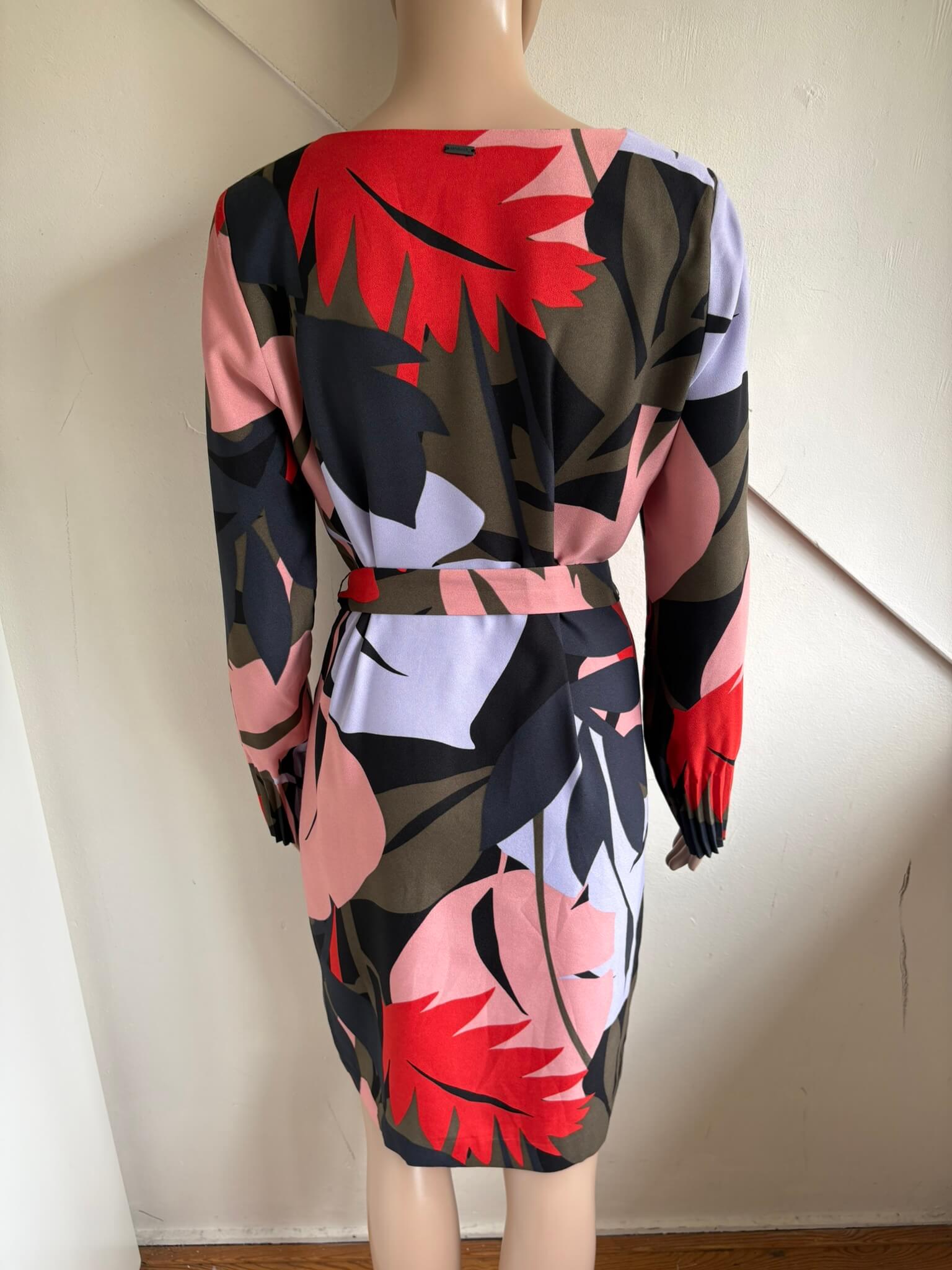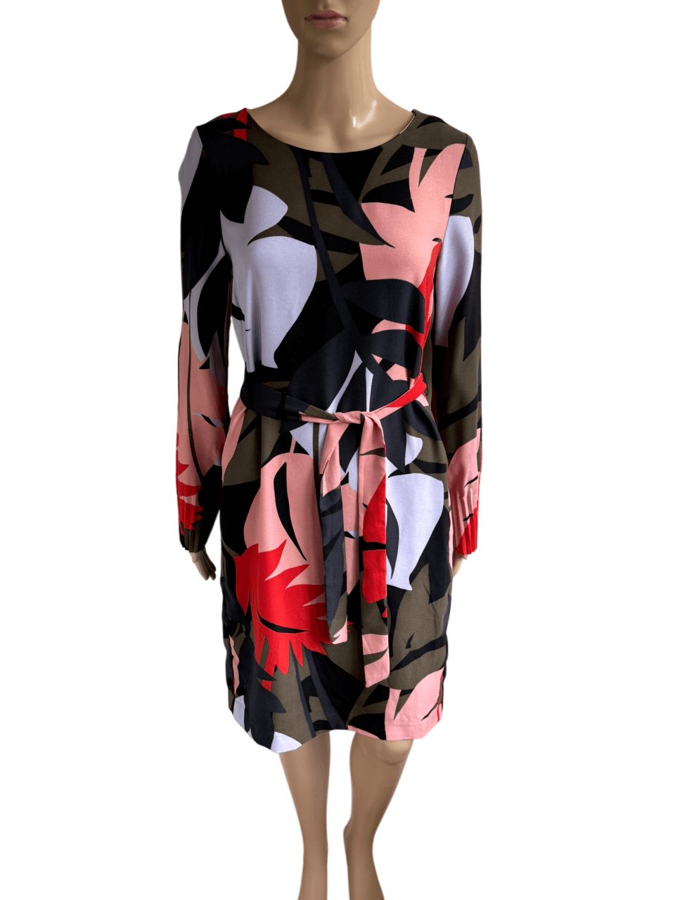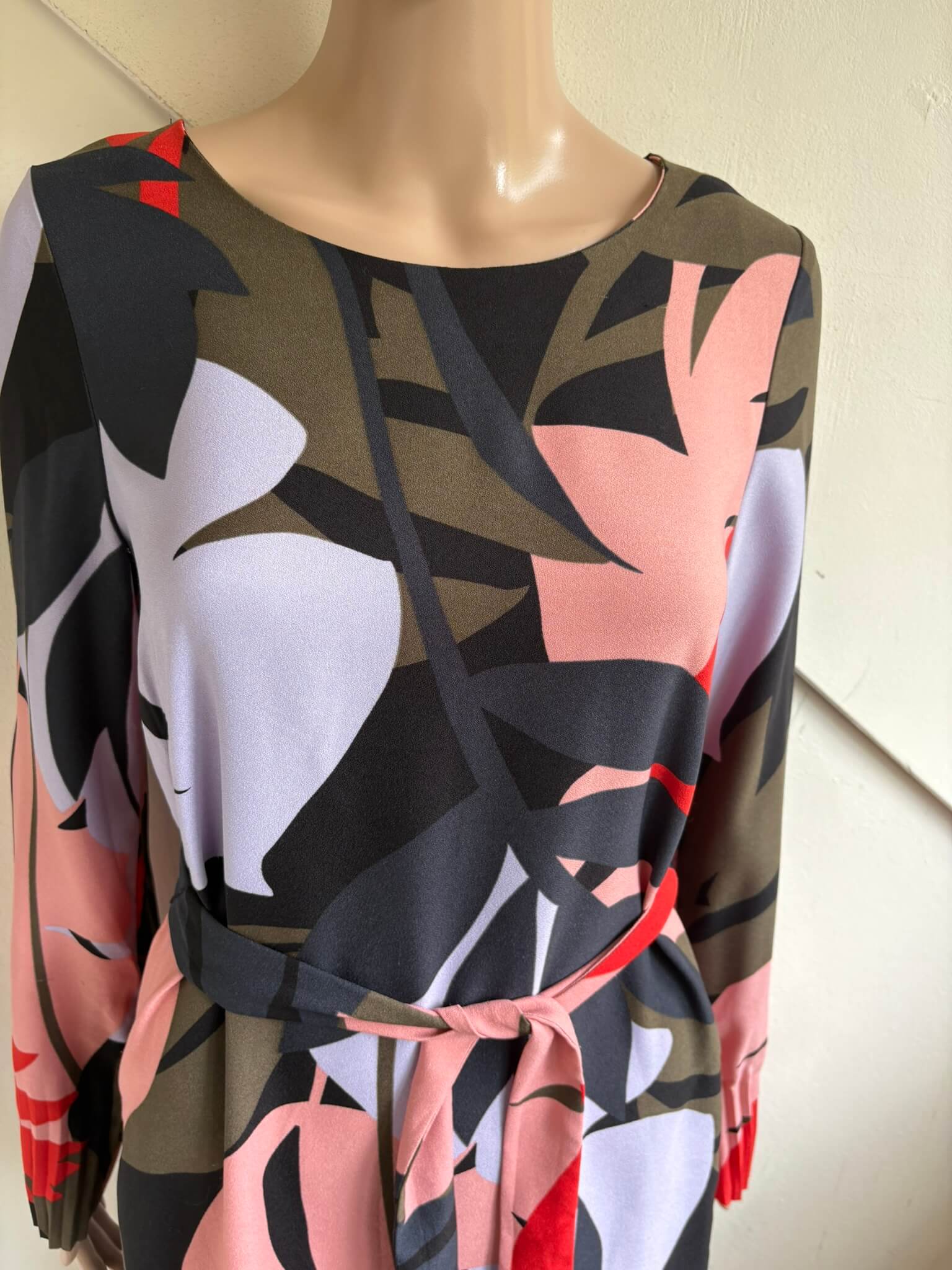 Mooie kleurrijke (lila rood bruin zwart) jurk met losse riem en steekzakken in de maat 36. Gemaakt van polyester. Uiteinde mouwen zijn plissé.