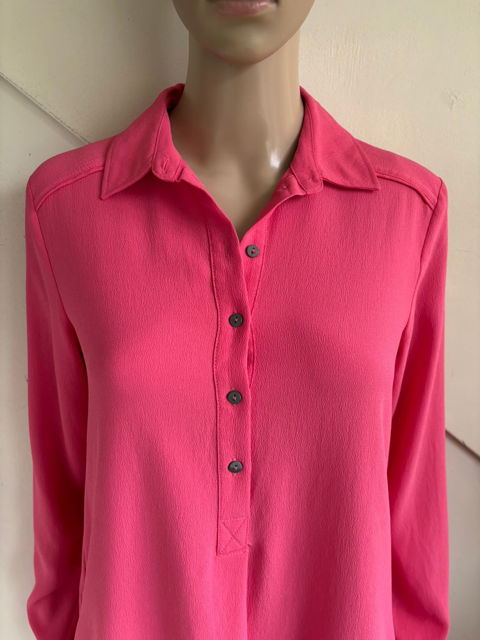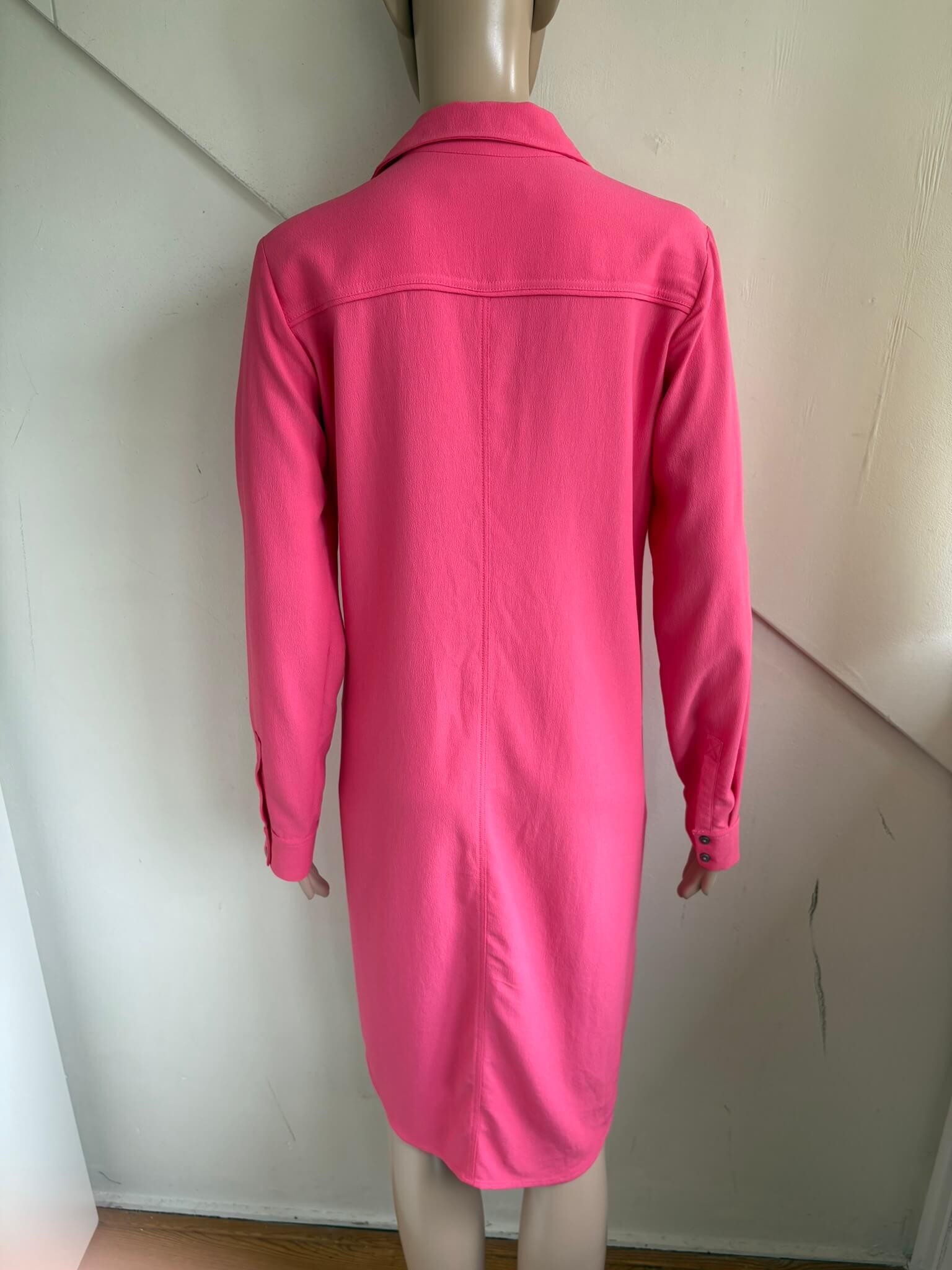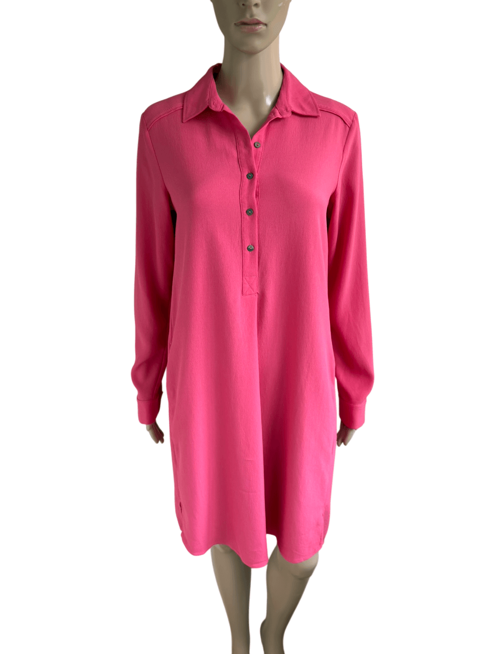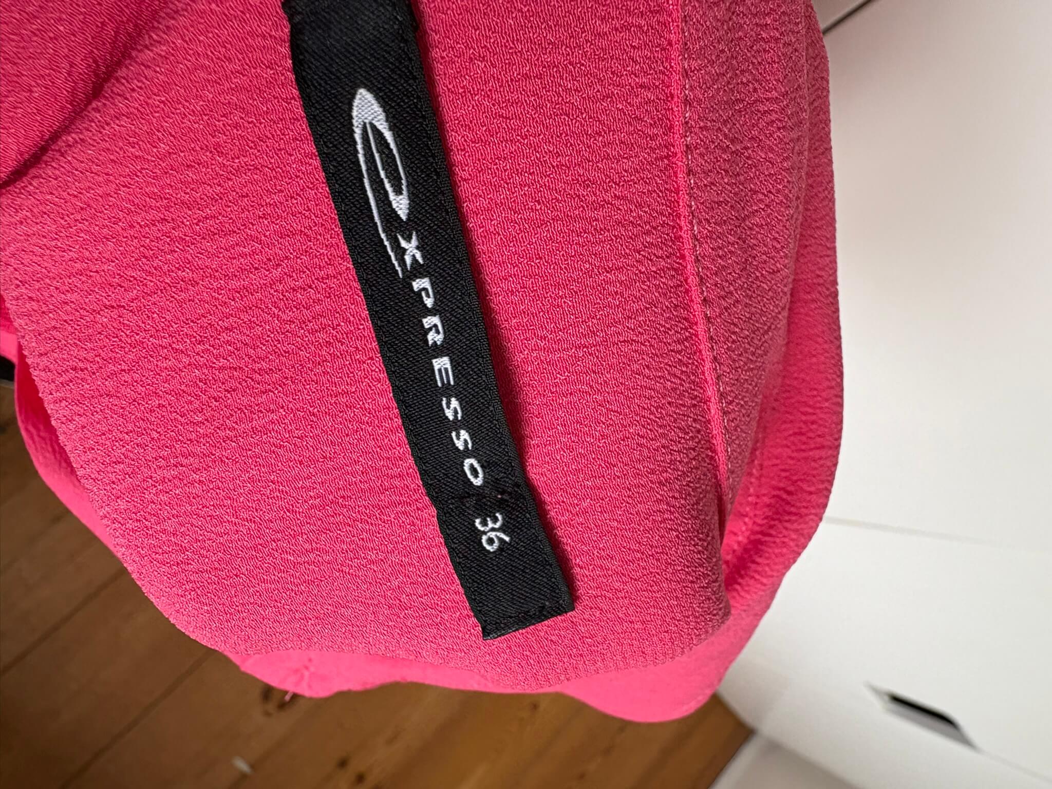 Roze jurk met steekzakken in de maat 36. Gemaakt van viscose en polyester. Oksellengte 47 cm en lengte 96 cm.