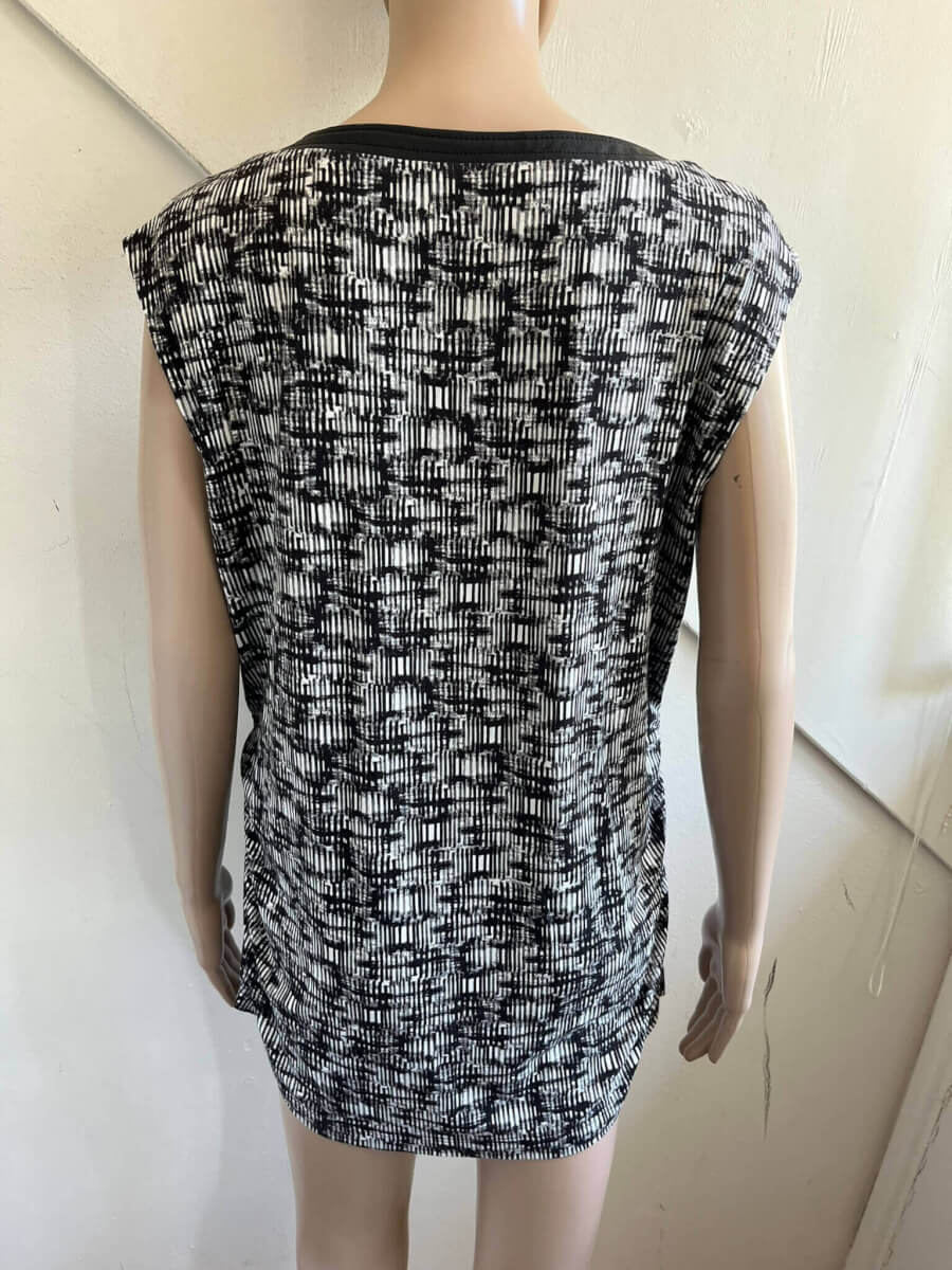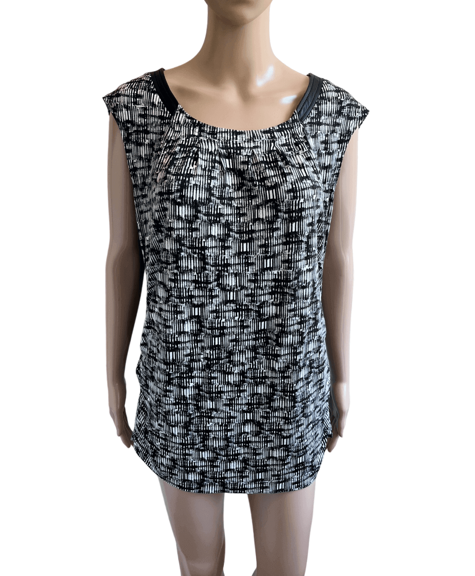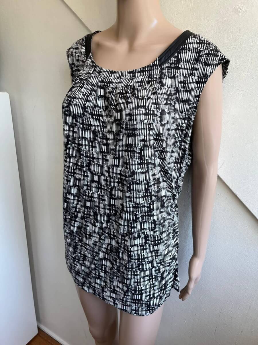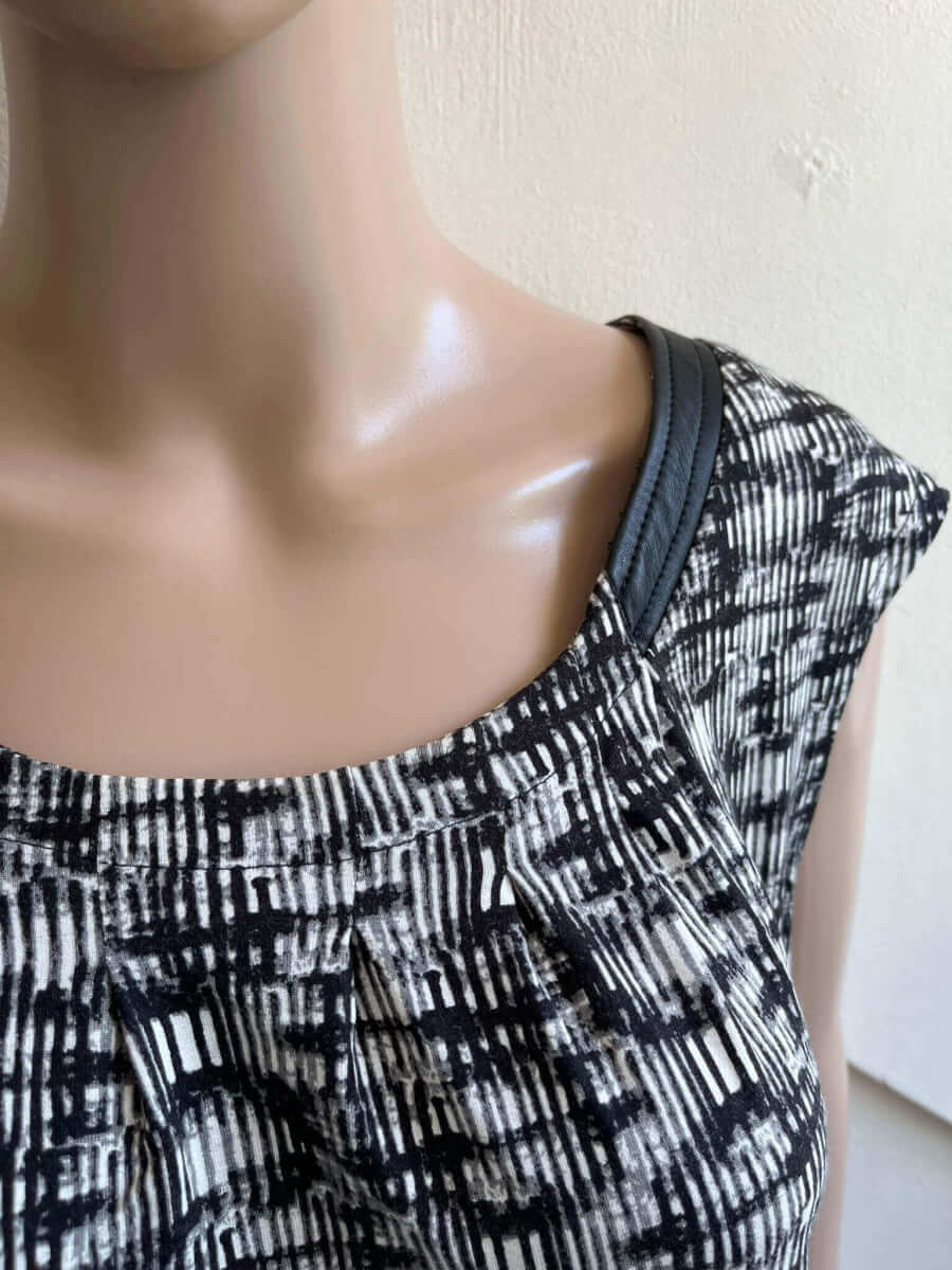 Leuke top met een zwart witte print en pu-leren details in de maat 44/46. Materiaallabel ontbreekt. Oksellengte 54 cm (vergelijken met een mouwloze top of jurk) en lengte 69 cm.