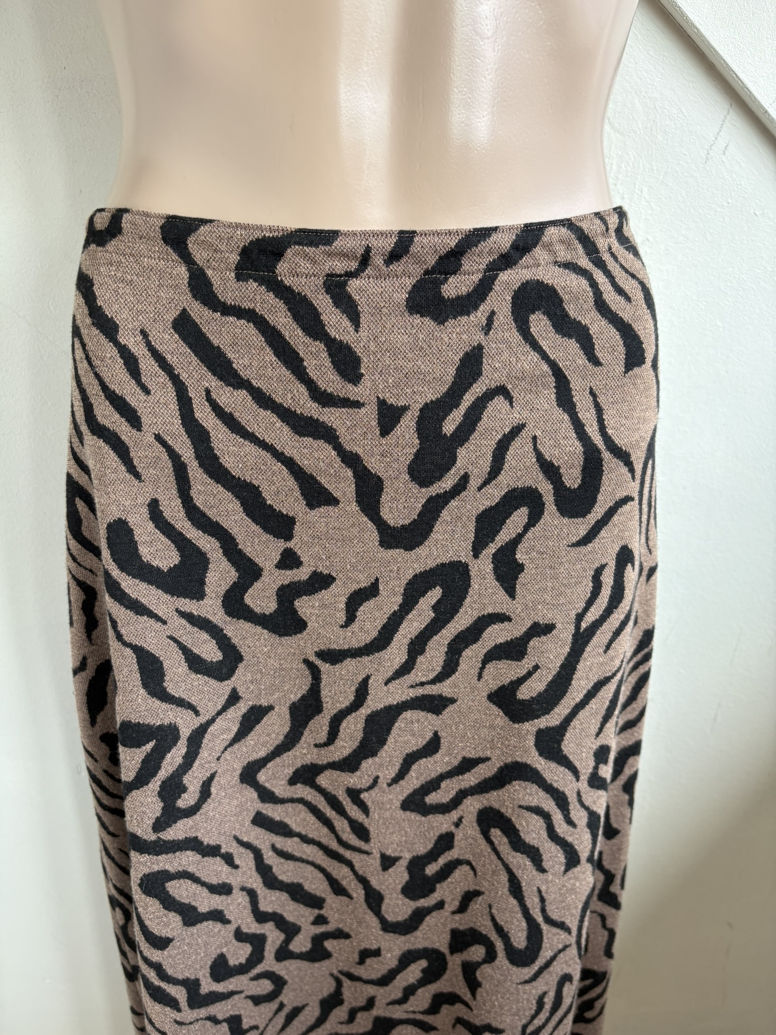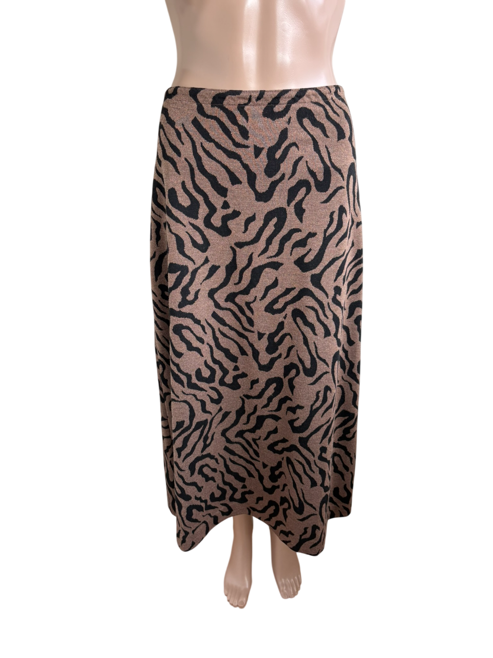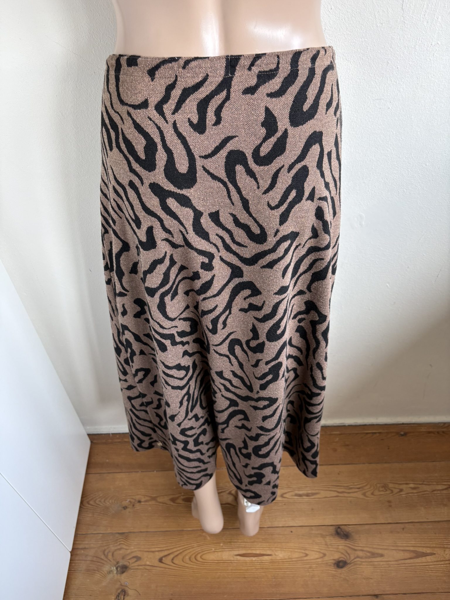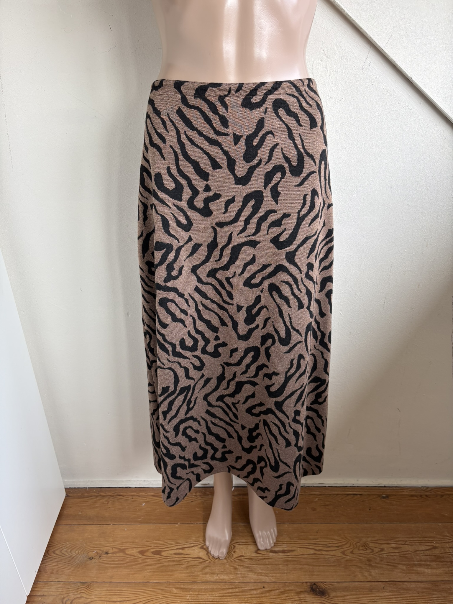 Bruine lange rok met zwarte print en elastische taille in de maat M. “Phene Skirt”.  Taillewijdte 37 cm en lengte 84 cm.