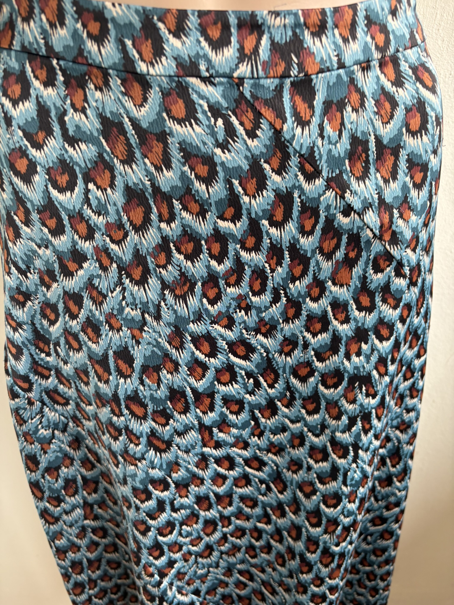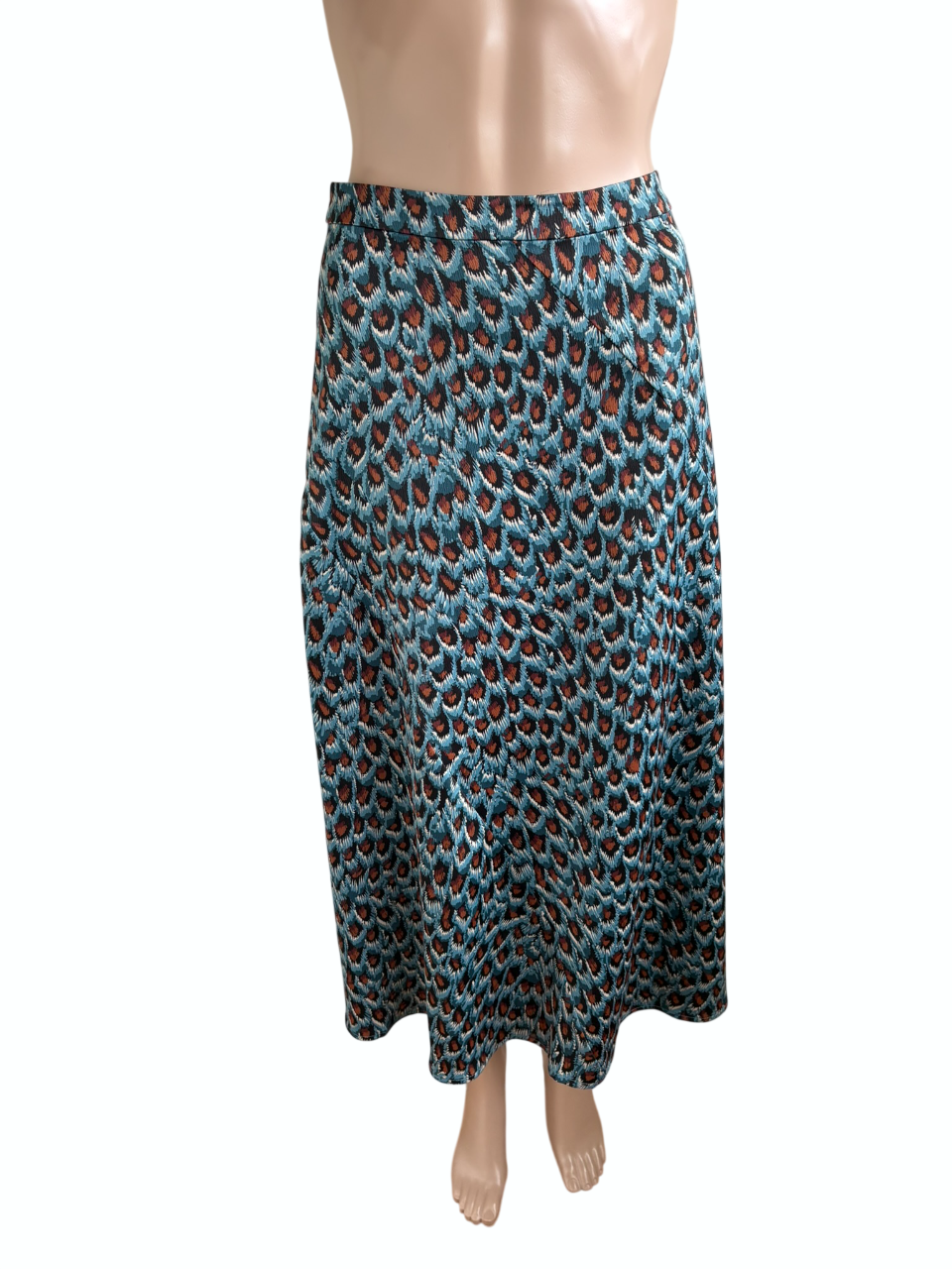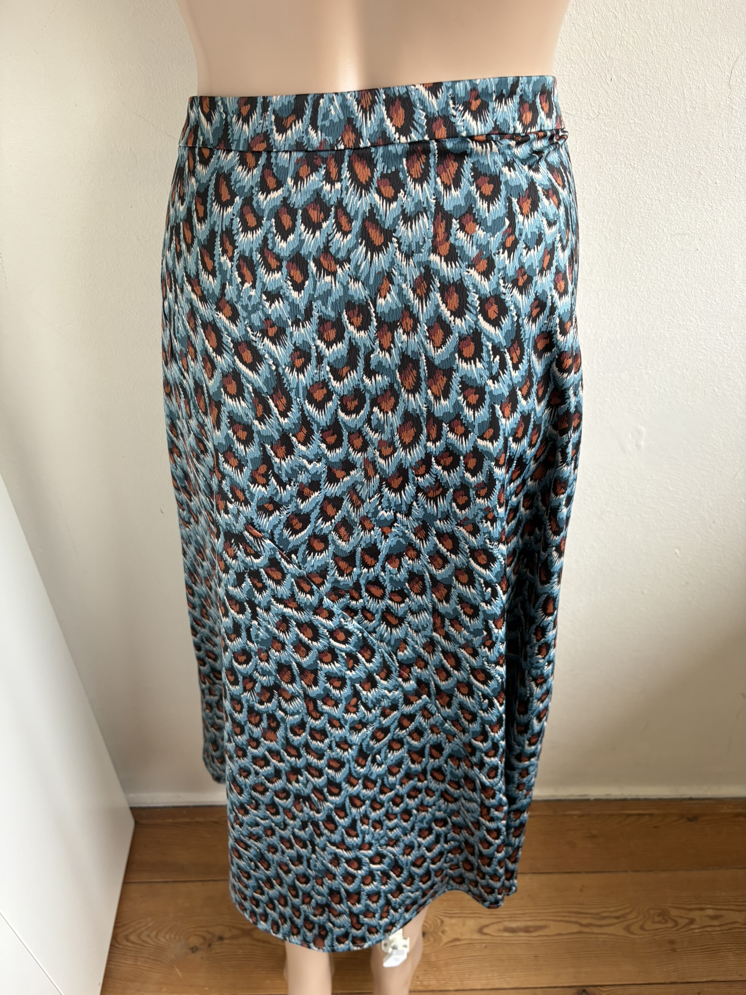 Blauwe lange rok, “Claire Skirt” met bruin, zwart en witte print en een lichte glans, in de maat 40. Taillewijdte 43 cm en lengte 83 cm.
