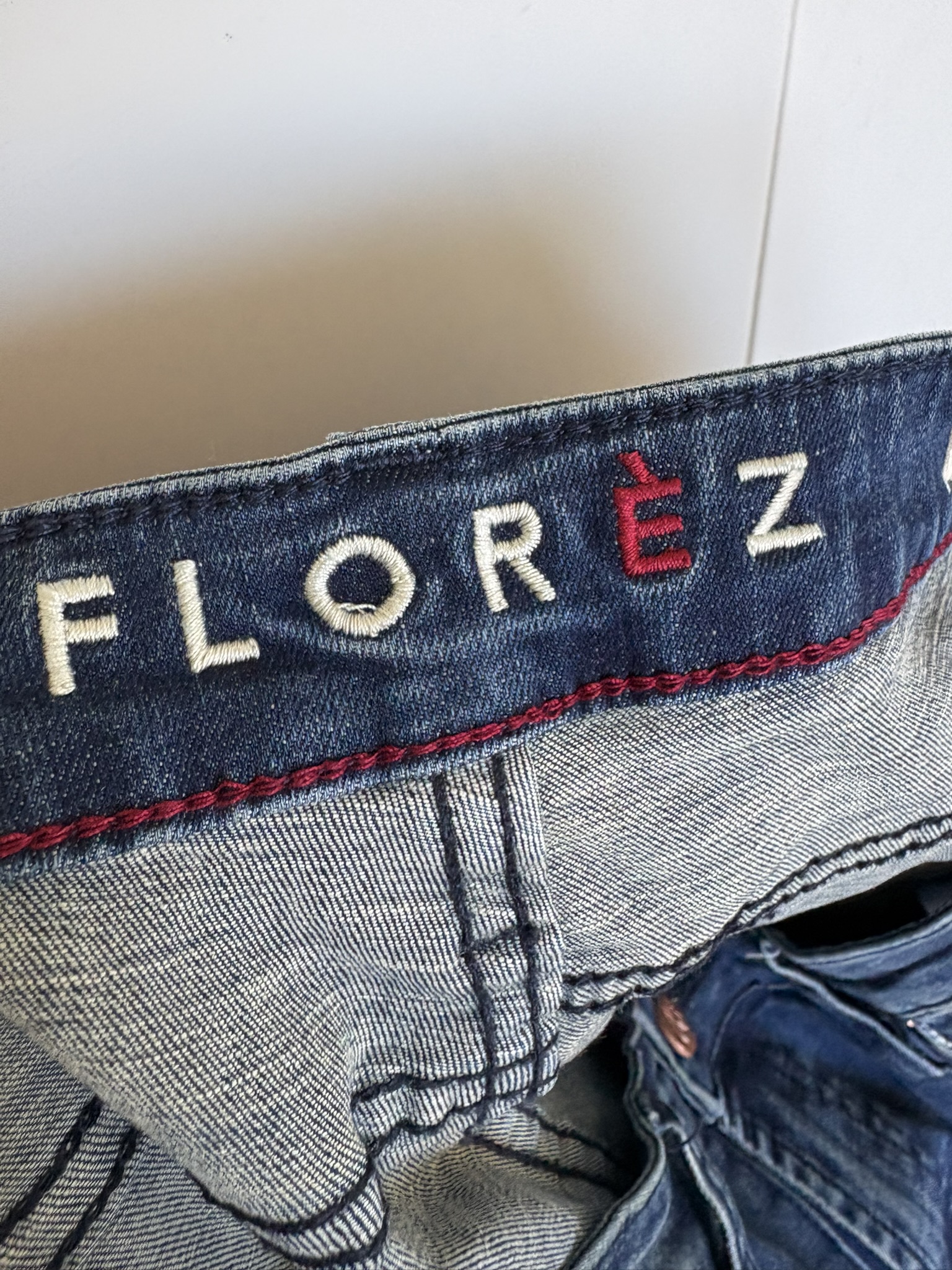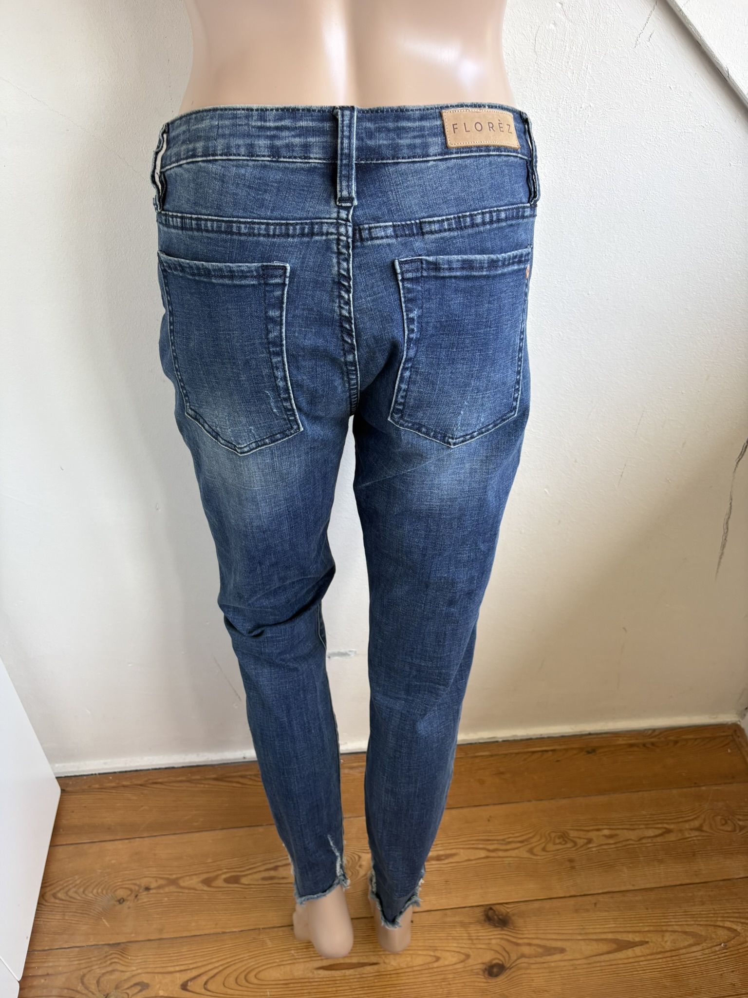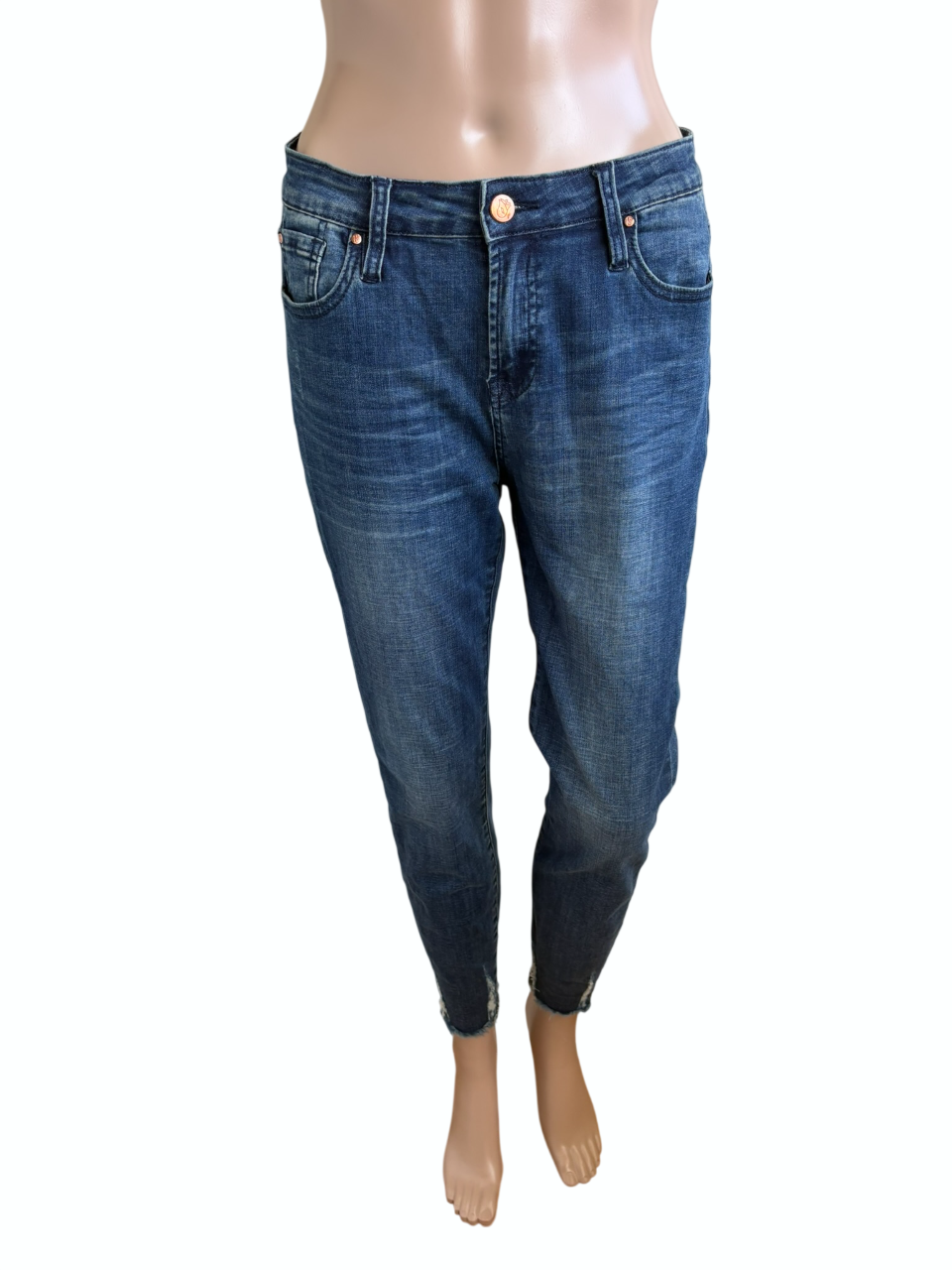 Blauwe spijkerbroek / jeans in de jeansmaat 30 = 38, met ripped enkelboord. Bobbi Slim Fit. Taillewijdte 40 cm en lengte 94 cm.