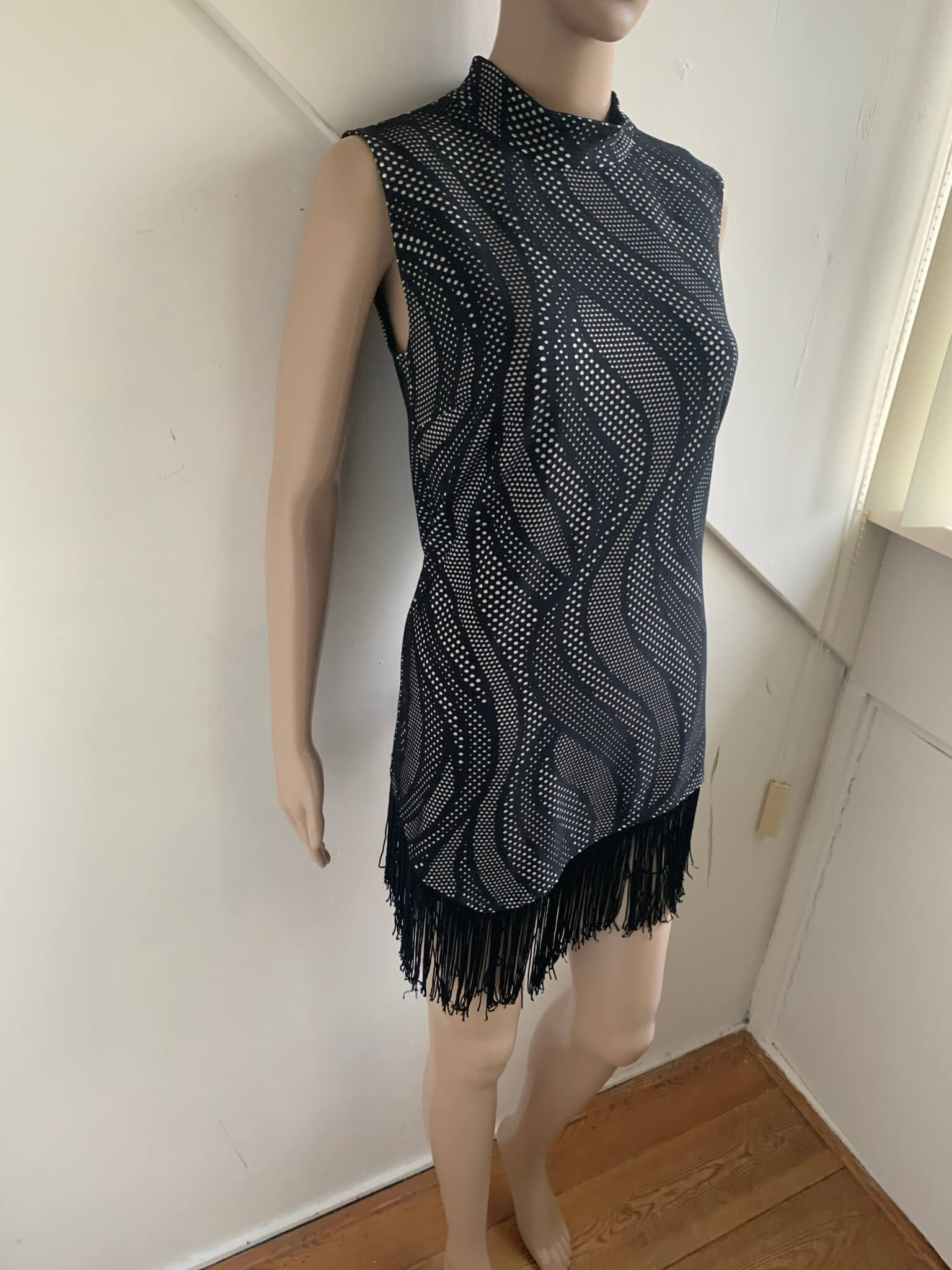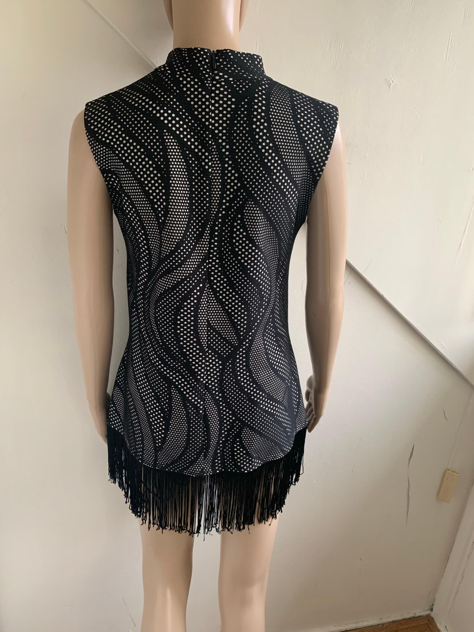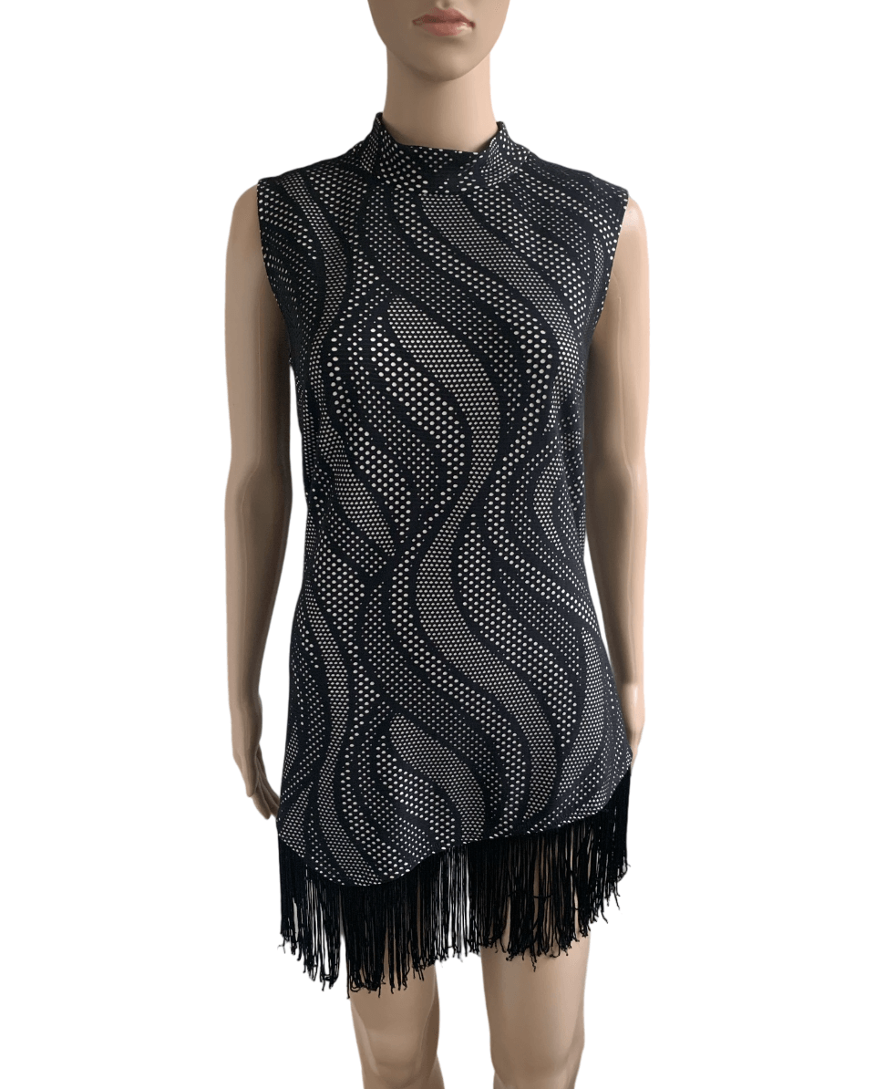 Prachtige zwart witte top met sliertjes onderzijde in de maat 40 . Ook te gebruiken als minijurk maar dan is het wel erg kort. In nieuwstaat.