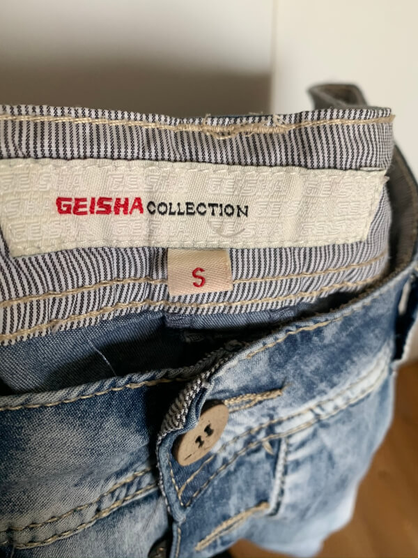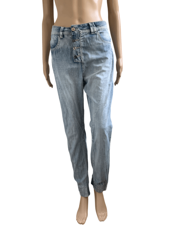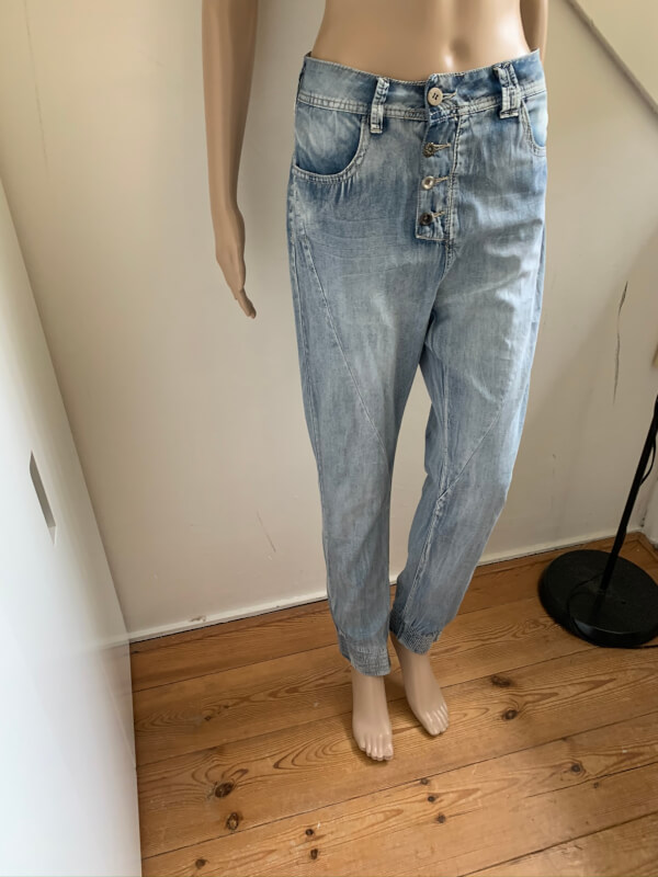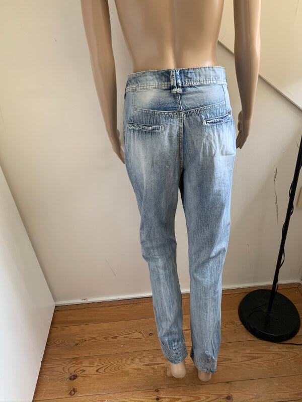 Lichtblauwe dunne broek , lijkt als een jeans / spijkerbroek maar de stof is een stuk dunner. In t label staat maat S maar valt naar mijn idee iets ruimer. Taillewijdte is ongeveer 41cm. Leuke accenten zoals verschillende knopen en elastisch bij de enkels. Gemaakt van katoen