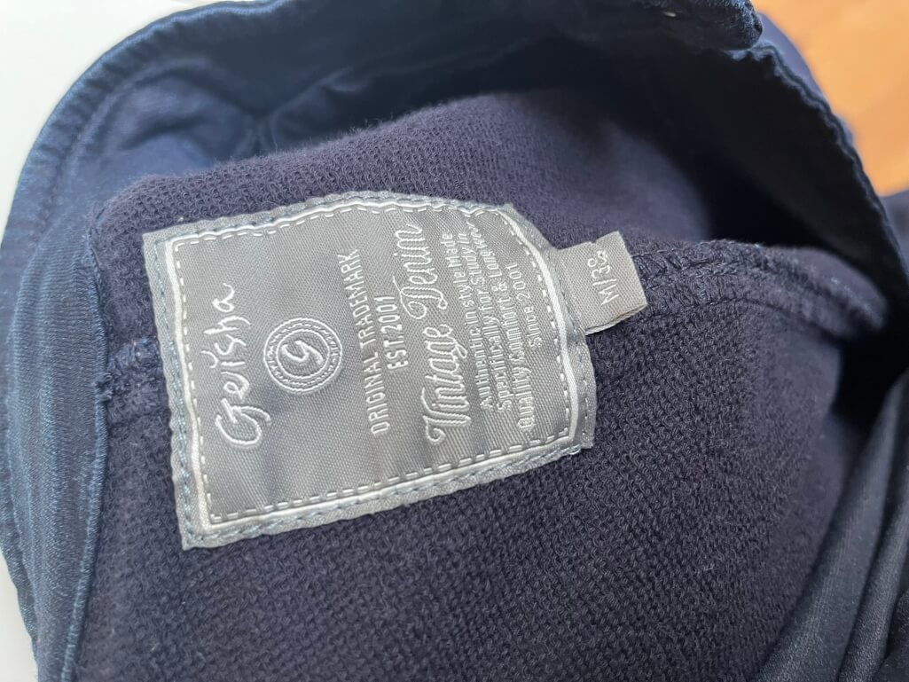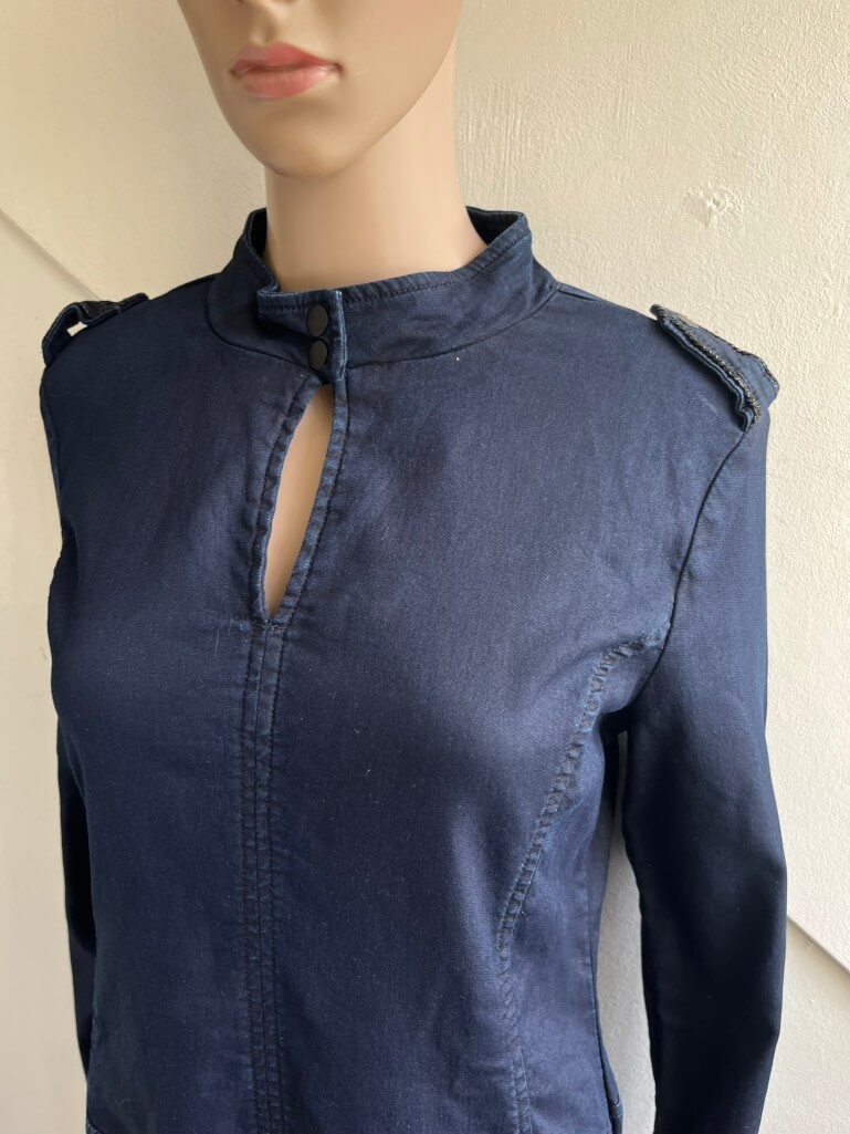 Donkerblauwe spijkerjurk met leuke details en gemaakt van zachte denimstof in de maat 38. gemaakt van katoen polyester en elastaan. OKsellengte 47 cm en lengte 90 cm.