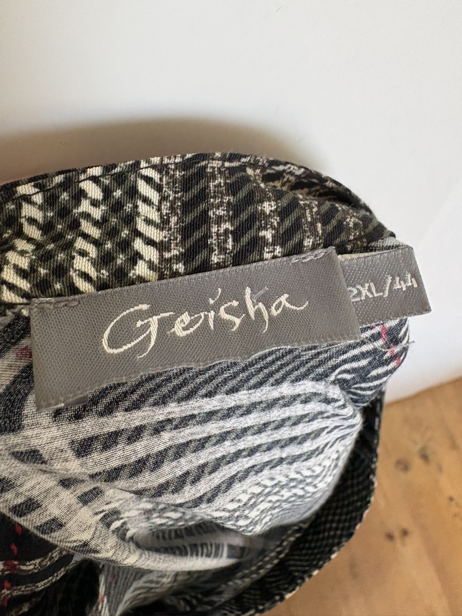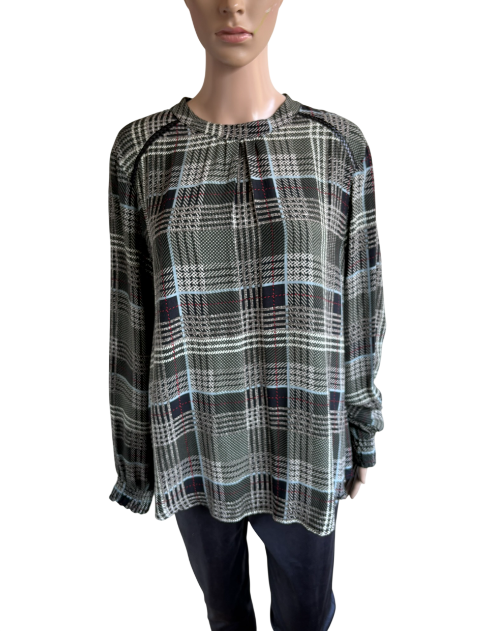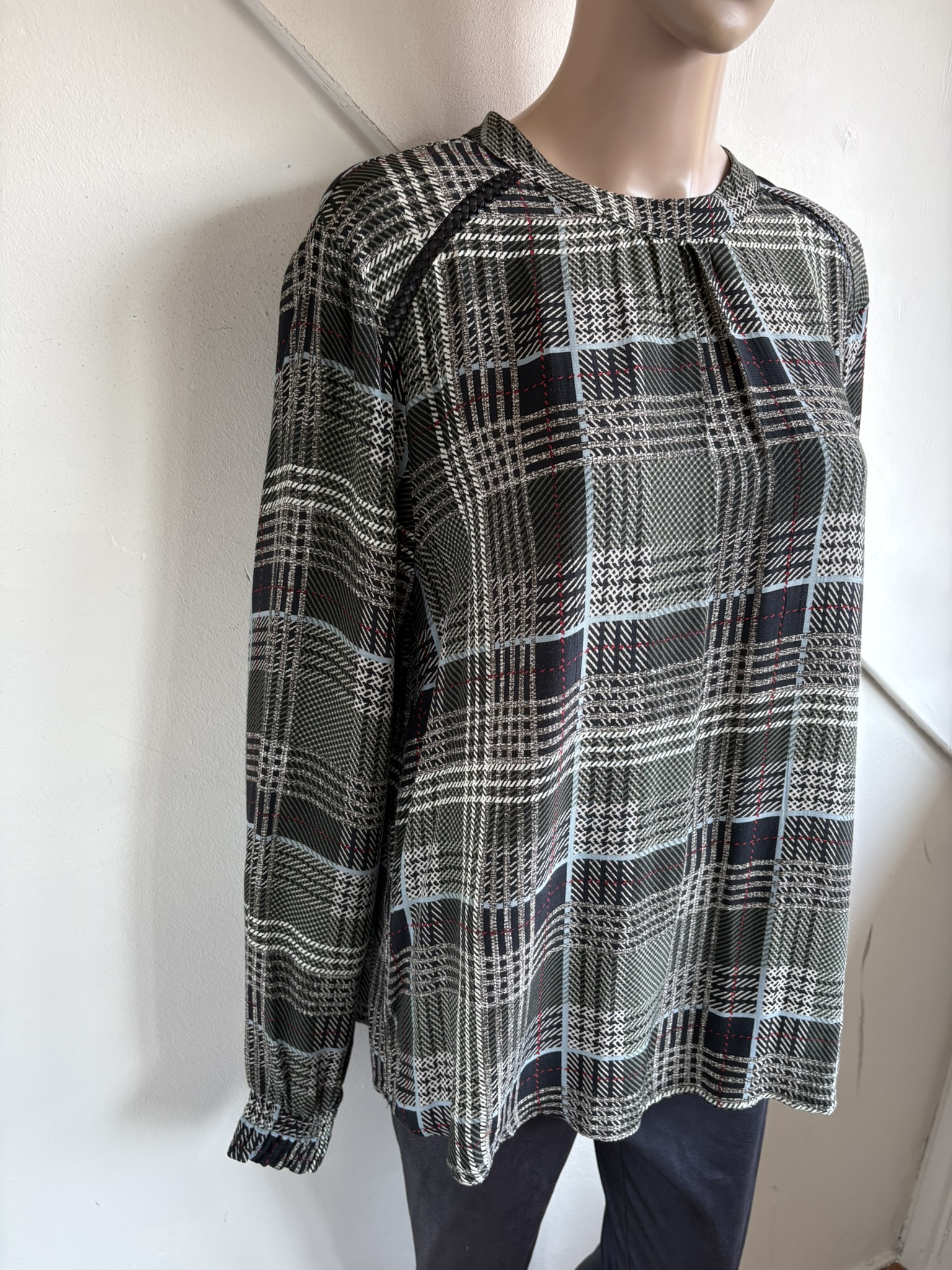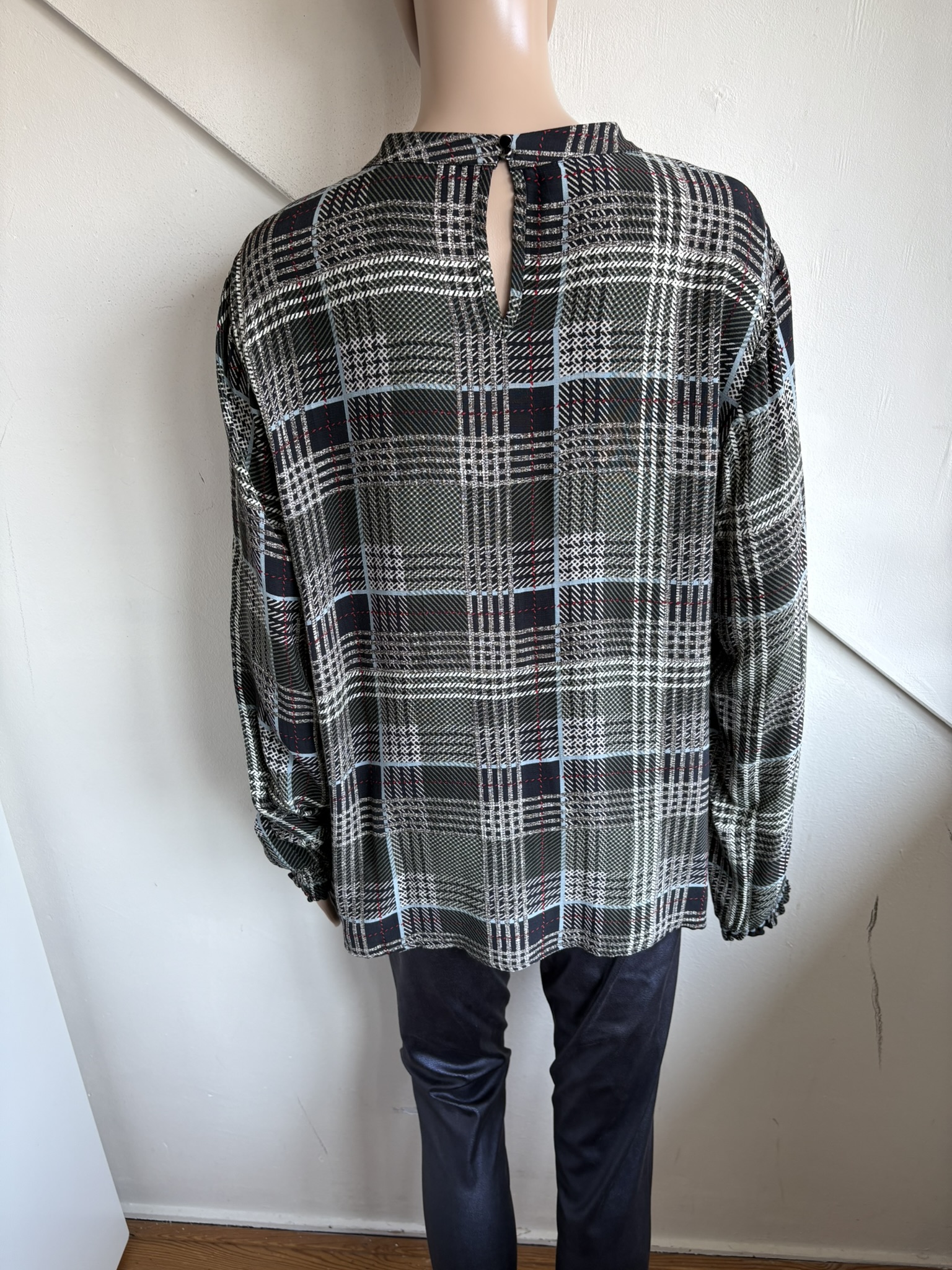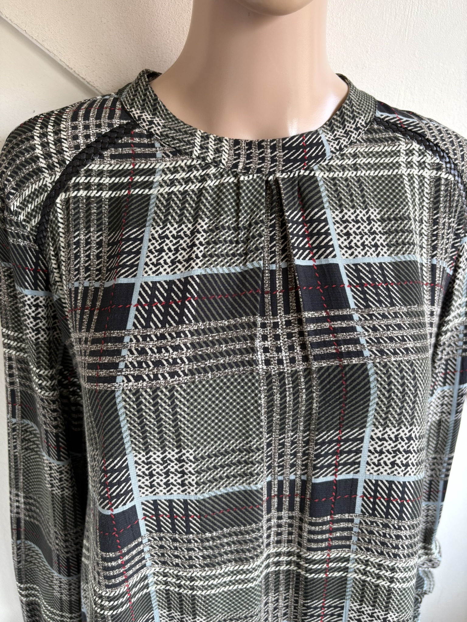 Groen, offwhite, zwart en rood geruite blouse of top in de maat 44. Oksellengte 59 cm en lengte 65 cm.