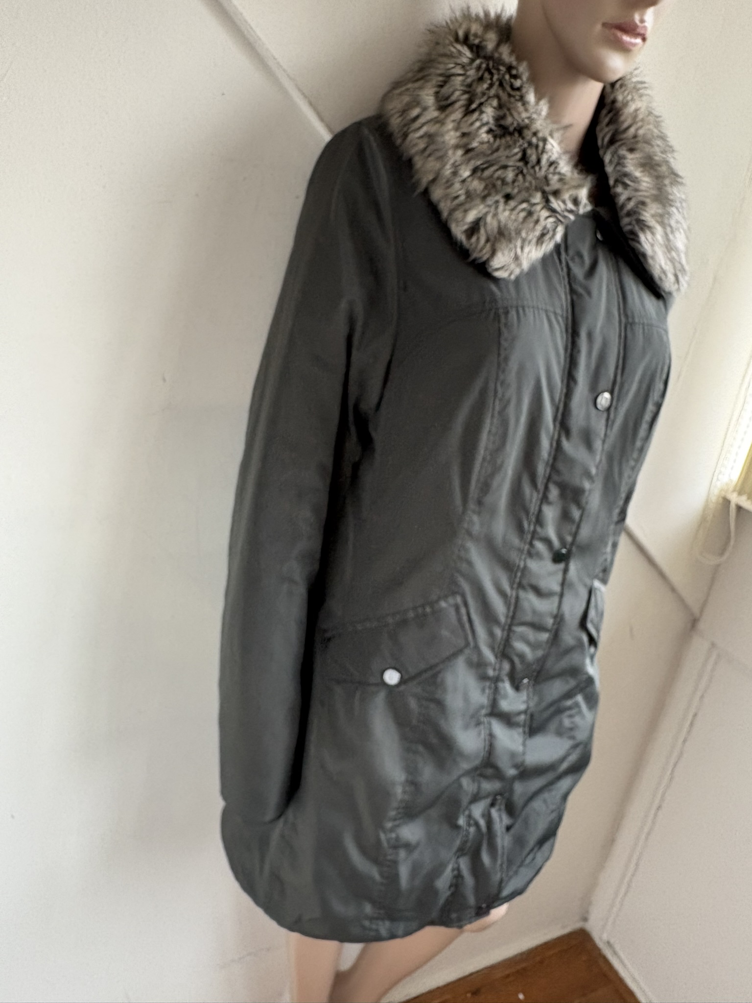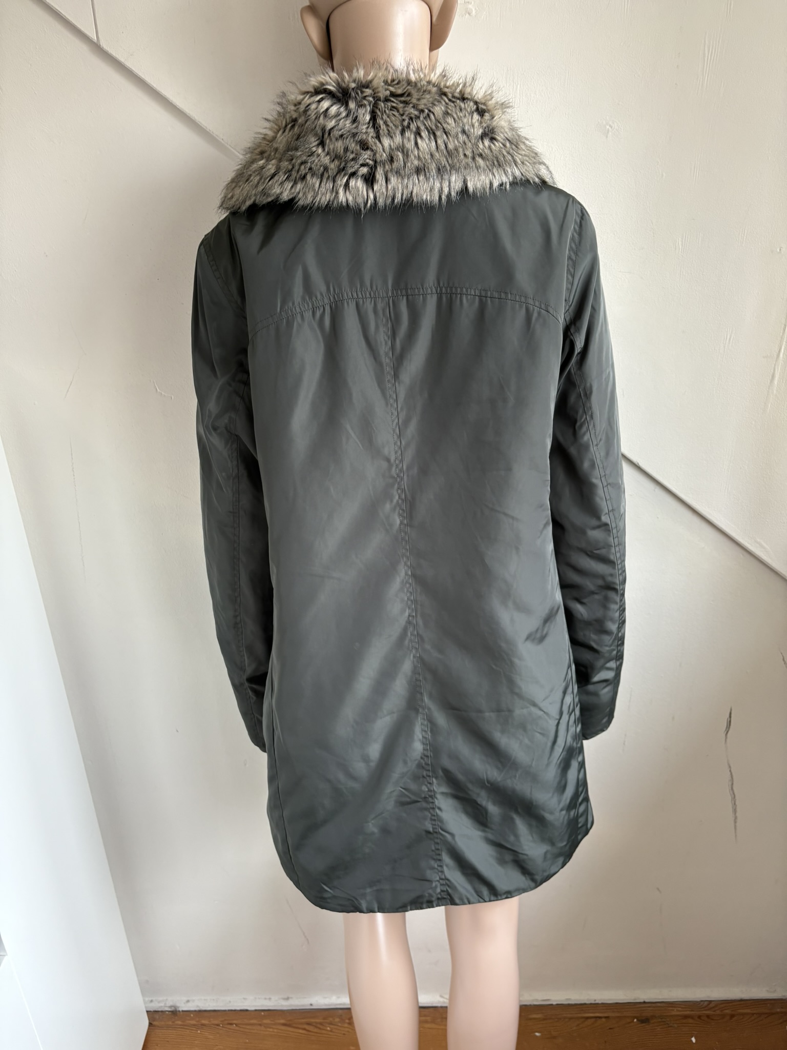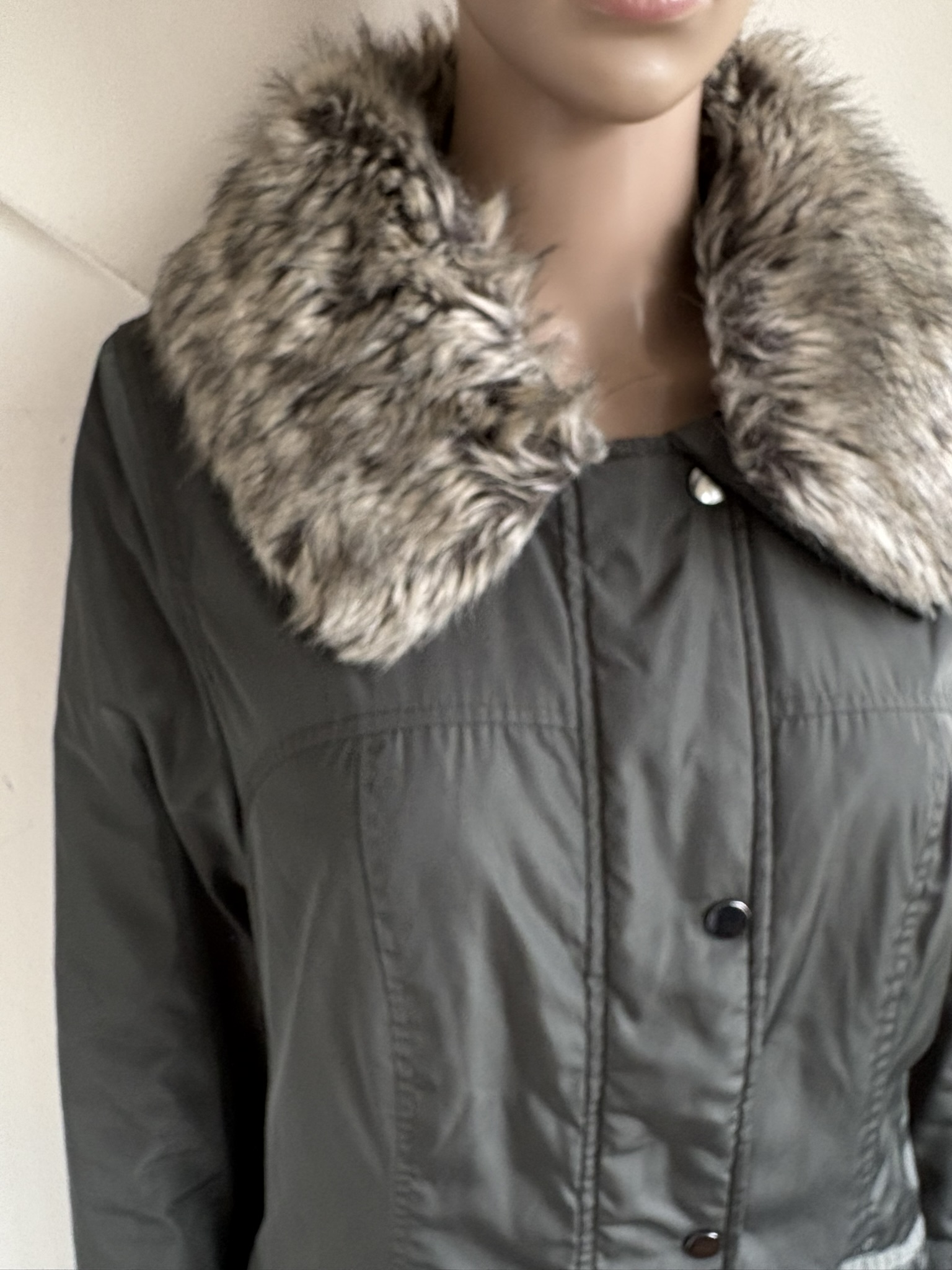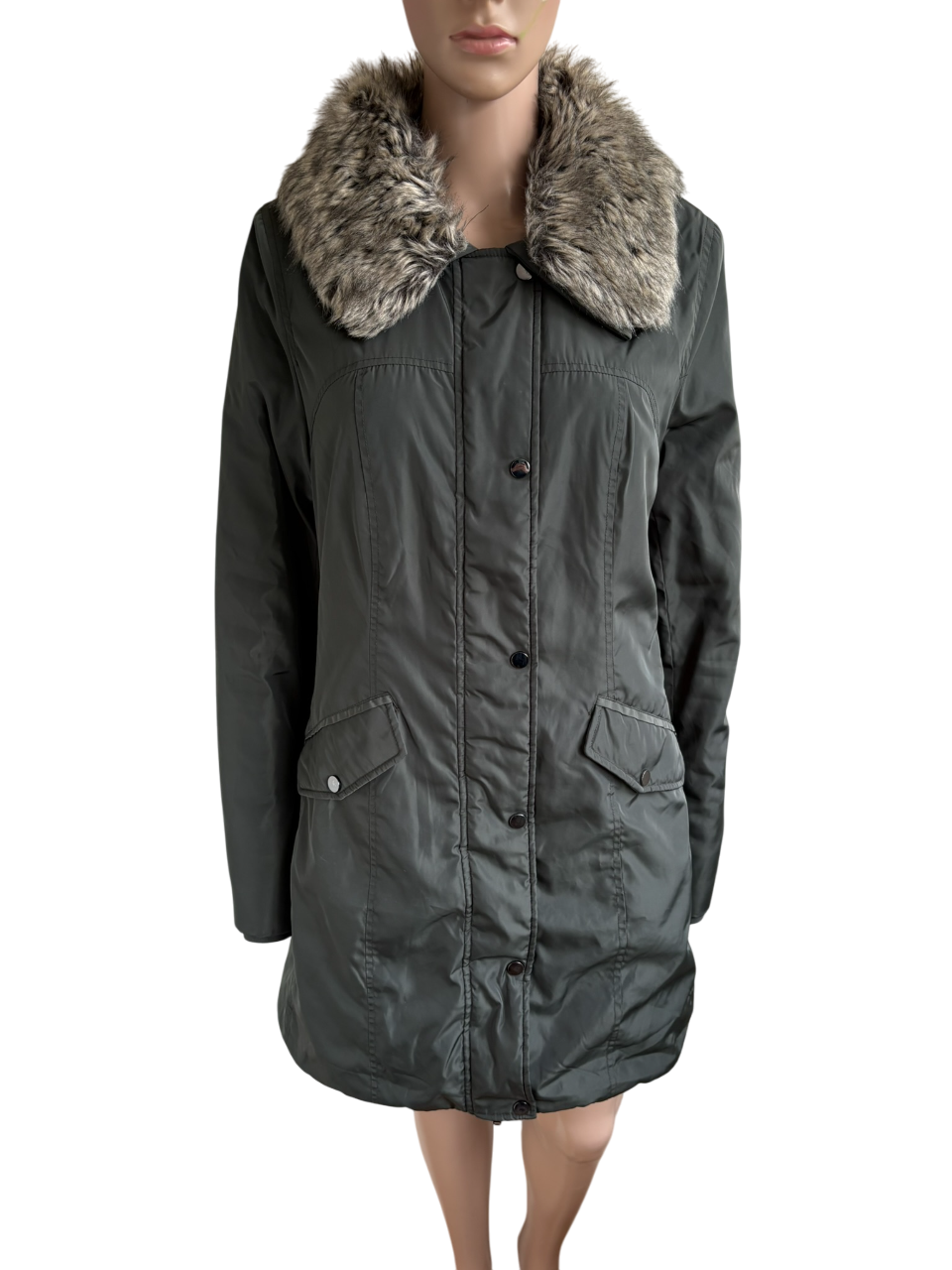 Groen khaki middellange winterjas met afneembare faux-fur kraag in de maat L 40/42. Gemaakt van polyester en de voering en details ook van polyester. Oksellengte is 53 cm en lengte is 85 cm.