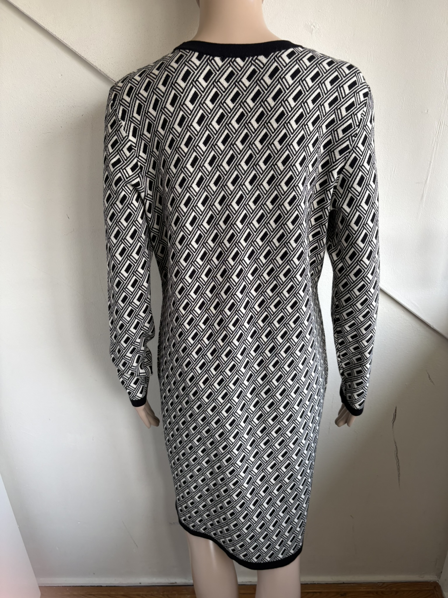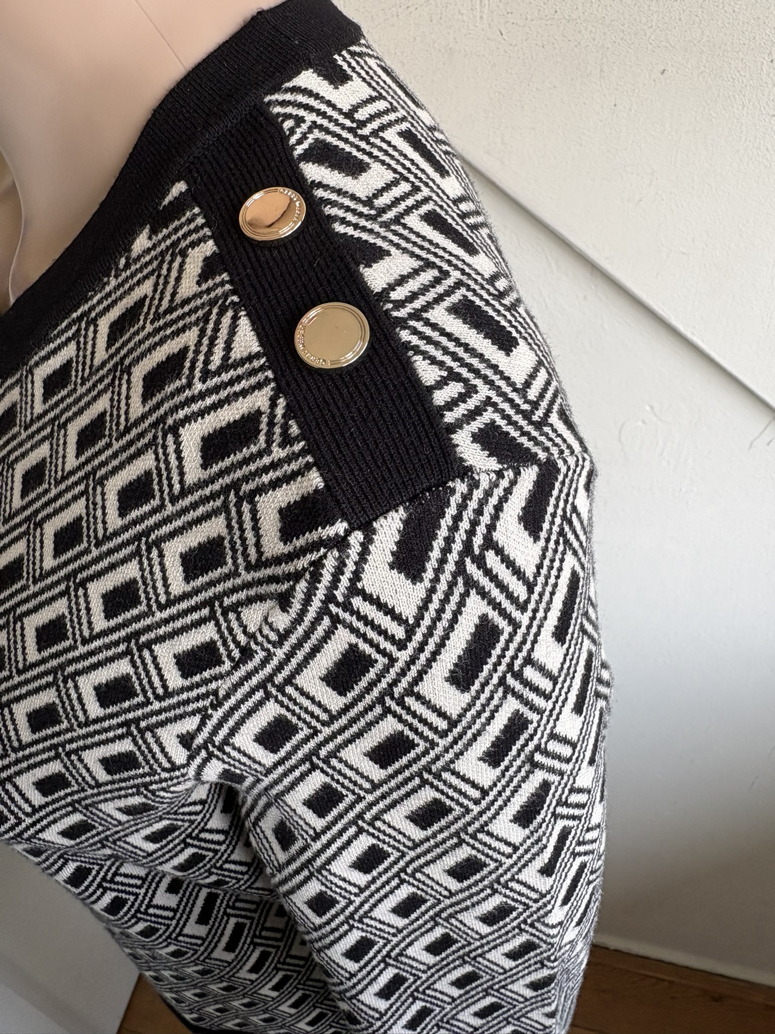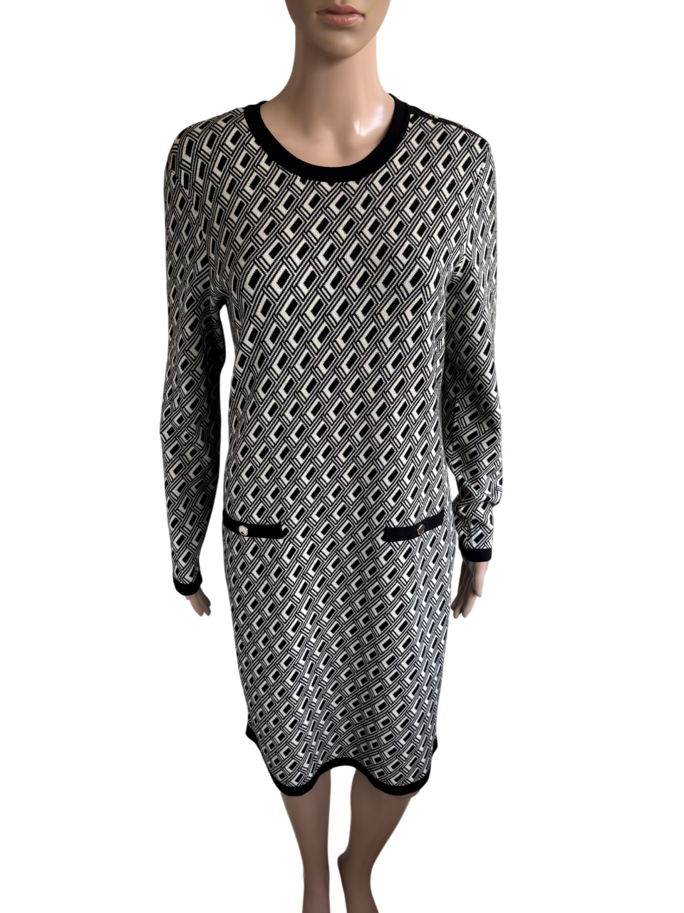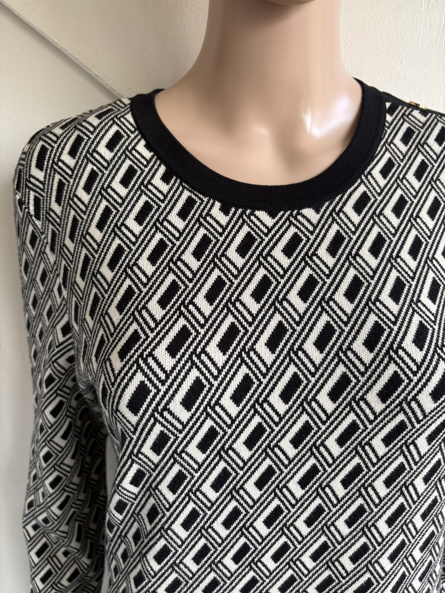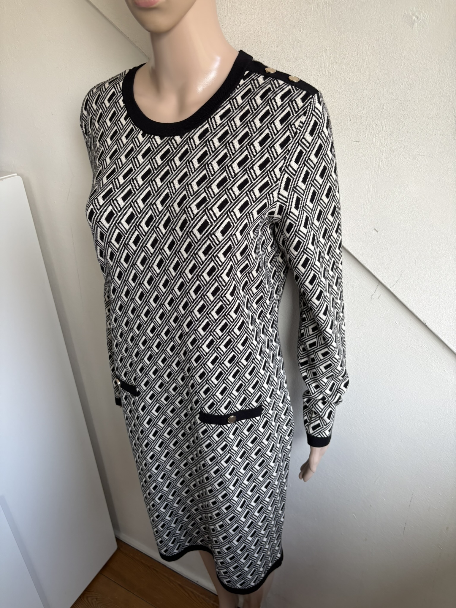 Winterjurk met zwart en witte print en goudkleurige knopen op de zakjes en de schouders in de maat 40. Oksellengte 50 cm en lengte 94 cm.