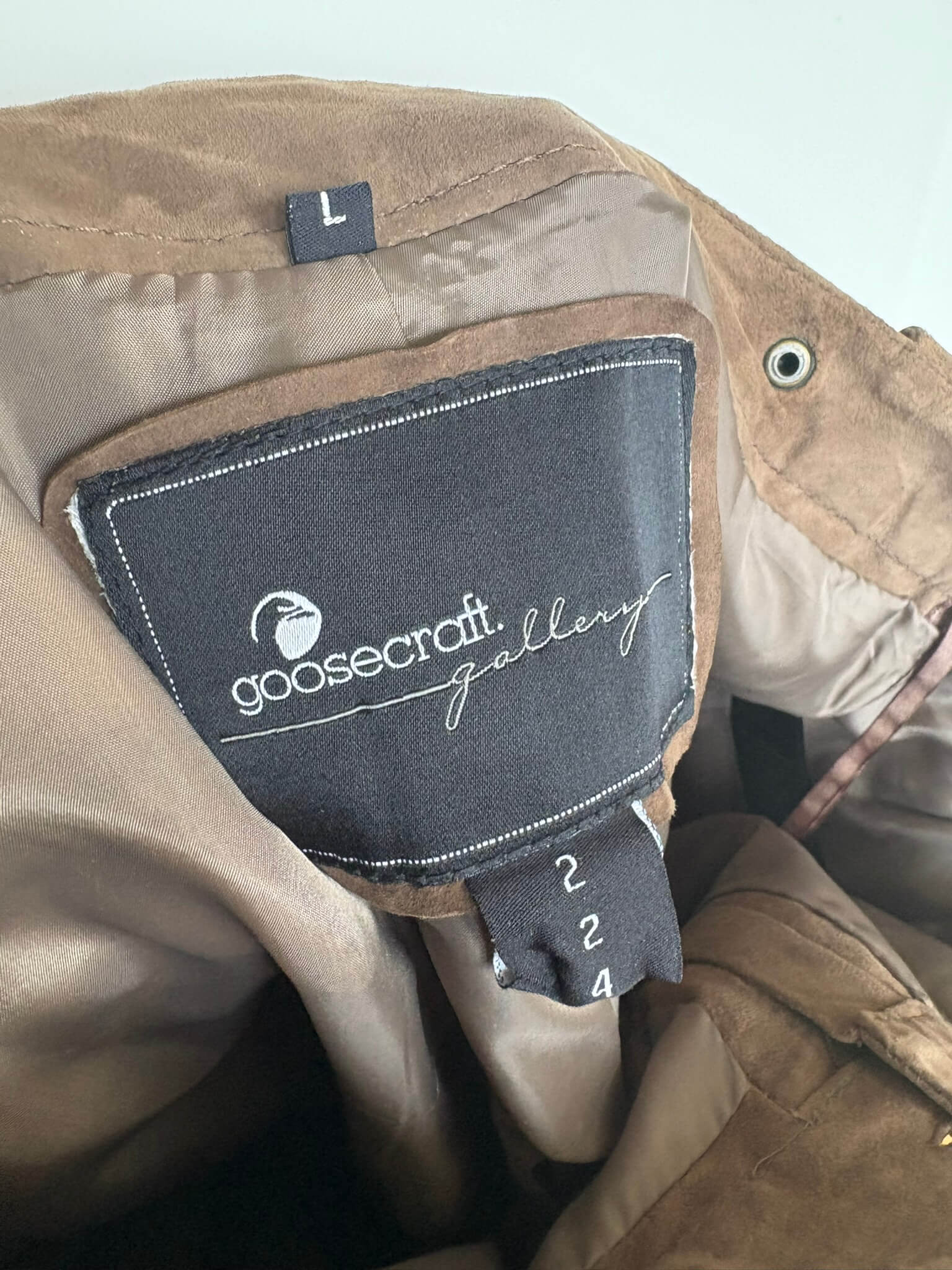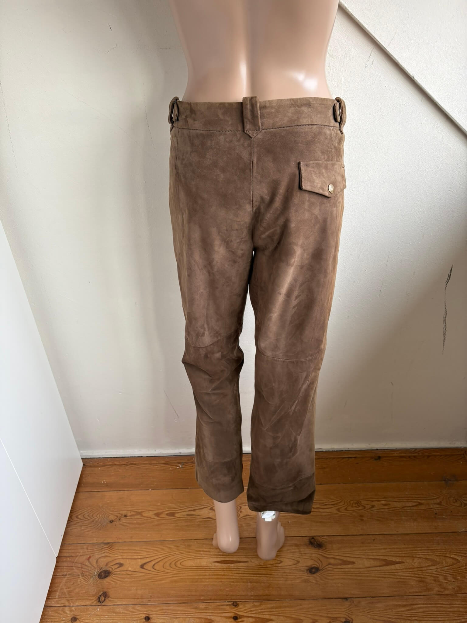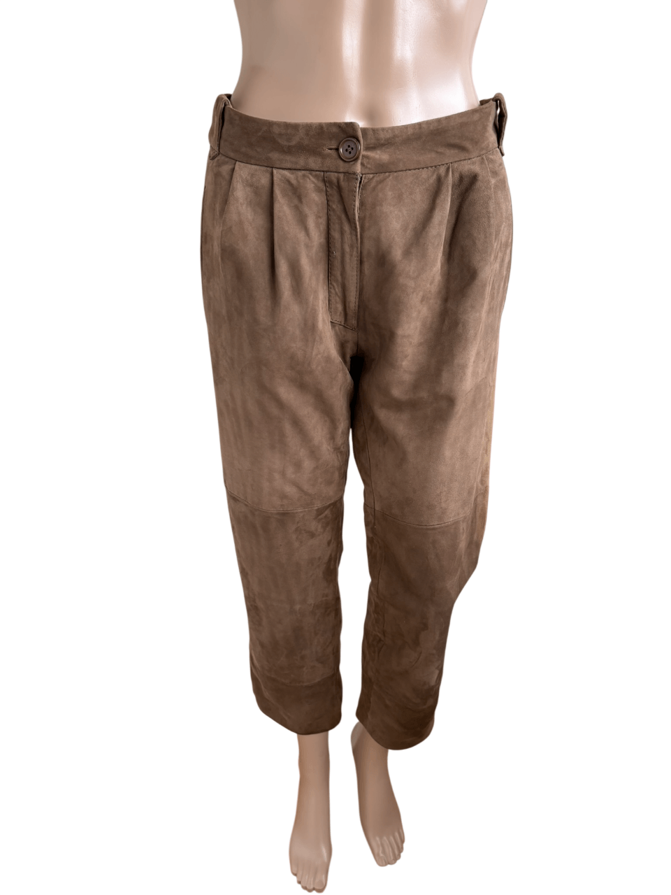 Bruine suede leren 7/8 broek in de maat L. Taillewijdte 46 cm en lengte 89 cm. Gemaakt van leer.