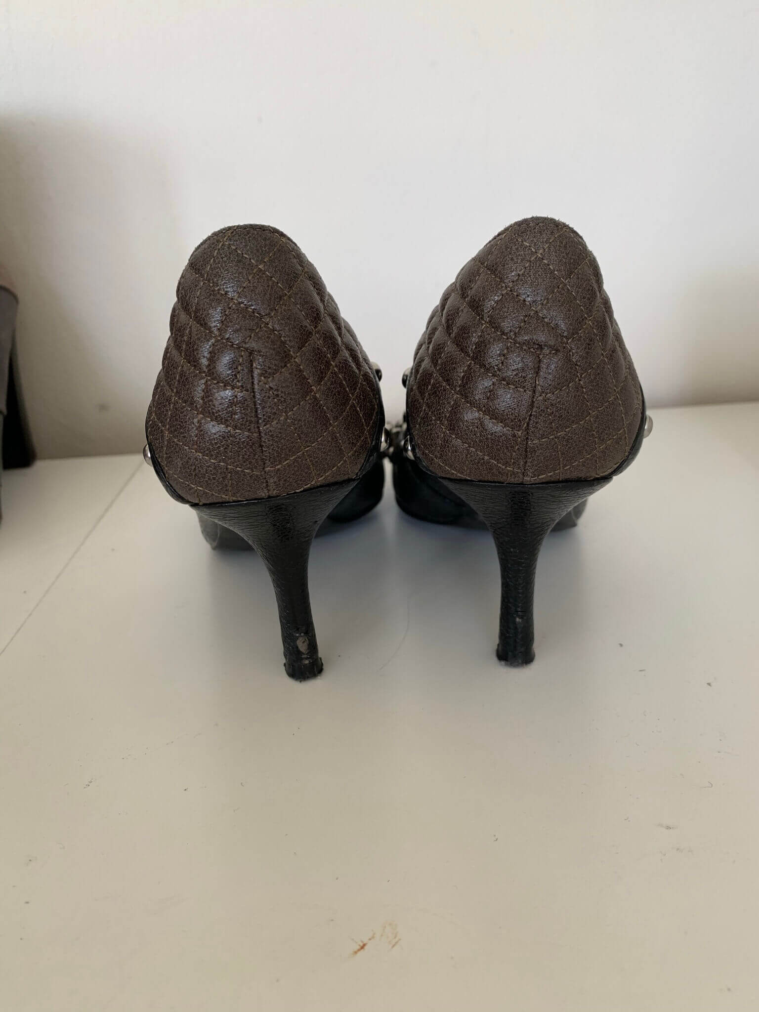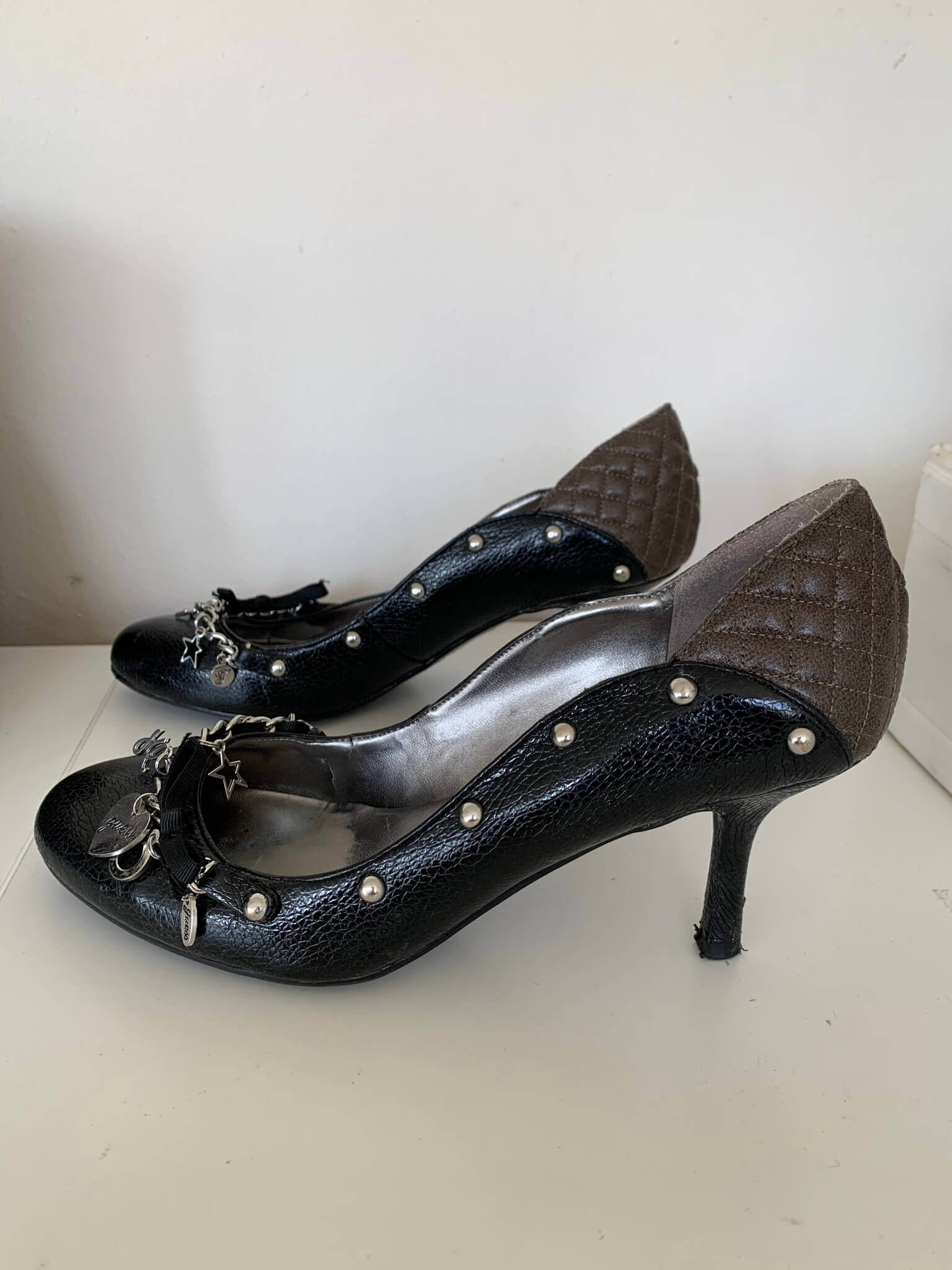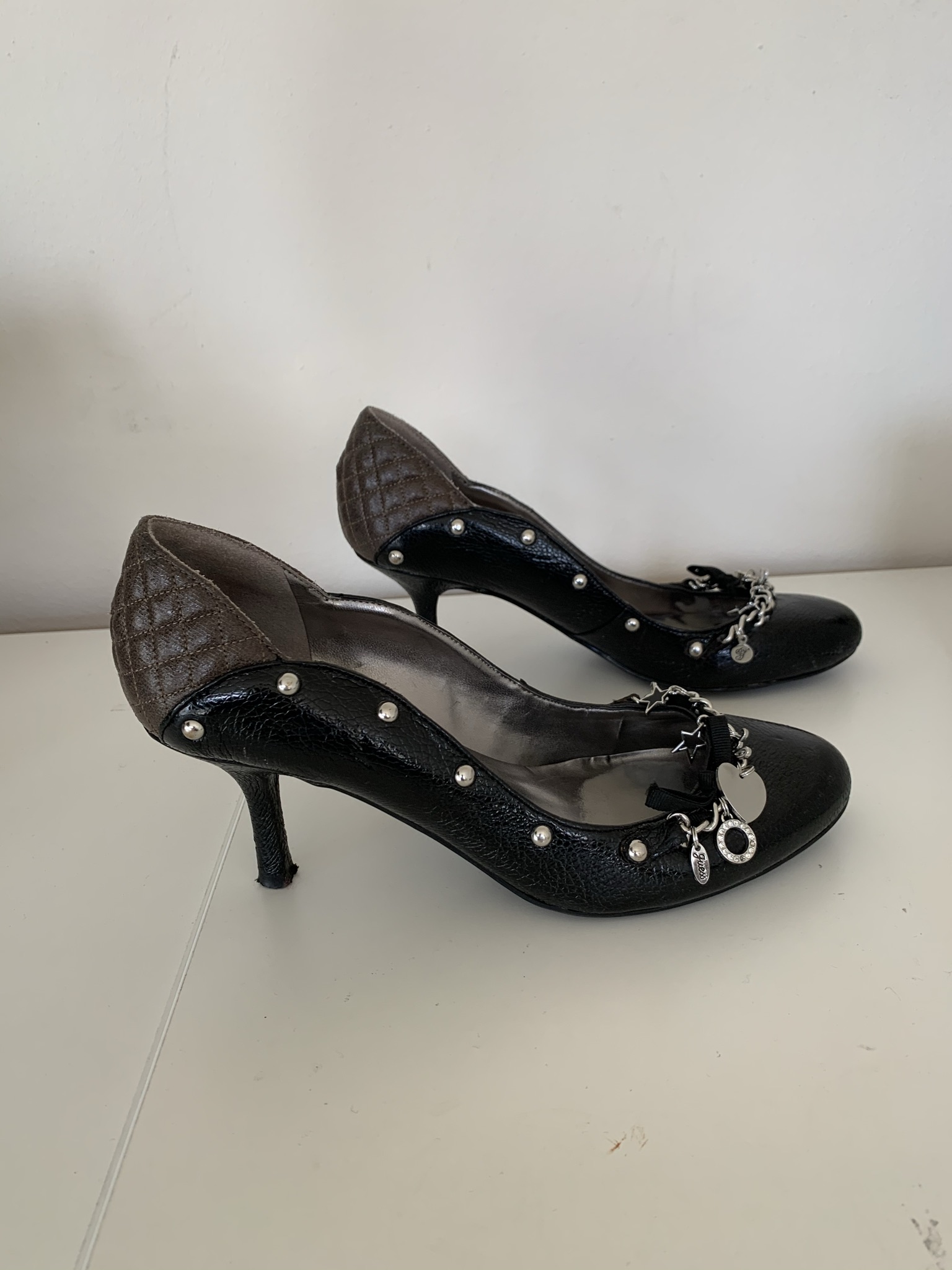 Gave zwarte en bruine leren pumps , aan de voorzijde bedeltjes, in de maat 39. Veel leuke details, en hakhoogte is 7,5 cm.