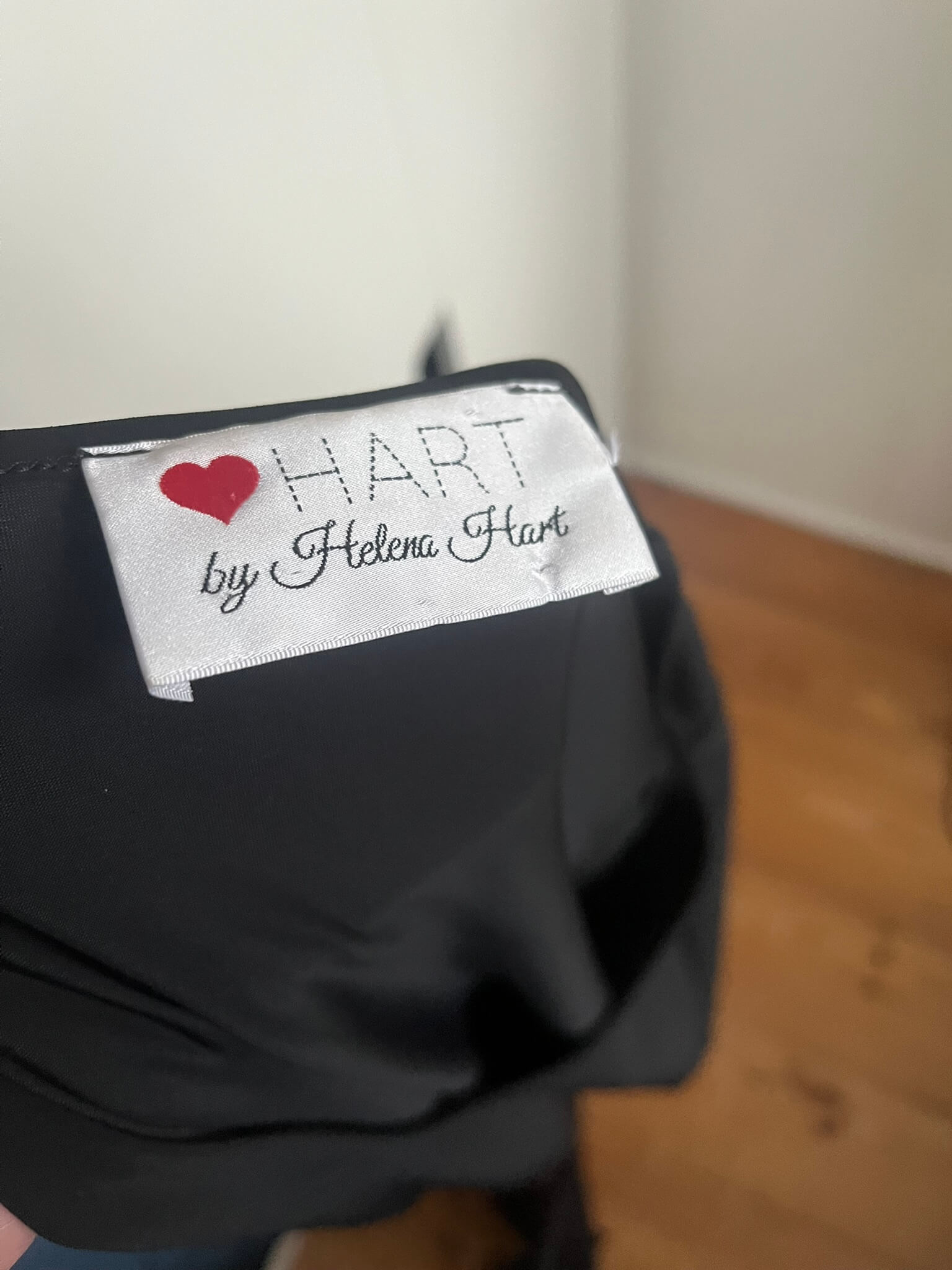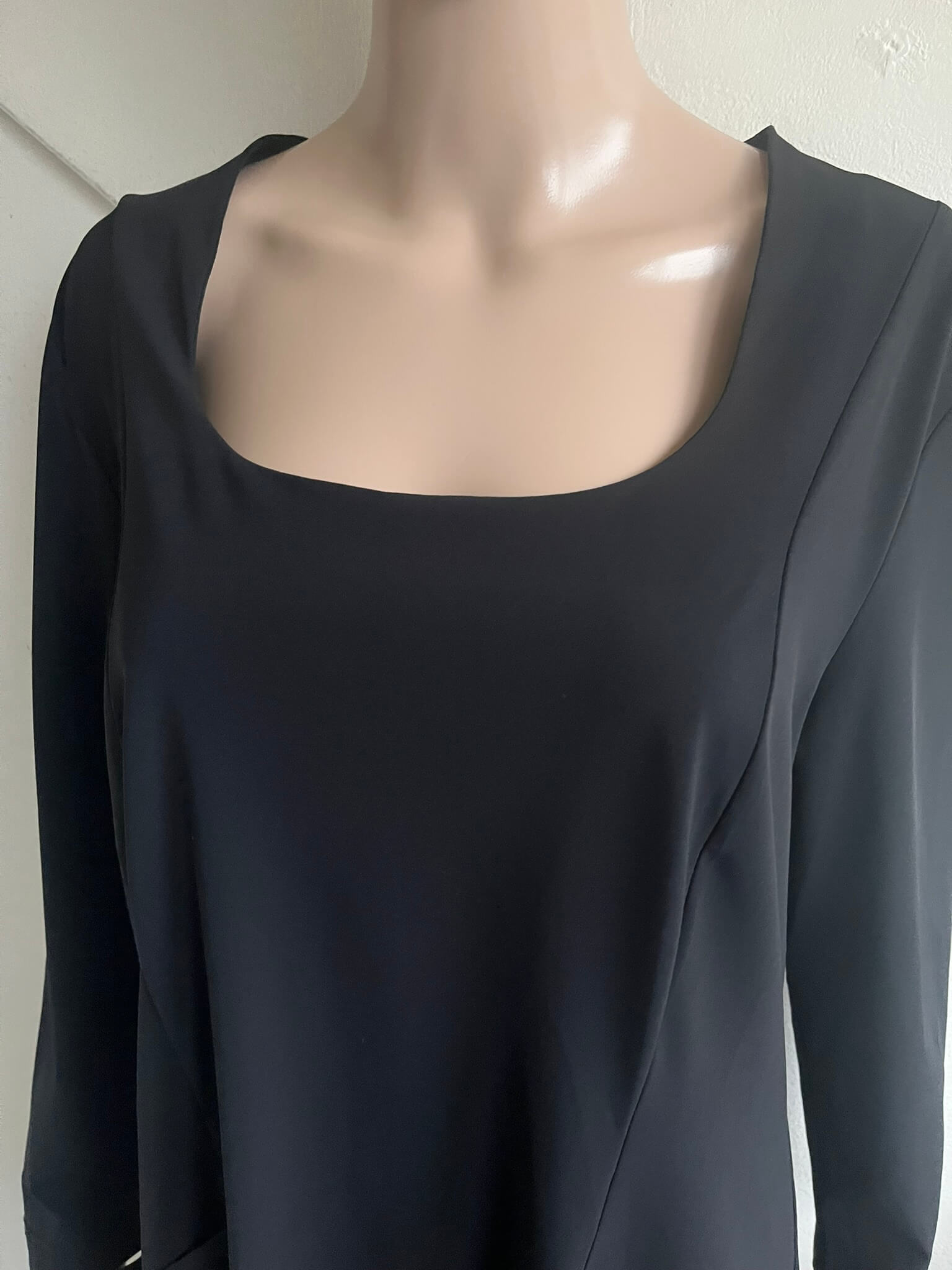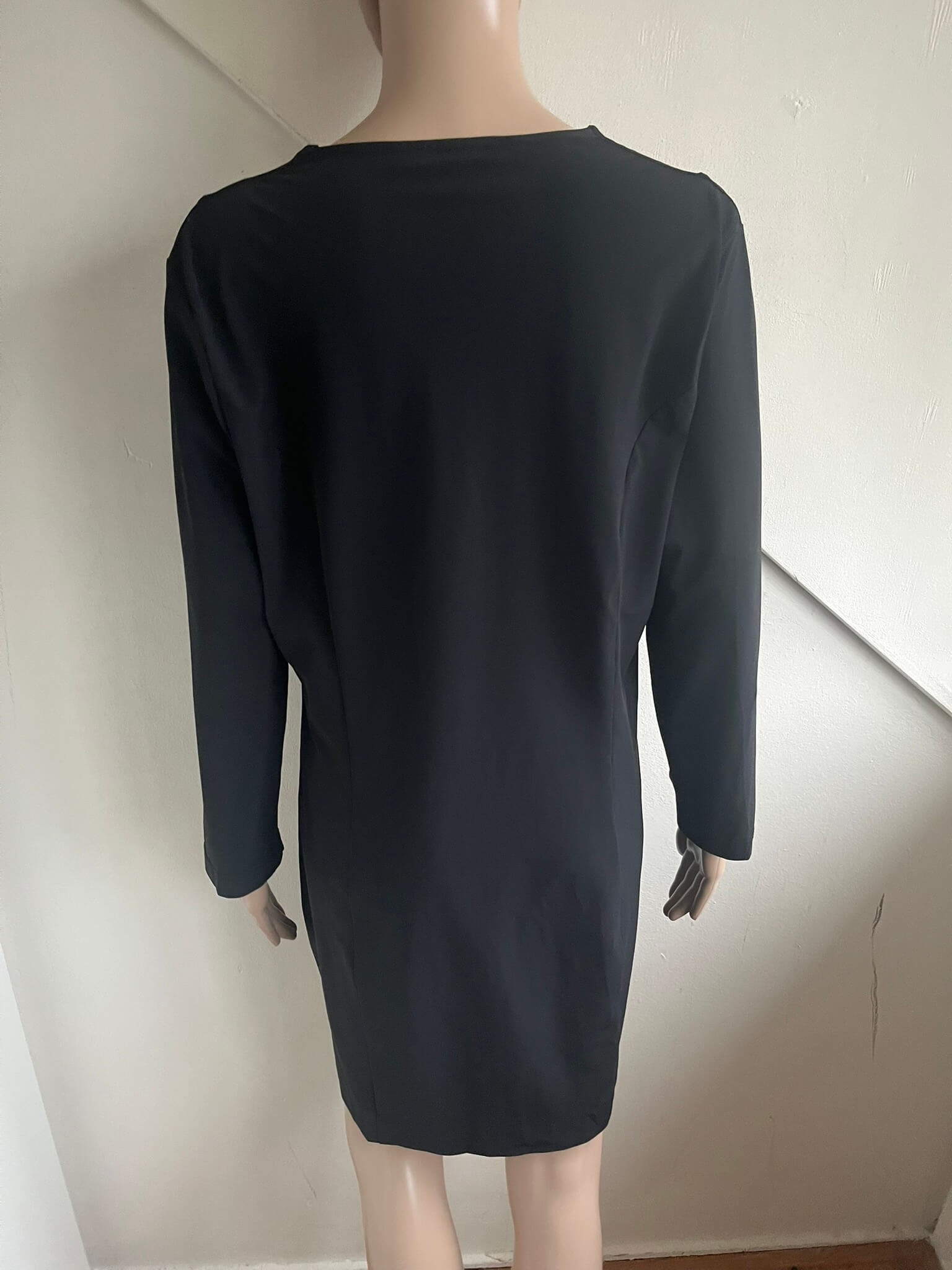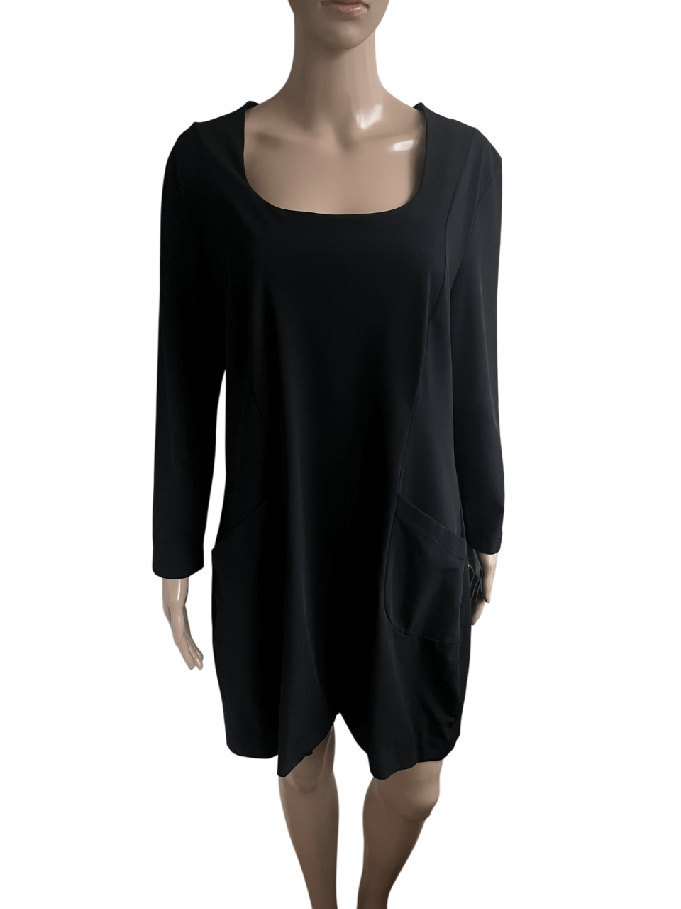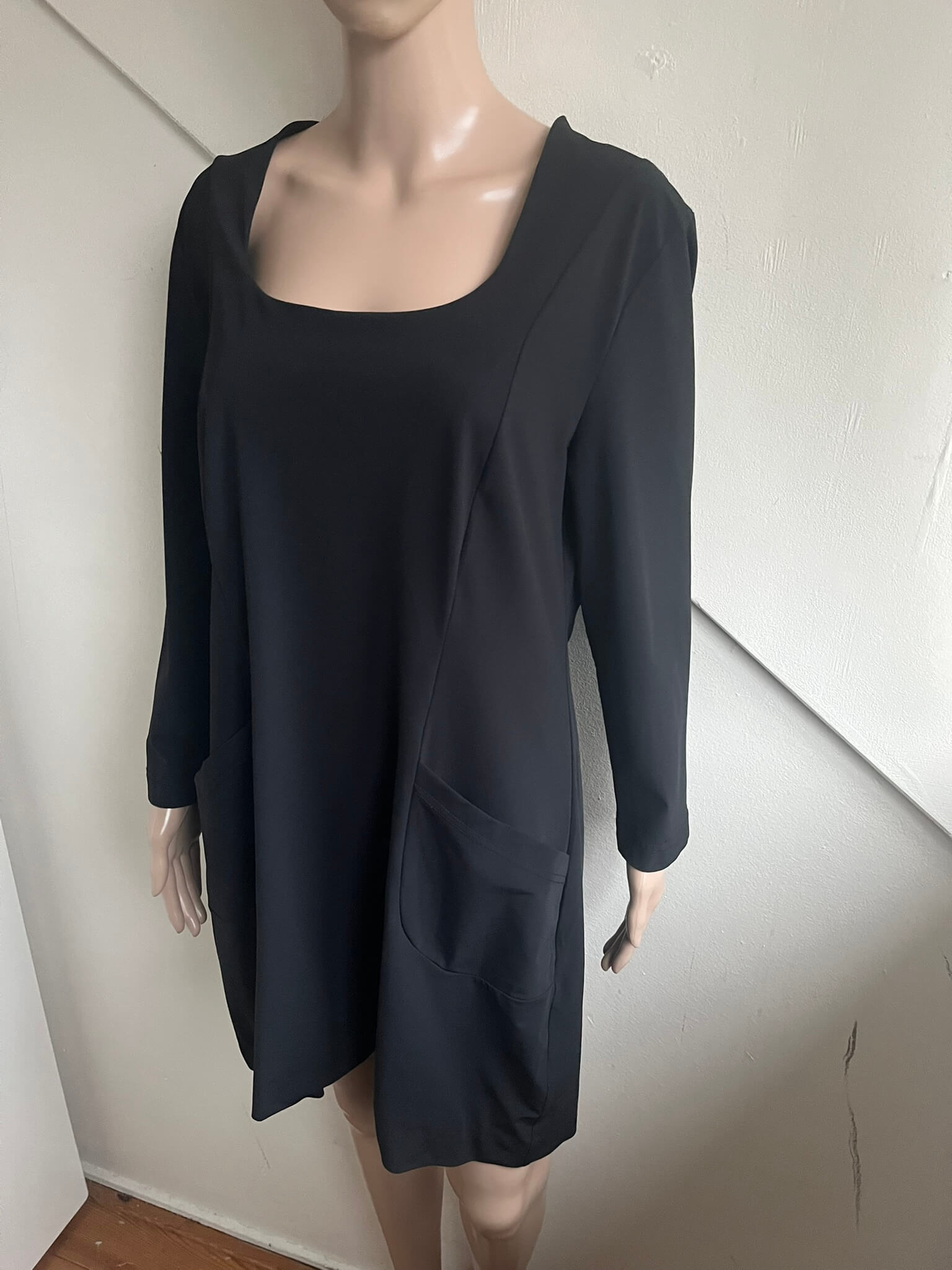 Zwarte travelstof jurk met zakken voorzijde en een vierkanten kraag in de maat M. Gemaakt van polyamide en elastaan. Oksellengte 49 cm en lengte 87 cm.