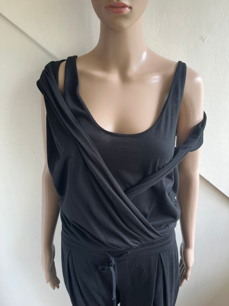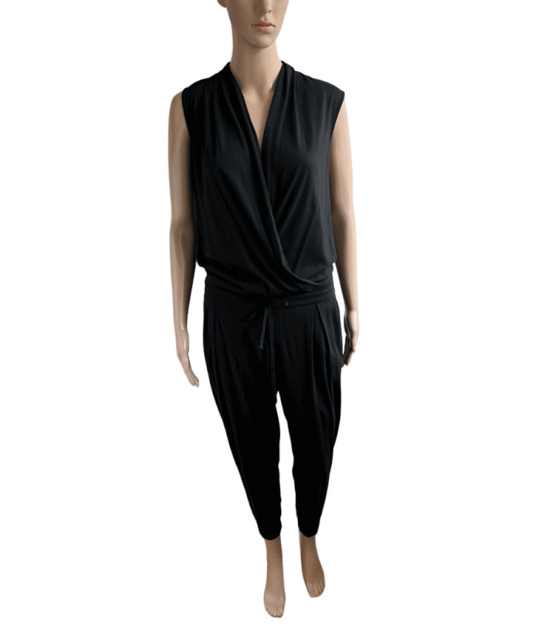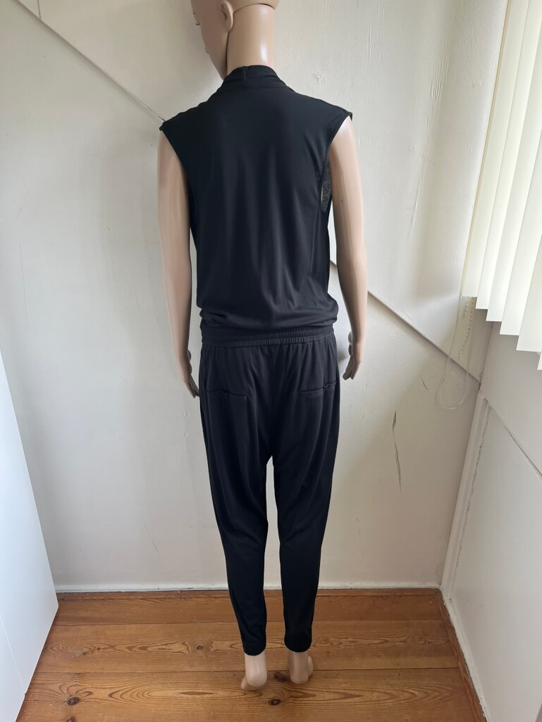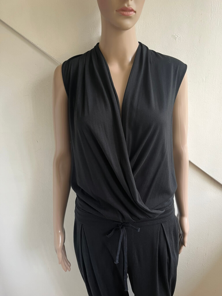 Zwart mouwloos jumpsuit met aansnoerriempje bij taille in de maat 36. Bovenzijde zit een hemdje aan t jumpsuit vast (zie foto). Gemaakt van modal en katoen. Oksellengte 46 cm en lengte 138 cm.