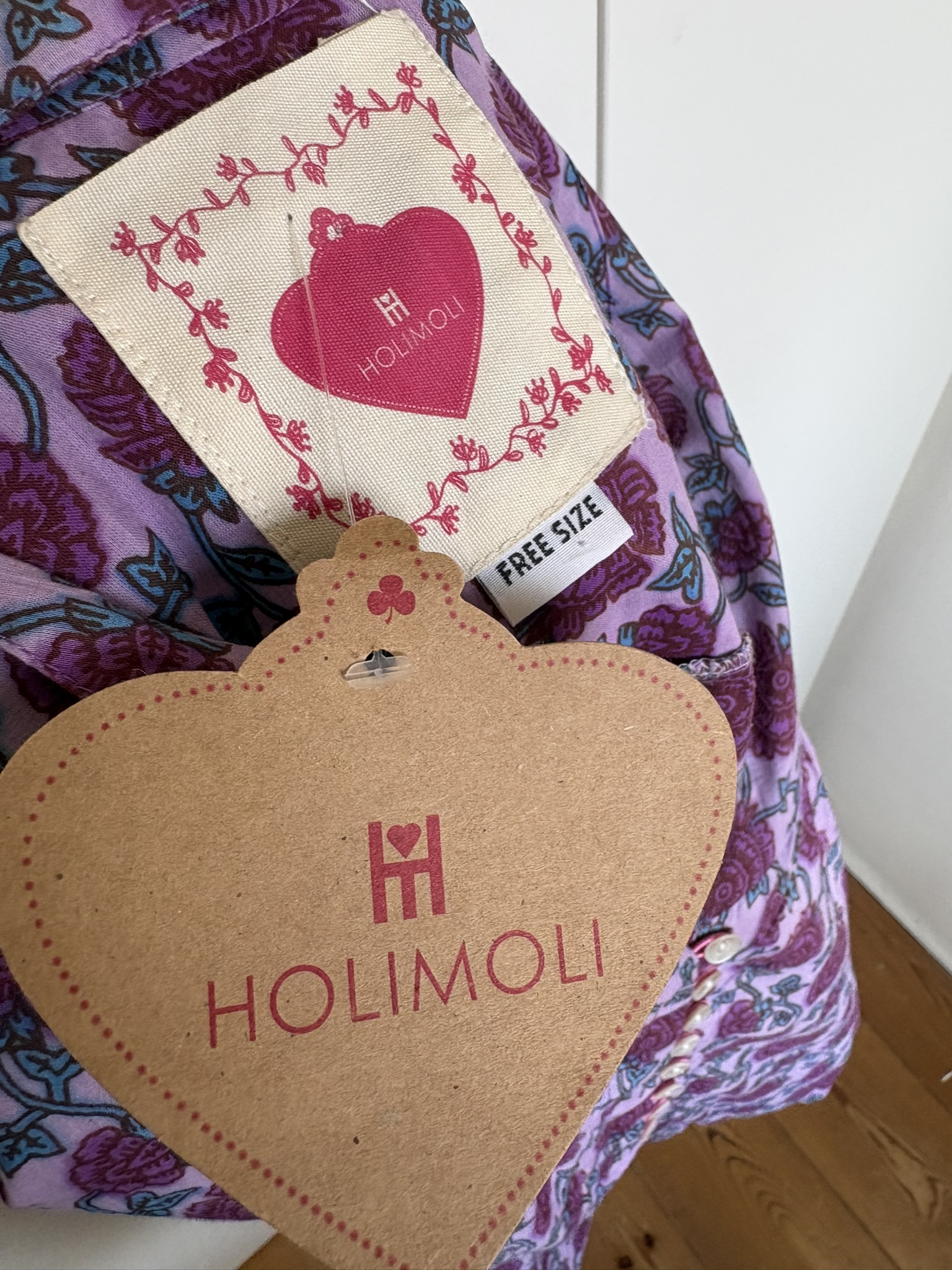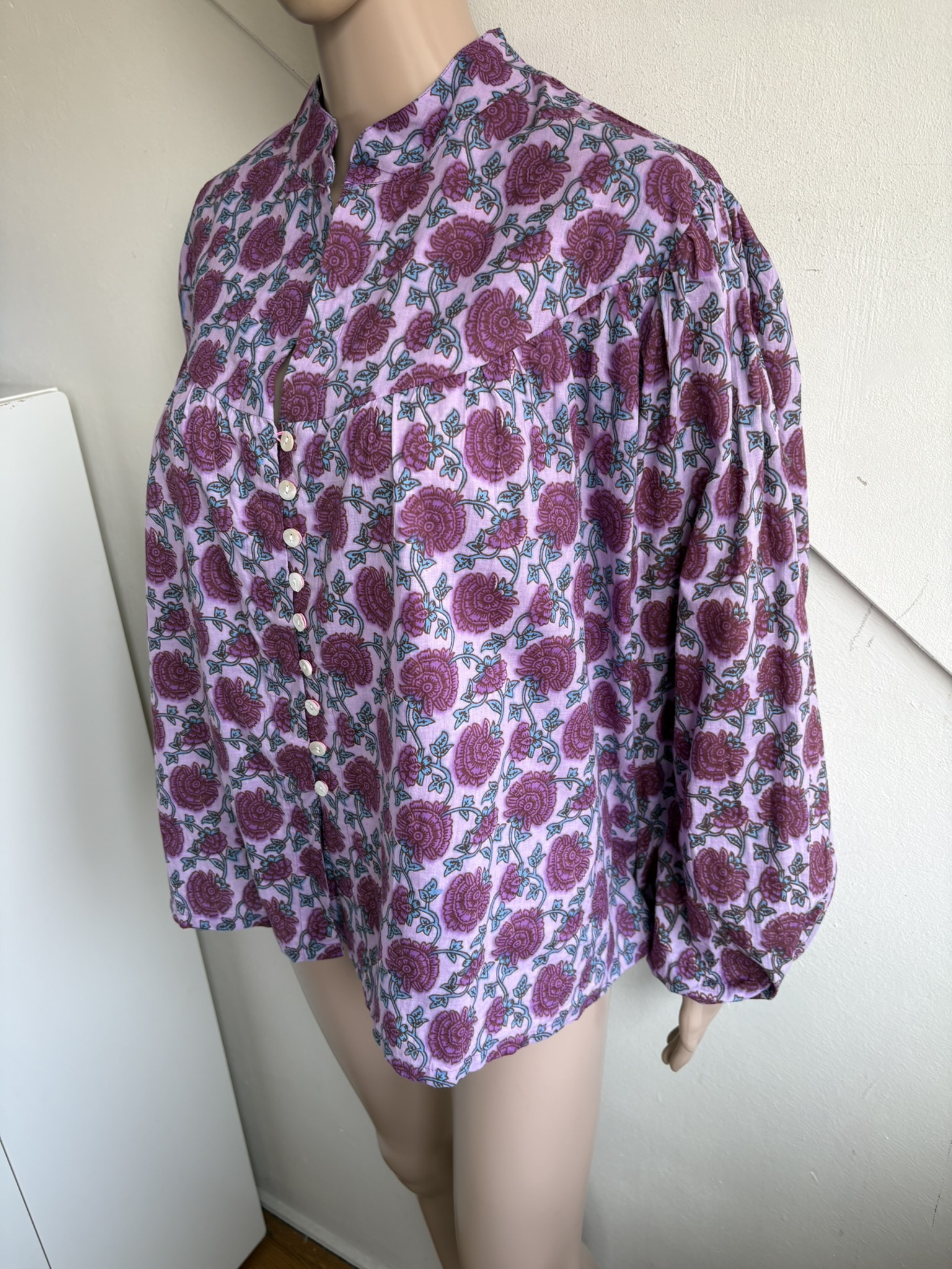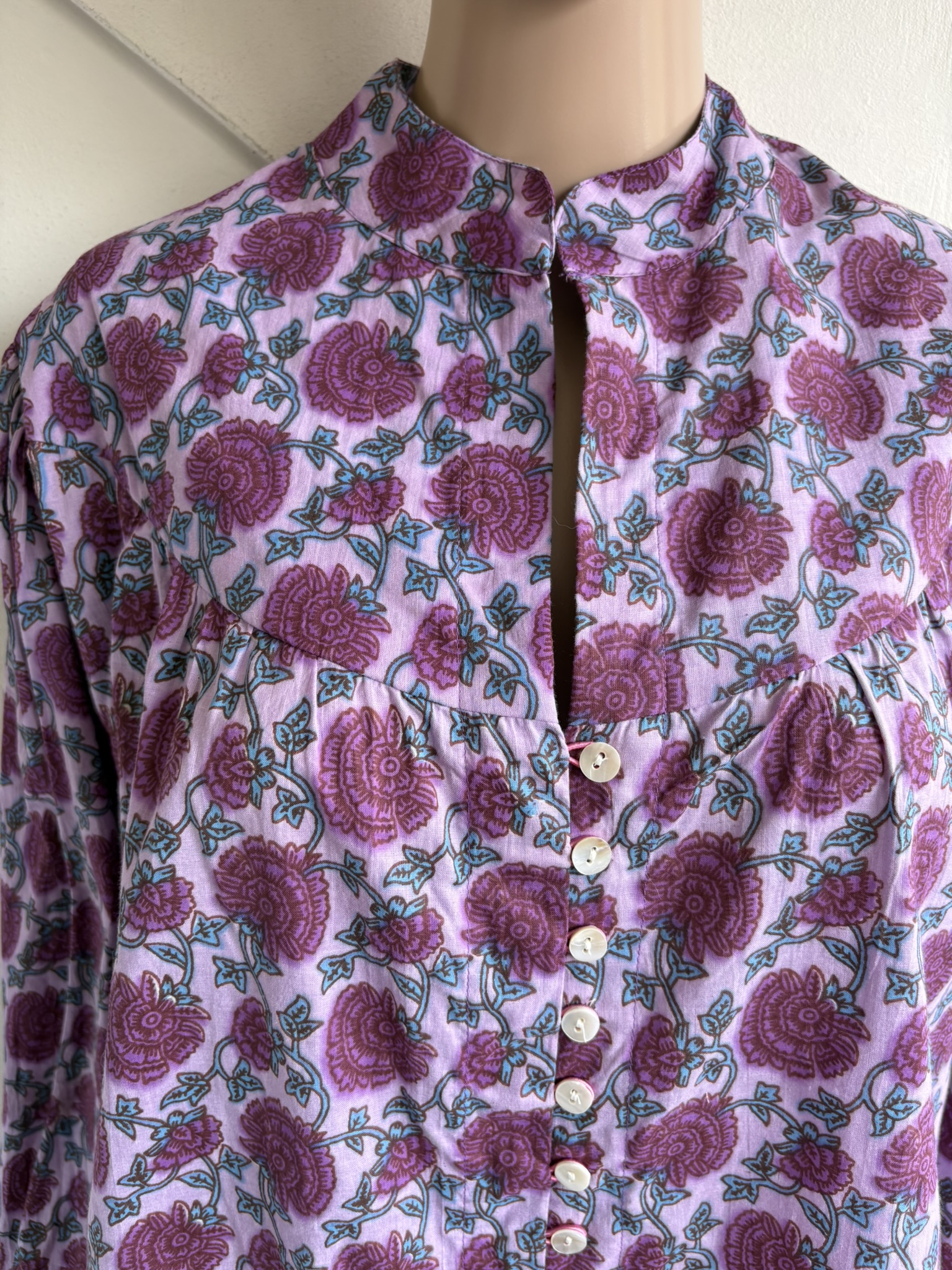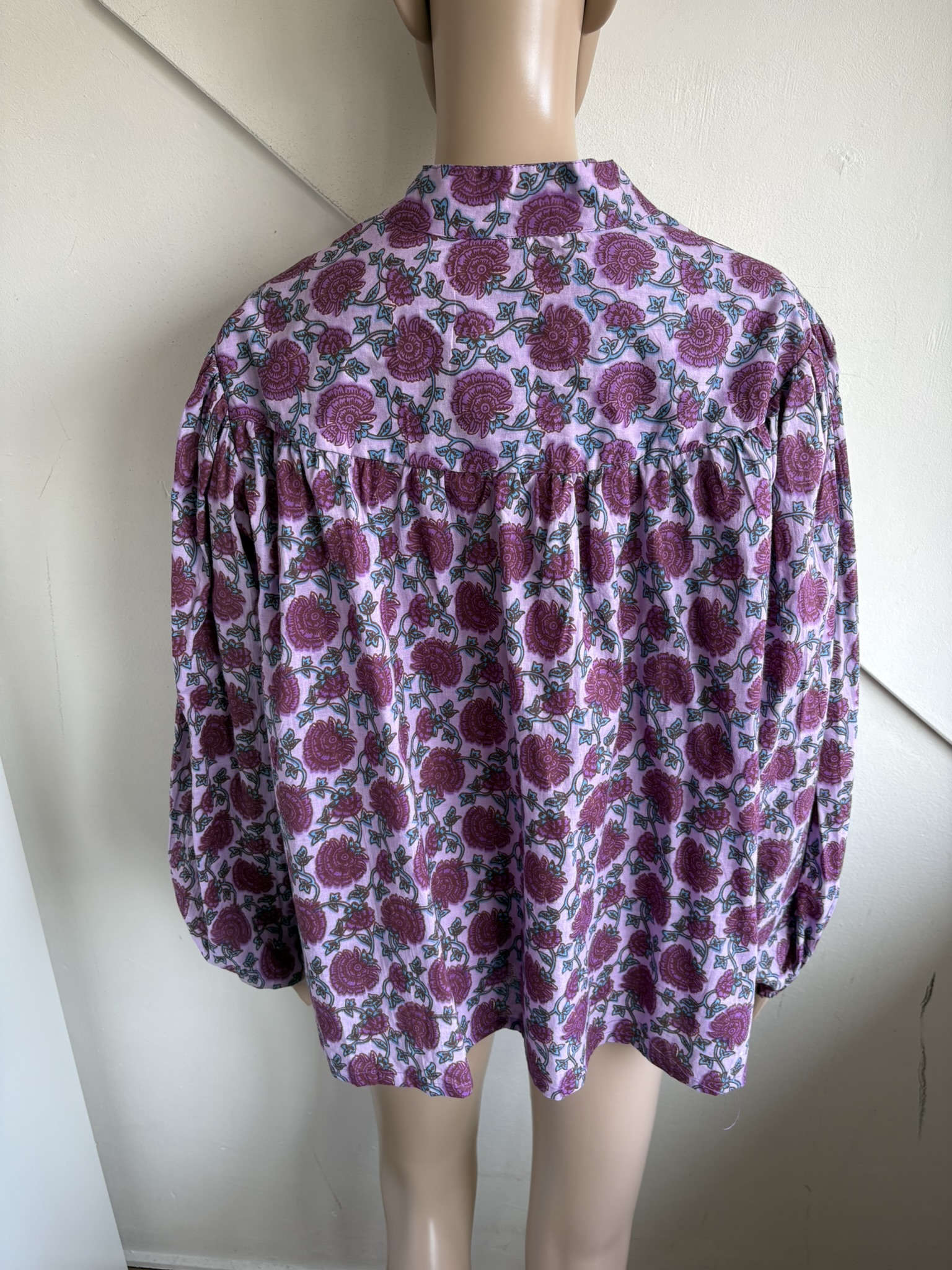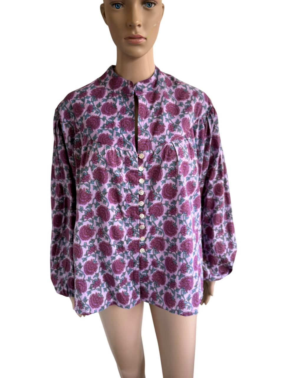 Nieuwe roze boho blouse met paars en blauwe bloemenprint in de maat universeel. Oksellengte is 65 cm en lengte 70 cm.