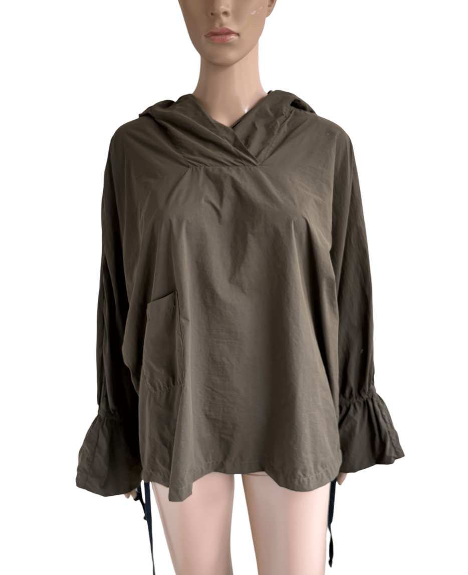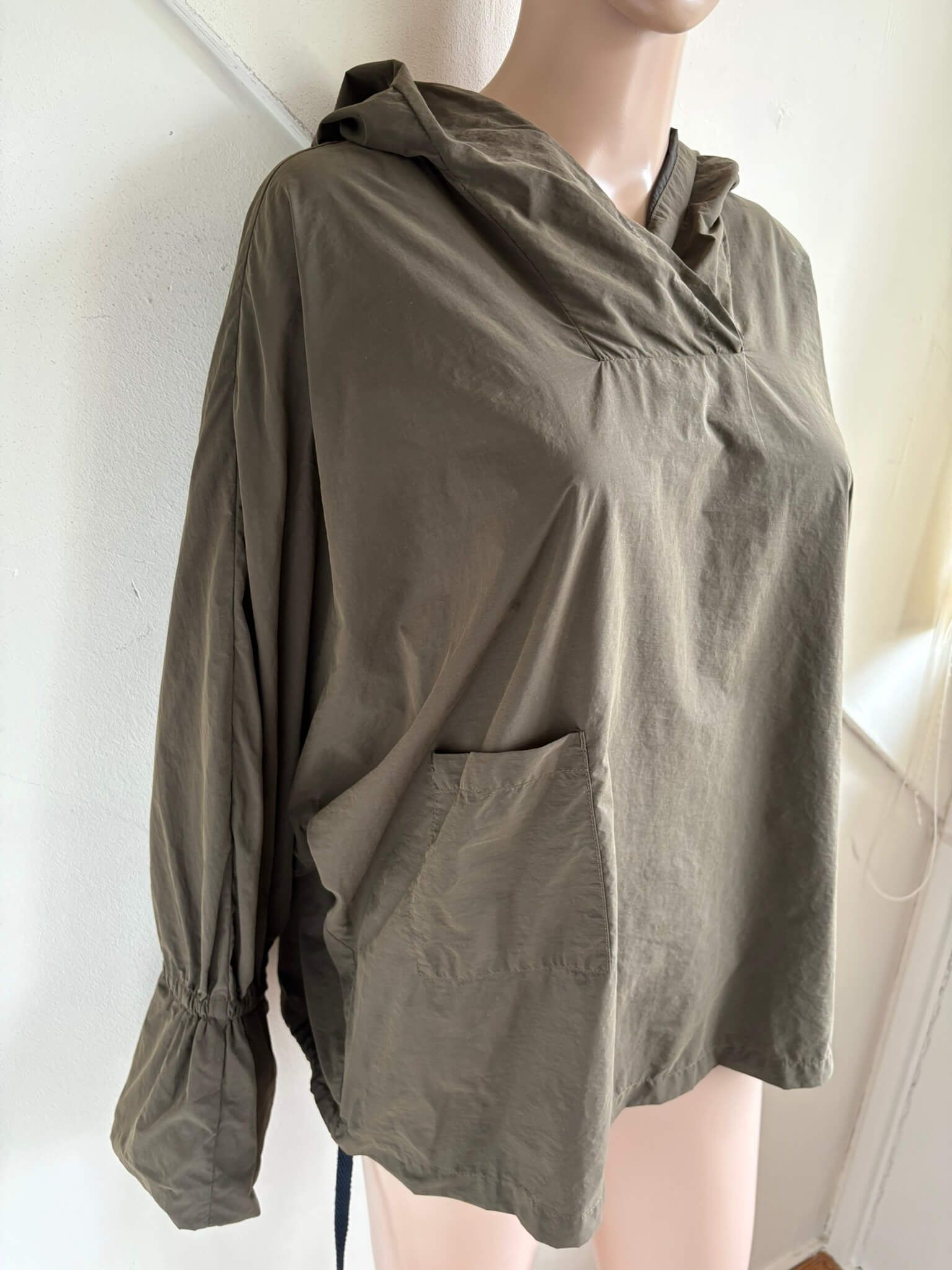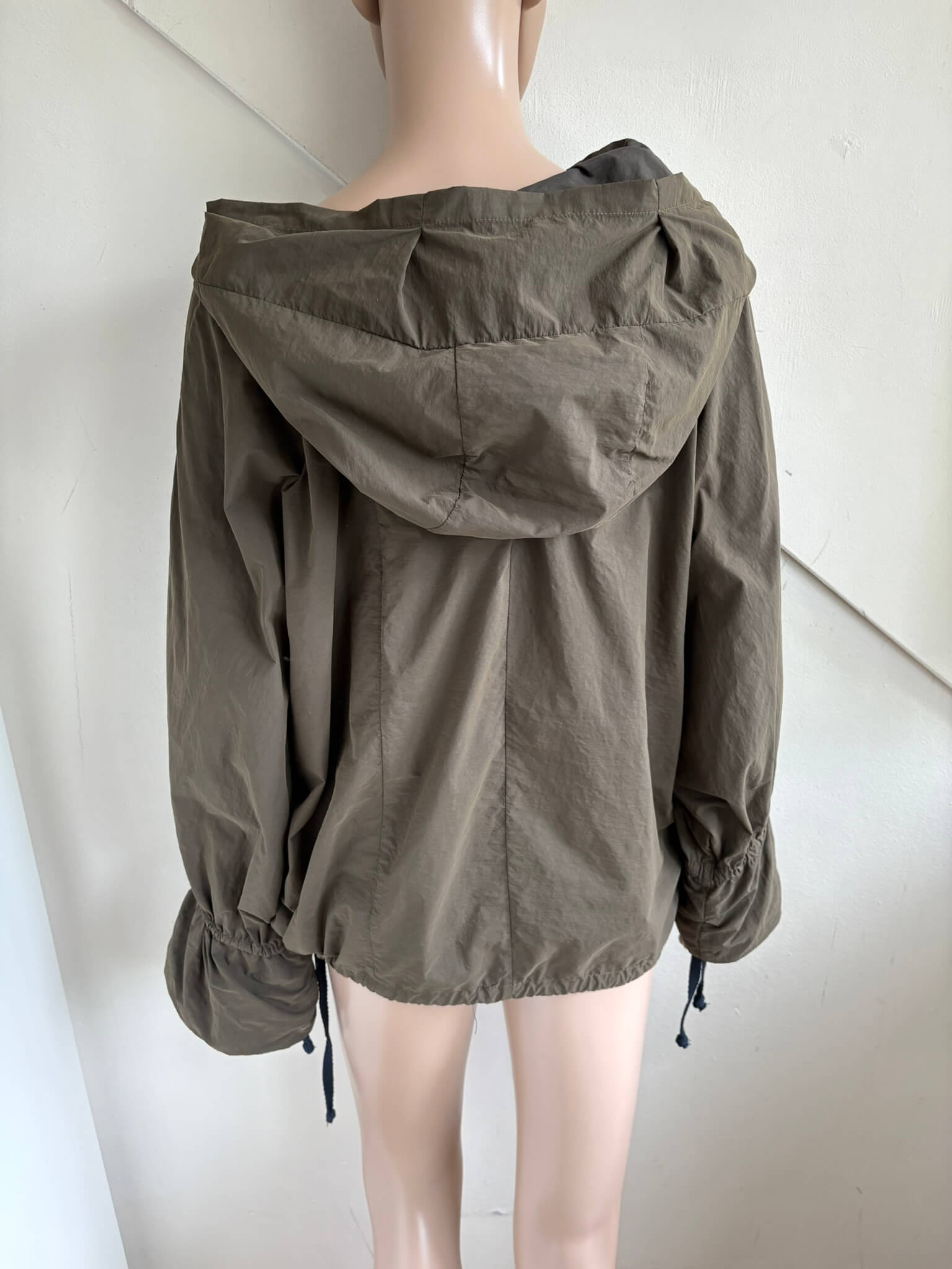 Dunne bruine/ khaki hoodie of nylon jasje met capuchon in de maat S, het jasje valt oversized dus een maat M zou ook prima kunnen. Gemaakt van 100% nylon. Oksellengte 69 cm en lengte 58 cm.