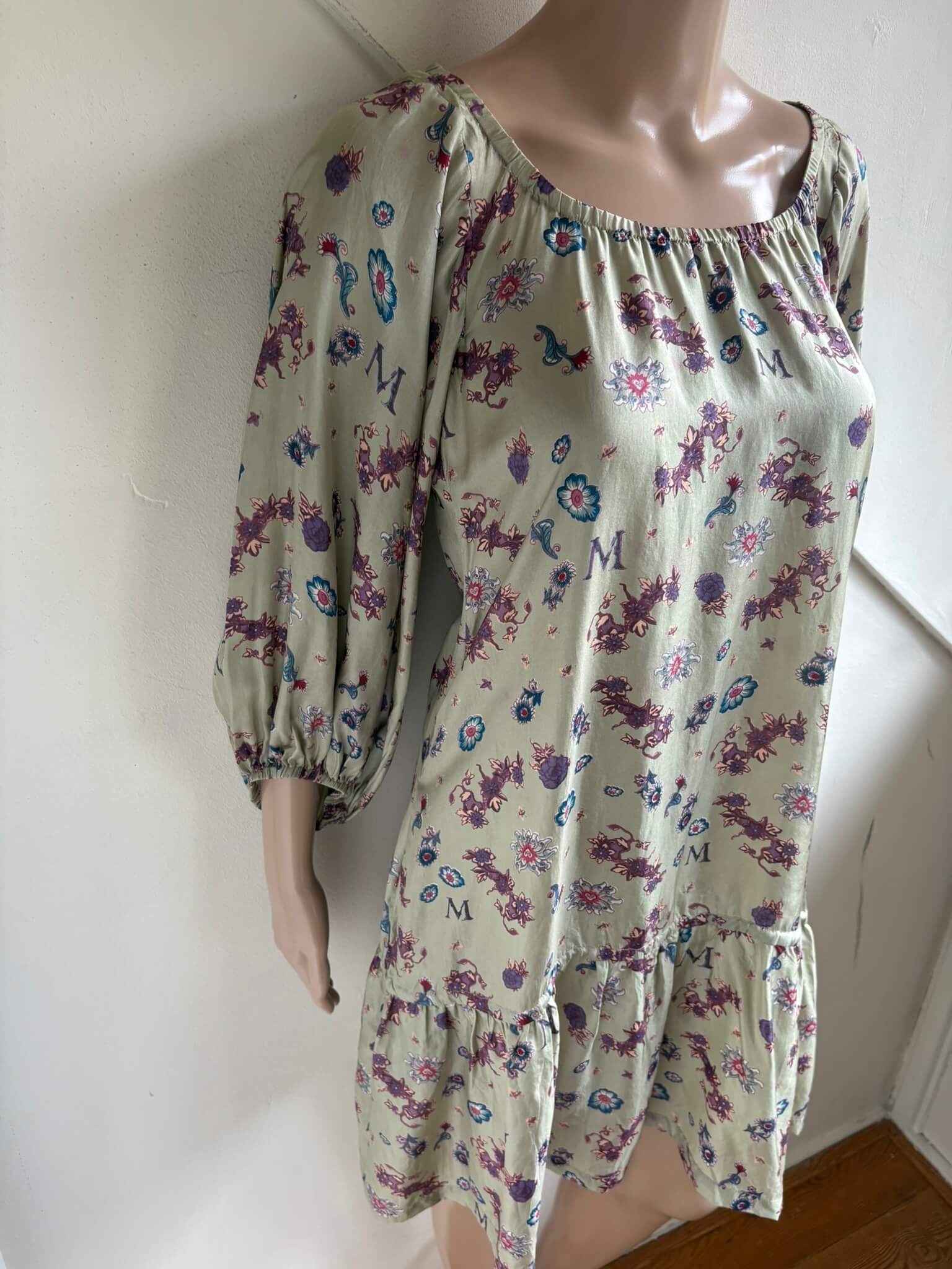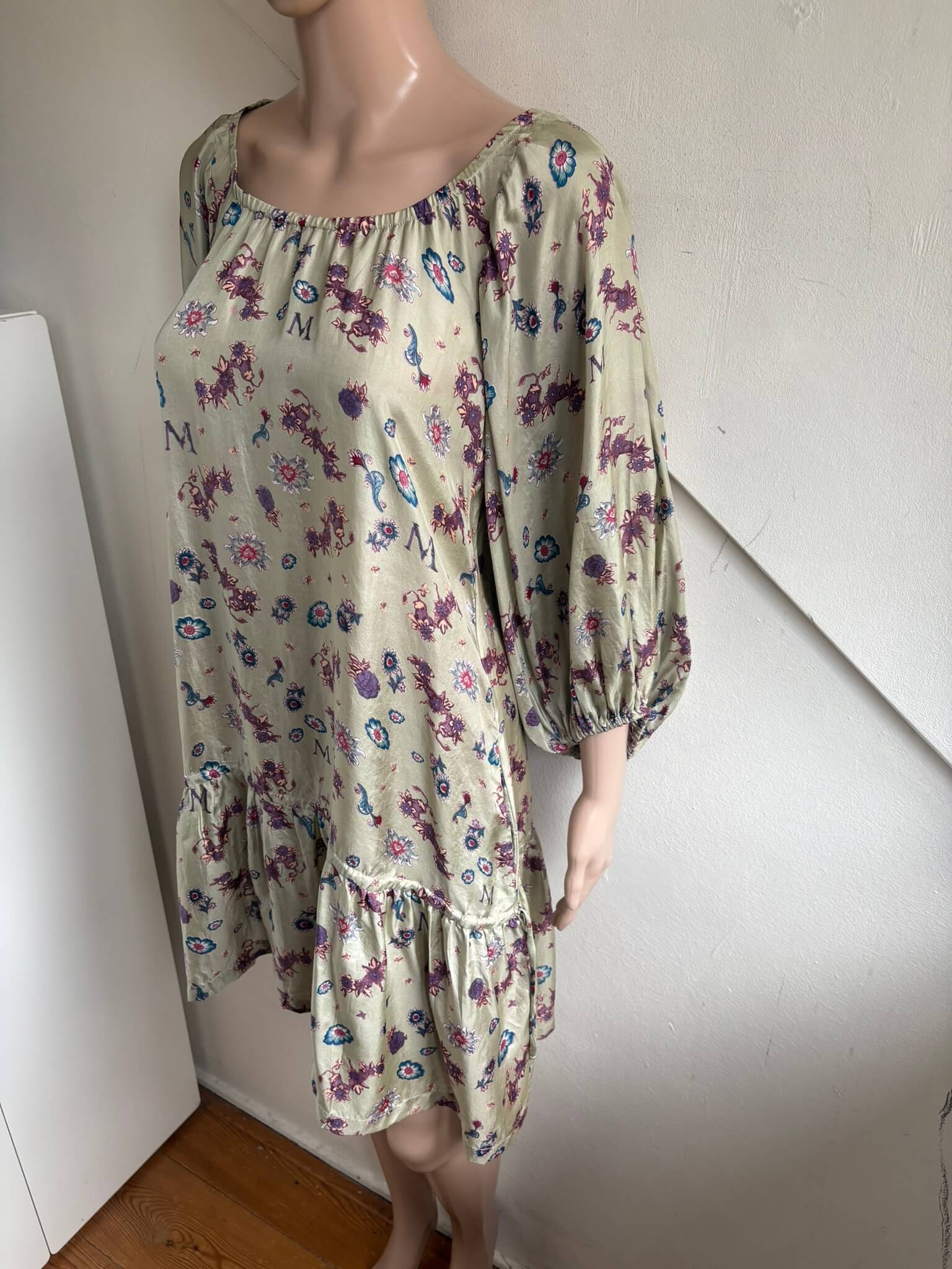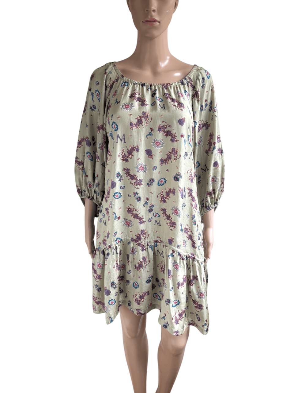 Zijden licht glanzende beige jurk met steekzakken en een paars blauwe print van bloemen etc, in de maat S. Gemaakt van 100% zijde. Oksellengte 48 cm en lengte 88 cm.