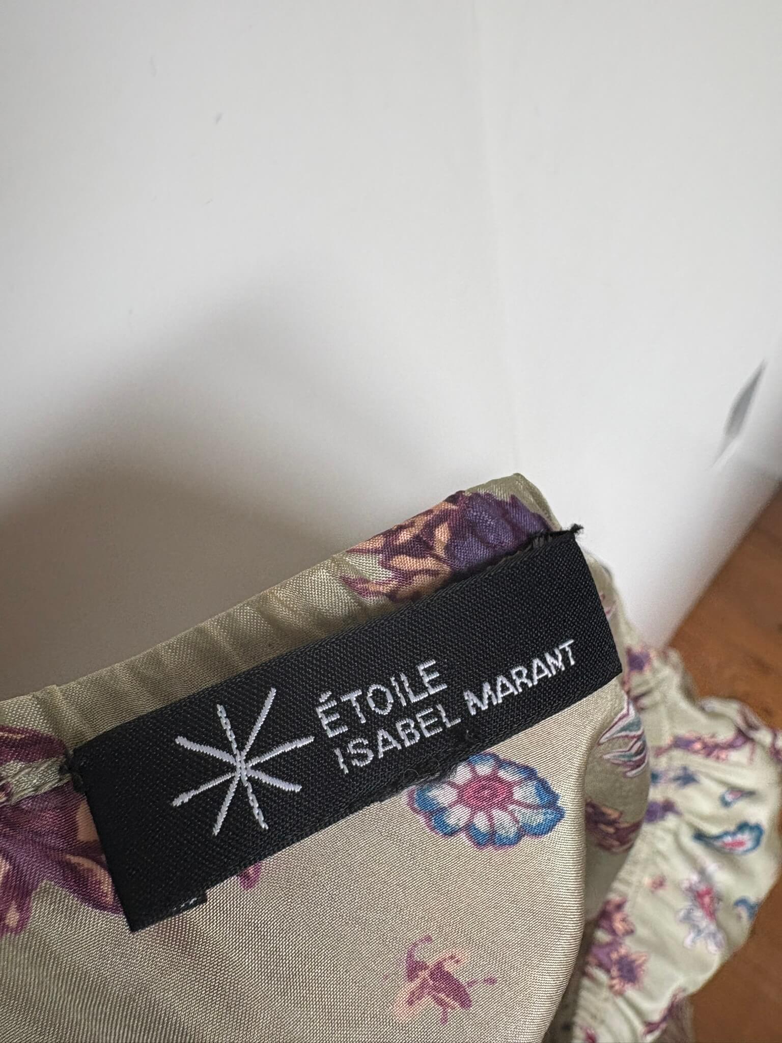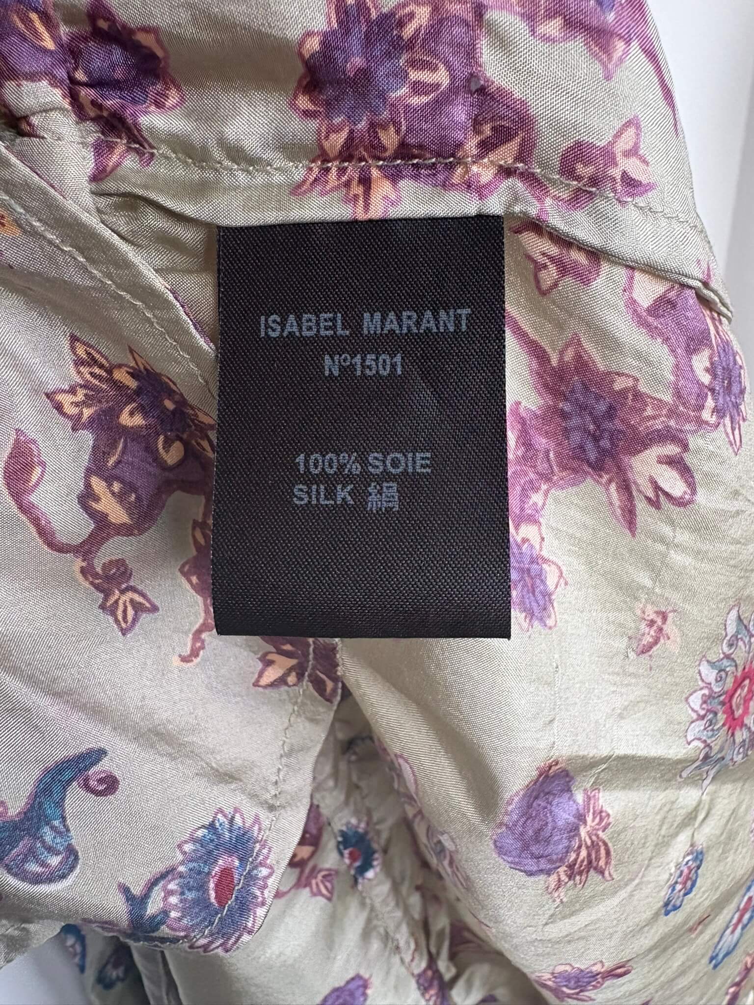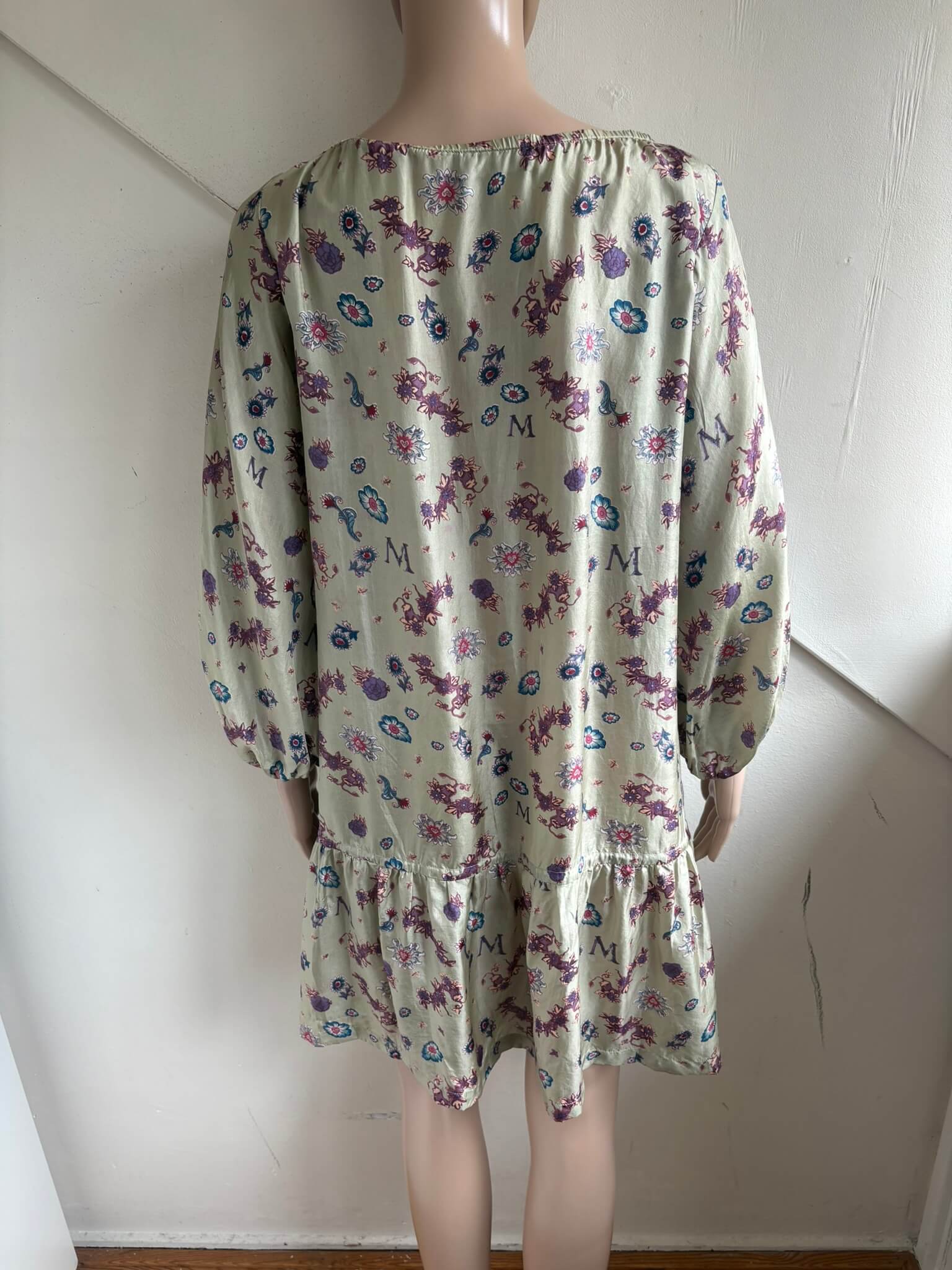 Zijden licht glanzende beige jurk met steekzakken en een paars blauwe print van bloemen etc, in de maat S. Gemaakt van 100% zijde. Oksellengte 48 cm en lengte 88 cm.