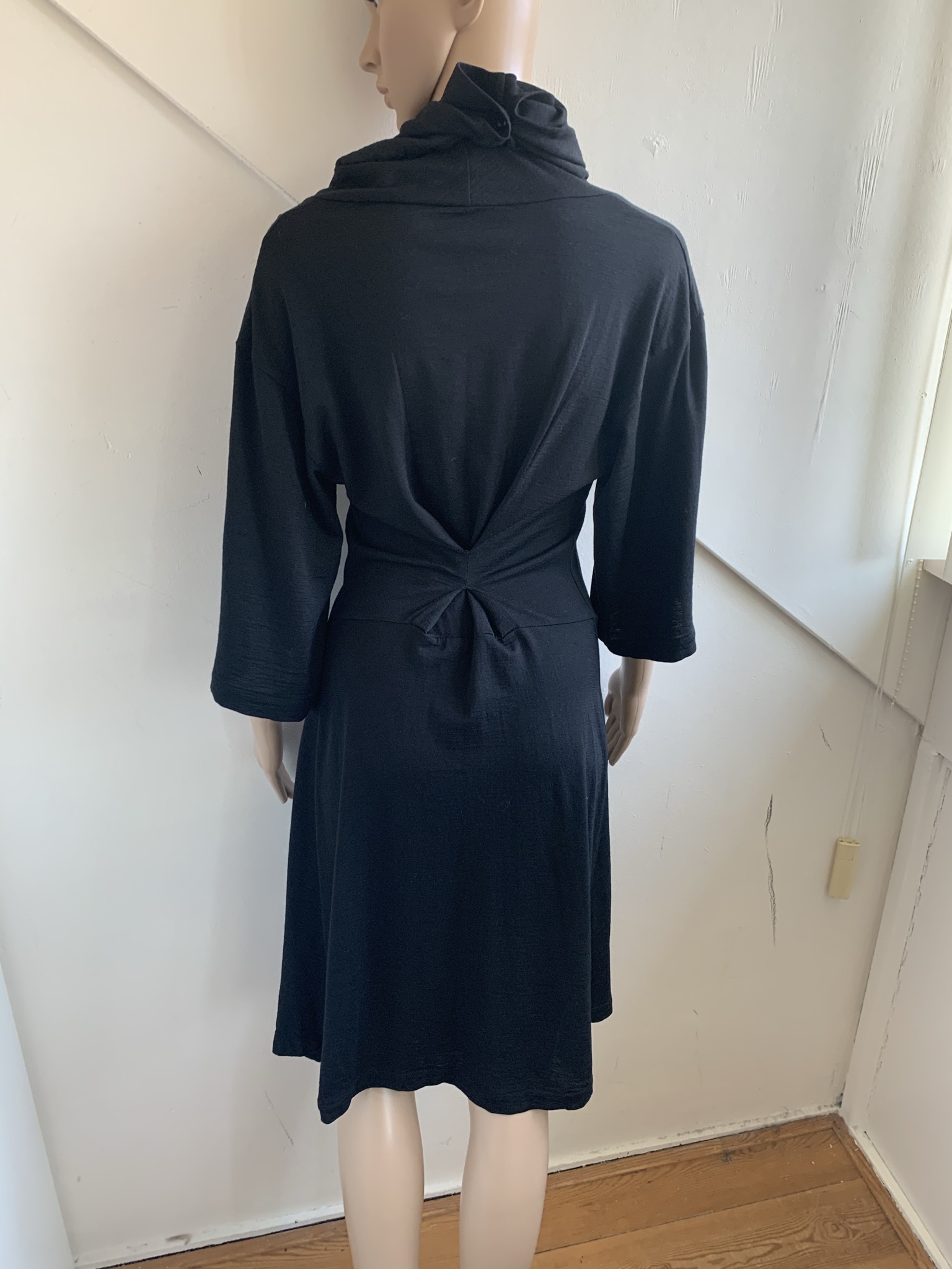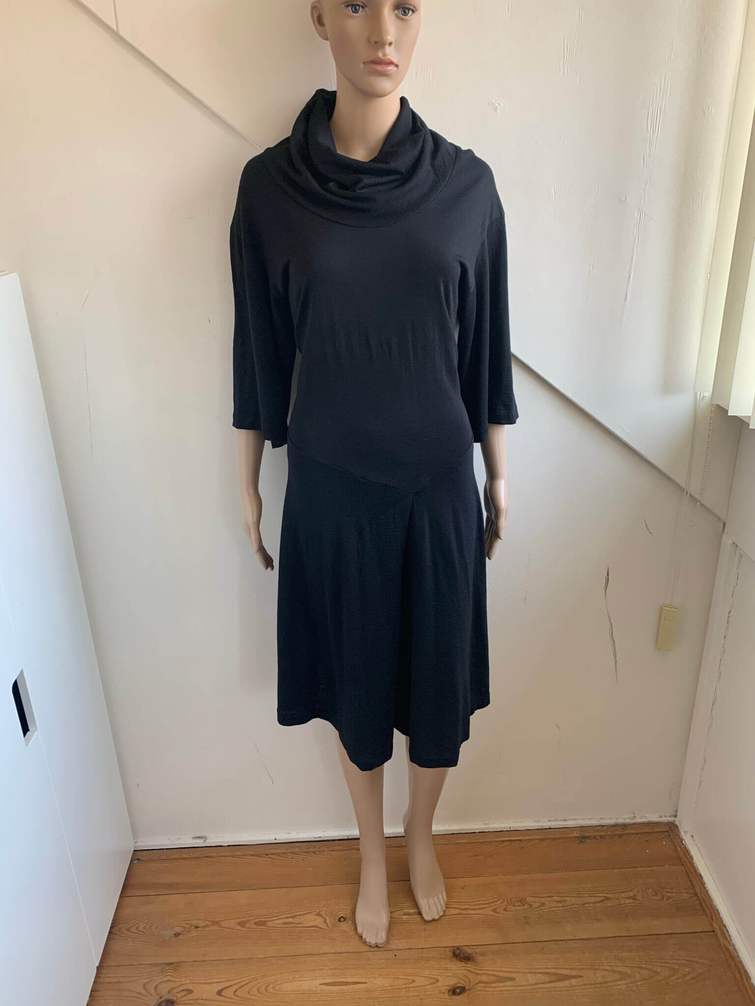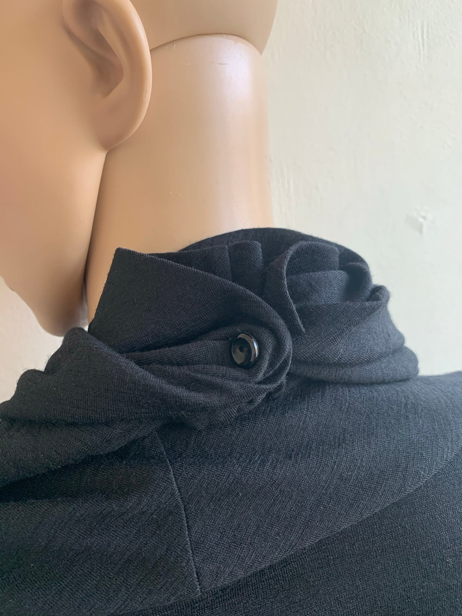 Zwarte dunne 100% wollen jurk met col. In de col zitten 3 knoopsgaatjes en 1 knoopje , zodat de col op meerdere manieren te dragen is. Ook helemaal los. De maat is 1 = S en dit is conform pasvorm