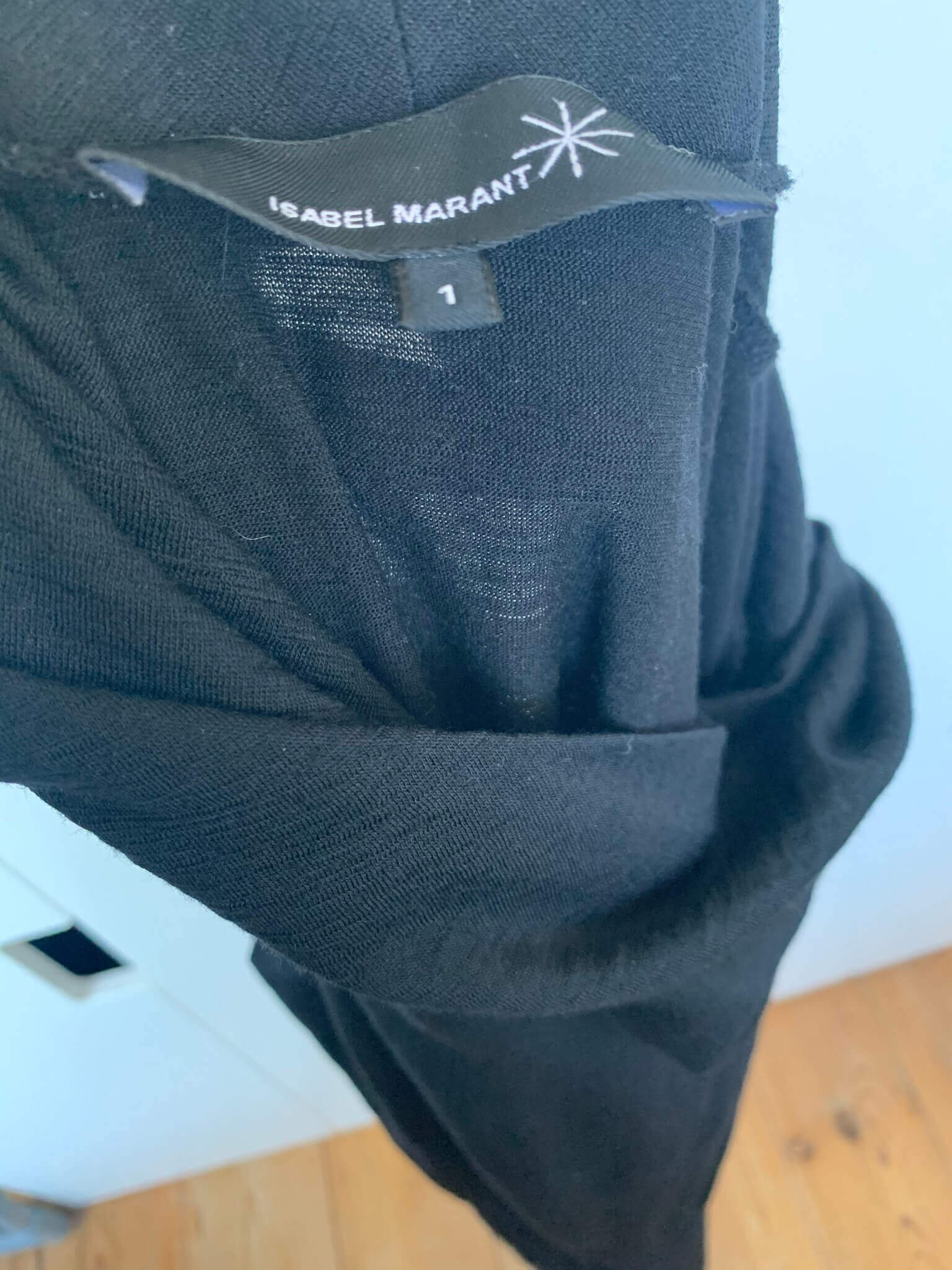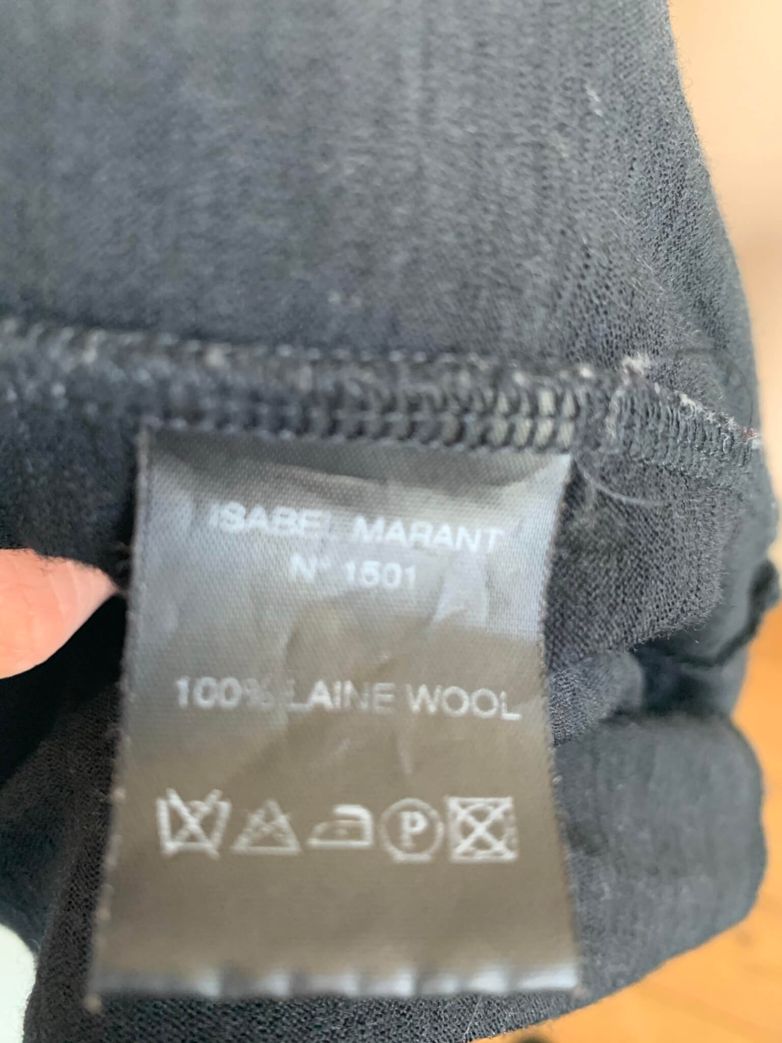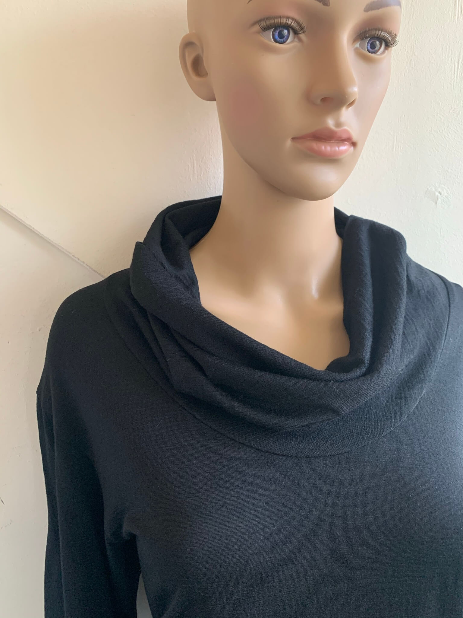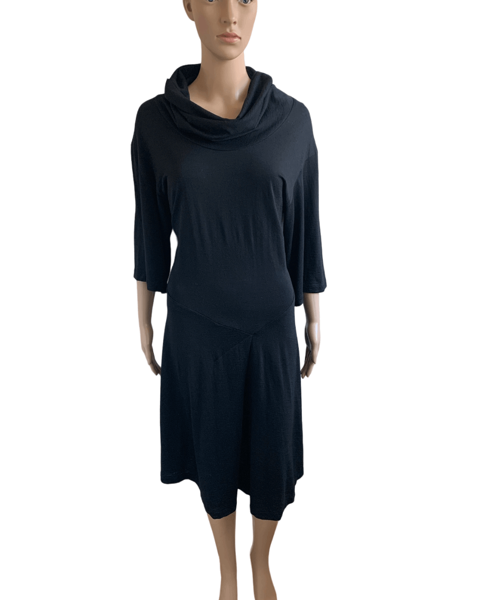 Zwarte dunne 100% wollen jurk met col. In de col zitten 3 knoopsgaatjes en 1 knoopje , zodat de col op meerdere manieren te dragen is. Ook helemaal los. De maat is 1 = S en dit is conform pasvorm